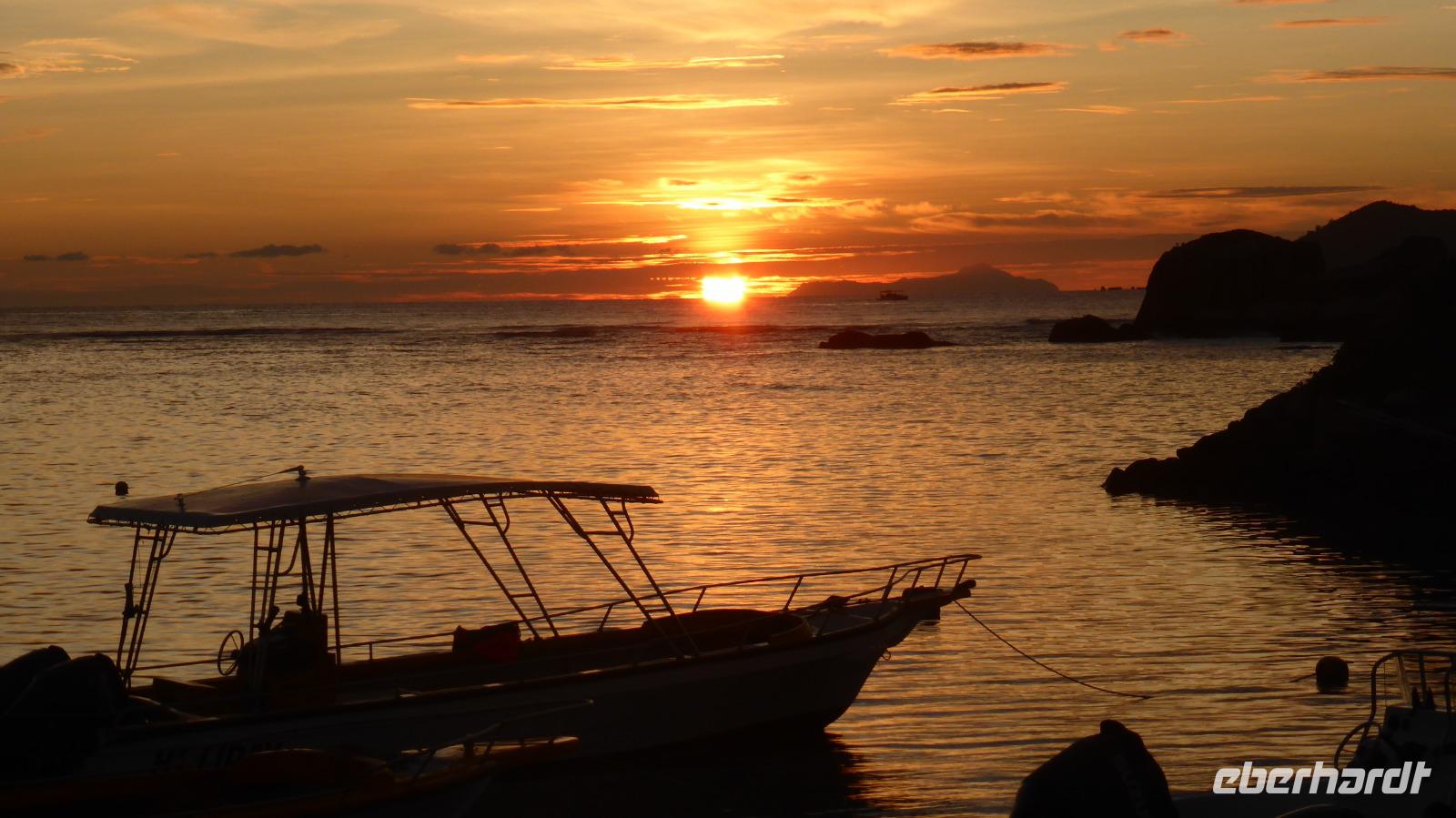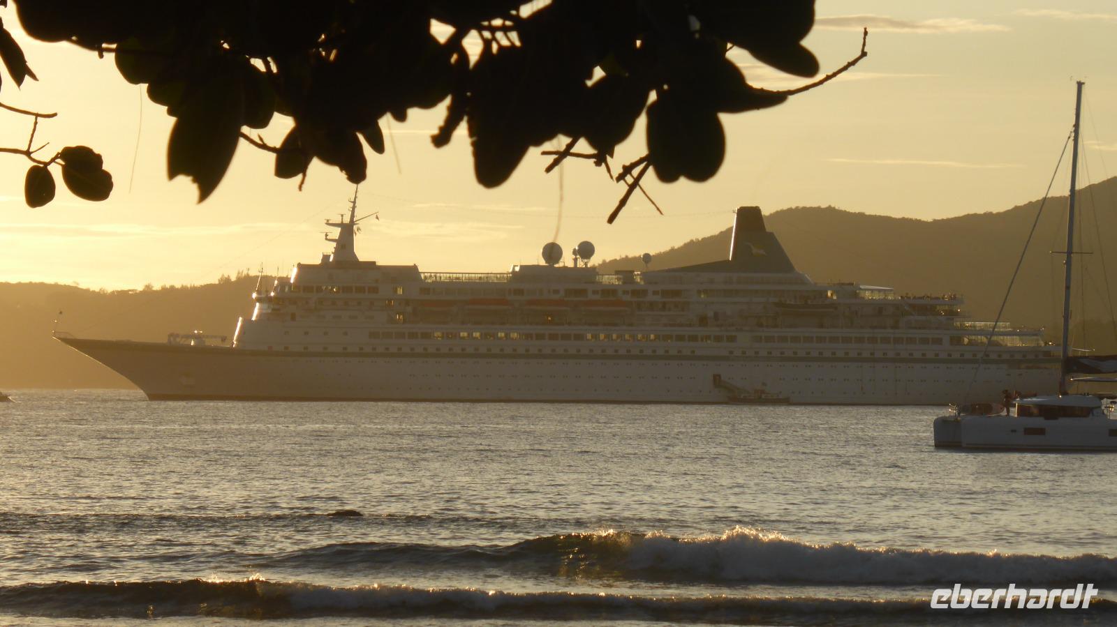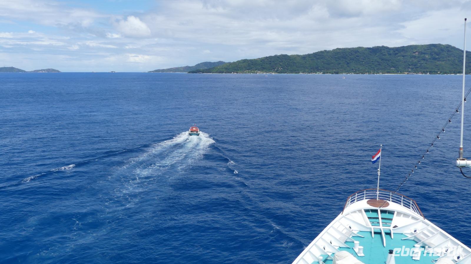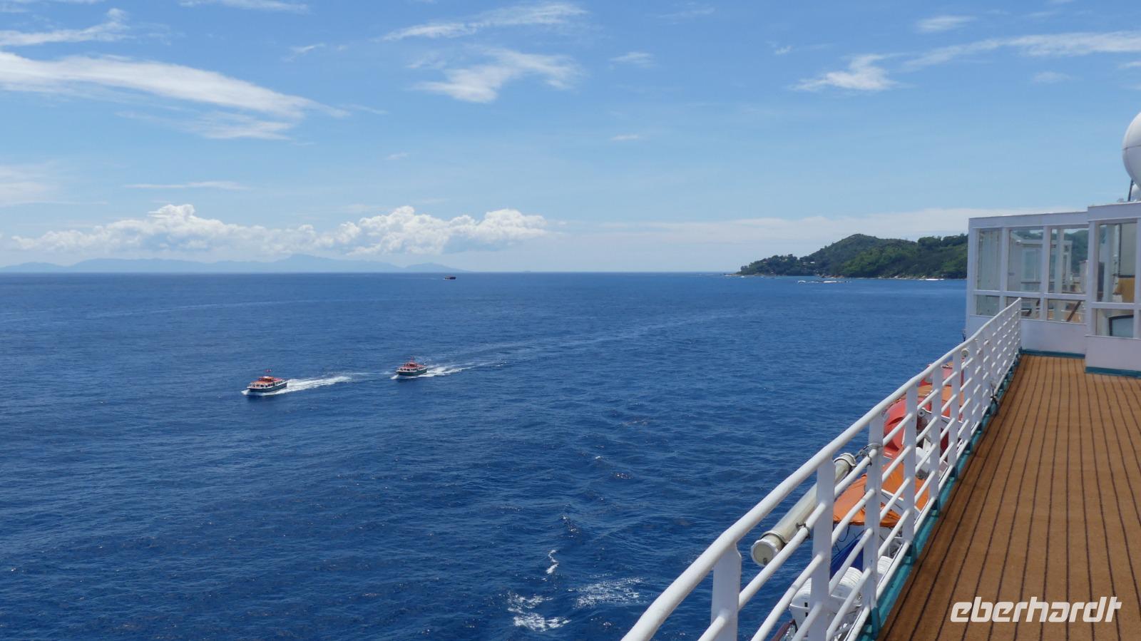 Mit der untergehenden Sonne setzt sich unser Kreuzfahrtschiff langsam in Bewegung. Eines unserer Tenderboote bringt noch den Lotsen zurück zur Insel.