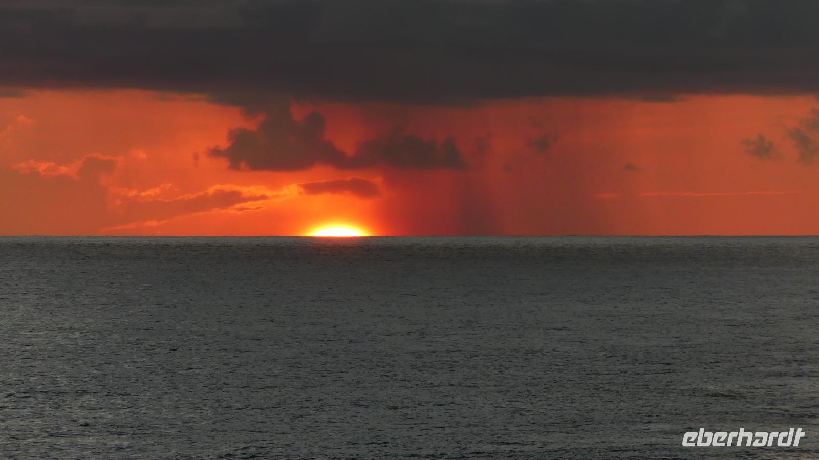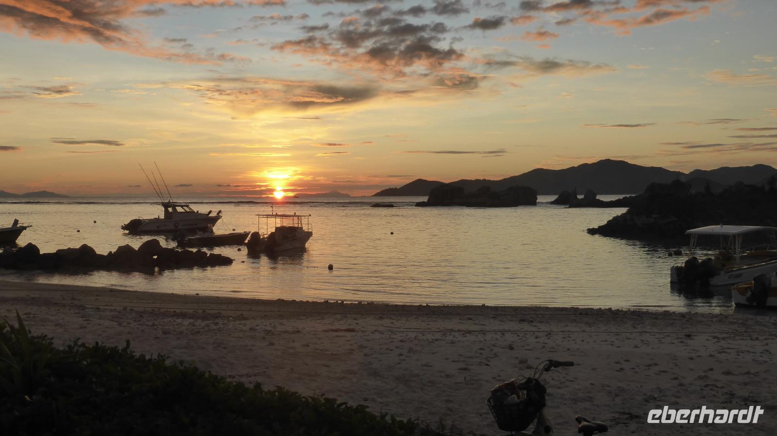 Bald senkt sich die Sonne im Westen über Praslin und beschert uns den letzten und vielleicht schönsten Sonnenuntergang der Reise.
