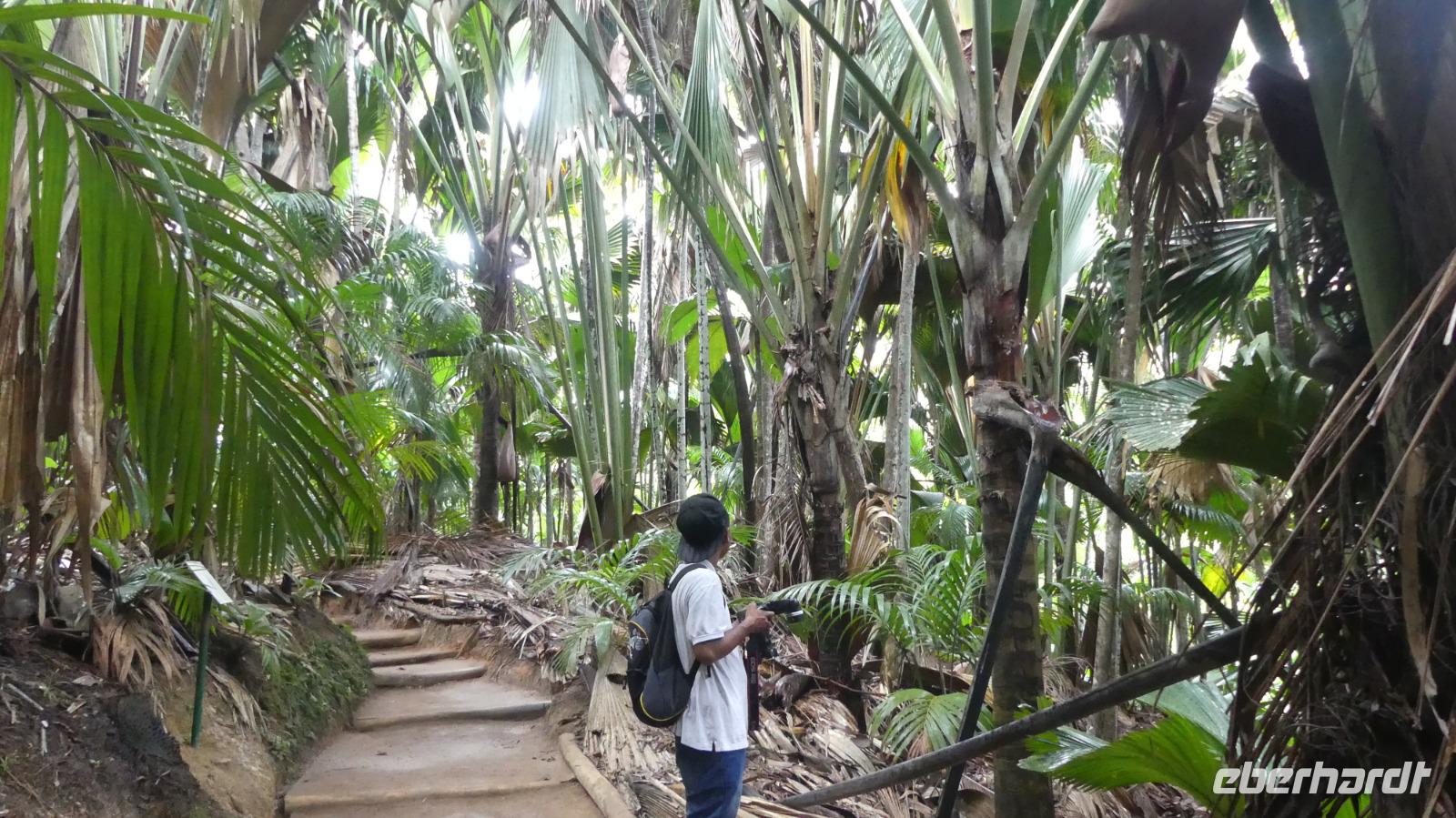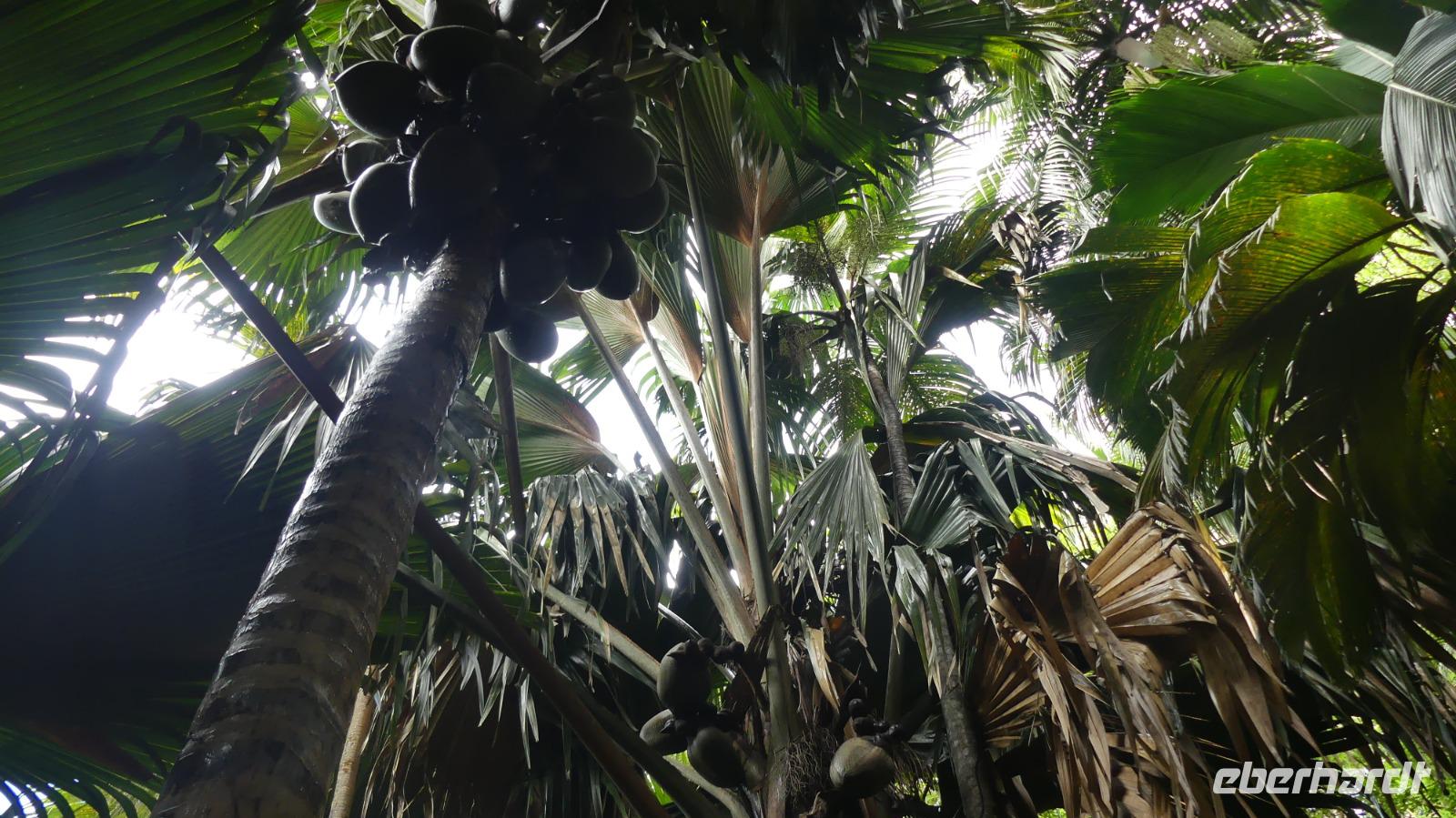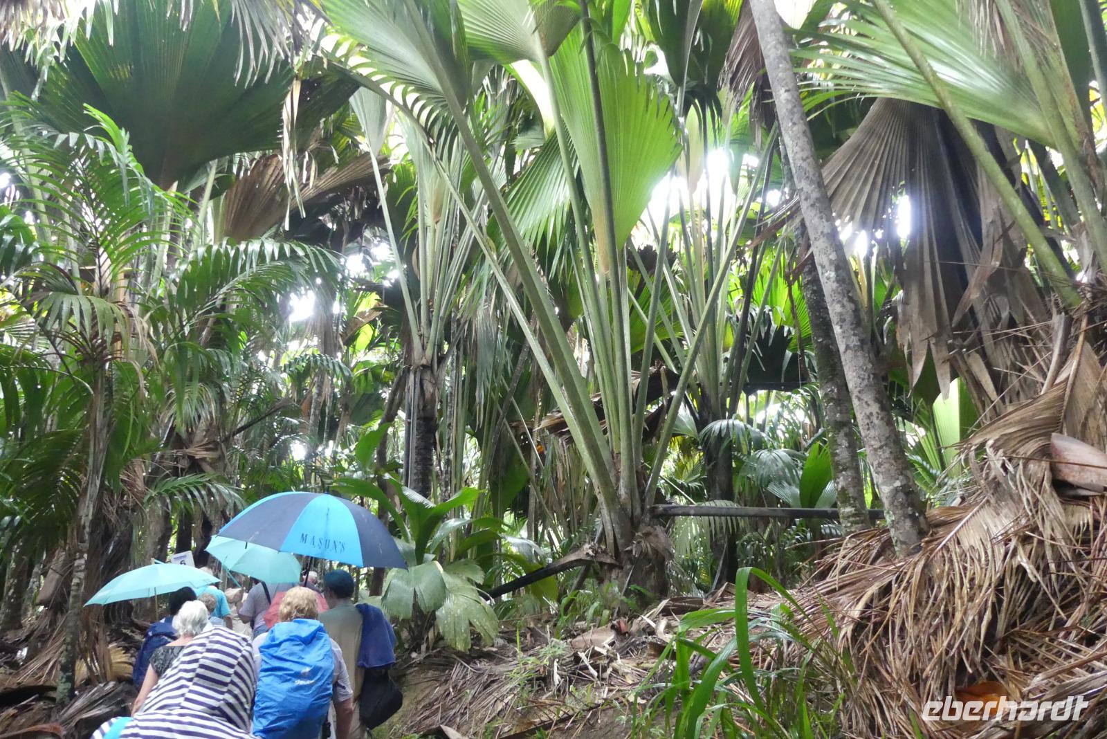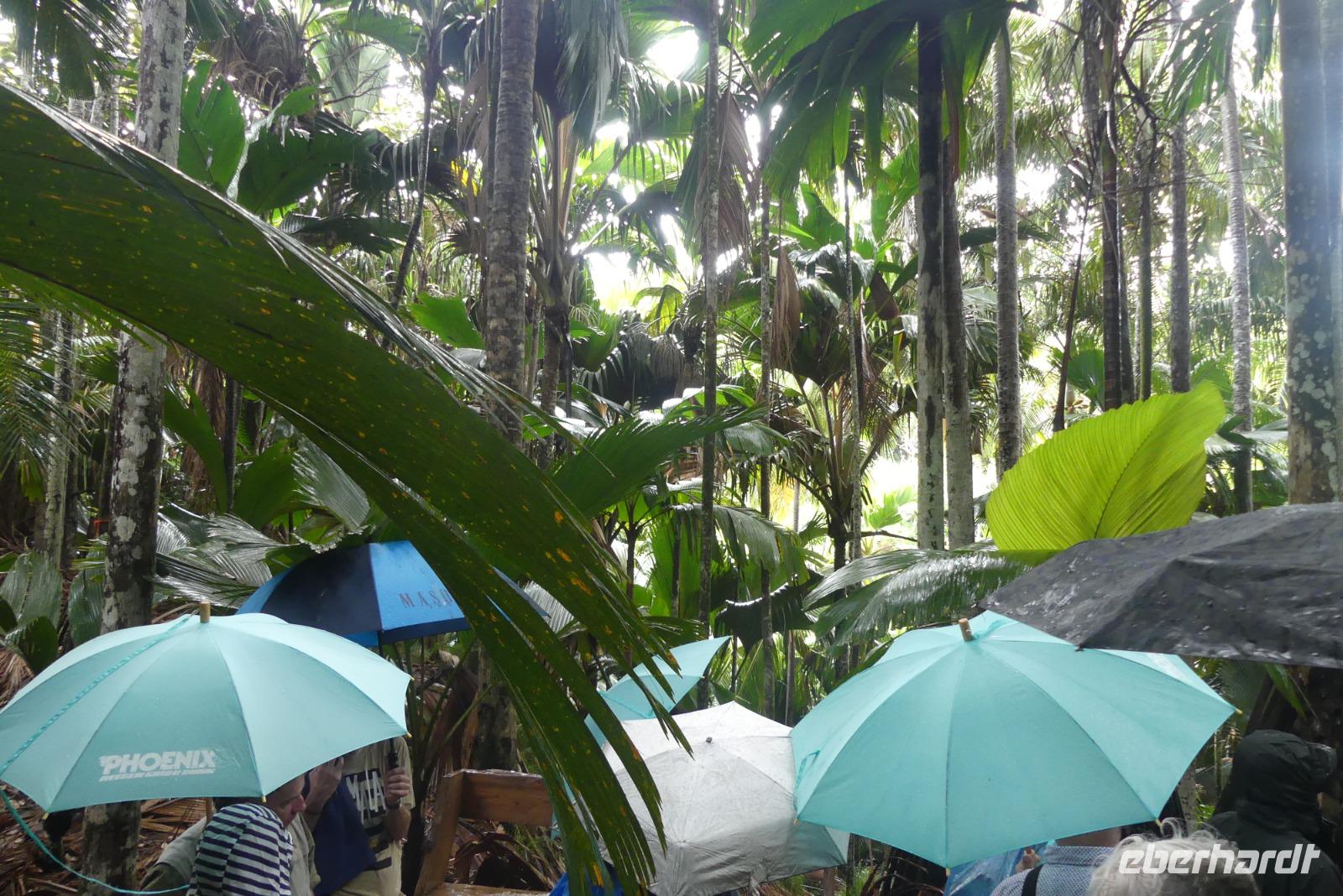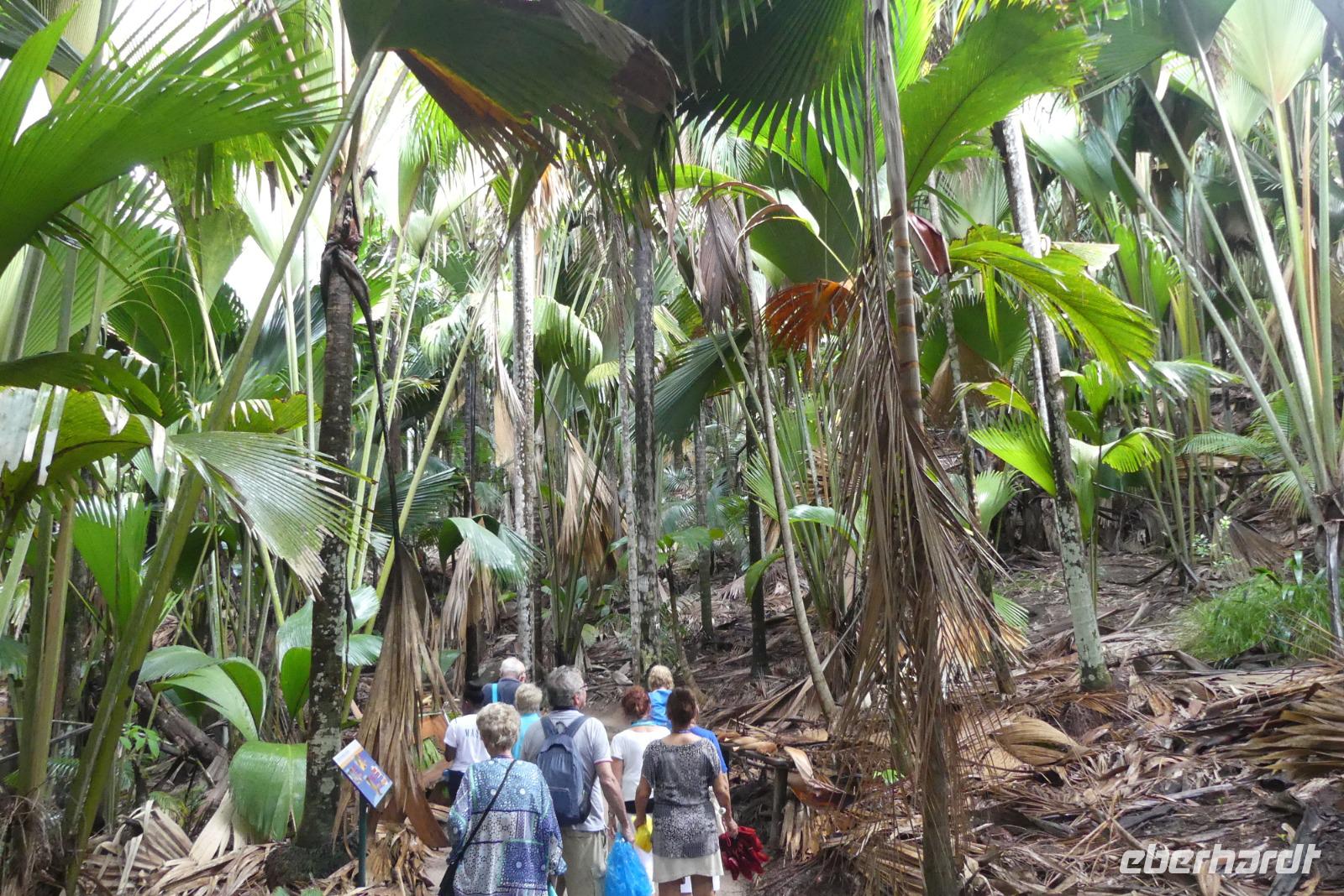 Den Vormittag auf Praslin verbringen wir entweder am Traumstrand Anse Lazio, individuell oder mit einer Inselfahrt. Wer mit mir während der Inselfahrt den fantastischen Wald mit der einzigartigen Coco de Mer Palme besucht, wird von den riesigen und dicht gewachsenen Blättern der Palmen vom Regen geschützt. Wir sind im Nationalpark Vallée de Mai. Der bizarre Palmenwald wird von der Coco de Mer dominiert, aber auch die anderen 5 heimischen Palmenarten sind hier vertreten. Das ca. 20 Hektar große und streng geschützte Hochtal mit der urzeitlichen Seychellenpalme gehört seit 1983 zum Weltnaturerbe der UNESCO. Ausschließlich hier auf Praslin und auf der Schwesterinsel Curieuse wächst die Coco de Mer. Die Seychellenpalme verfügt über erstaunliche Eigenschaften: erst nach rund 20 bis 25 Jahren Wachstum ist das Geschlecht der Palme erkennbar, gerade mal ein Blatt im Jahr wächst, dafür ist es mit Ausnahme einer Palmenart auf Mauritius das größte im gesamten Pflanzenreich; nach der Befruchtung benötigt der Samen 6 bis 7 Jahre bis zur Reife, dann ist er der größte der Welt, bis 24 kg brachten Samen bereits auf die Waage - Weltrekord, das schafft kein anderer Samen!