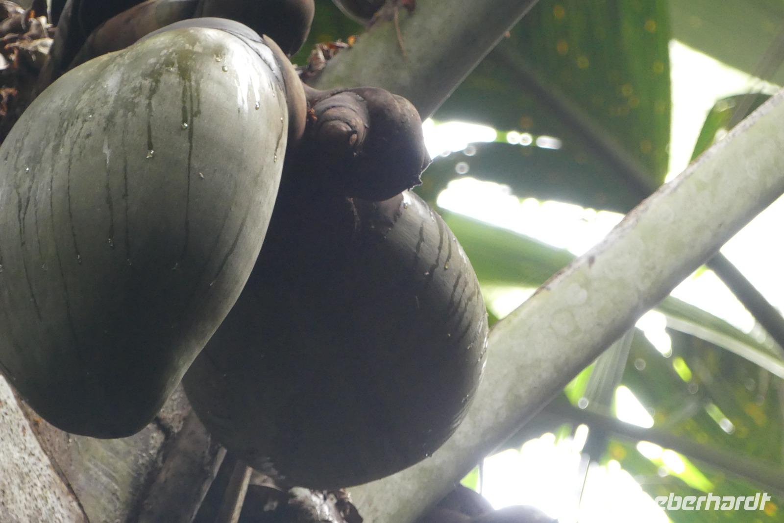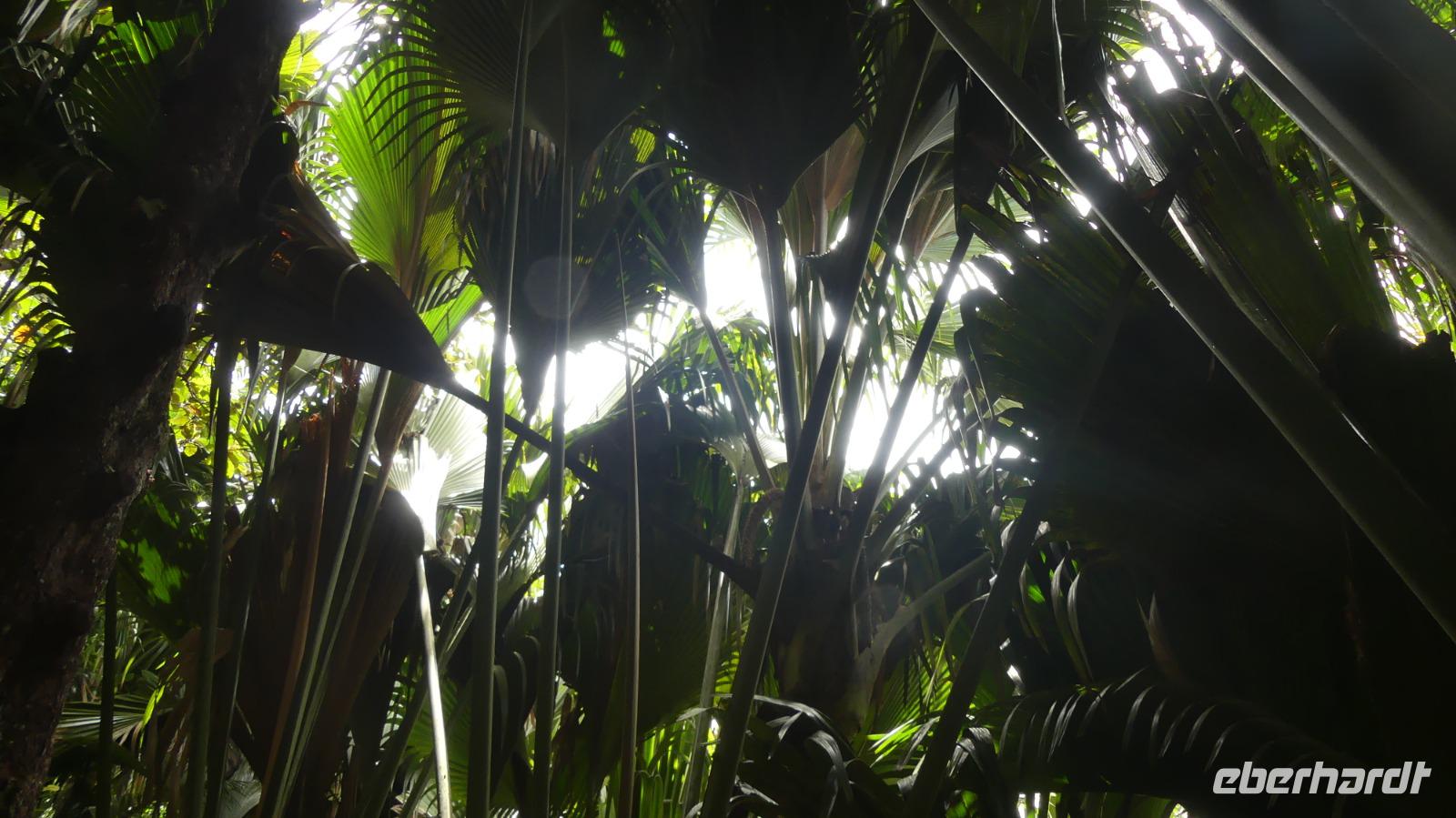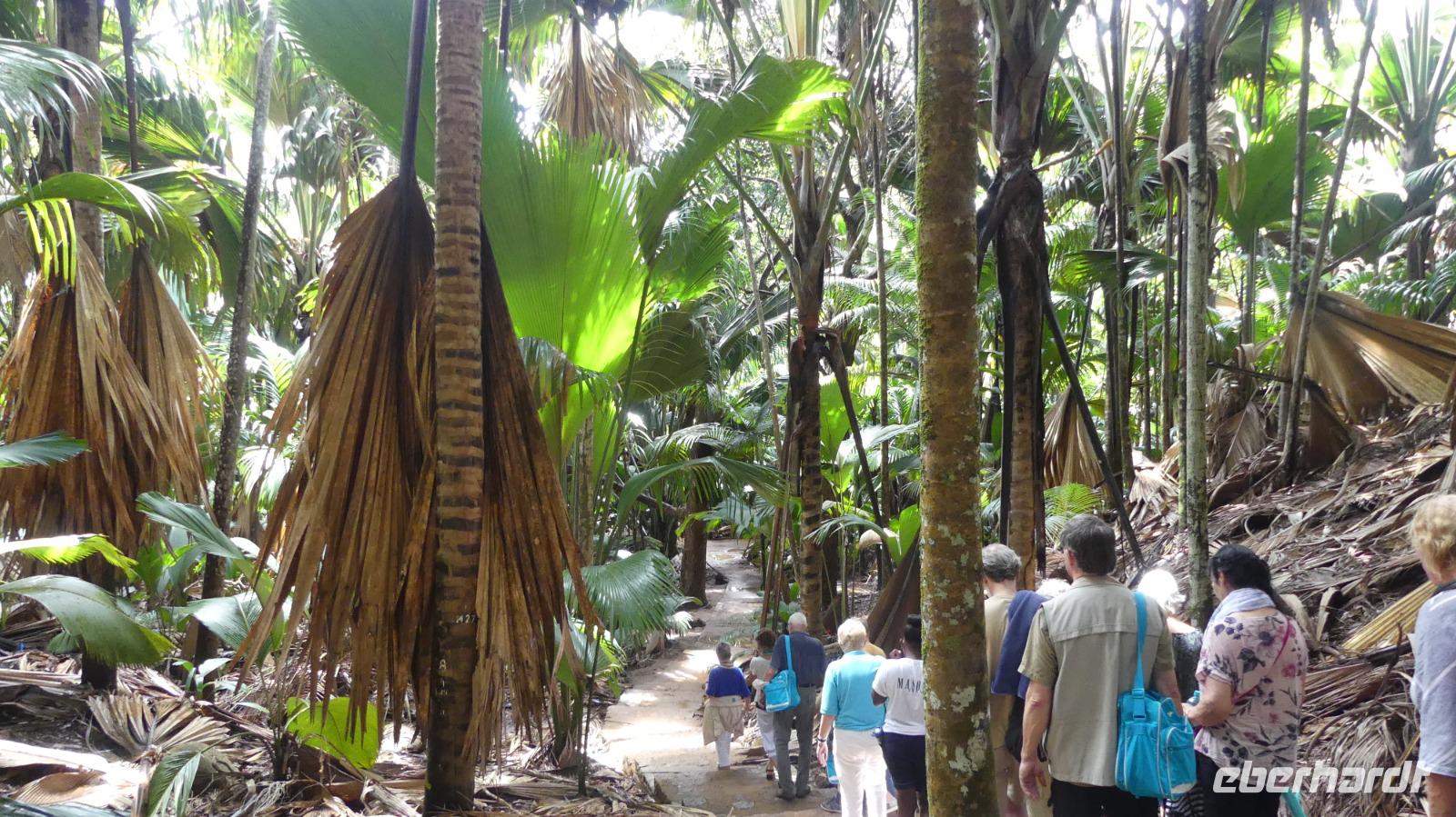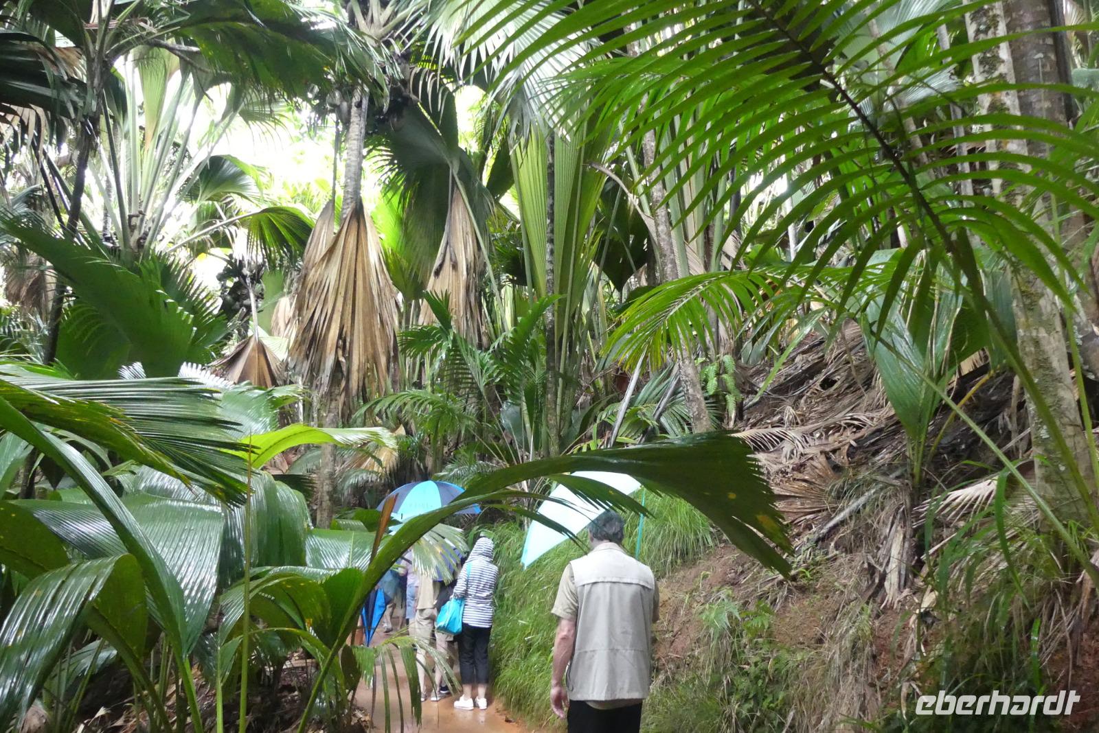 Den Vormittag auf Praslin verbringen wir entweder am Traumstrand Anse Lazio, individuell oder mit einer Inselfahrt. Wer mit mir während der Inselfahrt den fantastischen Wald mit der einzigartigen Coco de Mer Palme besucht, wird von den riesigen und dicht gewachsenen Blättern der Palmen vom Regen geschützt. Wir sind im Nationalpark Vallée de Mai. Der bizarre Palmenwald wird von der Coco de Mer dominiert, aber auch die anderen 5 heimischen Palmenarten sind hier vertreten. Das ca. 20 Hektar große und streng geschützte Hochtal mit der urzeitlichen Seychellenpalme gehört seit 1983 zum Weltnaturerbe der UNESCO. Ausschließlich hier auf Praslin und auf der Schwesterinsel Curieuse wächst die Coco de Mer. Die Seychellenpalme verfügt über erstaunliche Eigenschaften: erst nach rund 20 bis 25 Jahren Wachstum ist das Geschlecht der Palme erkennbar, gerade mal ein Blatt im Jahr wächst, dafür ist es mit Ausnahme einer Palmenart auf Mauritius das größte im gesamten Pflanzenreich; nach der Befruchtung benötigt der Samen 6 bis 7 Jahre bis zur Reife, dann ist er der größte der Welt, bis 24 kg brachten Samen bereits auf die Waage - Weltrekord, das schafft kein anderer Samen!