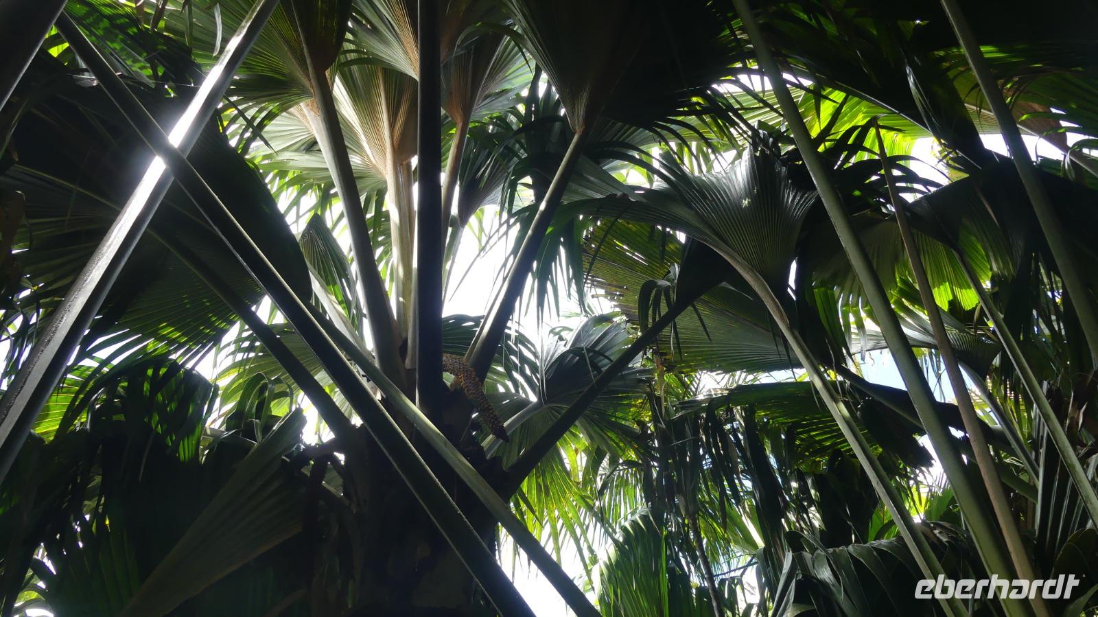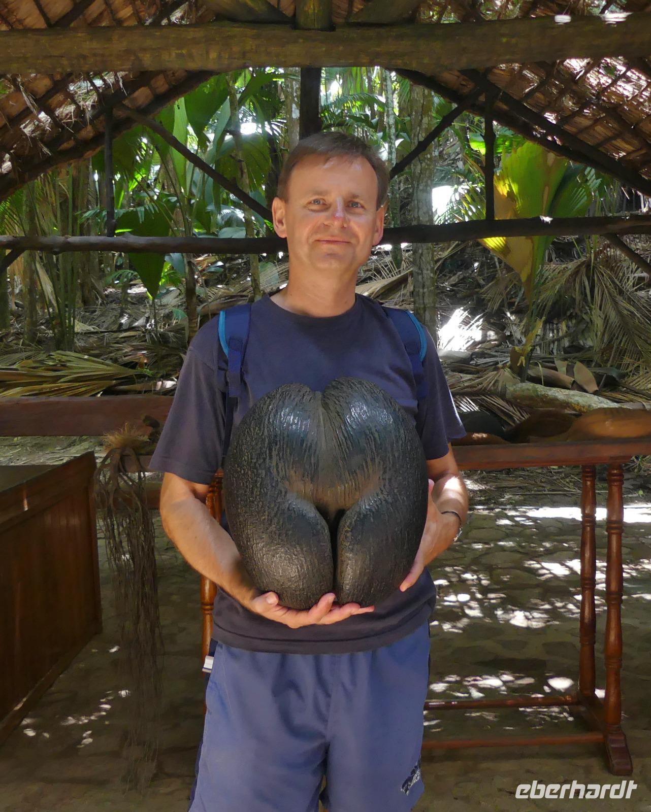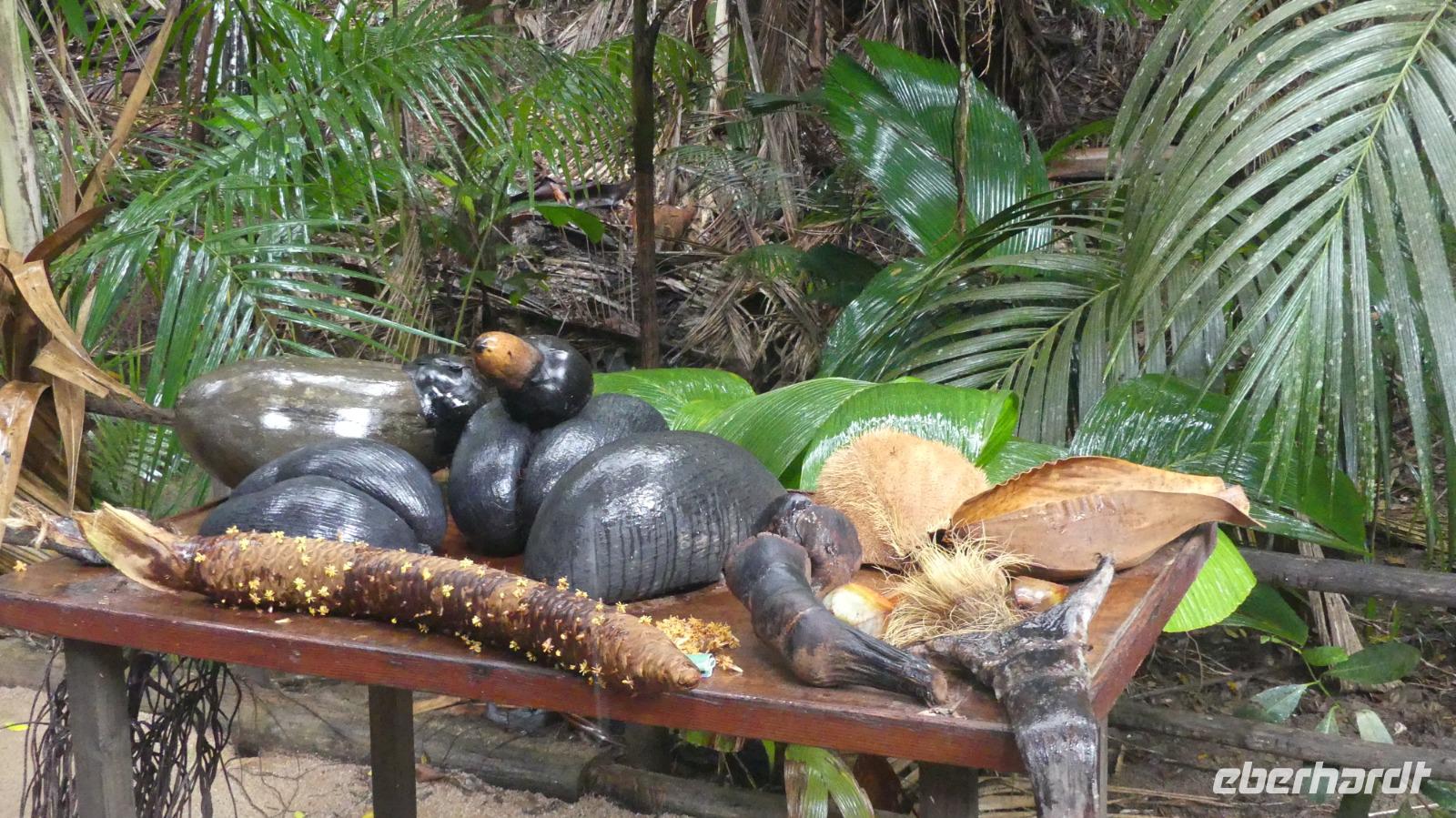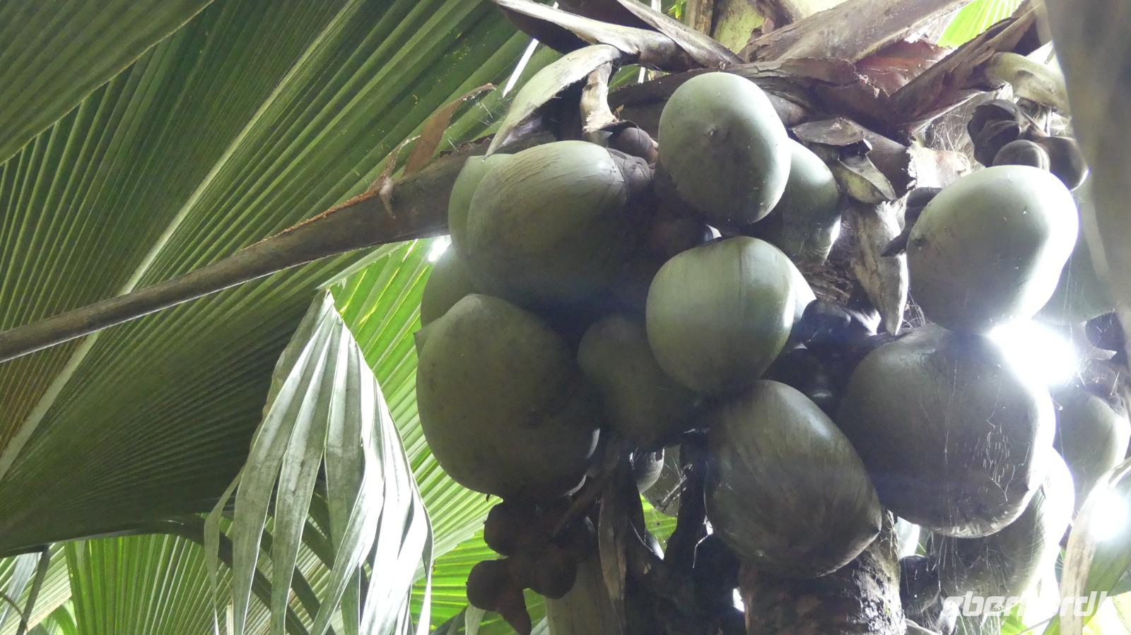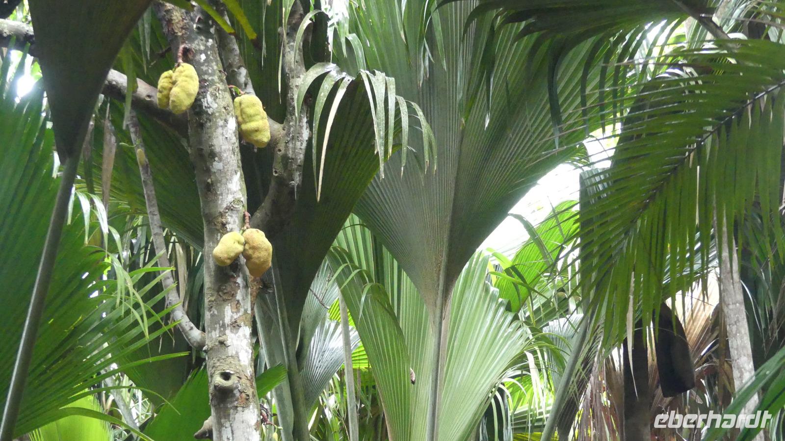 Den Vormittag auf Praslin verbringen wir entweder am Traumstrand Anse Lazio, individuell oder mit einer Inselfahrt. Wer mit mir während der Inselfahrt den fantastischen Wald mit der einzigartigen Coco de Mer Palme besucht, wird von den riesigen und dicht gewachsenen Blättern der Palmen vom Regen geschützt. Wir sind im Nationalpark Vallée de Mai. Der bizarre Palmenwald wird von der Coco de Mer dominiert, aber auch die anderen 5 heimischen Palmenarten sind hier vertreten. Das ca. 20 Hektar große und streng geschützte Hochtal mit der urzeitlichen Seychellenpalme gehört seit 1983 zum Weltnaturerbe der UNESCO. Ausschließlich hier auf Praslin und auf der Schwesterinsel Curieuse wächst die Coco de Mer. Die Seychellenpalme verfügt über erstaunliche Eigenschaften: erst nach rund 20 bis 25 Jahren Wachstum ist das Geschlecht der Palme erkennbar, gerade mal ein Blatt im Jahr wächst, dafür ist es mit Ausnahme einer Palmenart auf Mauritius das größte im gesamten Pflanzenreich; nach der Befruchtung benötigt der Samen 6 bis 7 Jahre bis zur Reife, dann ist er der größte der Welt, bis 24 kg brachten Samen bereits auf die Waage - Weltrekord, das schafft kein anderer Samen!