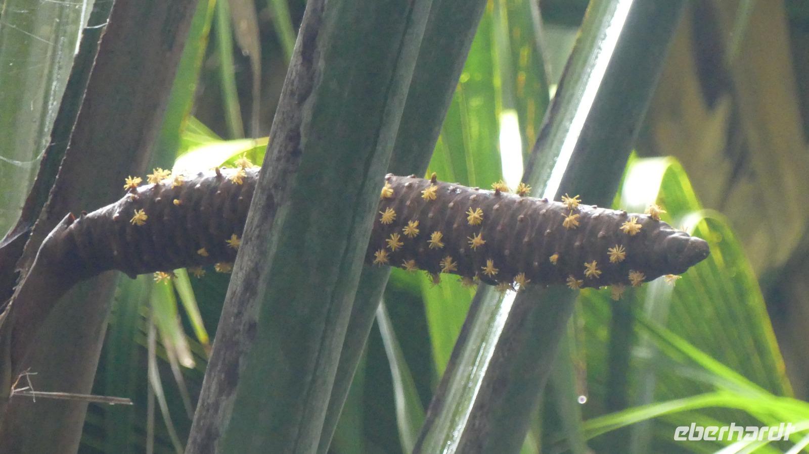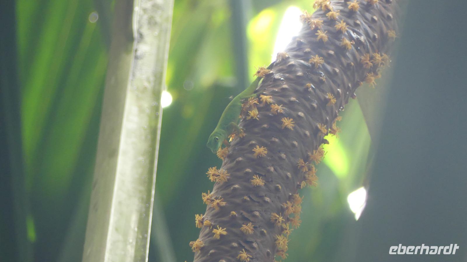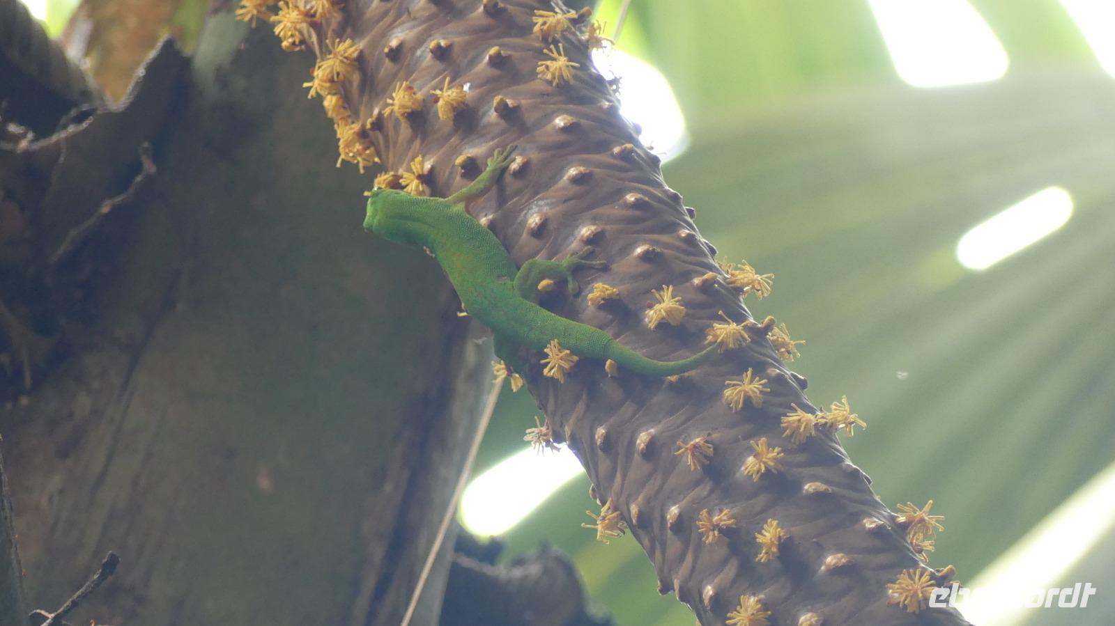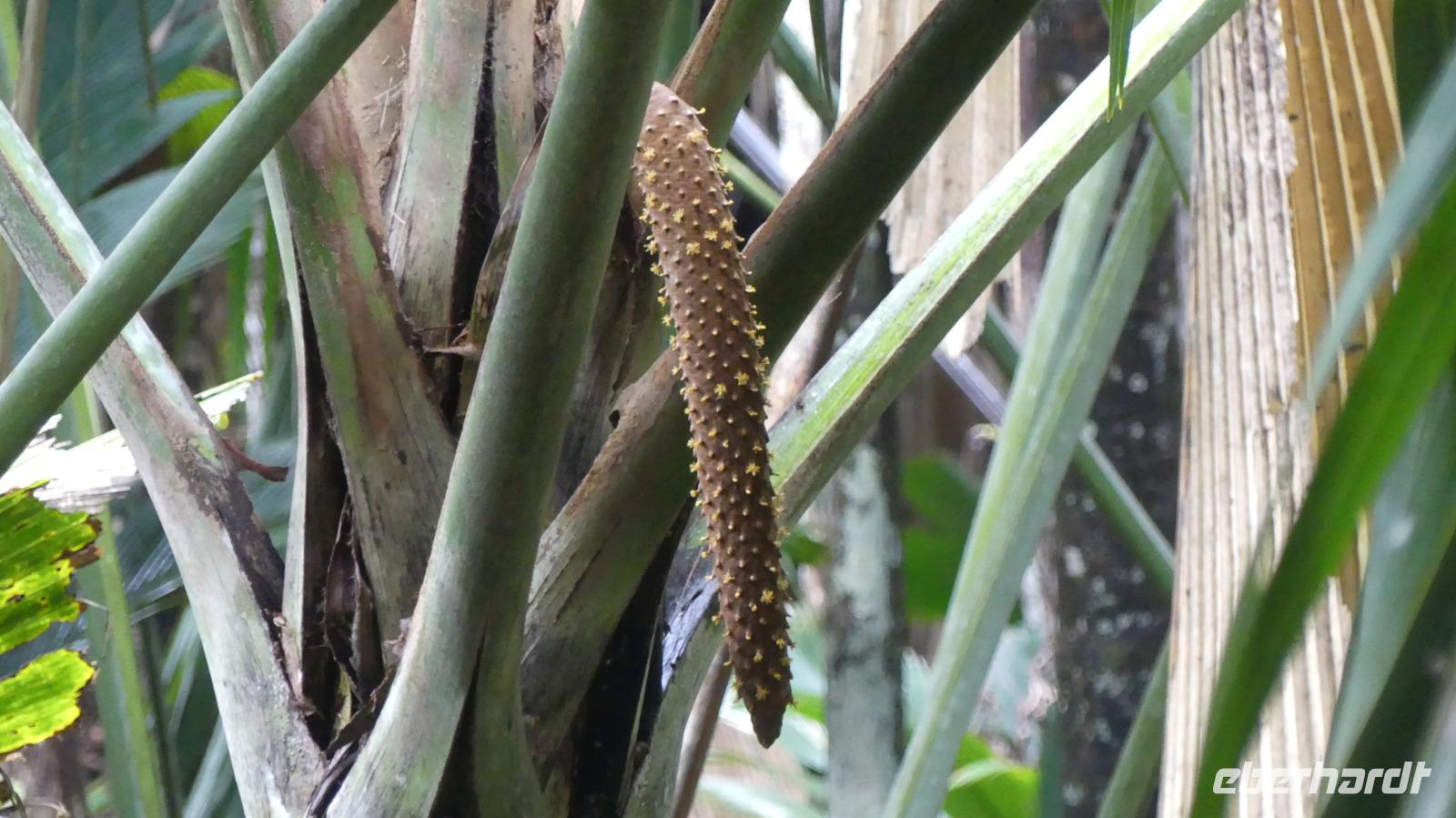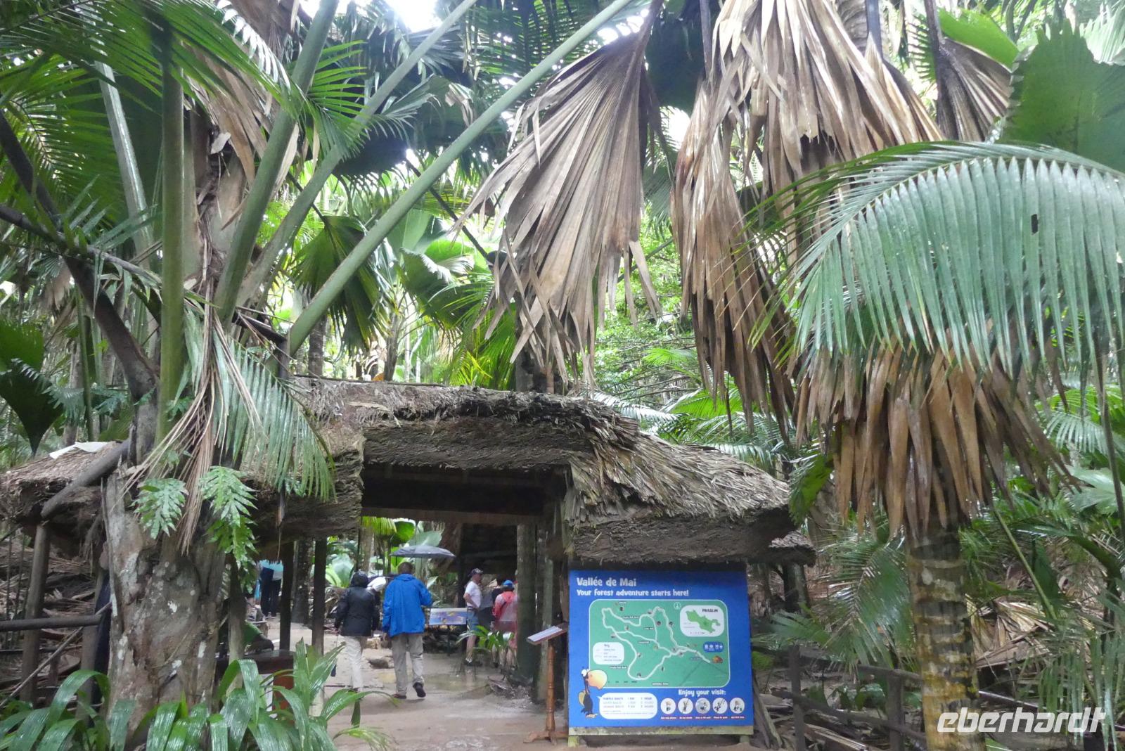 Den Vormittag auf Praslin verbringen wir entweder am Traumstrand Anse Lazio, individuell oder mit einer Inselfahrt. Wer mit mir während der Inselfahrt den fantastischen Wald mit der einzigartigen Coco de Mer Palme besucht, wird von den riesigen und dicht gewachsenen Blättern der Palmen vom Regen geschützt. Wir sind im Nationalpark Vallée de Mai. Der bizarre Palmenwald wird von der Coco de Mer dominiert, aber auch die anderen 5 heimischen Palmenarten sind hier vertreten. Das ca. 20 Hektar große und streng geschützte Hochtal mit der urzeitlichen Seychellenpalme gehört seit 1983 zum Weltnaturerbe der UNESCO. Ausschließlich hier auf Praslin und auf der Schwesterinsel Curieuse wächst die Coco de Mer. Die Seychellenpalme verfügt über erstaunliche Eigenschaften: erst nach rund 20 bis 25 Jahren Wachstum ist das Geschlecht der Palme erkennbar, gerade mal ein Blatt im Jahr wächst, dafür ist es mit Ausnahme einer Palmenart auf Mauritius das größte im gesamten Pflanzenreich; nach der Befruchtung benötigt der Samen 6 bis 7 Jahre bis zur Reife, dann ist er der größte der Welt, bis 24 kg brachten Samen bereits auf die Waage - Weltrekord, das schafft kein anderer Samen!