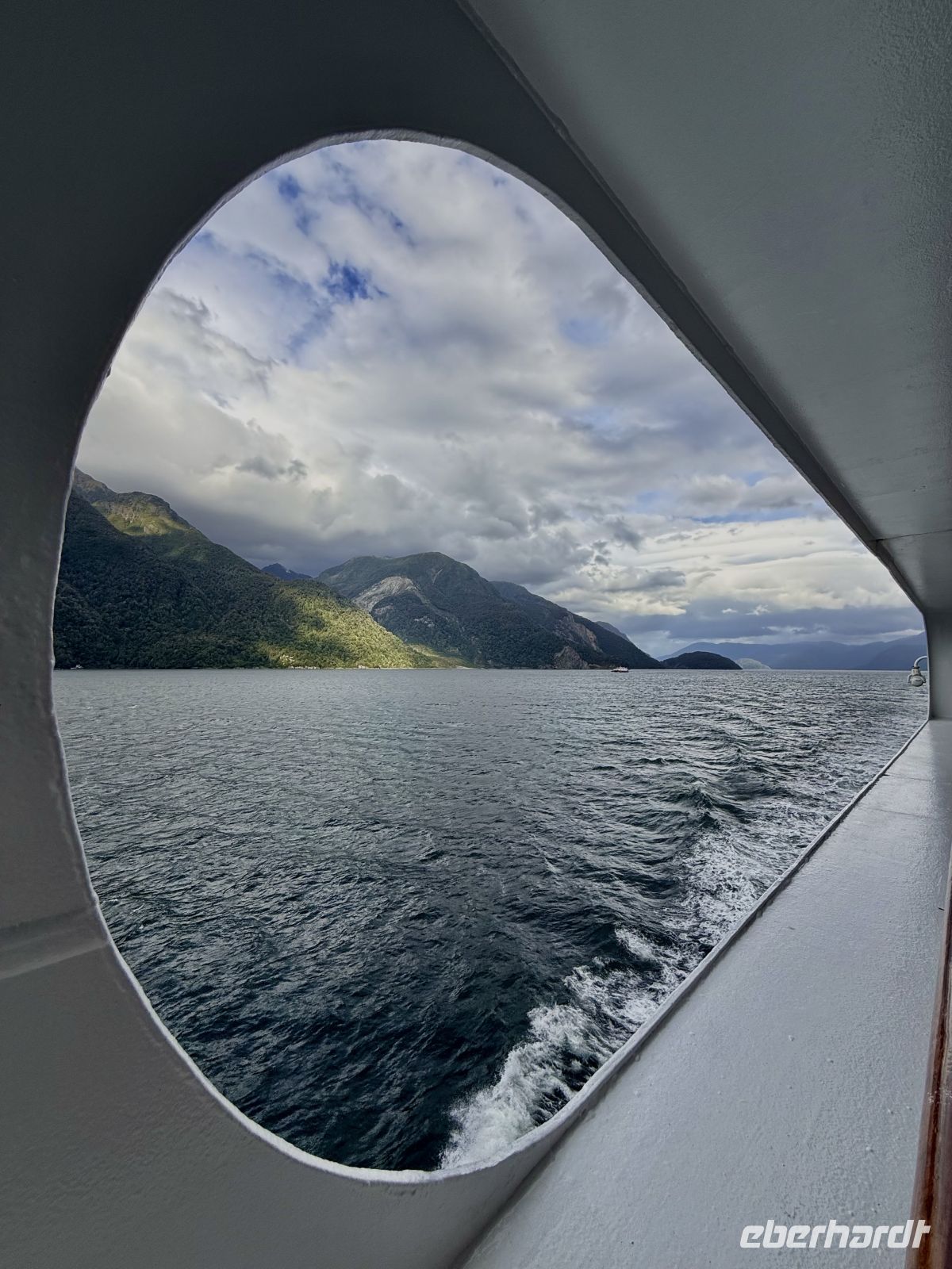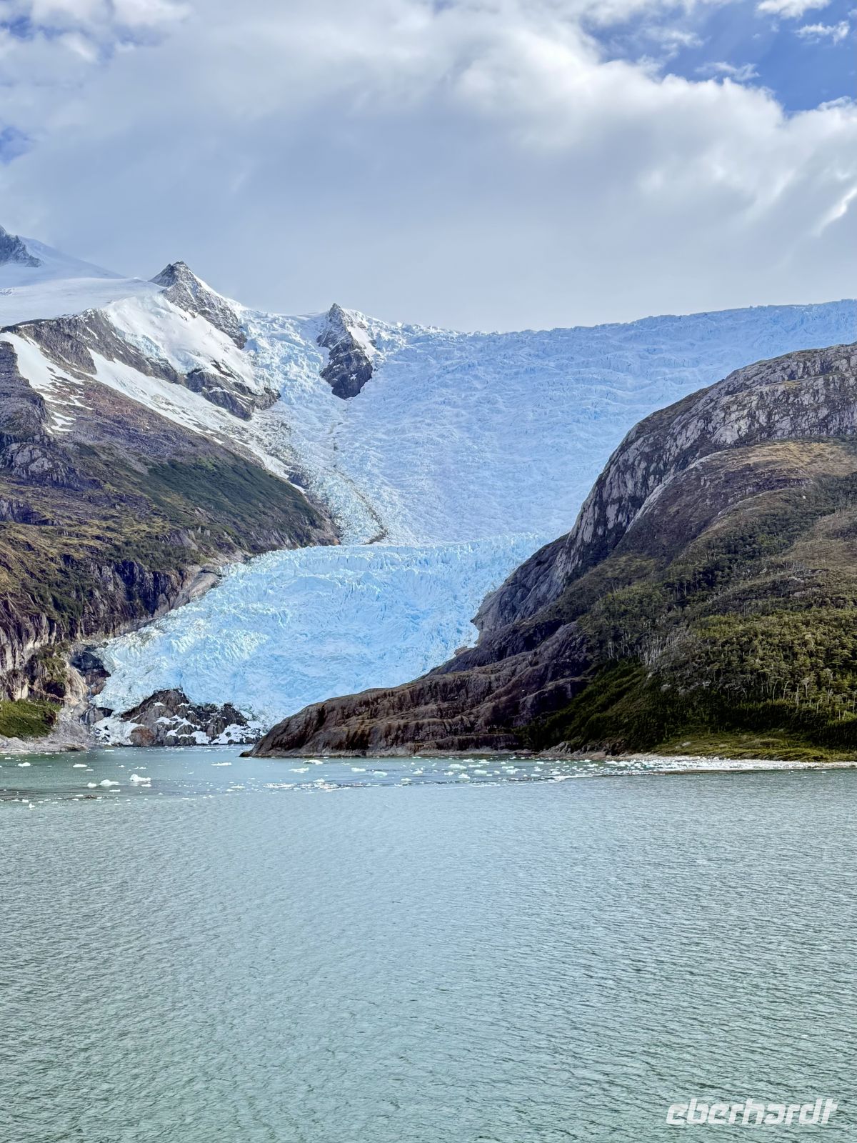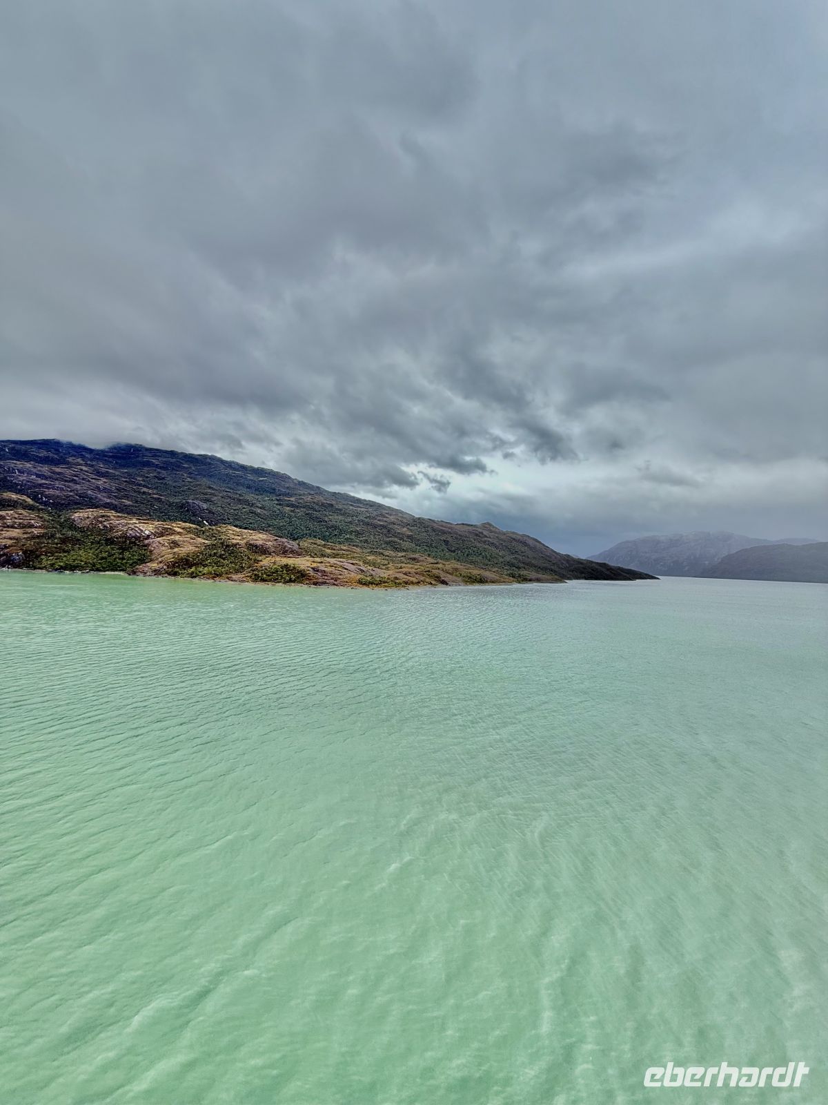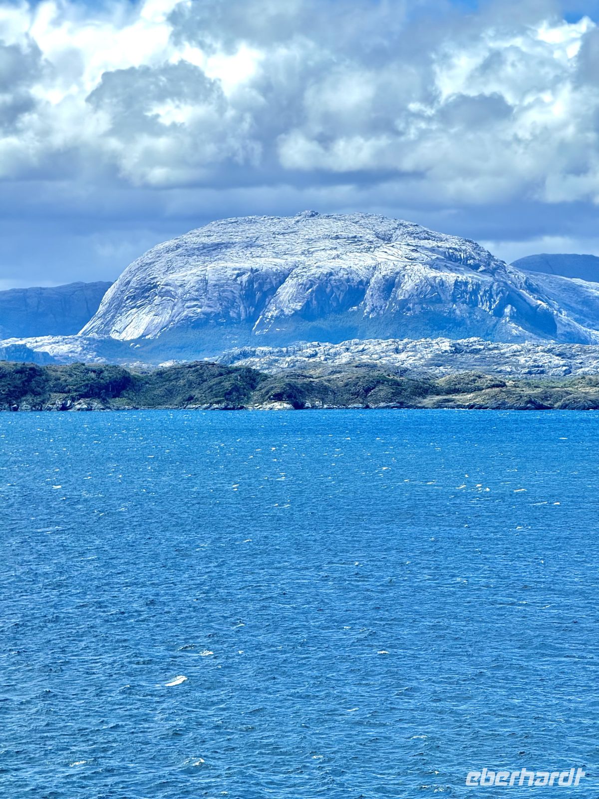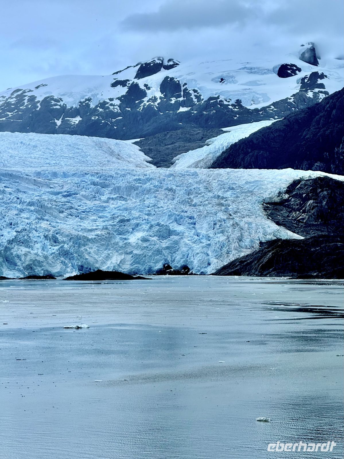 Die Schifffahrt ging weiter, und vom frühen Morgen an stiegen wir in eine Achterbahn der Wetterlagen ein, die nicht aufhörte uns zu überraschen: Nebel, Nieselregen, strahlender Sonnenschein, blaues, hellblaues und dunkles Wasser – alles am selben Tag. So ist Patagonien, diese südlichste Zone der Welt. Das Klima ist launisch, und das ist Teil seines Charmes und seiner Mystik, die es so schön machen. Die Küste mal nah, mal fern. Mit der Zeit wird sie felsiger, die Vegetation spärlicher und niedriger. Der erste Gletscher in Sicht! Was für ein unglaublicher Eindruck! Weiß, Hellblau und Tiefblau, alles in einem einzigen riesigen Eisblock, der sich geduldig, ohne jede Eile, in Richtung Meer bewegt. Die Felsen überraschen uns immer wieder mit ihren kapriziösen Formen, die direkt aus dem Meer auftauchen. Es war eine Zeit, um auf der Promenade spazieren zu gehen, den frischen Wind und die Sonnenstrahlen oder den kalten Nieselregen zu genießen, je nach Moment. Etwas trinken, ein wenig plaudern oder einfach nur dasitzen und den Moment genießen, diesen präzisen, flüchtigen Augenblick, von dem wir im Grunde hoffen, dass er ewig währt.