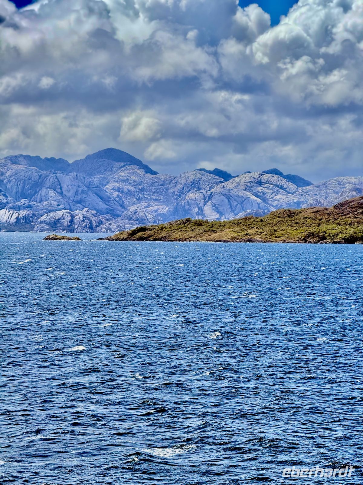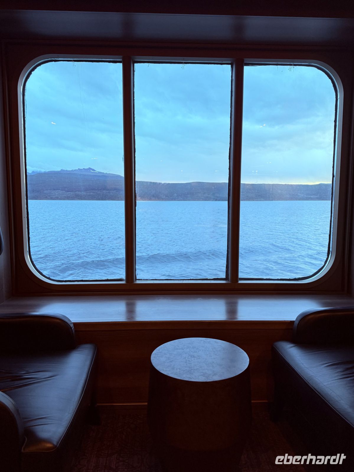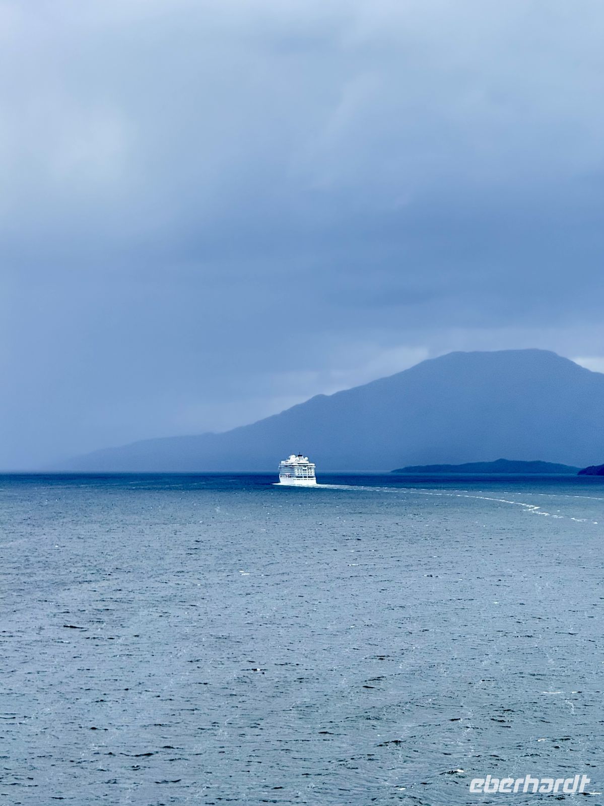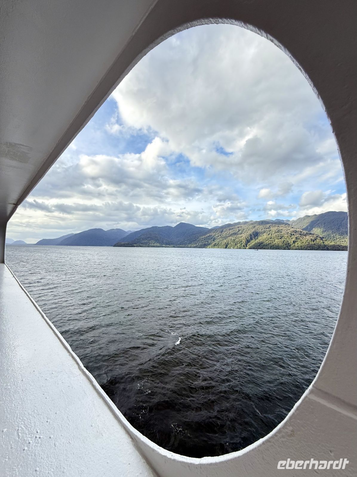 Die Schifffahrt ging weiter, und vom frühen Morgen an stiegen wir in eine Achterbahn der Wetterlagen ein, die nicht aufhörte uns zu überraschen: Nebel, Nieselregen, strahlender Sonnenschein, blaues, hellblaues und dunkles Wasser – alles am selben Tag. So ist Patagonien, diese südlichste Zone der Welt. Das Klima ist launisch, und das ist Teil seines Charmes und seiner Mystik, die es so schön machen. Die Küste mal nah, mal fern. Mit der Zeit wird sie felsiger, die Vegetation spärlicher und niedriger. Der erste Gletscher in Sicht! Was für ein unglaublicher Eindruck! Weiß, Hellblau und Tiefblau, alles in einem einzigen riesigen Eisblock, der sich geduldig, ohne jede Eile, in Richtung Meer bewegt. Die Felsen überraschen uns immer wieder mit ihren kapriziösen Formen, die direkt aus dem Meer auftauchen. Es war eine Zeit, um auf der Promenade spazieren zu gehen, den frischen Wind und die Sonnenstrahlen oder den kalten Nieselregen zu genießen, je nach Moment. Etwas trinken, ein wenig plaudern oder einfach nur dasitzen und den Moment genießen, diesen präzisen, flüchtigen Augenblick, von dem wir im Grunde hoffen, dass er ewig währt.