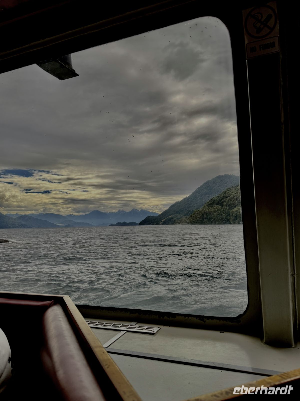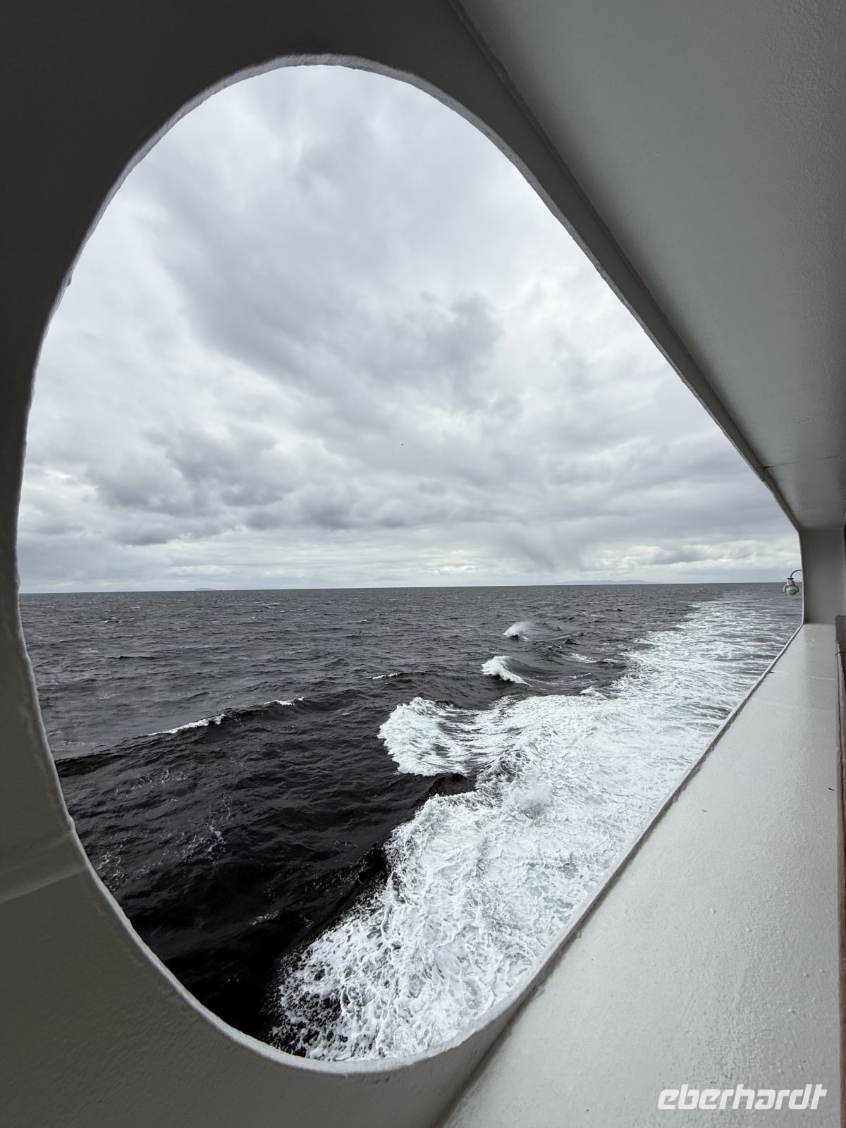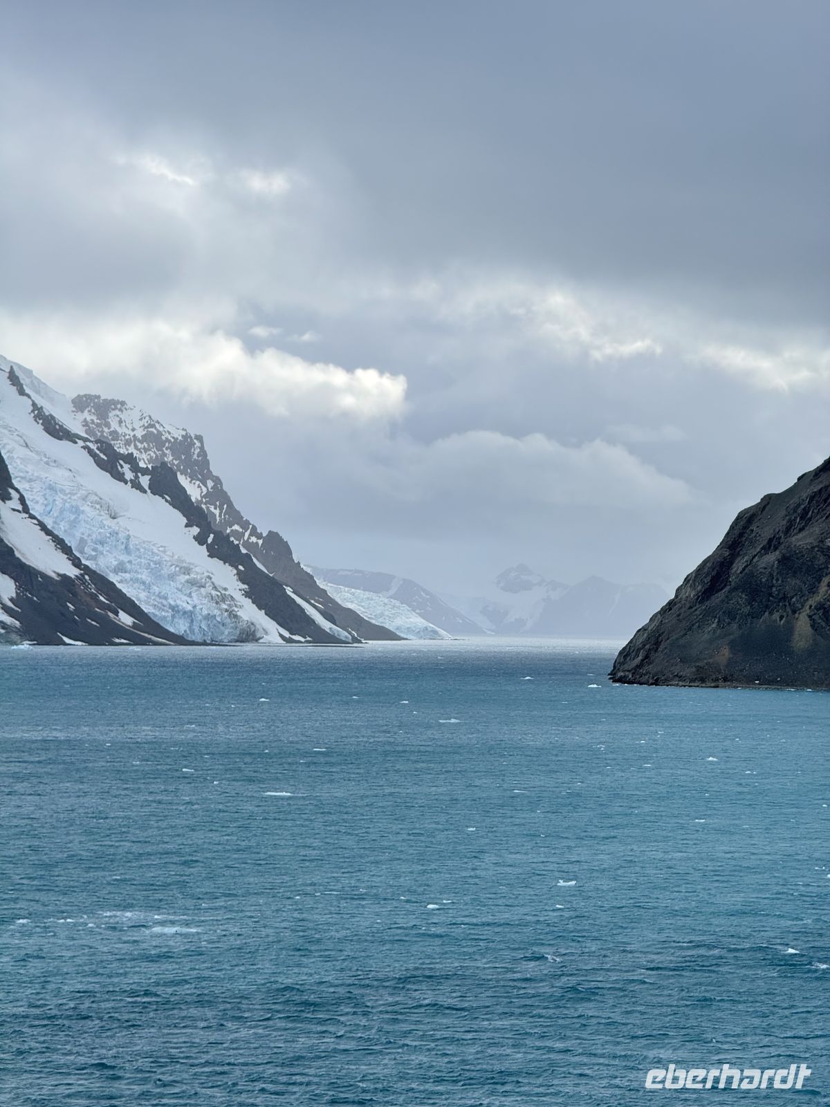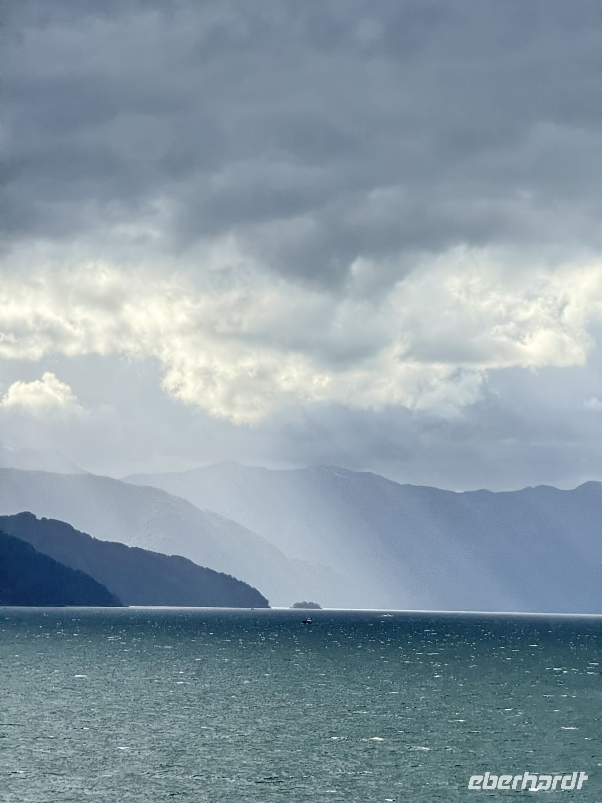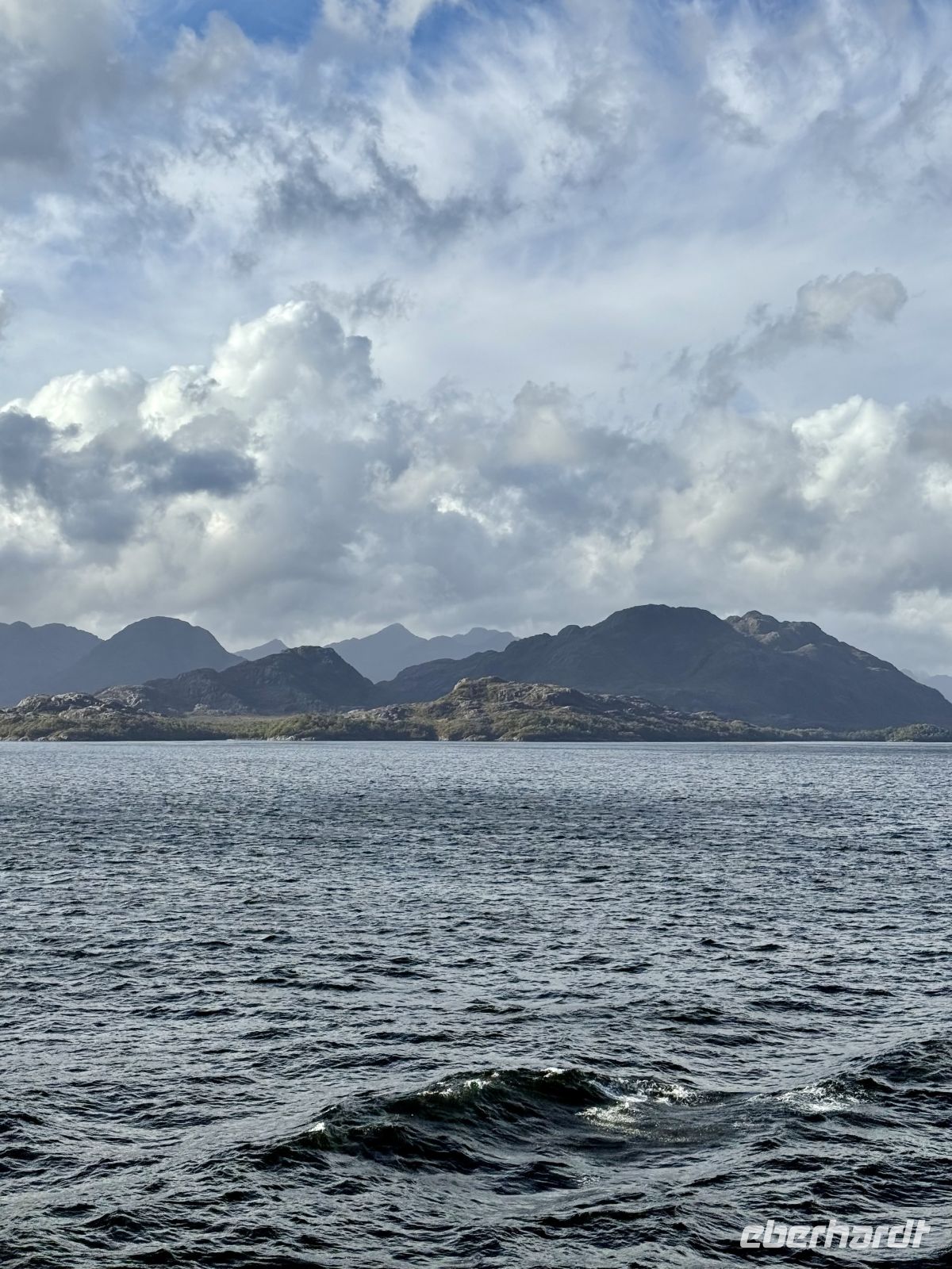 Die Schifffahrt ging weiter, und vom frühen Morgen an stiegen wir in eine Achterbahn der Wetterlagen ein, die nicht aufhörte uns zu überraschen: Nebel, Nieselregen, strahlender Sonnenschein, blaues, hellblaues und dunkles Wasser – alles am selben Tag. So ist Patagonien, diese südlichste Zone der Welt. Das Klima ist launisch, und das ist Teil seines Charmes und seiner Mystik, die es so schön machen. Die Küste mal nah, mal fern. Mit der Zeit wird sie felsiger, die Vegetation spärlicher und niedriger. Der erste Gletscher in Sicht! Was für ein unglaublicher Eindruck! Weiß, Hellblau und Tiefblau, alles in einem einzigen riesigen Eisblock, der sich geduldig, ohne jede Eile, in Richtung Meer bewegt. Die Felsen überraschen uns immer wieder mit ihren kapriziösen Formen, die direkt aus dem Meer auftauchen. Es war eine Zeit, um auf der Promenade spazieren zu gehen, den frischen Wind und die Sonnenstrahlen oder den kalten Nieselregen zu genießen, je nach Moment. Etwas trinken, ein wenig plaudern oder einfach nur dasitzen und den Moment genießen, diesen präzisen, flüchtigen Augenblick, von dem wir im Grunde hoffen, dass er ewig währt.