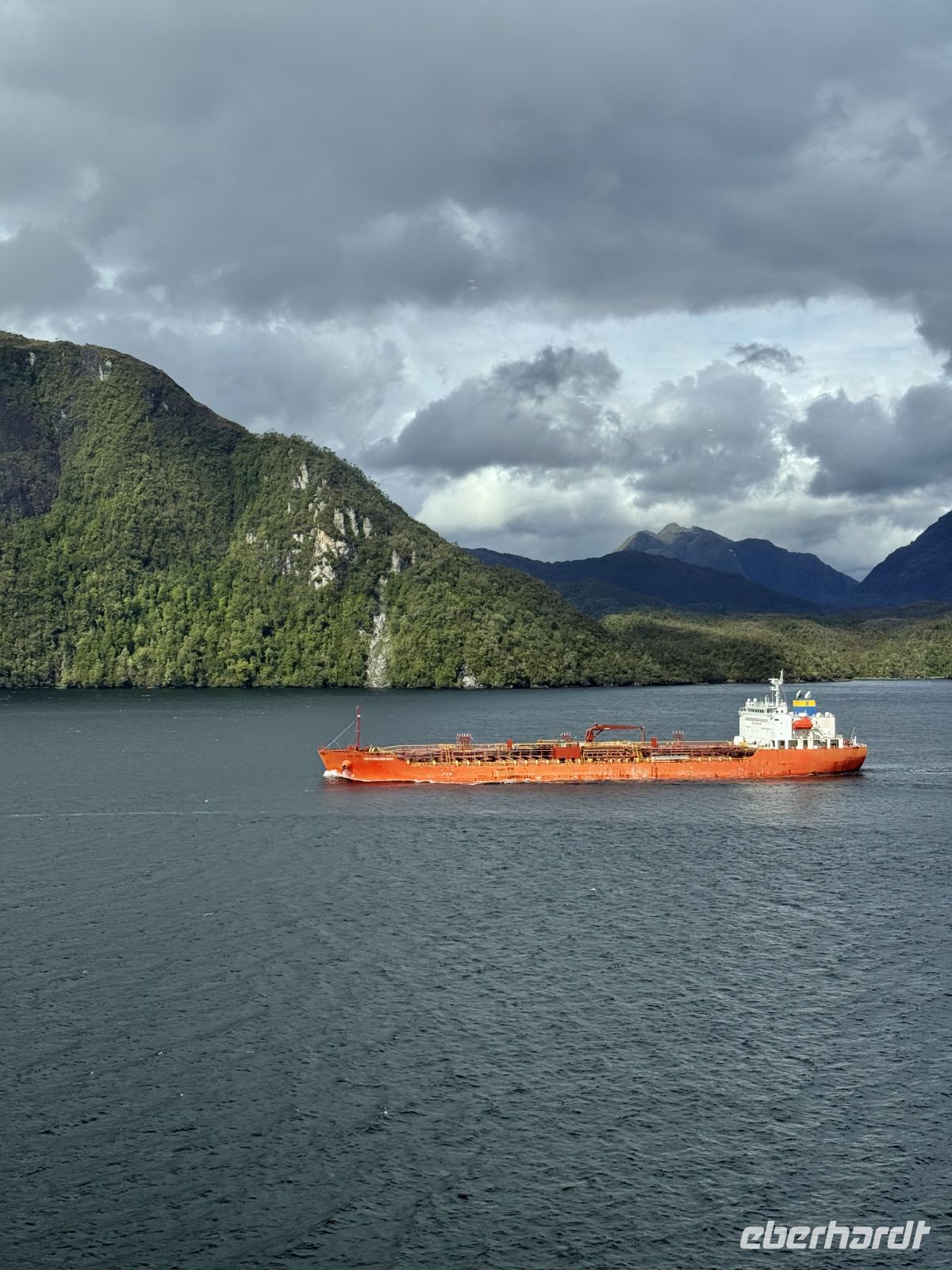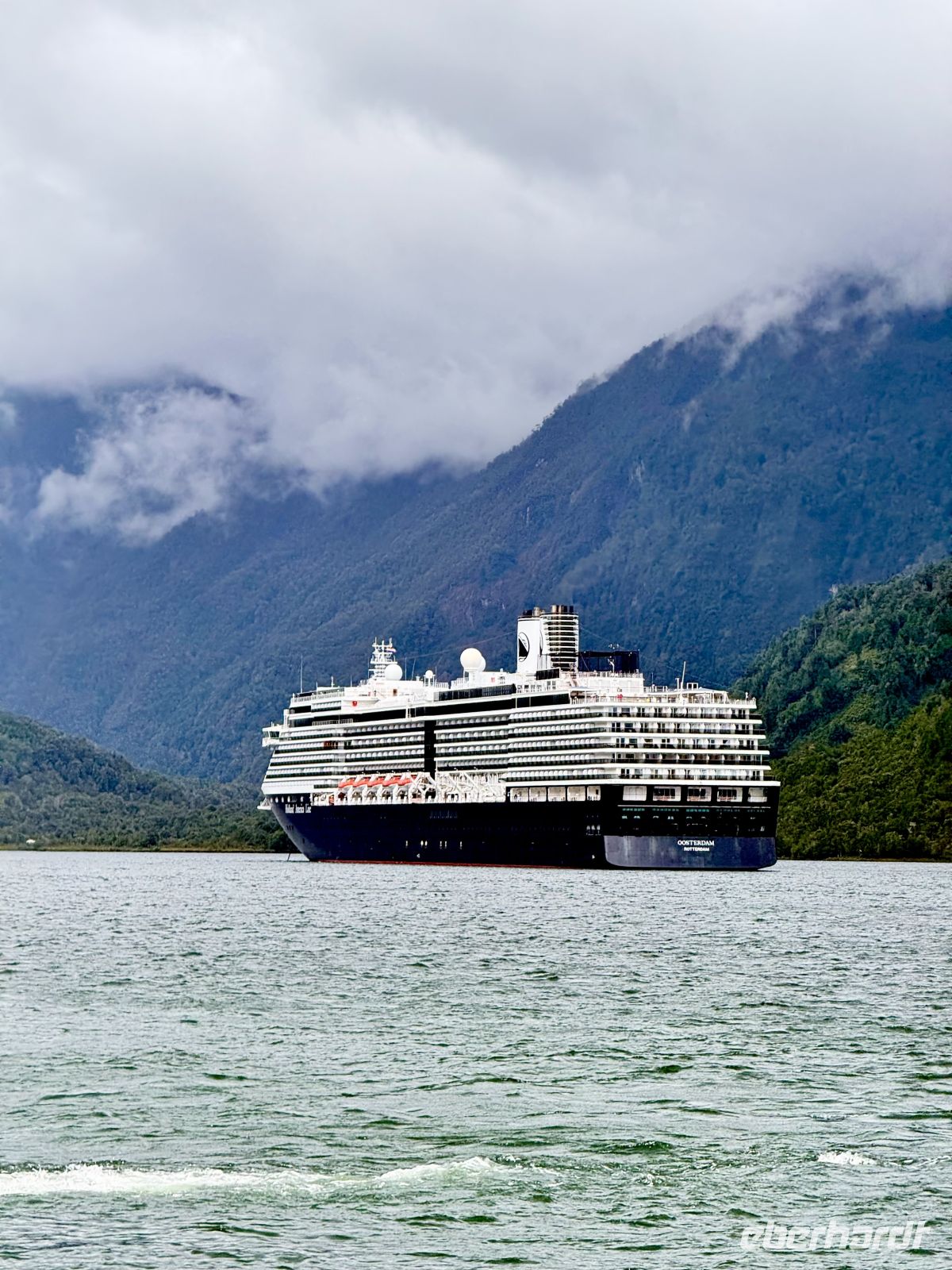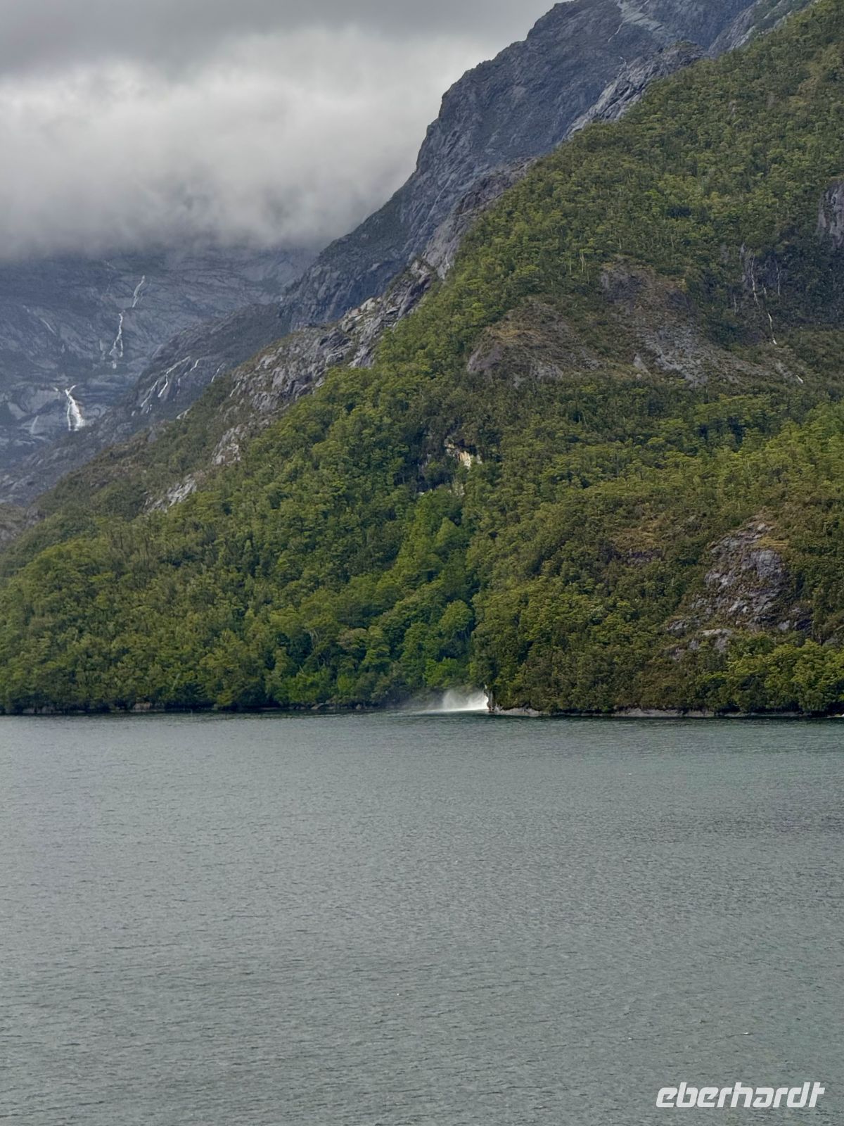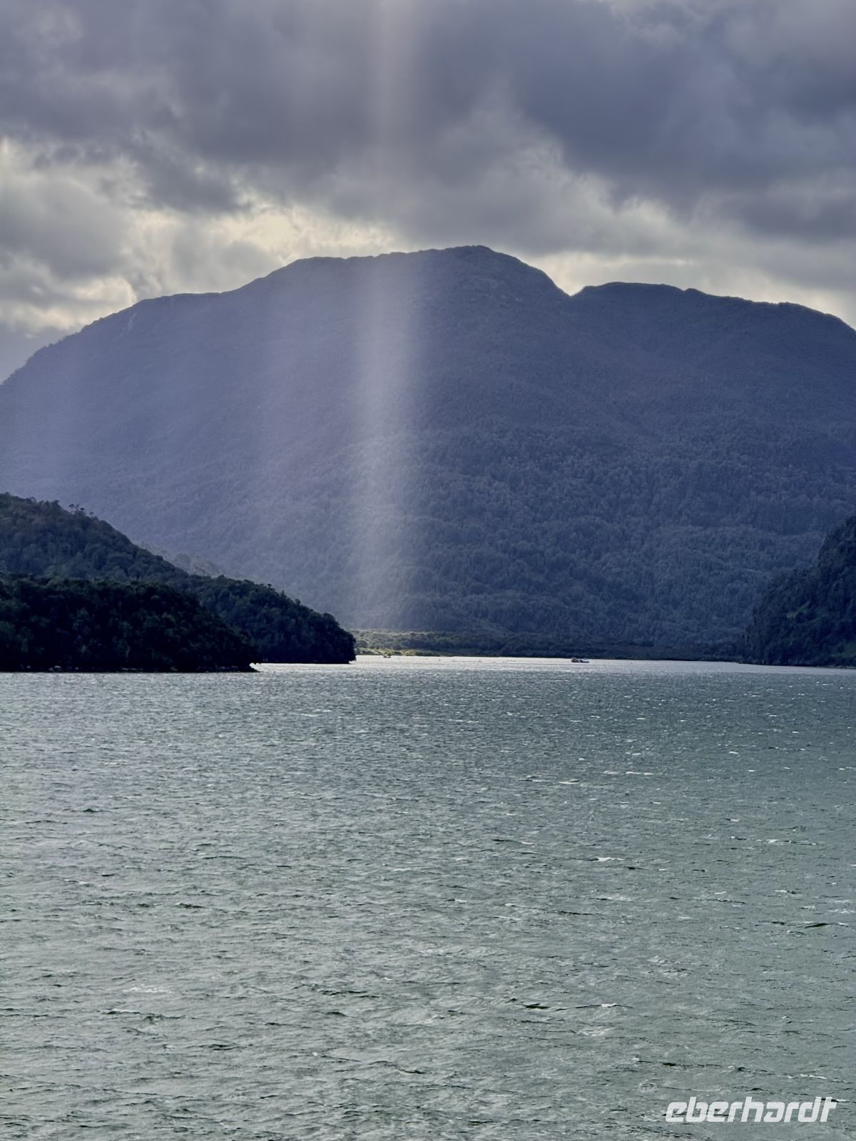 Einige von uns wachten bereits im Morgengrauen auf, denn wenn die Wiege sehr stark geschaukelt wird, können diejenigen, die wie Babys schlafen, aufwachen. Und genau so war es. Das Schiff wiegte sich, was dazu führte, dass die Kleiderbügel im Schrank gegeneinander schlugen. Man hörte auch in Abständen das Dröhnen, das möglicherweise der Bug des Schiffes erzeugte, wenn er bei seinem Schwanken auf das Wasser traf. Da es noch dunkel war, konnte man nicht viel sehen; wir warteten darauf, dass der Tag anbrach, um mit den ersten Strahlen den Horizont, das aufgewühlte Wasser und die umgebenden Berge zu erspähen. Der Regen fiel in Strömen, und so blieb der Morgen mit schönen Blau- und Bleitönen, der einem prachtvollen Nachmittag Platz machte. Die strahlende Sonne, begleitet von einem frischen Wind, den man auch als kalt bezeichnen könnte, ermöglichte uns eine unvergleichliche Fahrt durch die Fjorde. Wir blieben stets an den Flanken von Bergen bewacht, die direkt aus dem Wasser ragen. Die Wasserfälle ließen nicht auf sich warten; von der Höhe der felsigen Berge entsprangen hier und dort zahlreiche Bäche, die auf ihrem kurzen Lauf aus der Höhe im Meer zur Ruhe kamen. Der Frieden ist hier, und man darf ihn nicht stören, sondern nur beobachten und etwas von ihm mitnehmen, das unser Herz tröstet.