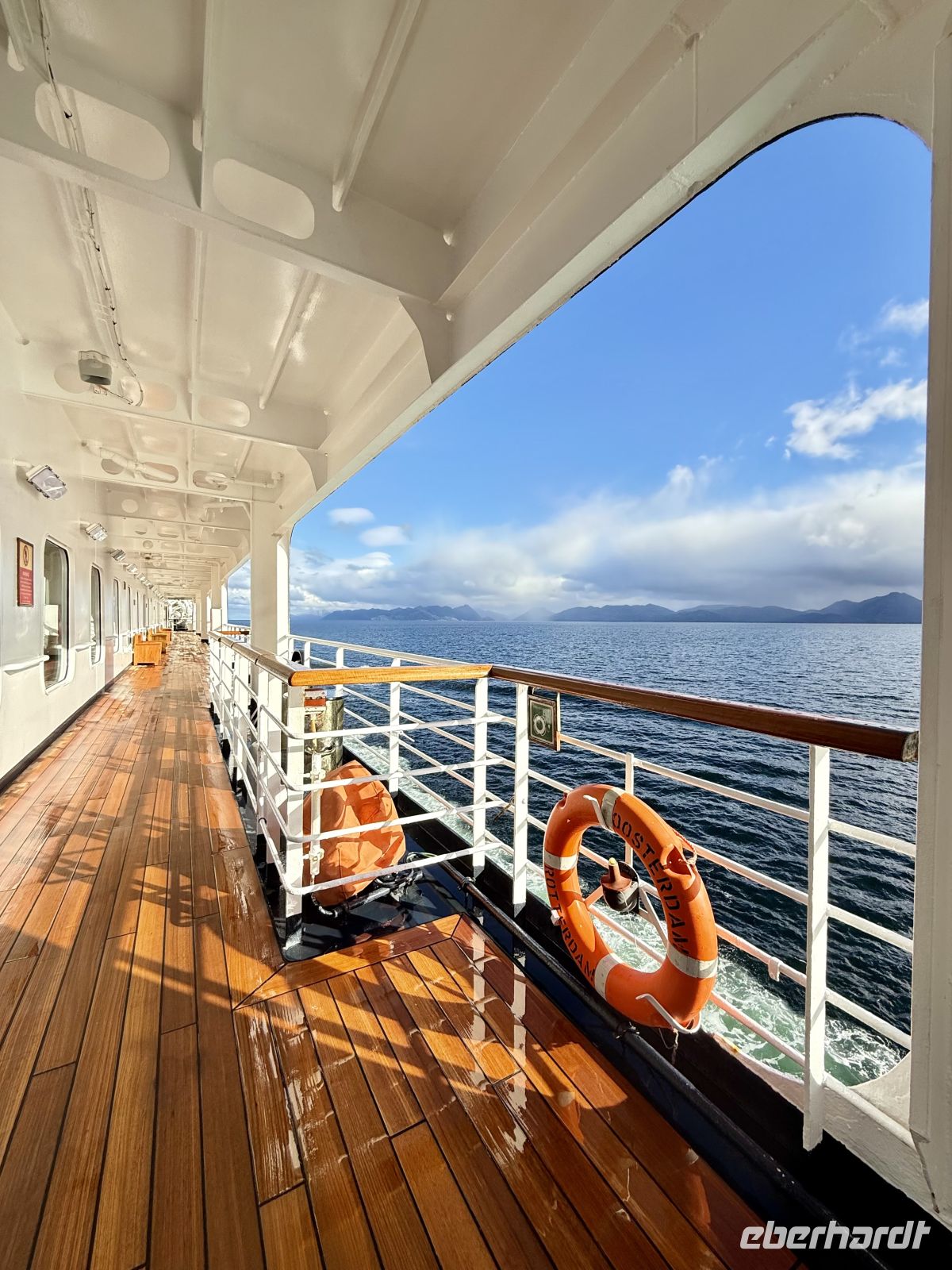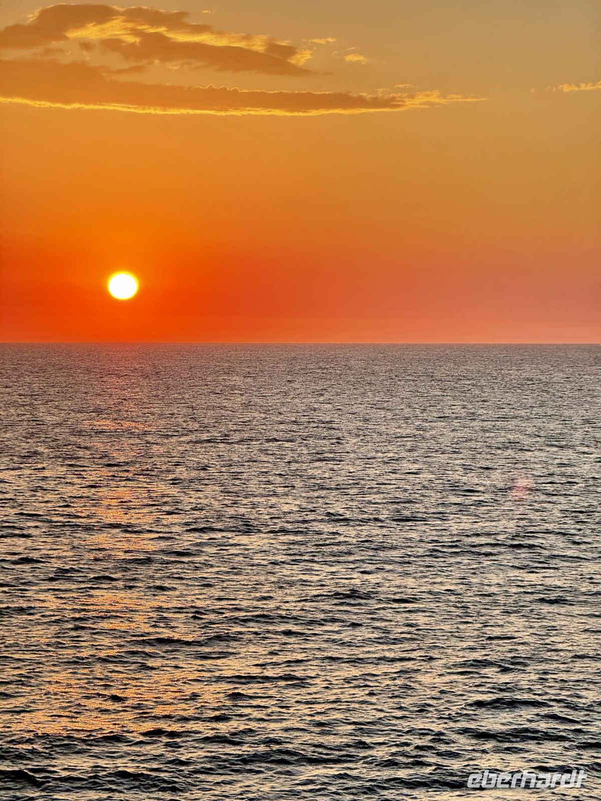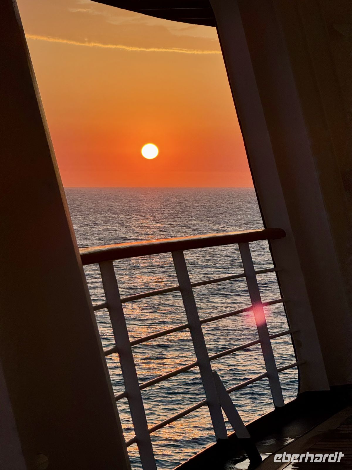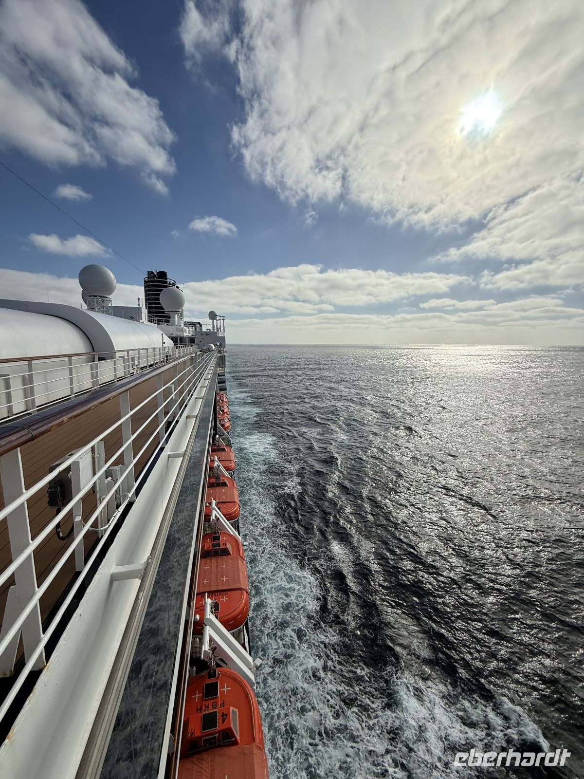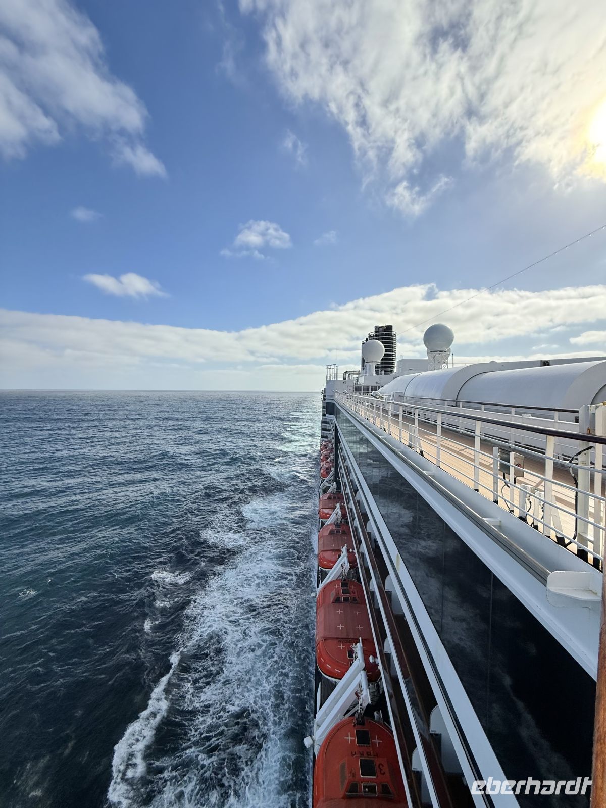 Einen Tag auf See wie diesen hatten wir noch nicht, es gibt keine gleichen Tage auf dieser Reise, aber gut, dieser hatte seine Besonderheiten. Essen, ausruhen, Sport treiben ist immer eine Option, aber im Pool zu schwimmen, im Außenbereich eine Partie Shuffleboard unter einer strahlenden und warmen Sonne zu spielen, ist nicht immer eine Option. Nun, dieser Tag war es. Dort markierte sich ein Vorher und Nachher im Verlauf des Tages. Die Mäntel und Jacken sollten in den Zimmern nicht mehr stören. Und am Ende des Tages sollten sie bereits gut in den Koffern verstaut sein, denn im Rest der Reise würden wir sie nicht mehr benutzen. Den Sonnenuntergang, präzise wie wenige, sahen wir von unserem gewohnten Abendessen-Tisch aus, alle in orangefarbene Kleidung gehüllt, denn an diesem Tag wurde der Ehrentag des holländischen Stolzes gefeiert, zu Ehren unseres Schiffes. Es war ein Tag des Lachens, an dem wir alle zusammen als kleine Gemeinschaft teilten, die wir waren, mit engen Banden, die im Laufe der Tage entstanden sind.