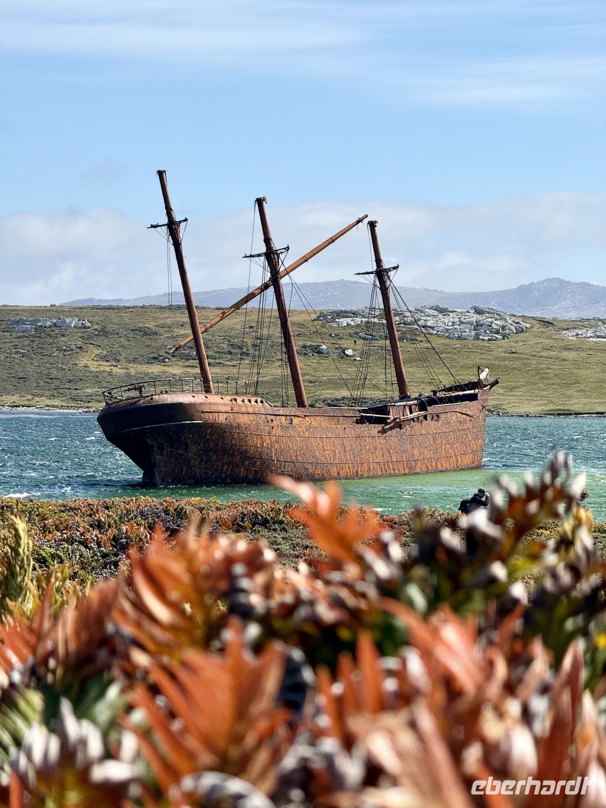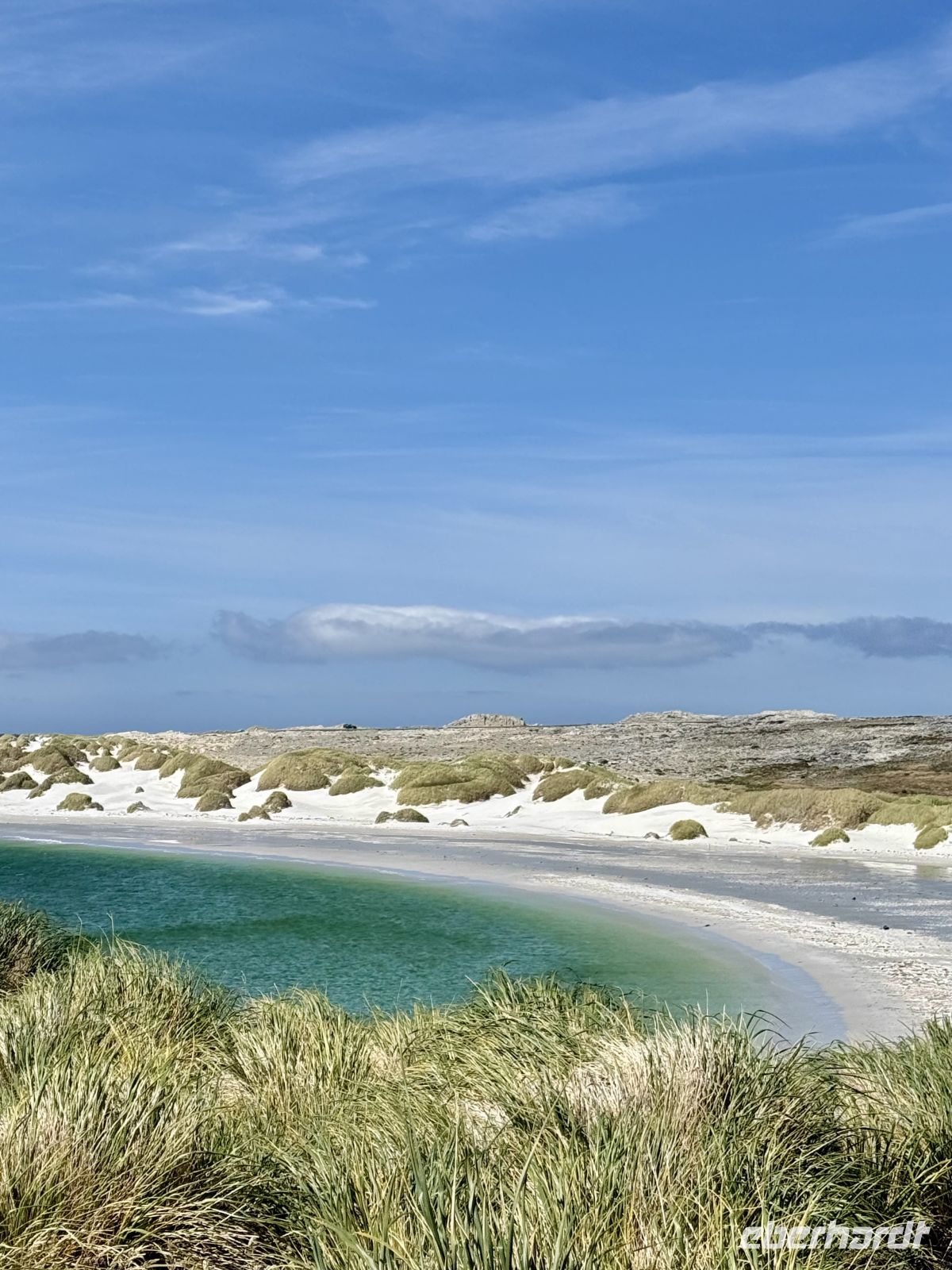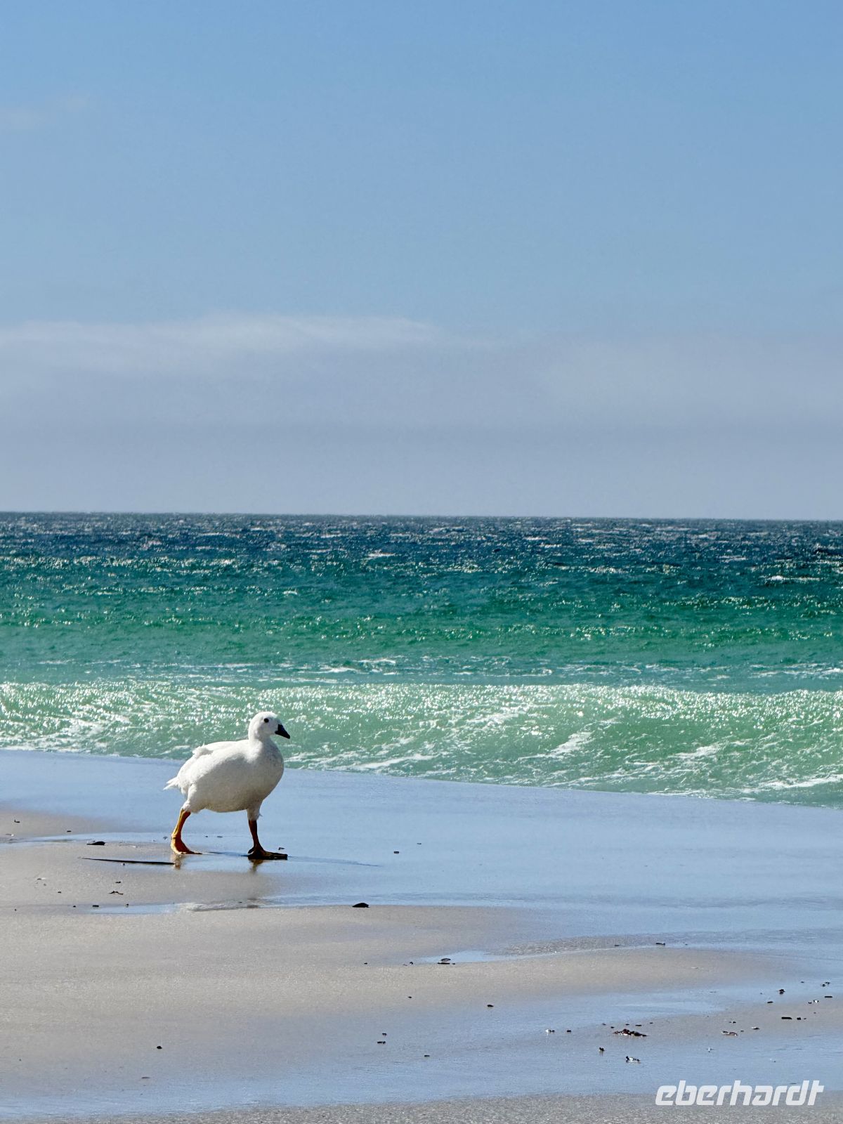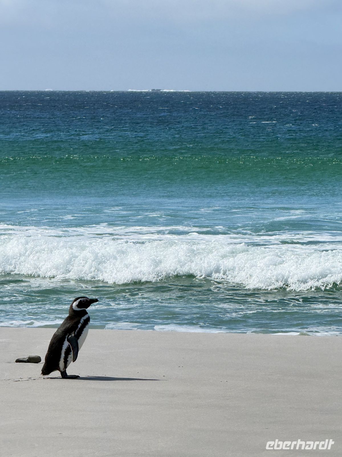 Wenn wir unsere Reise schon im fernen Deutschland begannen, so starteten wir diesen Tag mit gutem Sonnenschein und einer großen Dosis Wind. Die ersten Morgenstunden schenkten uns eine ganz besondere Einfahrt in die Bucht, in der sich der Hafen von Stanley befindet. In der Ferne auf beiden Seiten Strände, Wiesen und der eine oder andere ferne niedrigere Gipfel. Vor uns die bunten Dächer der Häuser, die das kleine Dorf bilden. Es gibt von allem etwas, aber im Allgemeinen von jedem eines. Eine Bank, eine Post, eine katholische Kirche, eine anglikanische. Aber nun gut, Restaurants gibt es vielleicht drei, ebenso wie ein paar andere Geschäfte. Nach einem wie immer kurzen Abenteuer mit den Tender-Booten waren wir an der Küste, bereit, die Insel zu erobern, sehr begierig darauf, den Pinguinen wenigstens für eine Weile Gesellschaft zu leisten. Und in den meisten Fällen sollte es so sein. Eine Gruppe von 5 Mutigen begleitete mich, um die Insel spontan zu besuchen, und alles lief wie am Schnürchen. In einem schönen Allradfahrzeug besuchten wir Orte, die nicht sehr weit entfernt waren, denn es gibt Schönheiten nur einen Sprung entfernt. Seien es die Strände, die Dünen, Felsvorsprünge, alte Kanonen aus dem einen oder anderen Krieg oder ein gesunkenes Schiff – es gab immer etwas Interessantes zu sehen. Aber ohne jeden Zweifel waren die Hauptdarsteller dieser Show die lokale Fauna. Die Pinguine mit ihrer besonderen Präsenz und ihrem Gang schmückten bereits die ohnehin paradiesischen Strände, von denen man, wäre da nicht die Temperatur, die man auf den Fotos nicht sieht, denken würde, sie lägen nahe bei Cancún. Weißer Sand, türkisfarbenes Wasser, aber Vorsicht! In den Wassern räkeln sich auch die Seelöwen, und man möchte keinen Kuss von dieser Art Fremden. Wir genossen den Vormorgen und einen Teil des Nachmittags vollauf. Ein starker Windstoß frischte auf und zwang unsere fähigen Tender-Führer, alles zu geben, um bei ihren Manövern den Winden, Strömungen und Wellen entgegenzuwirken. Wir legten noch bei Tageslicht ab, der Wind war noch kalt, aber die Mäntel, Mützen, Handschuhe und Schals, mit denen wir uns erst vor wenigen Stunden ausgiebig eingemummelt hatten, waren bereits abgelegt. Wieder ein genialer Tag in dieser Abfolge von Tagen, wir vermerken einen weiteren, den man nicht vergessen wird.