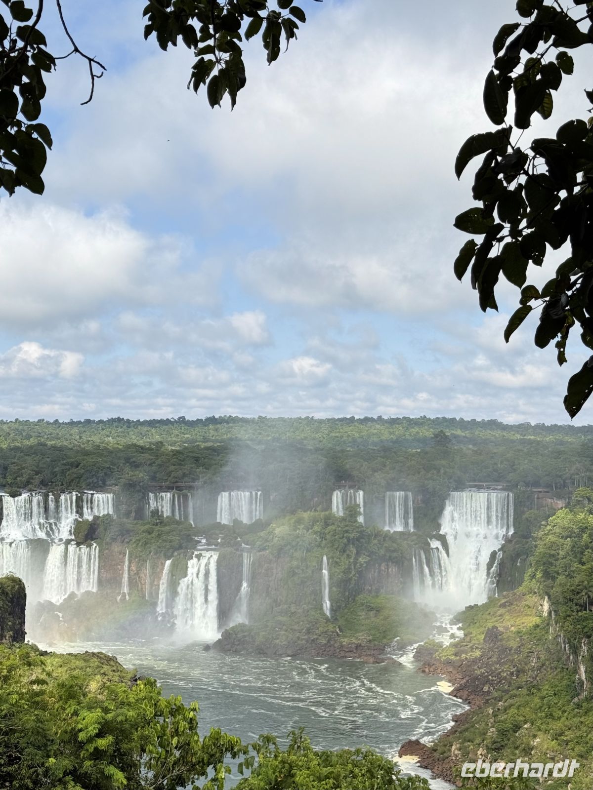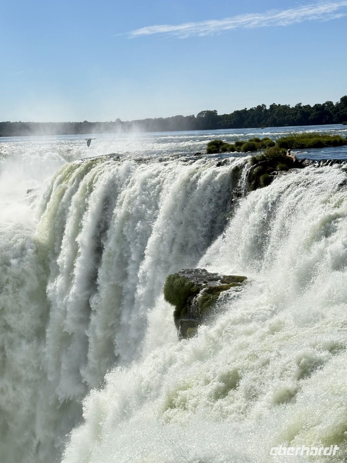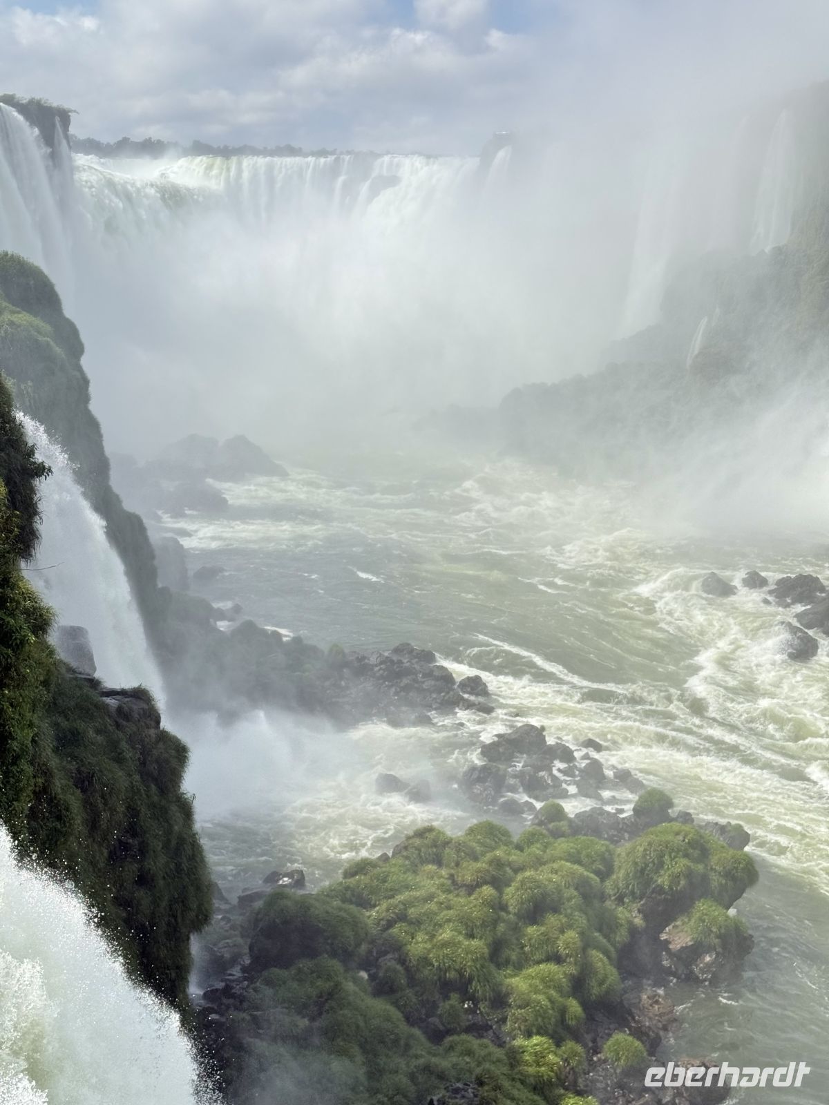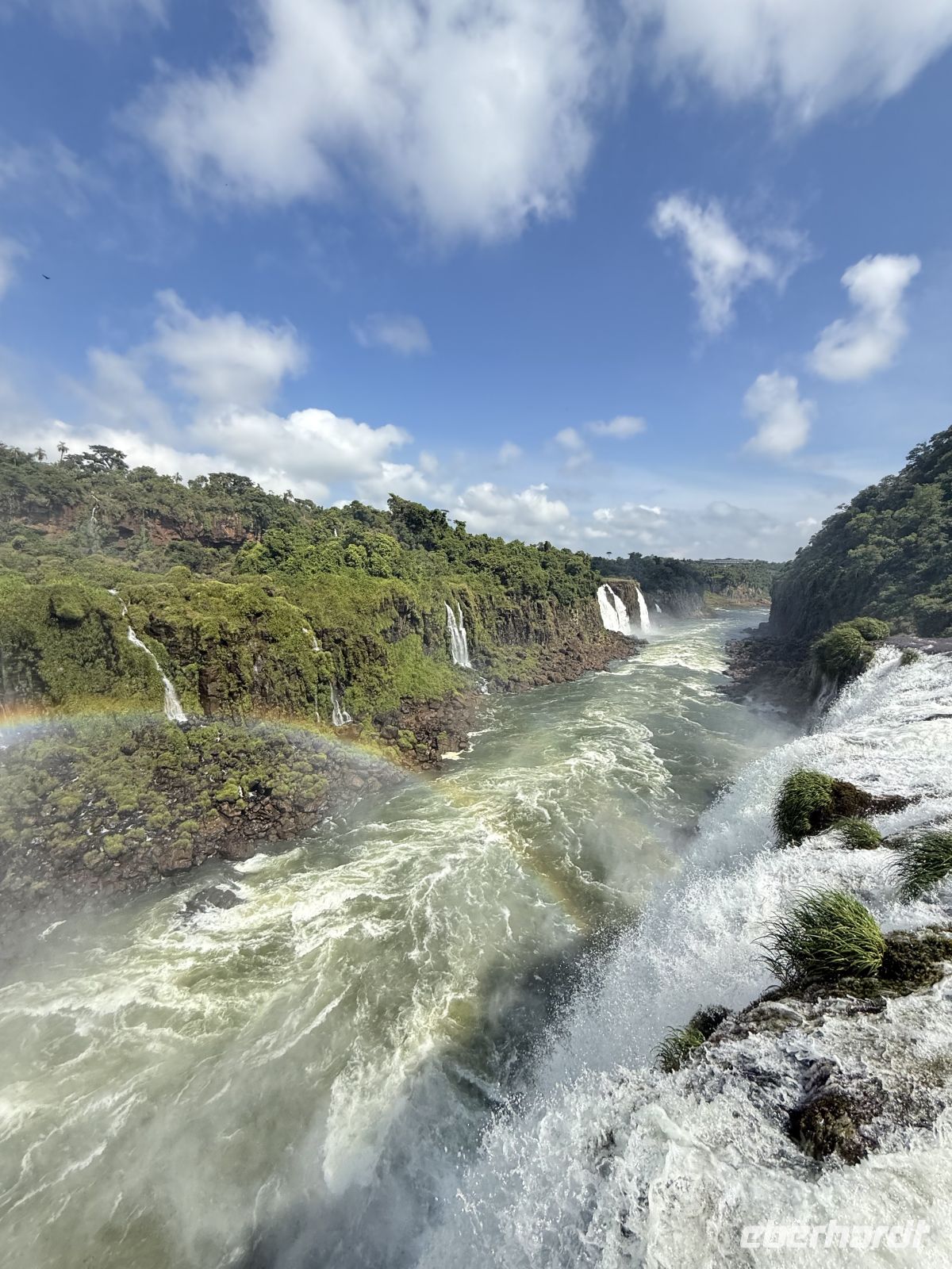 Es ist sehr schwer, einen Tag mit dem anderen zu vergleichen, aber wir könnten ohne Zweifel sagen, dass dieser Tag besonders war. Vielleicht durch eine geniale Verschwörung von Faktoren wie dem Ort, dem Wetter, der Farbe des Wassers, der Tageszeit und dem Winkel, in dem das Licht gebrochen wird, dem geringen Touristenandrang – kurzum, wir hatten Glück wie wenige, Wasserfälle mit klarem Wasser unter einer strahlenden Sonne zu sehen, ohne sie mit vielen Anwesenden teilen zu müssen. So entfaltete sich unser Vormittag: eine friedliche und lange Wanderung auf dem, was ein ausgedehnter Balkon von etwas mehr als einem Kilometer zu sein schien. Jeden Moment variiert die Aussicht ein wenig, und es gibt Momente, in denen sie es plötzlicher tut. Das Licht ändert sich, der Beobachtungswinkel oder die Sonnenstrahlen, alles ändert sich ständig und jedes Mal scheint uns der aktuelle Moment besser als der vorherige. Und mit dieser Emission gehen wir weiter voran und als wäre dies geplant gewesen! Boom – plötzlich sind wir am Ende des Traumwerks. Wasser überall, Regenbögen bilden sich hier und dort durch die feuchte Brise der unendlichen Wasserfälle. Soweit das Auge in die eine oder andere Richtung reicht, fließt das Wasser. Ein dankbarer Moment, und ohne dass wir es merken, macht uns genau diese angenehme Brise nach und nach nass, fast ohne dass wir es bemerken, weil wir so vertieft in die Betrachtung dessen sind, was eines der 7 neuen Weltwunder ist. Wenn das Begehen des Balkons eine geniale Erfahrung war, so war das Überfliegen der Wasserfälle und das Wagnis in ihre Wasser bis zu ihren eigentlichen Füßen für einige ein kompletter und schöner Wahnsinn. Am Nachmittag der Flug nach Rio und unser nächstes Ziel um die Ecke, auf der Zielgeraden unseres Abenteuers.