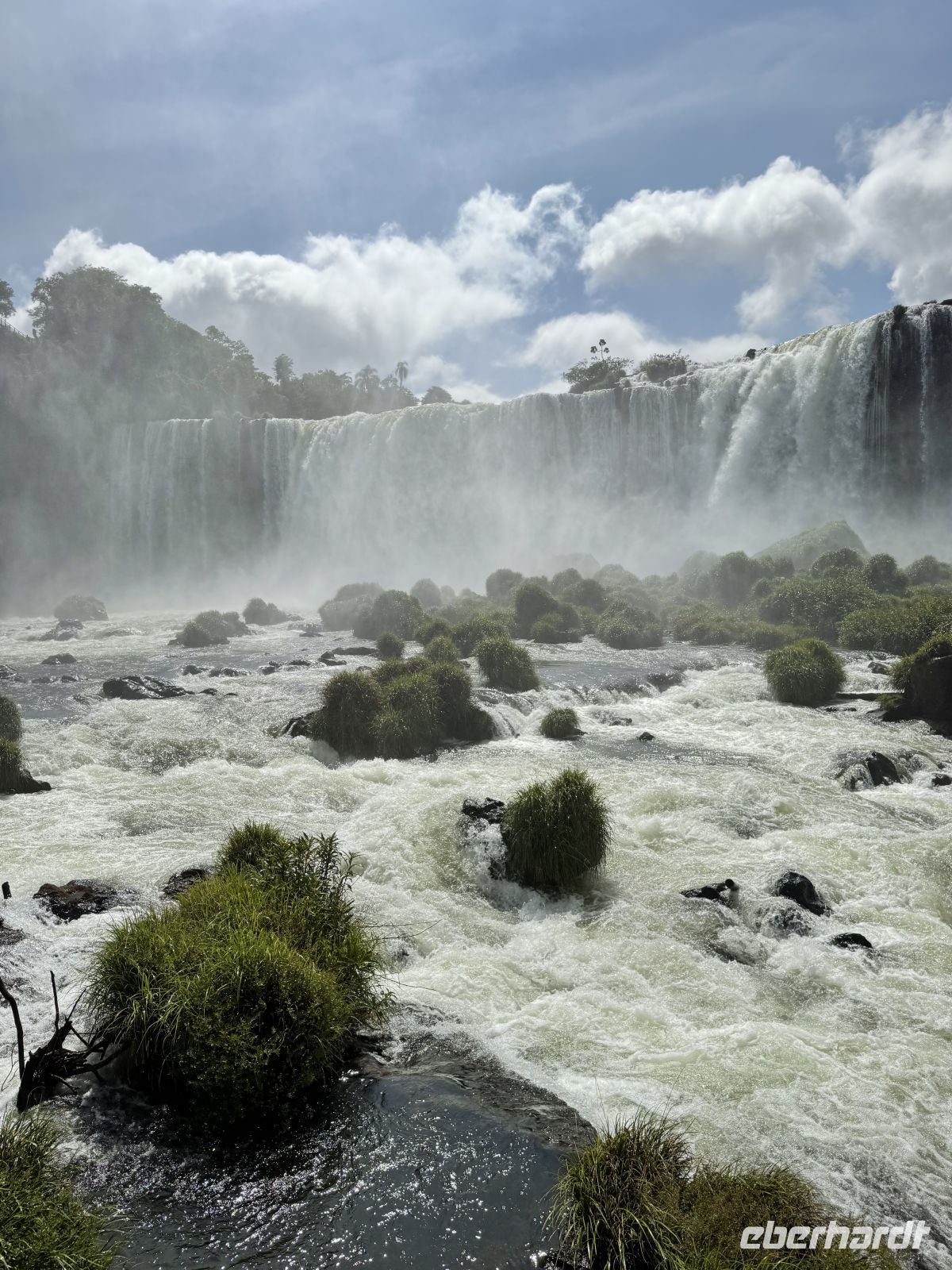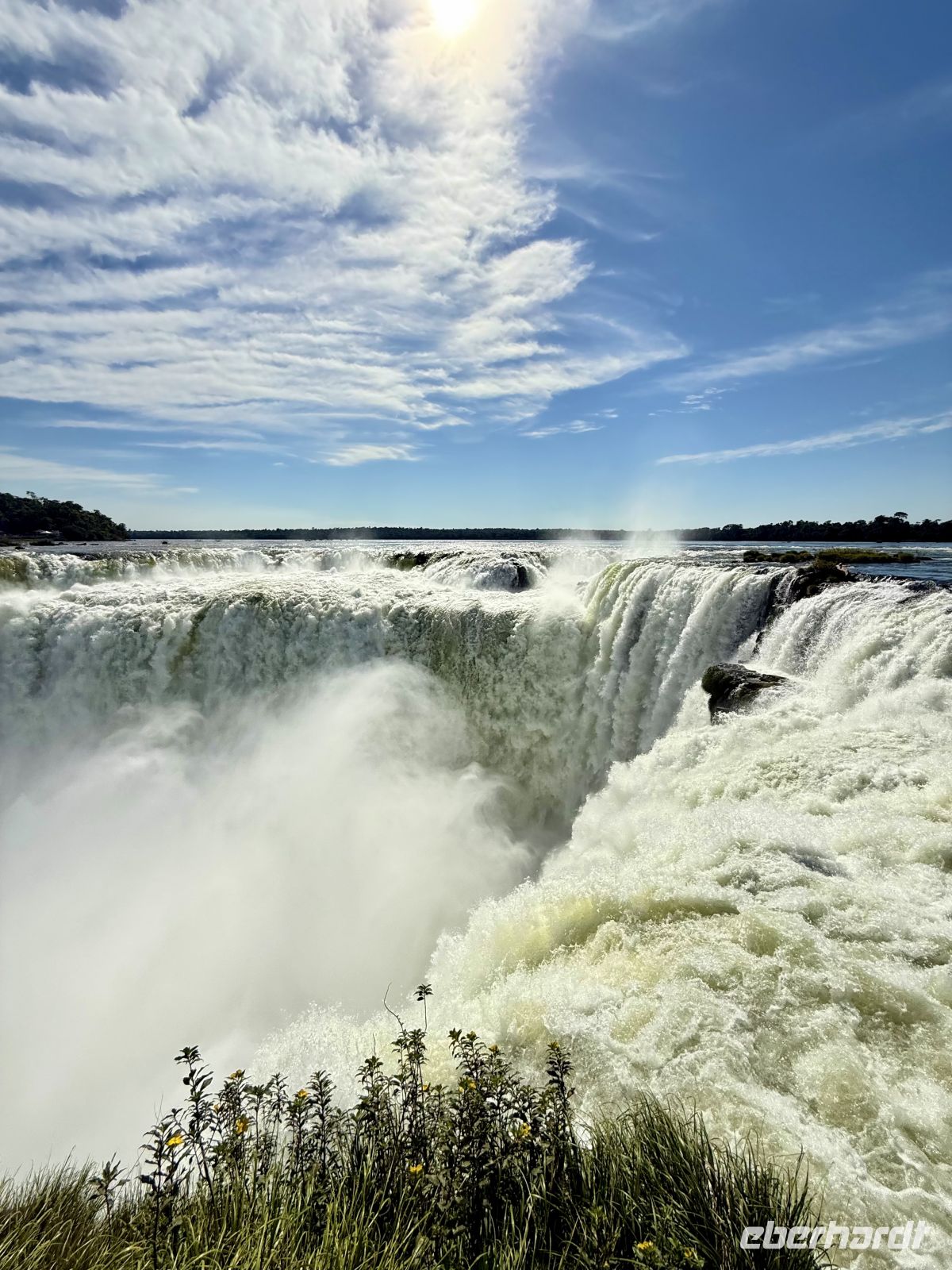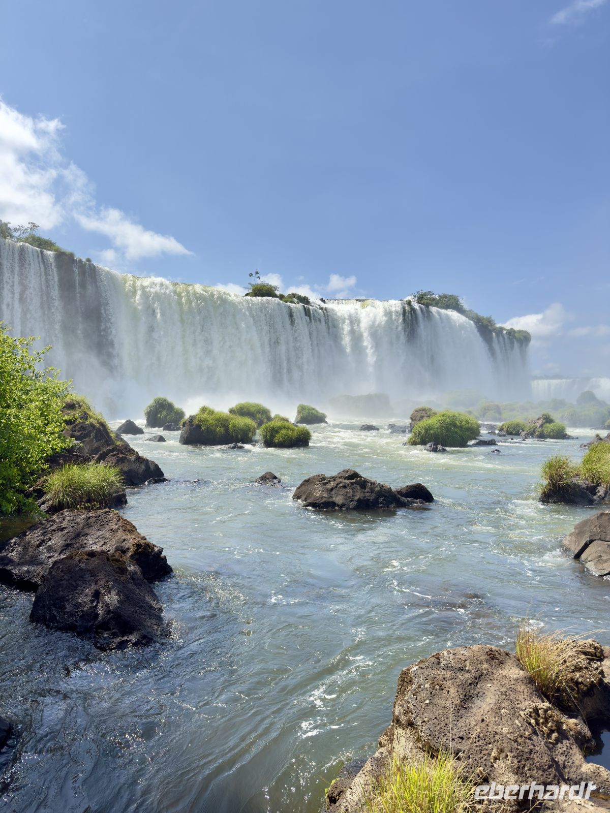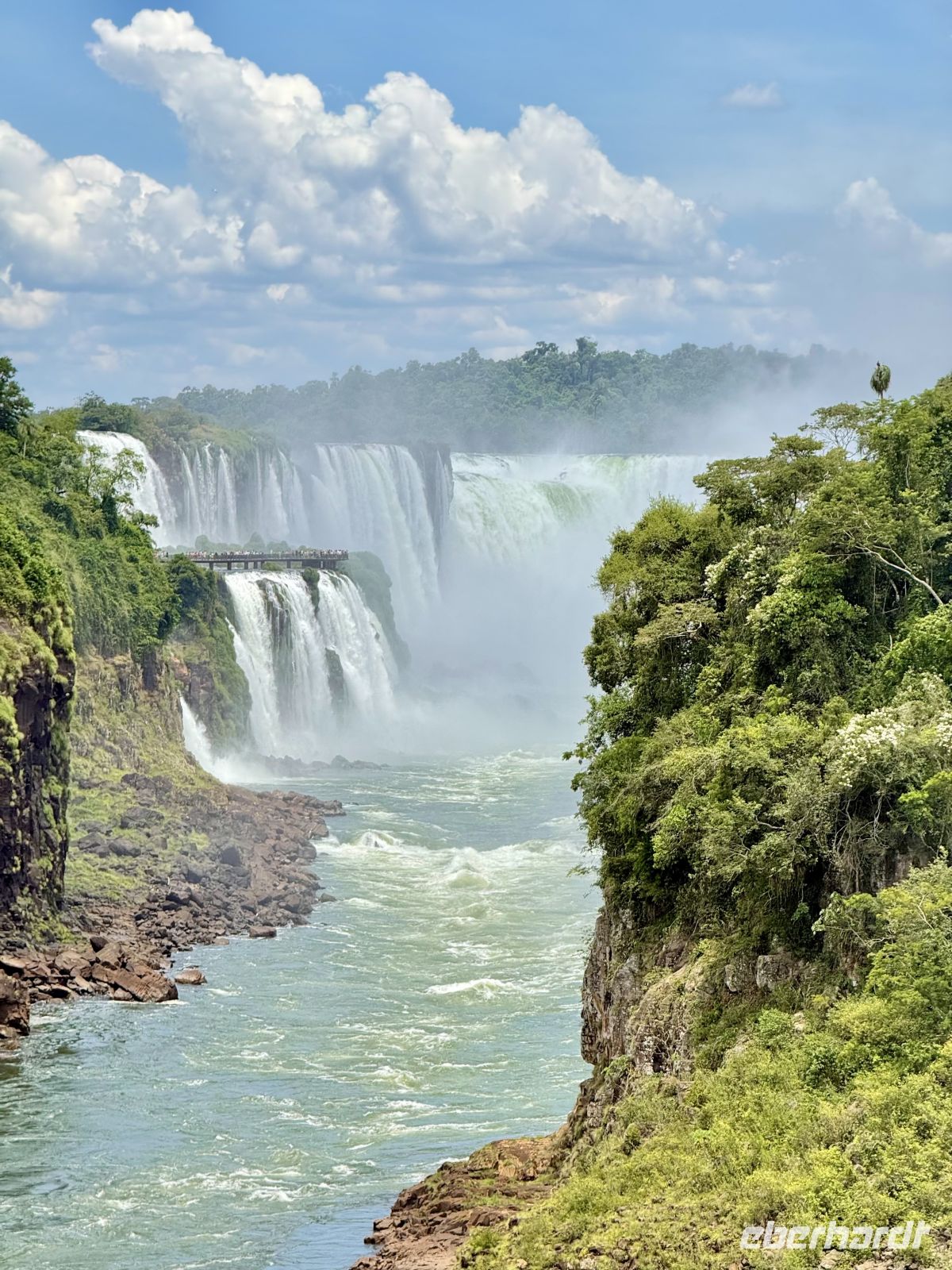 Es ist sehr schwer, einen Tag mit dem anderen zu vergleichen, aber wir könnten ohne Zweifel sagen, dass dieser Tag besonders war. Vielleicht durch eine geniale Verschwörung von Faktoren wie dem Ort, dem Wetter, der Farbe des Wassers, der Tageszeit und dem Winkel, in dem das Licht gebrochen wird, dem geringen Touristenandrang – kurzum, wir hatten Glück wie wenige, Wasserfälle mit klarem Wasser unter einer strahlenden Sonne zu sehen, ohne sie mit vielen Anwesenden teilen zu müssen. So entfaltete sich unser Vormittag: eine friedliche und lange Wanderung auf dem, was ein ausgedehnter Balkon von etwas mehr als einem Kilometer zu sein schien. Jeden Moment variiert die Aussicht ein wenig, und es gibt Momente, in denen sie es plötzlicher tut. Das Licht ändert sich, der Beobachtungswinkel oder die Sonnenstrahlen, alles ändert sich ständig und jedes Mal scheint uns der aktuelle Moment besser als der vorherige. Und mit dieser Emission gehen wir weiter voran und als wäre dies geplant gewesen! Boom – plötzlich sind wir am Ende des Traumwerks. Wasser überall, Regenbögen bilden sich hier und dort durch die feuchte Brise der unendlichen Wasserfälle. Soweit das Auge in die eine oder andere Richtung reicht, fließt das Wasser. Ein dankbarer Moment, und ohne dass wir es merken, macht uns genau diese angenehme Brise nach und nach nass, fast ohne dass wir es bemerken, weil wir so vertieft in die Betrachtung dessen sind, was eines der 7 neuen Weltwunder ist. Wenn das Begehen des Balkons eine geniale Erfahrung war, so war das Überfliegen der Wasserfälle und das Wagnis in ihre Wasser bis zu ihren eigentlichen Füßen für einige ein kompletter und schöner Wahnsinn. Am Nachmittag der Flug nach Rio und unser nächstes Ziel um die Ecke, auf der Zielgeraden unseres Abenteuers.