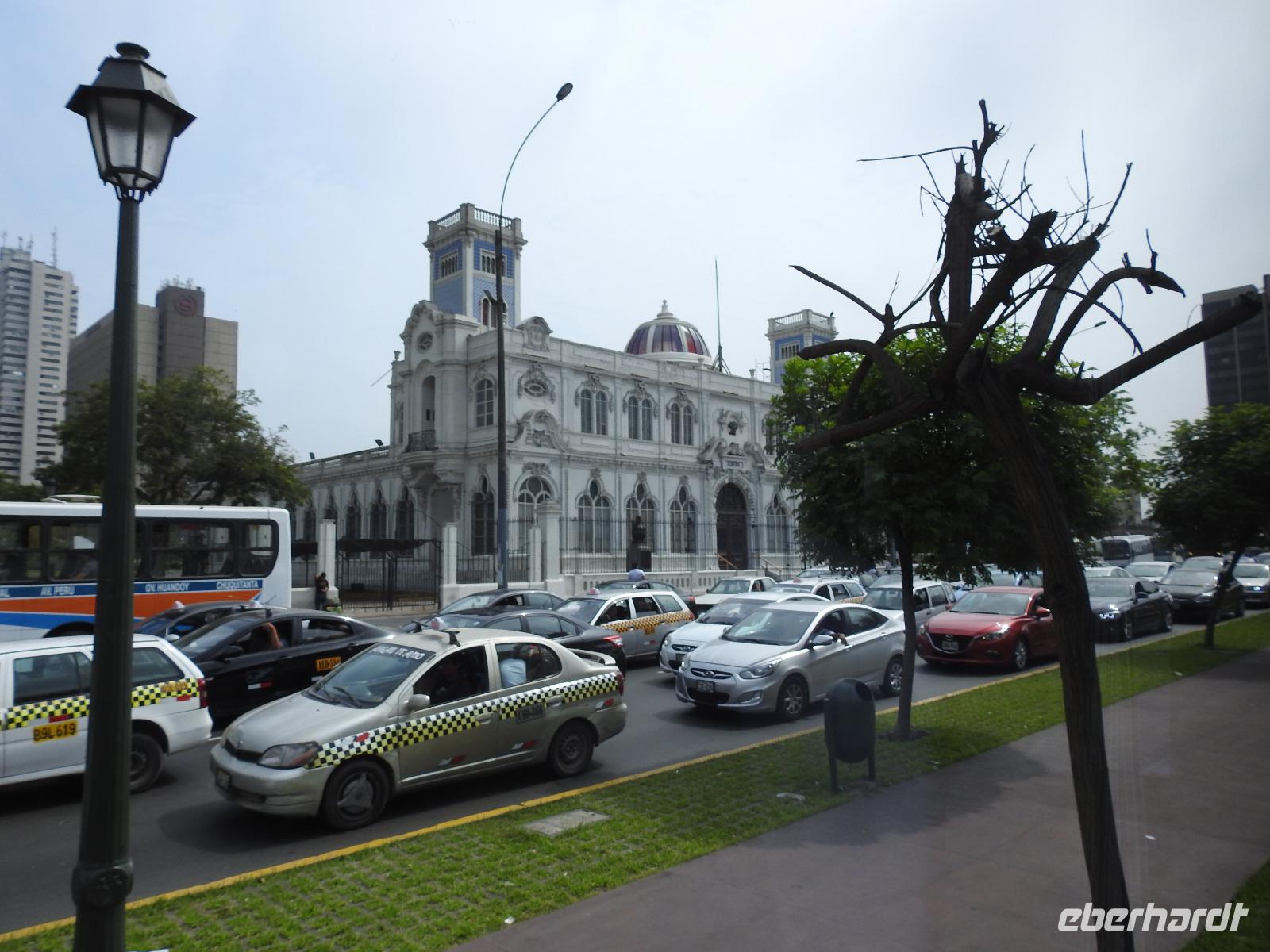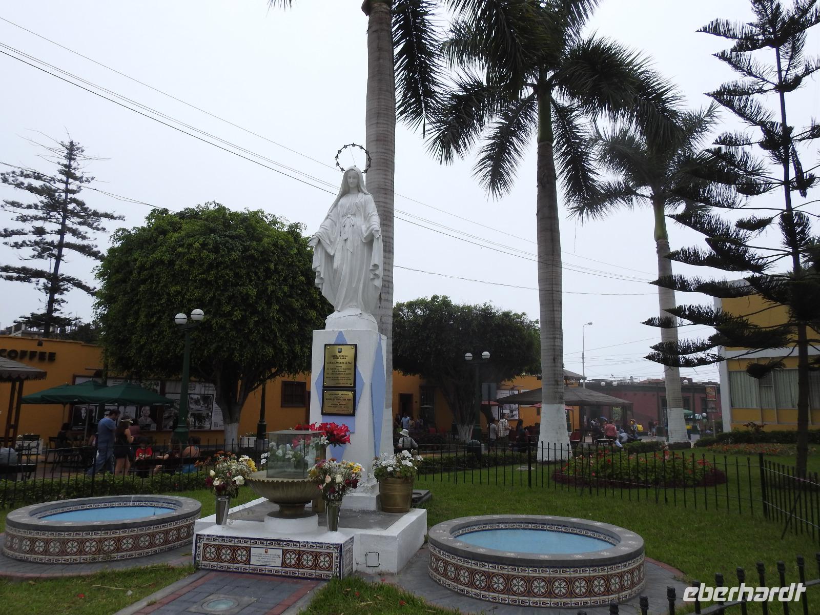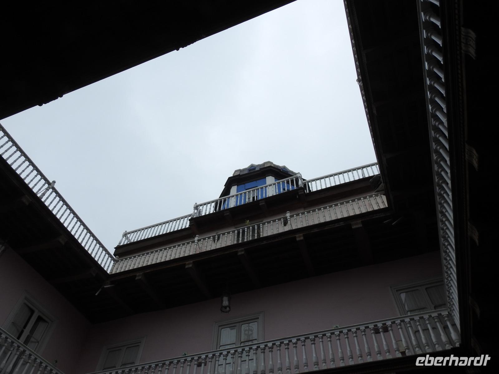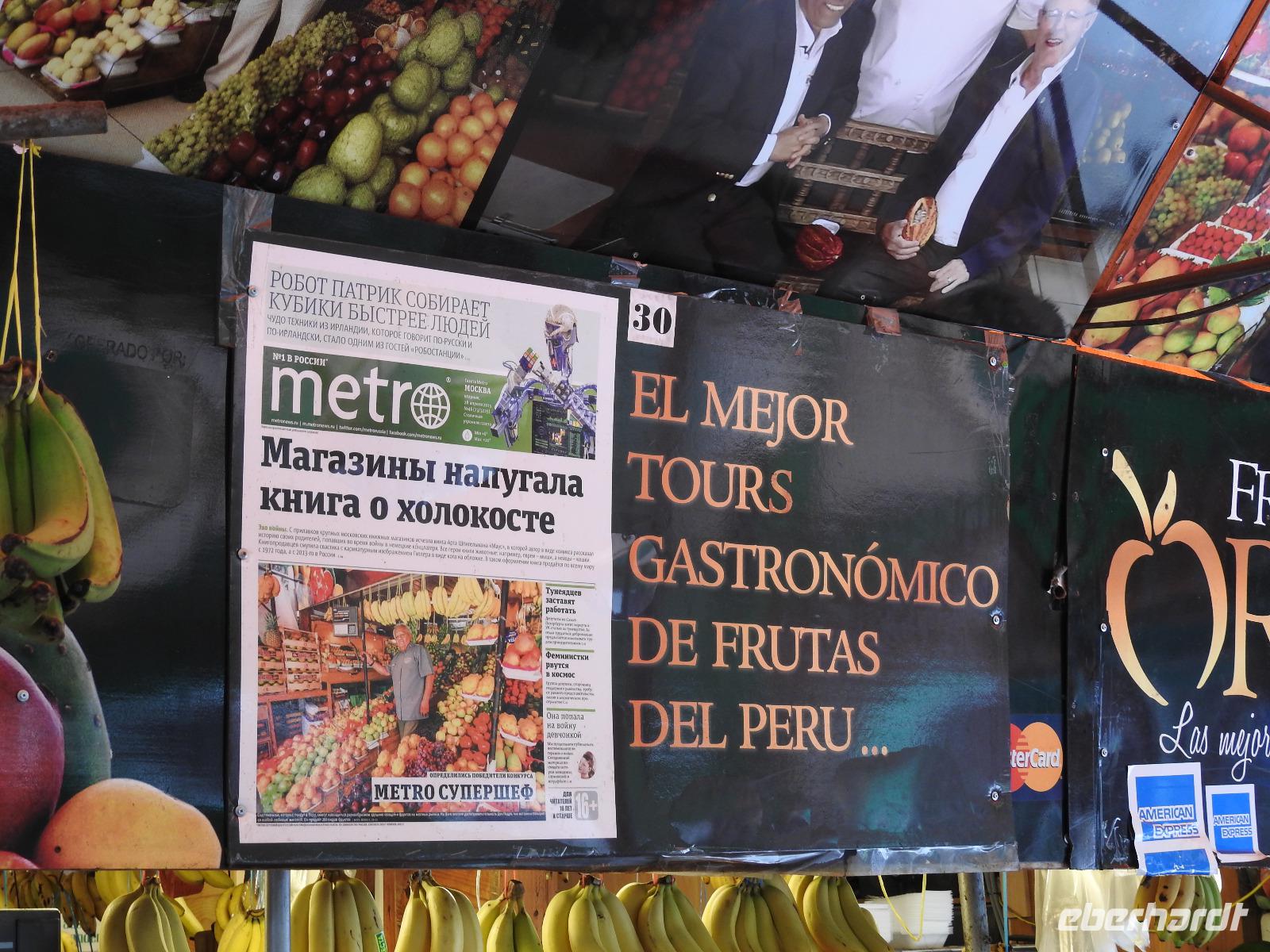 Frühstück gibt es ab 6.30 Uhr. Der Frühstücksraum befindet sich direkt gegenüber der Rezeption. Man gibt seine Zimmernummer an und kann sich am reichhaltigen Buffet bedienen. Auf den Tischen liegen kleine Speisekarten, von denen man sich zusätzlich etwas bestellen kann. So zum Beispiel Spiegelei, Omelett oder Joghurt mit Früchten. Aber auch so ist das Angebot üppig. Um neun starten wir unsere Rundfahrt durch Lima. Unser erstes Ziel ist die Huaca Pucllana - das einzige prähistorische Gebäude in Miraflores. Huaca bedeutet so viel wie Heiliger Ort, die Bezeichnung stammt aus der Inkasprache Quechua. Im Stadtgebiet von Lima befinden sich 54 Huacas, in ganz Peru noch viel mehr. Bis vor Kurzem war dieser Ort noch eine unbeachtete Müllhalde, erst in den letzten Jahren entdeckten die Peruaner, welchen Kulturschatz sie hier haben. Wir sehen die vielen aufgestapelten Lehmziegel, wie ein riesiges Bücherregal sieht das aus. Der Hintergrund dieser Bauweise war aber, das Gebäude erdbebensicher zu bauen. Weiter geht es für uns durch die Stadt bis zum Plaza San Martin. Dieser gilt als einer der schönsten Plätze der Stadt. In der Mitte erhebt sich, unübersehbar, eine Statue für den Mann, nach dem der Platz benannt wurde - José San Martin. Er trägt auch den Namen LIBERTADOR, was soviel wie BEFREIER heißt, denn er war einer der Anführer der Rebellion, die zur Unabhängigkeit von Peru, Chile und Argentinien von Spanien führte. Wir kommen nun zum Plaza Mayor oder auch Plaza de Armas, der wichtigsten Sehenswürdigkeit in Lima. Dieser Platz entstand 1535 und atmet förmlich die Geschichte der Stadt. Über die Jahrhunderte hinweg hatte der Platz vielfältige Funktionen, mal war hier ein Markt, mal eine Hinrichtungsstätte, ein Verkündungsort oder eine Stierkampfarena. Hier erklärte 1821 General José San Martin die Unabhängigkeit Perus. Bei unserer weiteren Besichtigung erfahren wir viel über die Geschichte von Peru, besichtigen schöne Bürgerhäuser mit Holzbalkonen und gelangen schließlich zu einem Markt. Hier erklärt uns Ursula die verschiedenen einheimischen Früchte und wir bekommen einiges zu kosten. Anschließend probieren wir die peruanische Spezialität Pan Con Chiccarron - ein Brötchen mit Schweinefleisch, Süßkartoffelchips und Zwiebeln. Dazu gibt es Lucuma-, Chirimoya- oder Mangosaft. Alles in allem äußerst lecker und sättigend. Zum Nachtisch sind noch Picarones geplant, aber die sind heute aus und Ursula besorgt uns andere süße Köstlichkeiten. Diese verspeisen wir dann im Hotel bei einer gemütlichen Kennenlernrunde. Vom Reiseveranstalter Eberhardt-TRAVEL gibt es dazu noch ein Pisco Sour als Begrüßungsgetränk und so mancher kann sich jetzt kaum noch bewegen. Der Rest des Tages steht zur freien Verfügung. So zum Beispiel spazieren einige Unermüdliche noch zum Park der Liebe, der sehr stark an den Park Güell in Barcelona erinnert, denn die Bänke und Wände haben hier das gleiche Design. Darüber hinaus hat man eine großartige Sicht auf den Pazifik, in dessen Wellen sich viele Surfer tummeln.