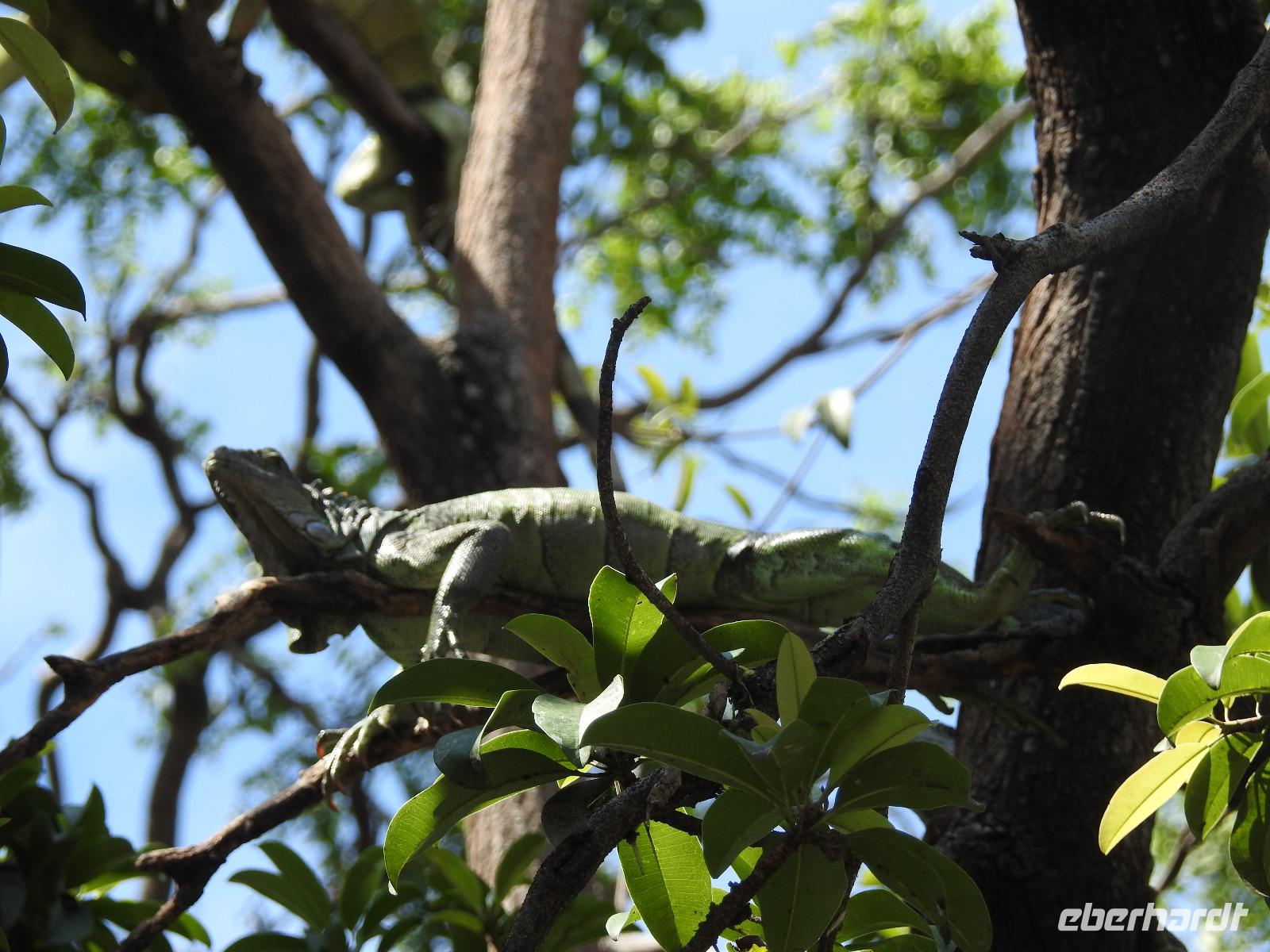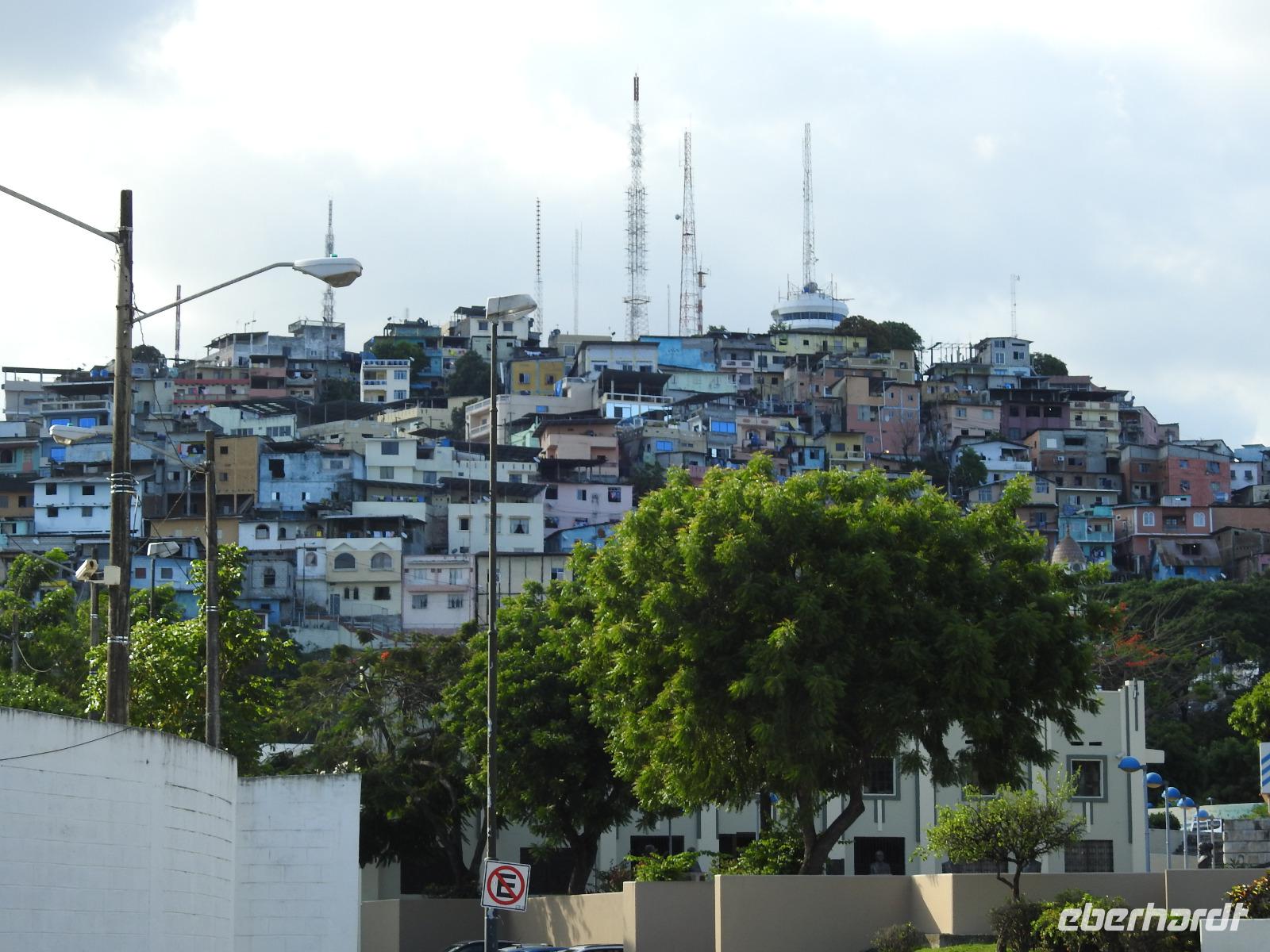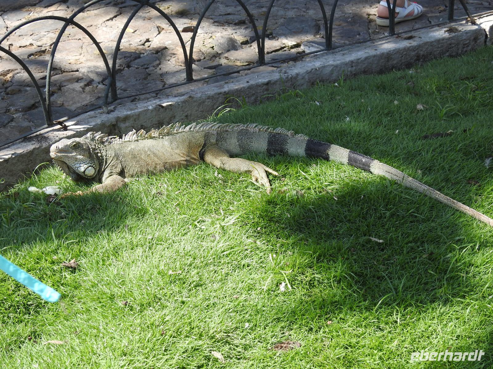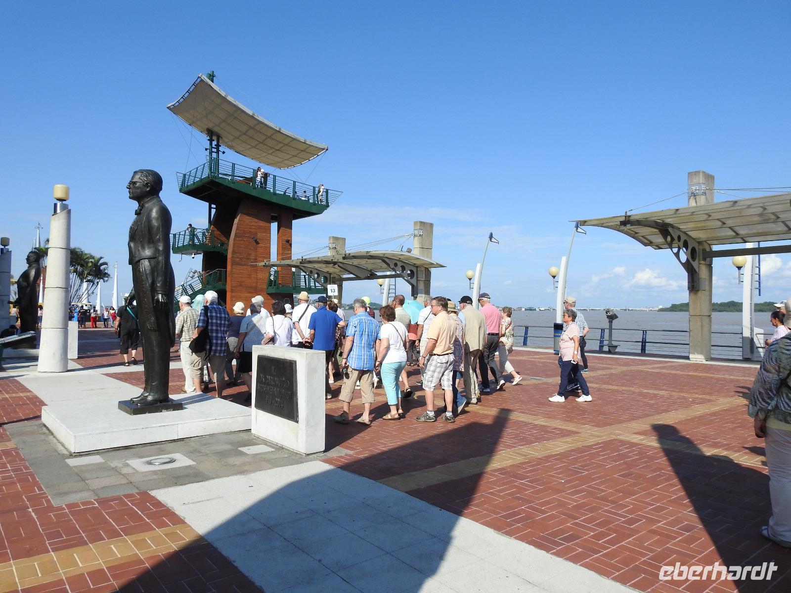 Unser Ausflug führt uns zunächst in einen Stadtpark, in dem sich 350 Leguane tummeln. Sie aalen sich in der Sonne und kümmern sich nicht um die aufgeregten Touristen, von denen jeder versucht, das schönste Foto zu erhaschen. Zum Abkühlen ziehen wir uns in die Kathedrale Metropolitana de Guayaquil zurück, in der heute eine Taufe stattfindet. Viele Kleinkinder sind in weiße Kleidchen gehüllt und ihren Eltern ist der Stolz anzusehen. Wir besuchen das Geschichtsmuseum, in dem das Interessanteste das kostenlose und schnelle W-LAN ist. Anschließend spazieren wir um das Rathaus herum an der Straße Calle 10 de Agosto und kommen zum Uhrenturm Reloj de la Torre Morsica. Die Uferpromenade Malecon 2000 ist modern gestaltet. Mehrere Aussichtstürme können bestiegen werden und von oben hat man einen schönen Blick auf den Fluss. In einer Rotunde steht das Denkmal für Simon Bolivar und Jose de San Martin. Wir fahren ein Stück mit dem Bus bis zum historischen Altstadtviertel Barrio Las Penas. Von hier aus ist die längste Brücke Ecuadors zu sehen, die Brücke der Nationalen Einheit. Zum Ende des Ausflugs fährt unser Guide Jorge mit uns einmal um die ganze Stadt herum. So bekommen wir einen Eindruck von der wirtschaftlichen Teilung Guayaquils. Auf der einen Seite gibt es abgegrenzte Stadtviertel mit noblen Villen, in die man nur mit spezieller Erlaubnis kommt und auf der anderen Seite und viel größer sind die vielen Elendsviertel zu sehen, wobei hier das glücklichere Leben zu sein scheint.