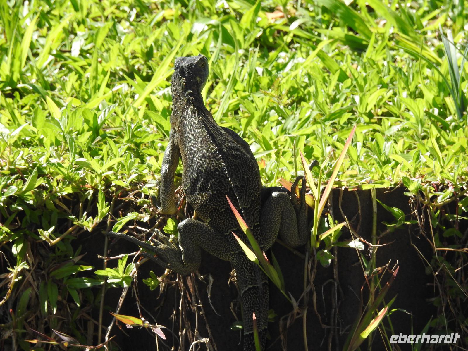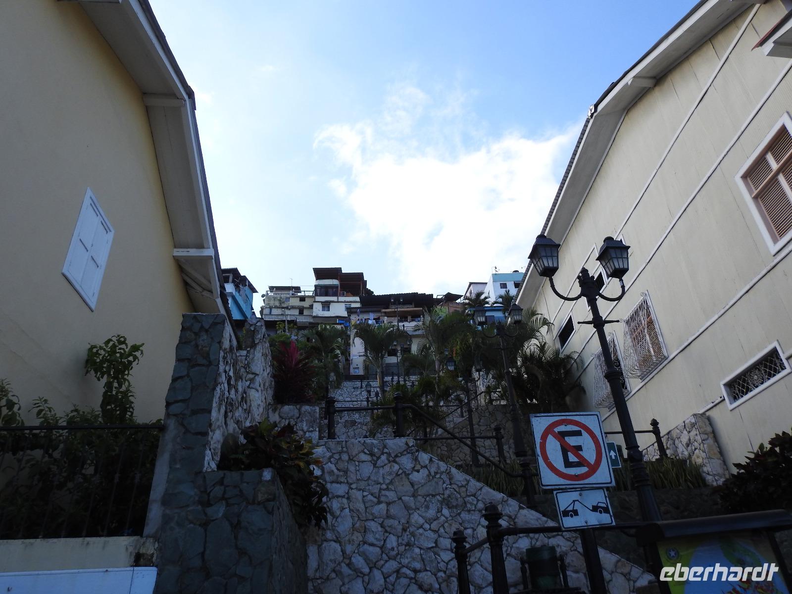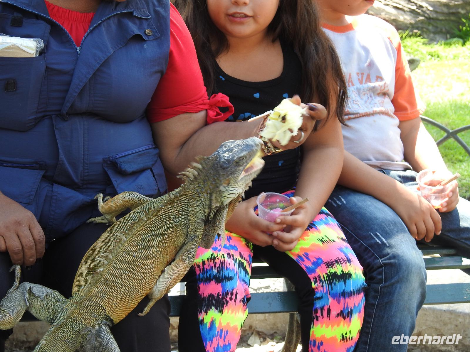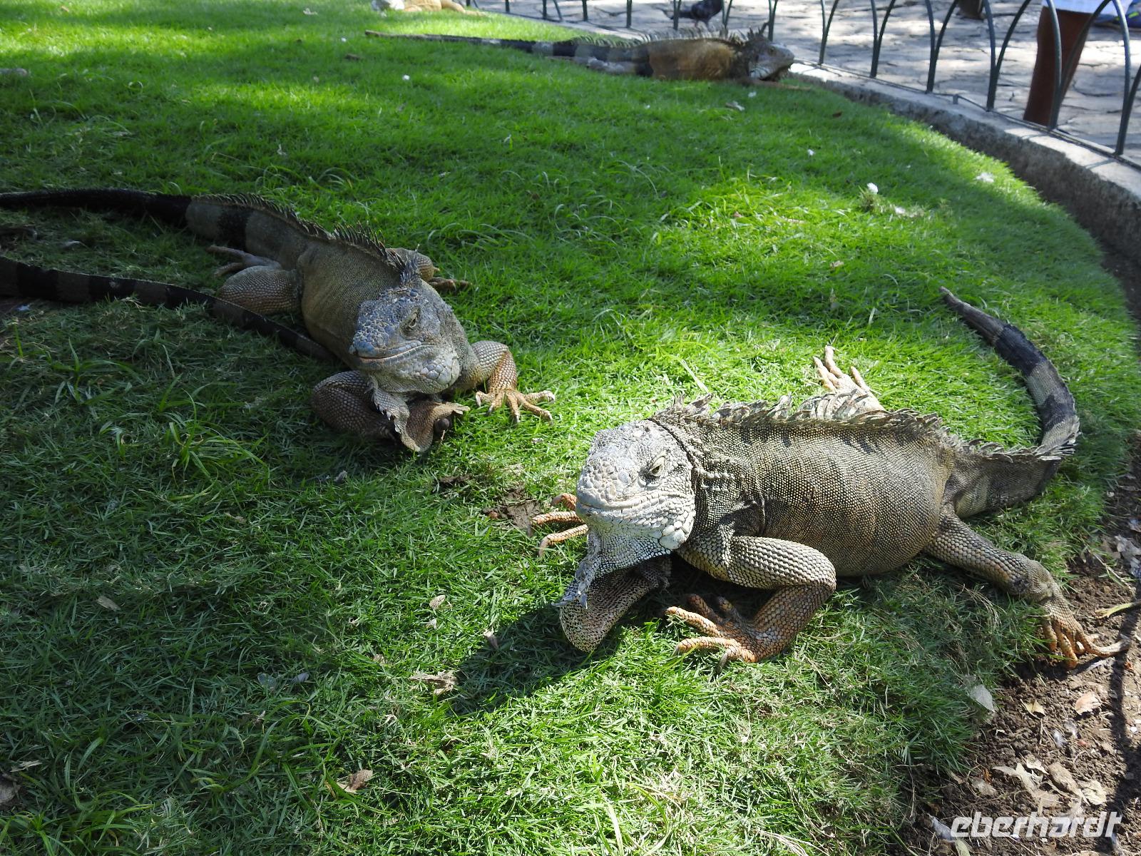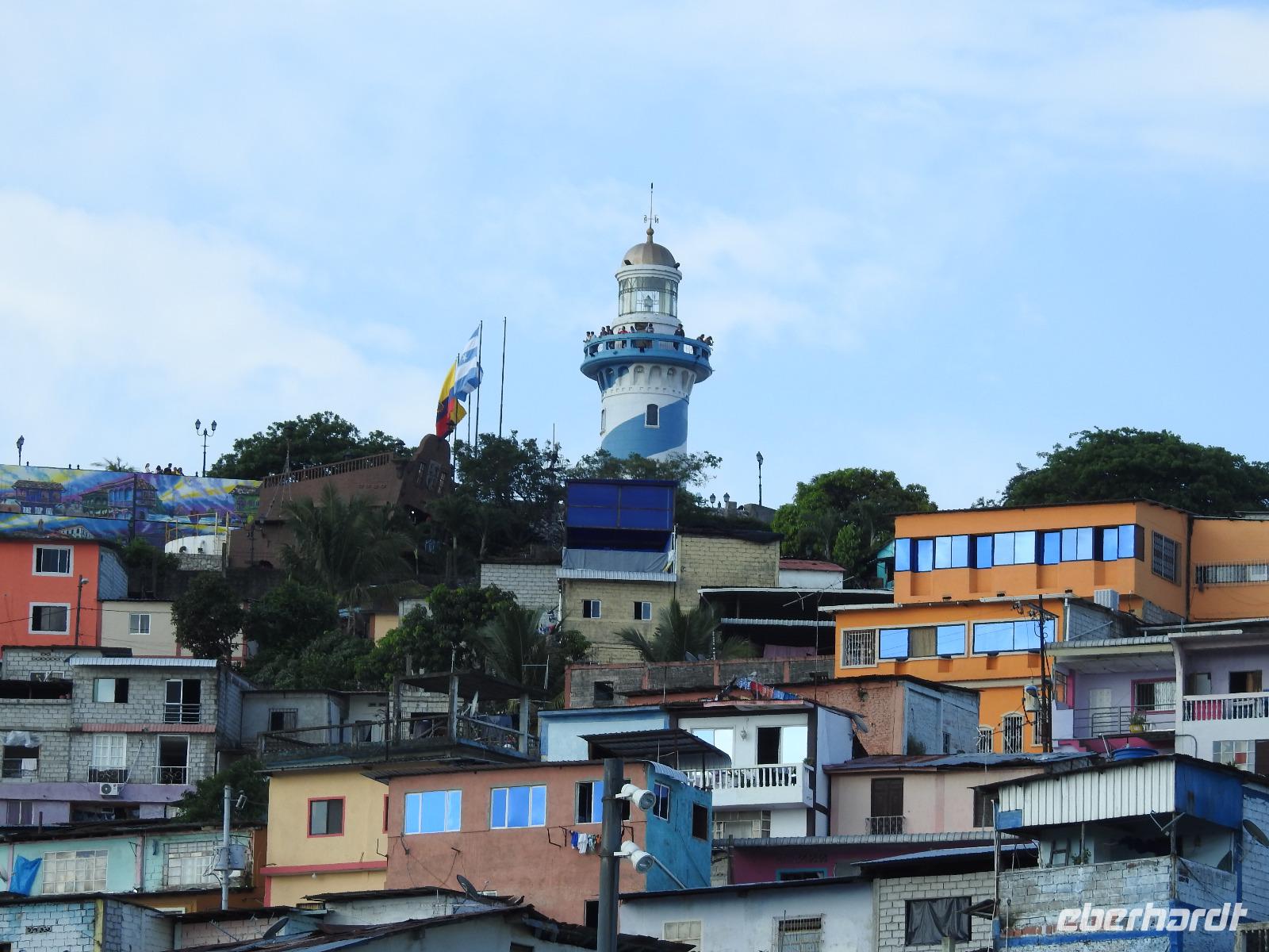 Unser Ausflug führt uns zunächst in einen Stadtpark, in dem sich 350 Leguane tummeln. Sie aalen sich in der Sonne und kümmern sich nicht um die aufgeregten Touristen, von denen jeder versucht, das schönste Foto zu erhaschen. Zum Abkühlen ziehen wir uns in die Kathedrale Metropolitana de Guayaquil zurück, in der heute eine Taufe stattfindet. Viele Kleinkinder sind in weiße Kleidchen gehüllt und ihren Eltern ist der Stolz anzusehen. Wir besuchen das Geschichtsmuseum, in dem das Interessanteste das kostenlose und schnelle W-LAN ist. Anschließend spazieren wir um das Rathaus herum an der Straße Calle 10 de Agosto und kommen zum Uhrenturm Reloj de la Torre Morsica. Die Uferpromenade Malecon 2000 ist modern gestaltet. Mehrere Aussichtstürme können bestiegen werden und von oben hat man einen schönen Blick auf den Fluss. In einer Rotunde steht das Denkmal für Simon Bolivar und Jose de San Martin. Wir fahren ein Stück mit dem Bus bis zum historischen Altstadtviertel Barrio Las Penas. Von hier aus ist die längste Brücke Ecuadors zu sehen, die Brücke der Nationalen Einheit. Zum Ende des Ausflugs fährt unser Guide Jorge mit uns einmal um die ganze Stadt herum. So bekommen wir einen Eindruck von der wirtschaftlichen Teilung Guayaquils. Auf der einen Seite gibt es abgegrenzte Stadtviertel mit noblen Villen, in die man nur mit spezieller Erlaubnis kommt und auf der anderen Seite und viel größer sind die vielen Elendsviertel zu sehen, wobei hier das glücklichere Leben zu sein scheint.