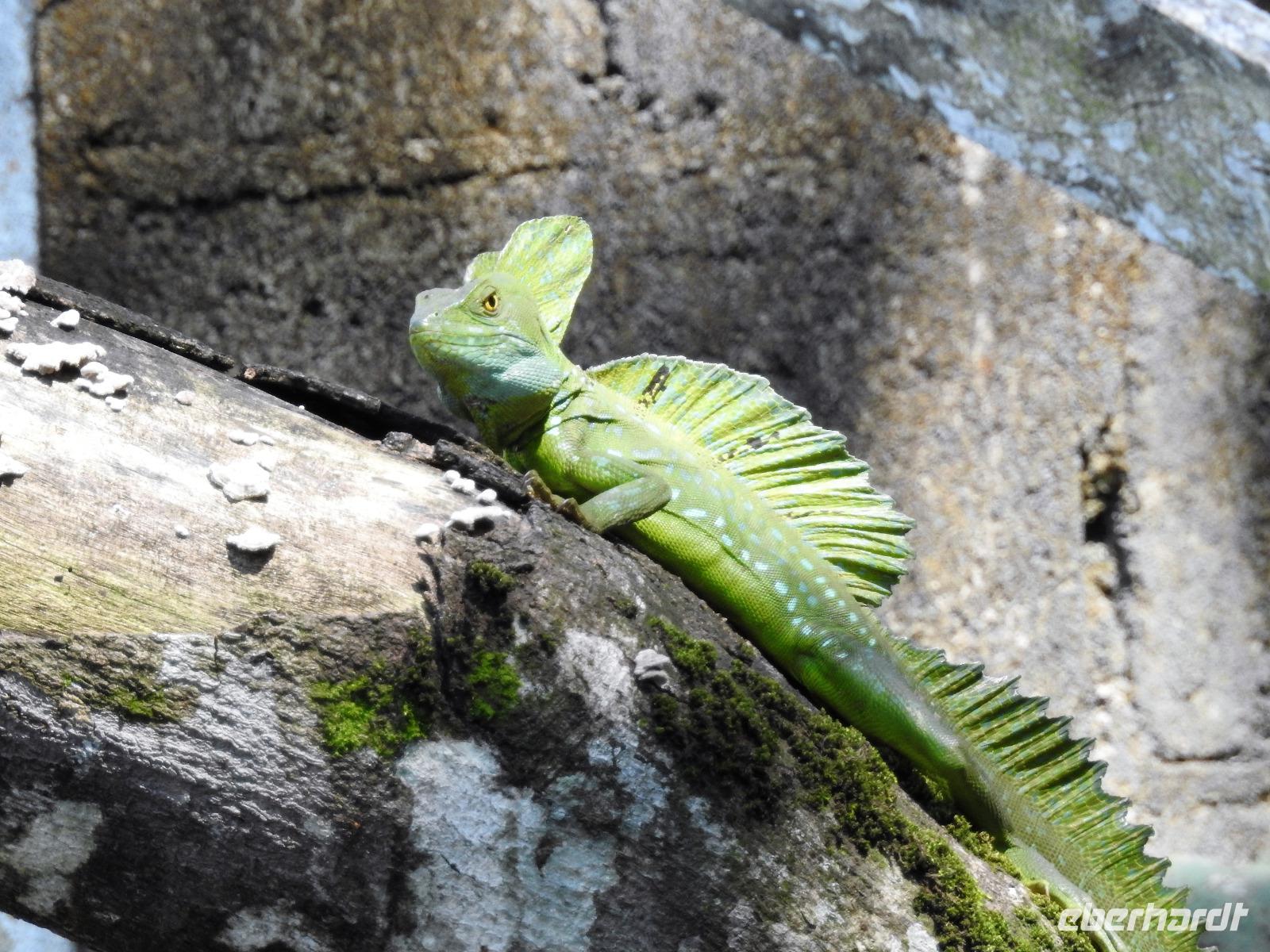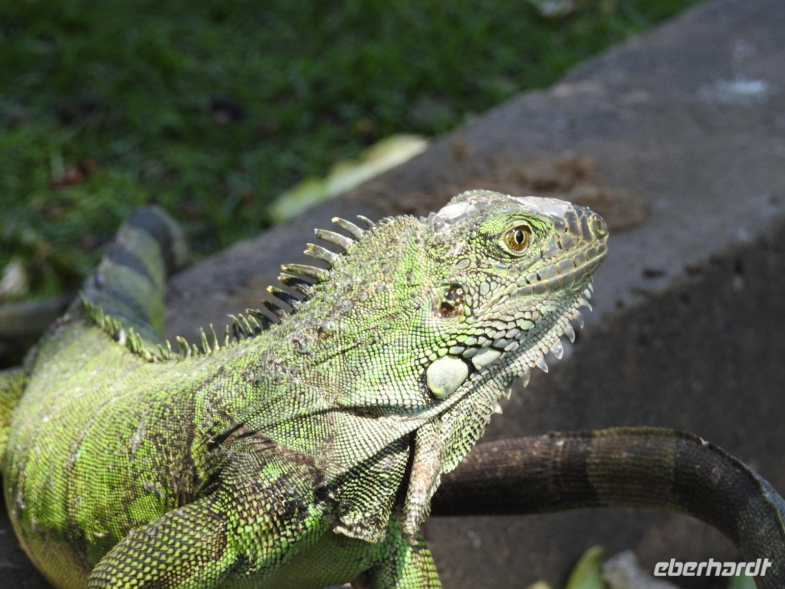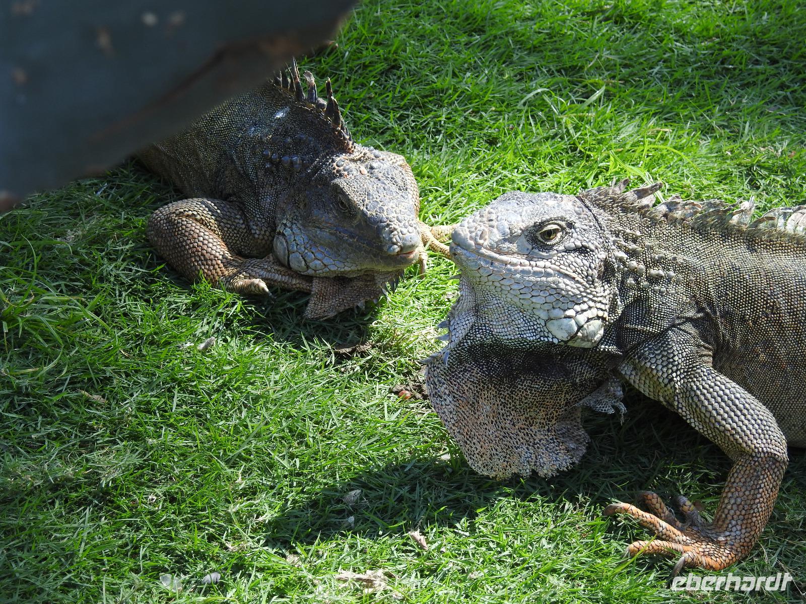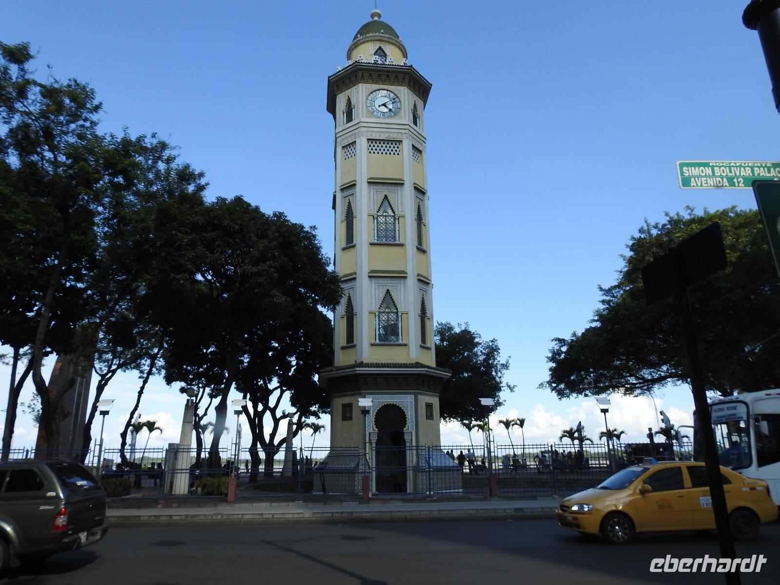 Unser Ausflug führt uns zunächst in einen Stadtpark, in dem sich 350 Leguane tummeln. Sie aalen sich in der Sonne und kümmern sich nicht um die aufgeregten Touristen, von denen jeder versucht, das schönste Foto zu erhaschen. Zum Abkühlen ziehen wir uns in die Kathedrale Metropolitana de Guayaquil zurück, in der heute eine Taufe stattfindet. Viele Kleinkinder sind in weiße Kleidchen gehüllt und ihren Eltern ist der Stolz anzusehen. Wir besuchen das Geschichtsmuseum, in dem das Interessanteste das kostenlose und schnelle W-LAN ist. Anschließend spazieren wir um das Rathaus herum an der Straße Calle 10 de Agosto und kommen zum Uhrenturm Reloj de la Torre Morsica. Die Uferpromenade Malecon 2000 ist modern gestaltet. Mehrere Aussichtstürme können bestiegen werden und von oben hat man einen schönen Blick auf den Fluss. In einer Rotunde steht das Denkmal für Simon Bolivar und Jose de San Martin. Wir fahren ein Stück mit dem Bus bis zum historischen Altstadtviertel Barrio Las Penas. Von hier aus ist die längste Brücke Ecuadors zu sehen, die Brücke der Nationalen Einheit. Zum Ende des Ausflugs fährt unser Guide Jorge mit uns einmal um die ganze Stadt herum. So bekommen wir einen Eindruck von der wirtschaftlichen Teilung Guayaquils. Auf der einen Seite gibt es abgegrenzte Stadtviertel mit noblen Villen, in die man nur mit spezieller Erlaubnis kommt und auf der anderen Seite und viel größer sind die vielen Elendsviertel zu sehen, wobei hier das glücklichere Leben zu sein scheint.