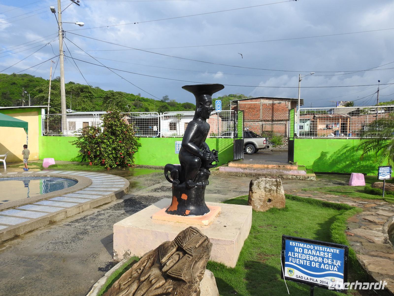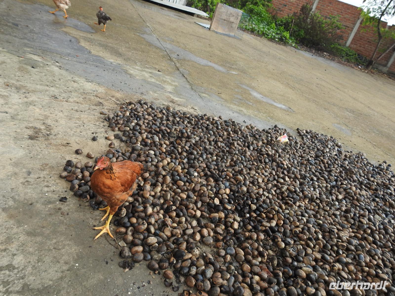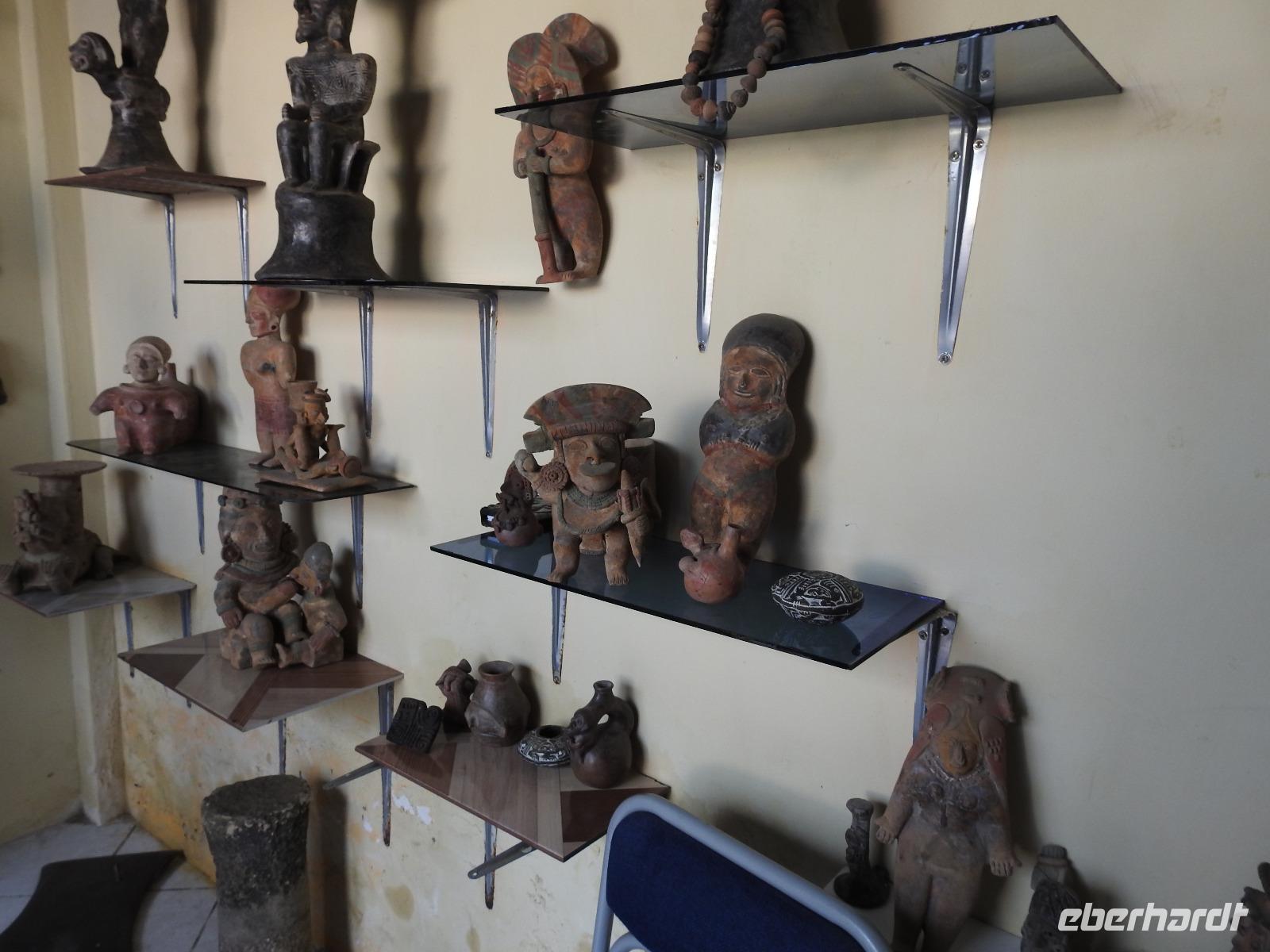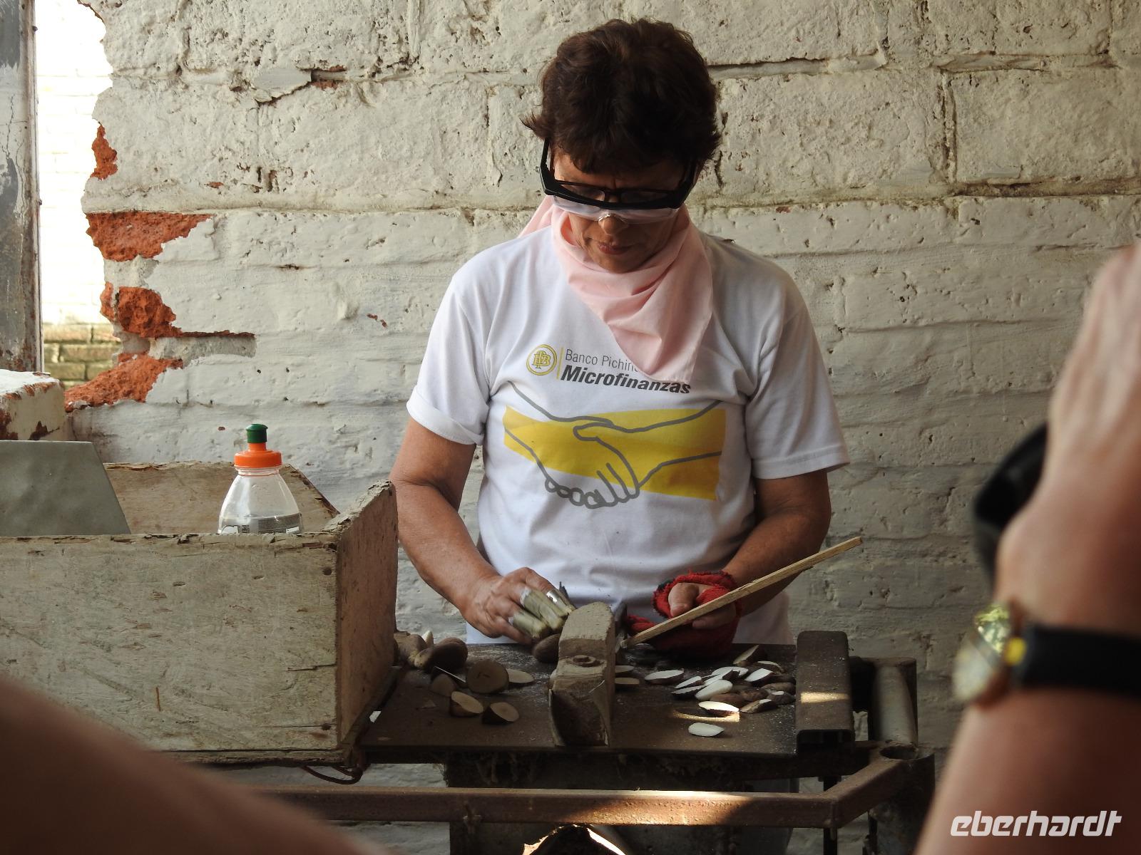 Unseren nächsten Stopp legen wir in La Pila ein. Scheinbar ist das hier ein Zentrum der Tonverarbeitung. So richtig klar wird es eigentlich nicht, warum wir hier halten. Es gibt ein kleines, ganz ganz kleines Museum, eher eine Minigarage, in der Tonfiguren ausgestellt sind. Diese kann man auch käuflich erwerben, aber es sind alles Nachbildungen, auch die im Museum ausgestellten Teile. Seltsam. Ich kaufe zwei Stoffpüppchen im regionalen Kostümchen für meine Enkeltöchter und erfreue damit einen der Händler. Nun besuchen wir eine Elfenbein-Nuss-Fabrik. Die Elfenbein-Nuss ist der Samen einer Palmenart, der so hart wie Stein wird und die Farbe von Elfenbein hat. Früher wurden daraus Knöpfe hergestellt und in alle Welt exportiert. Heute werden Souvenirs für Touristen daraus gemacht.