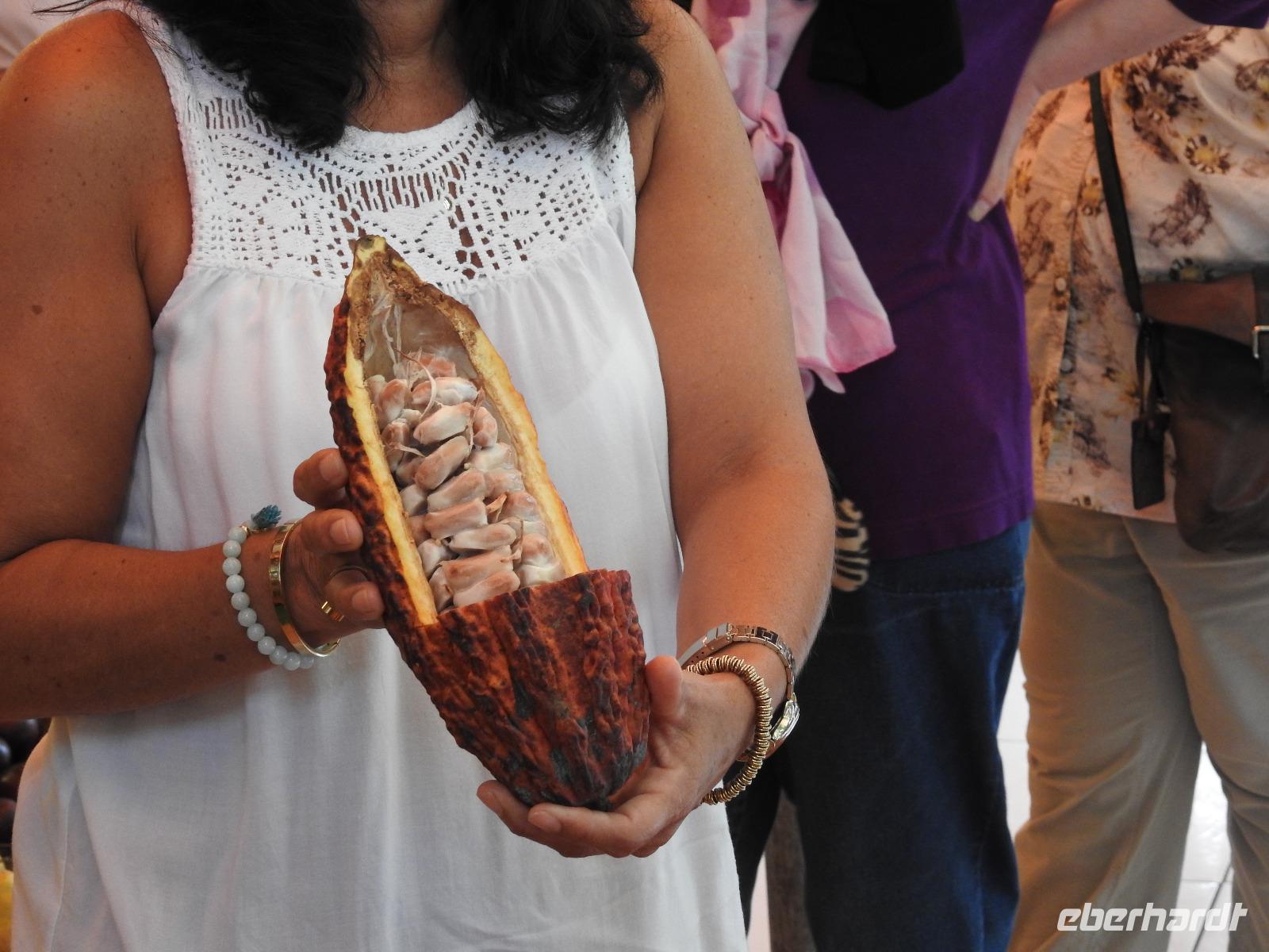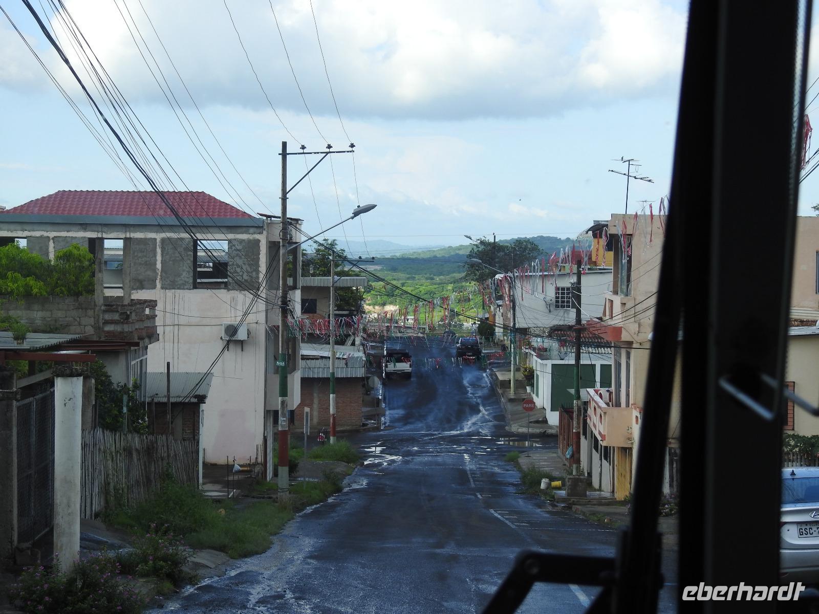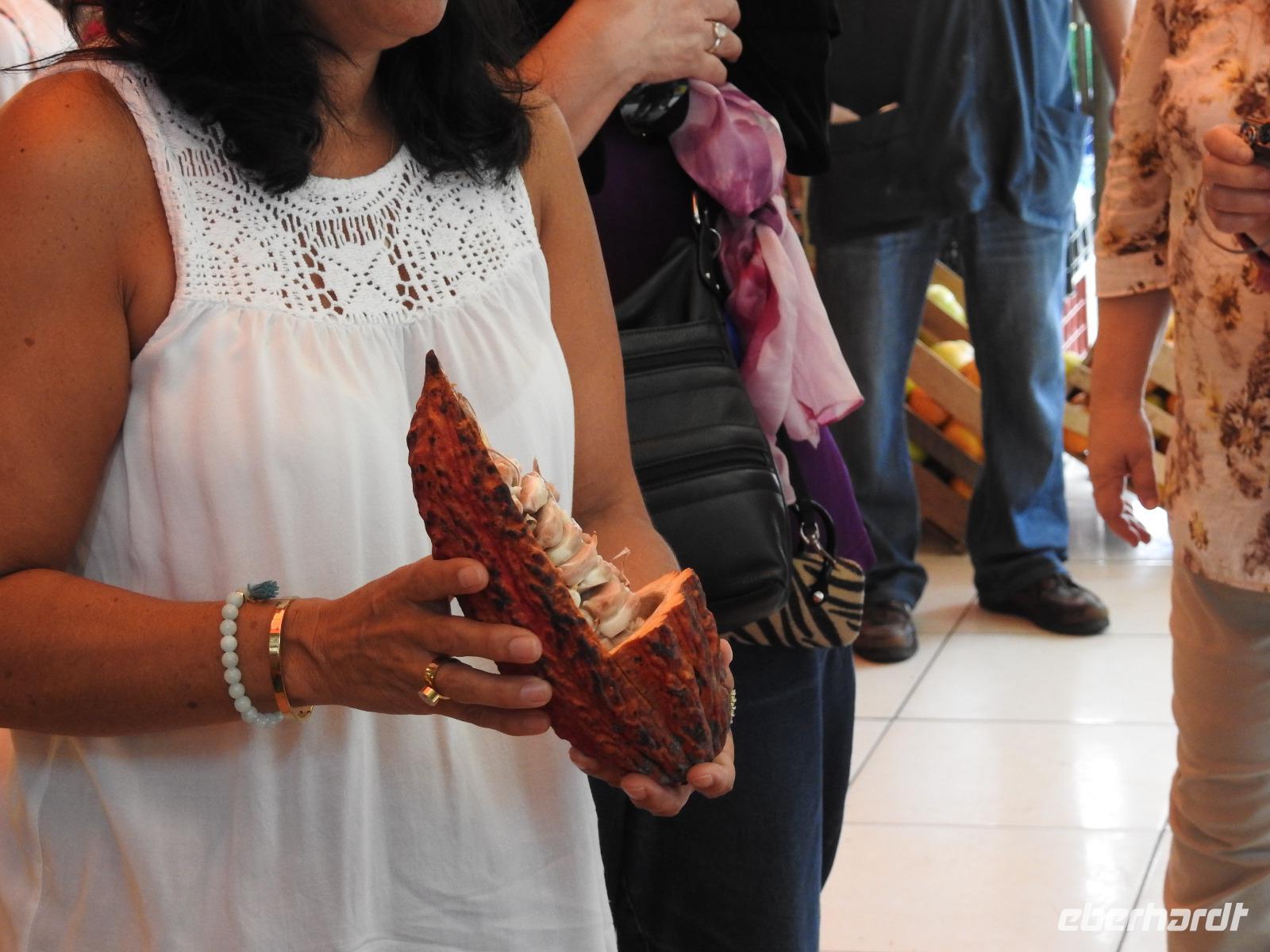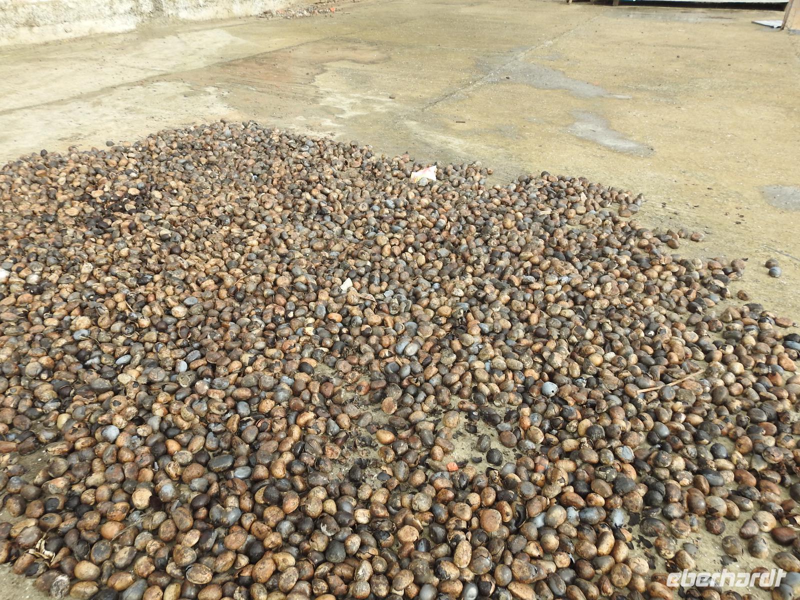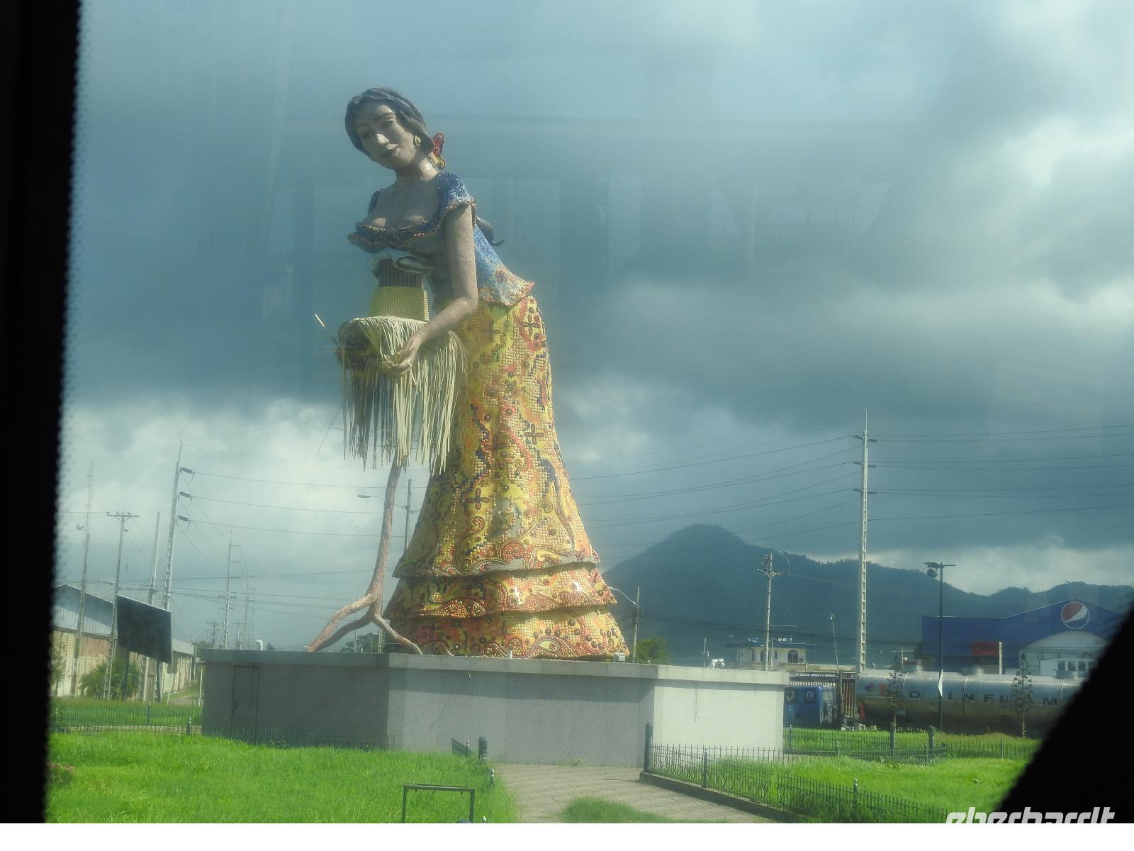 Unseren nächsten Stopp legen wir in La Pila ein. Scheinbar ist das hier ein Zentrum der Tonverarbeitung. So richtig klar wird es eigentlich nicht, warum wir hier halten. Es gibt ein kleines, ganz ganz kleines Museum, eher eine Minigarage, in der Tonfiguren ausgestellt sind. Diese kann man auch käuflich erwerben, aber es sind alles Nachbildungen, auch die im Museum ausgestellten Teile. Seltsam. Ich kaufe zwei Stoffpüppchen im regionalen Kostümchen für meine Enkeltöchter und erfreue damit einen der Händler. Nun besuchen wir eine Elfenbein-Nuss-Fabrik. Die Elfenbein-Nuss ist der Samen einer Palmenart, der so hart wie Stein wird und die Farbe von Elfenbein hat. Früher wurden daraus Knöpfe hergestellt und in alle Welt exportiert. Heute werden Souvenirs für Touristen daraus gemacht.