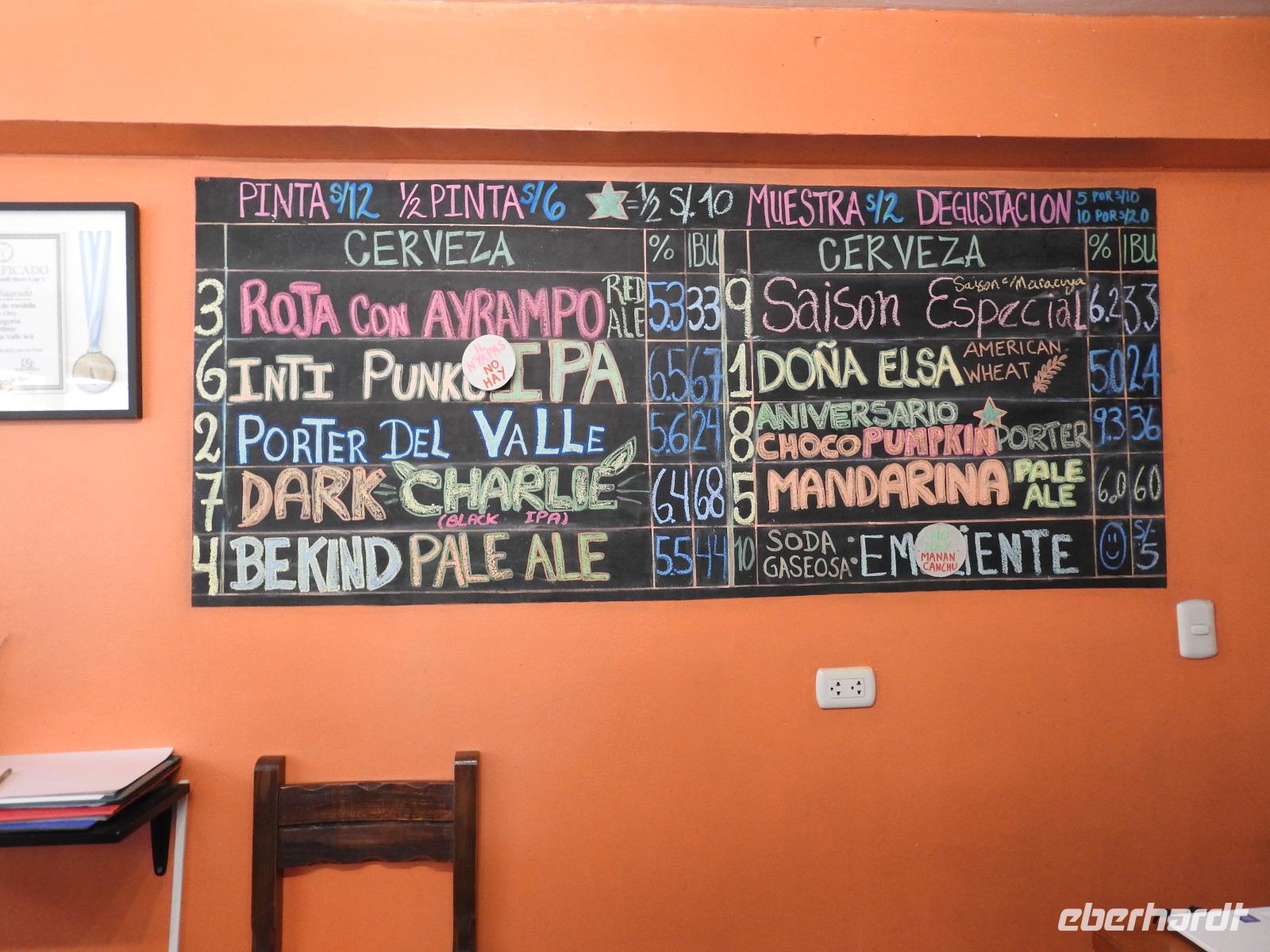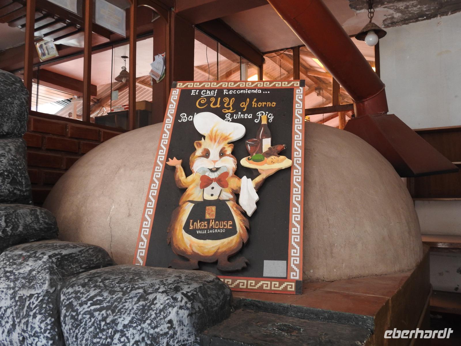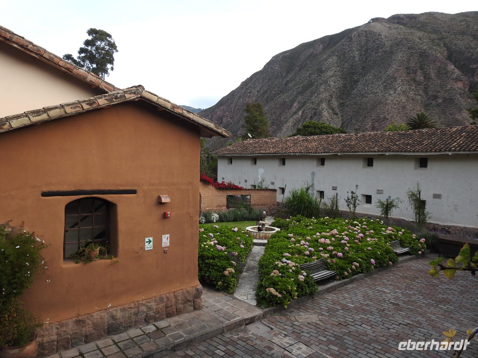 Bereits um 4.15 Uhr meldet sich der Weckdienst, ab Fünf Uhr gibt es Frühstück und 5.40 Uhr geht es los. Wir fahren zum Flughafen in Lima, verabschieden uns vorübergehend von Ursula und fliegen nach Cusco. Der Flug ist kürzer als die Wartezeit, wir sind nur eine Stunde unterwegs, allerdings rutscht mir kurzzeitig das Herz in die Hosen, als wir eigentlich schon landen und der Kapitän nochmal durchstartet. Die Stewardess sagt zwar, es war aus Sicherheitsgründen und alles normal, aber das würden die wohl immer sagen. Nun ja, nichts ist passiert, wir sind glücklich gelandet, Koffer sind alle angekommen und unsere neue Reiseleiterin Yovanna ist auch da. Ein bisschen blümerant ist mir wohl und ich höre, Euch geht es nicht besser. Das ist die Höhe, schließlich sind wir plötzlich 3400 Meter hoch. Die Hände zittern, das Herz flattert und mancher fühlt sich etwas benommen. Das legt sich ja wohl hoffentlich noch. Wir fahren jetzt ins Heilige Tal und Yovanna berichtet uns von dem Leben hier. In Pisaq besuchen wir einen Bäcker und versorgen uns mit leckeren Empanadas (4 SOL das Stück), kleine mit Käse oder Fleisch gefüllte Teigtaschen. Anschließend erklärt uns Yovanna den Unterschied zwischen Baby-Alpaca- und Royal-Alpaca-Wolle. Wir spazieren über den Markt, den wir fast für uns allein haben und erstehen bereits das eine oder andere Souvenir. Weiter geht es durch das Heilige Tal bis zur Brauerei Cerveceria del Valle Sagrado, eine kleine regionale Brauerei, die von jungen Männern mit viel Enthusiasmus und großem ökologischem Ansatz geführt wird. Wir erhalten einen Überblick, wie hier das Bier gebraut wird und können dann mehrere Sorten kosten. Was schmeckt wohl besser: Bier mit exotischen Früchten oder mit Zartbitter-Schokolade-Kaffee-Geschmack? Zum Schluss darf sich jeder noch ein Glas Bier mit der Sorte bestellen, die ihm am besten geschmeckt hat und wir sitzen gemütlich beisammen. Aus irgendeinem Grund ist die Bestellung unseres Imbisses nicht bis zur Brauerei durchgedrungen und so kehren wir anschließend noch in einem Restaurant ein und bekommen die Möglichkeit, die peruanische Spezialität MEERSCHWEINCHEN und Alpaca am Spieß zu kosten. Jetzt ist es Zeit, ins Hotel zu fahren. Wir schlafen heute in einem ehemaligen Kloster, einer wunderschönen Anlage, die wir aber morgen früh beizeiten wieder verlassen werden.