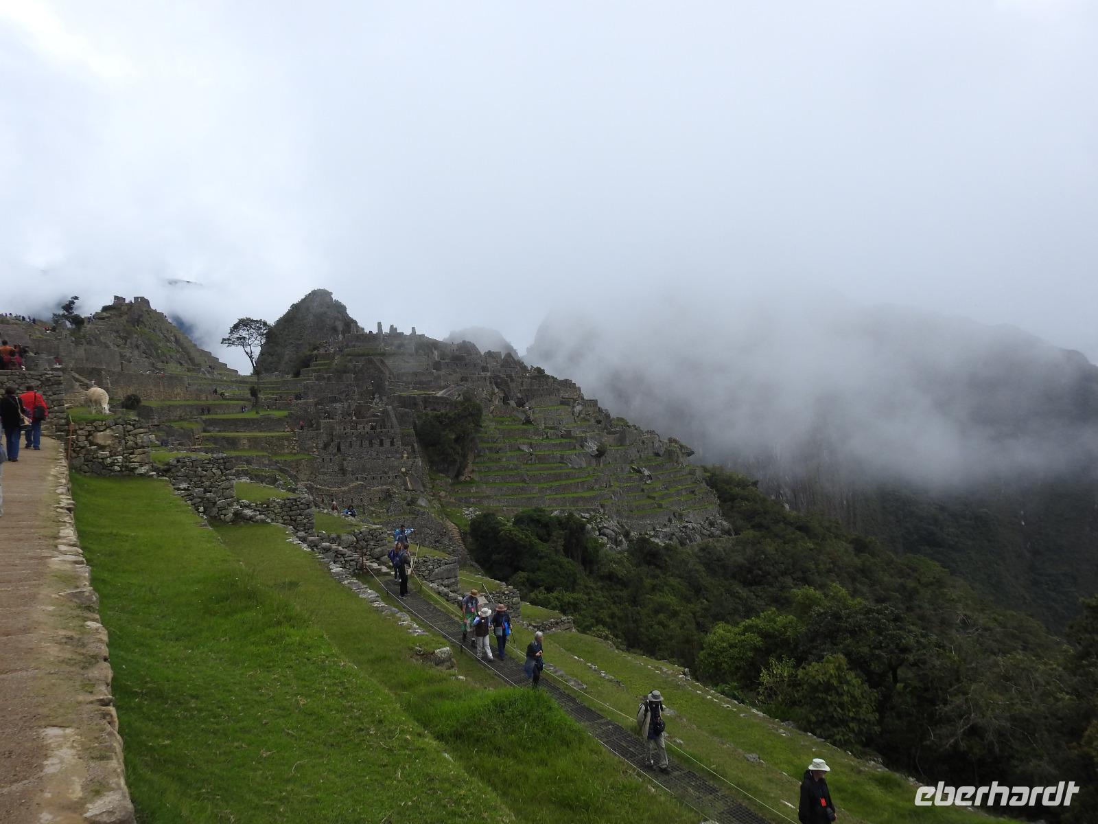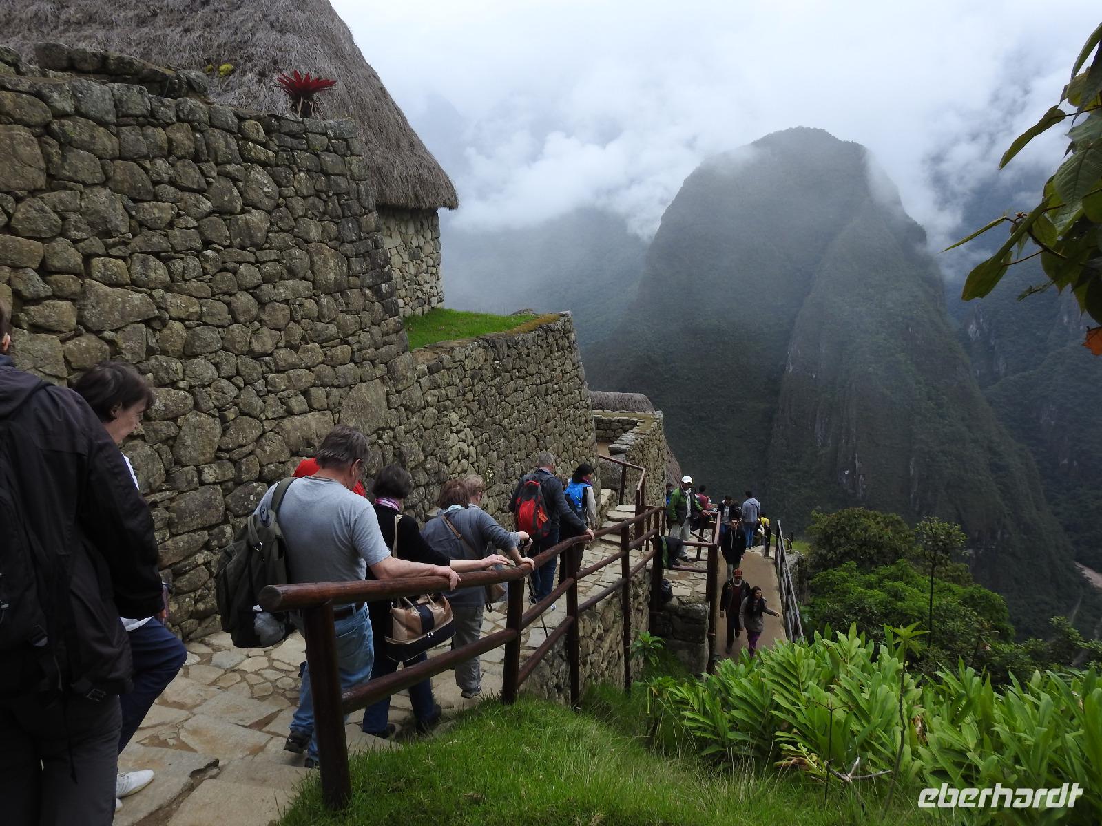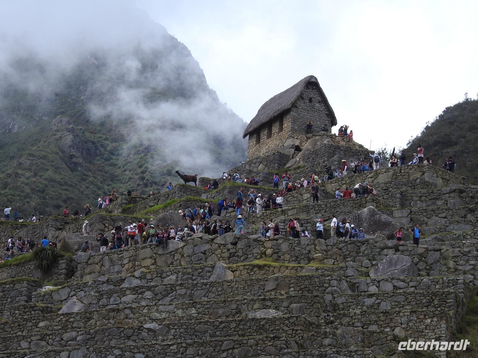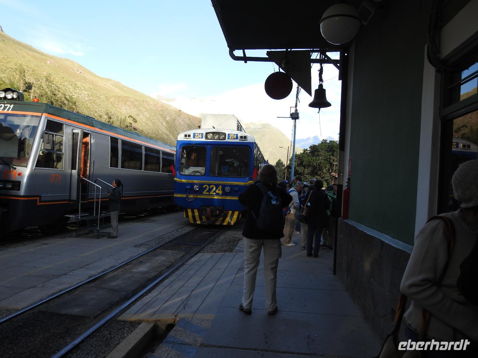 Wieder geht es zeitig los. Bereits ab 4.30 Uhr heißt es - frühstücken. Unser Gepäck wird von fleißigen Helfern des Hotels von den Zimmern abgeholt und in die Lobby gebracht. Anschließend wird es in einem Gepäckraum des Hotels verstaut. Wir fahren mit mehr oder weniger leichtem Gepäck zum Bahnhof. Immerhin müssen Sonnencreme, Insektenschutz, Regenschutz, Wasser und Fotoausrüstung mindestens dabei sein. Und den Pass dürfen wir heute nicht vergessen, egal, was wir tun, es wird immer der Pass kontrolliert. Mit dem Bus fahren wir nach Ollantaytambo, wo wir in den Zug der Peru Rail umsteigen. Der Weg zum Bahnhof führt an bunten Marktständen vorbei, aber uns bleibt keine Zeit zum Schlendern. Allein der Händler mit den Wanderstöcken kommt mit uns ins Geschäft. Im Zug beziehen wir unser Abteil 1. Klasse, das mit großen Fenstern und mit Panoramafenstern ausgestattet ist. Unterwegs gibt es einen Imbiss, bestehend aus Kaffee oder Mangosaft und einem Stück Kuchen. Der Zug fährt durch das heilige Urubamba Tal mit seiner spektakulären Landschaft. Gegen halb neun kommen wir in Aguas Calientes (Dorf Machu Picchu) an. Wieder müssen wir uns durch endlos erscheinende Markstände schlängeln, bis wir zum Busbahnhof kommen. Von hier aus geht es vierhundert Meter weiter in die Höhe auf einer Serpentinenstraße entlang. Wir sind nicht allein. Außer uns wollen noch weitere gefühlte tausend Touristen nach Machu Pichu. Yovanna berichtet uns, dass täglich nur 4000 Besucher zugelassen werden. 2000 morgens und 2000 nachmittags. Trotzdem entspannt sich die Lage in Machu Picchu deutlich. Die Anlage ist so groß, dass genug Platz für alle ist.