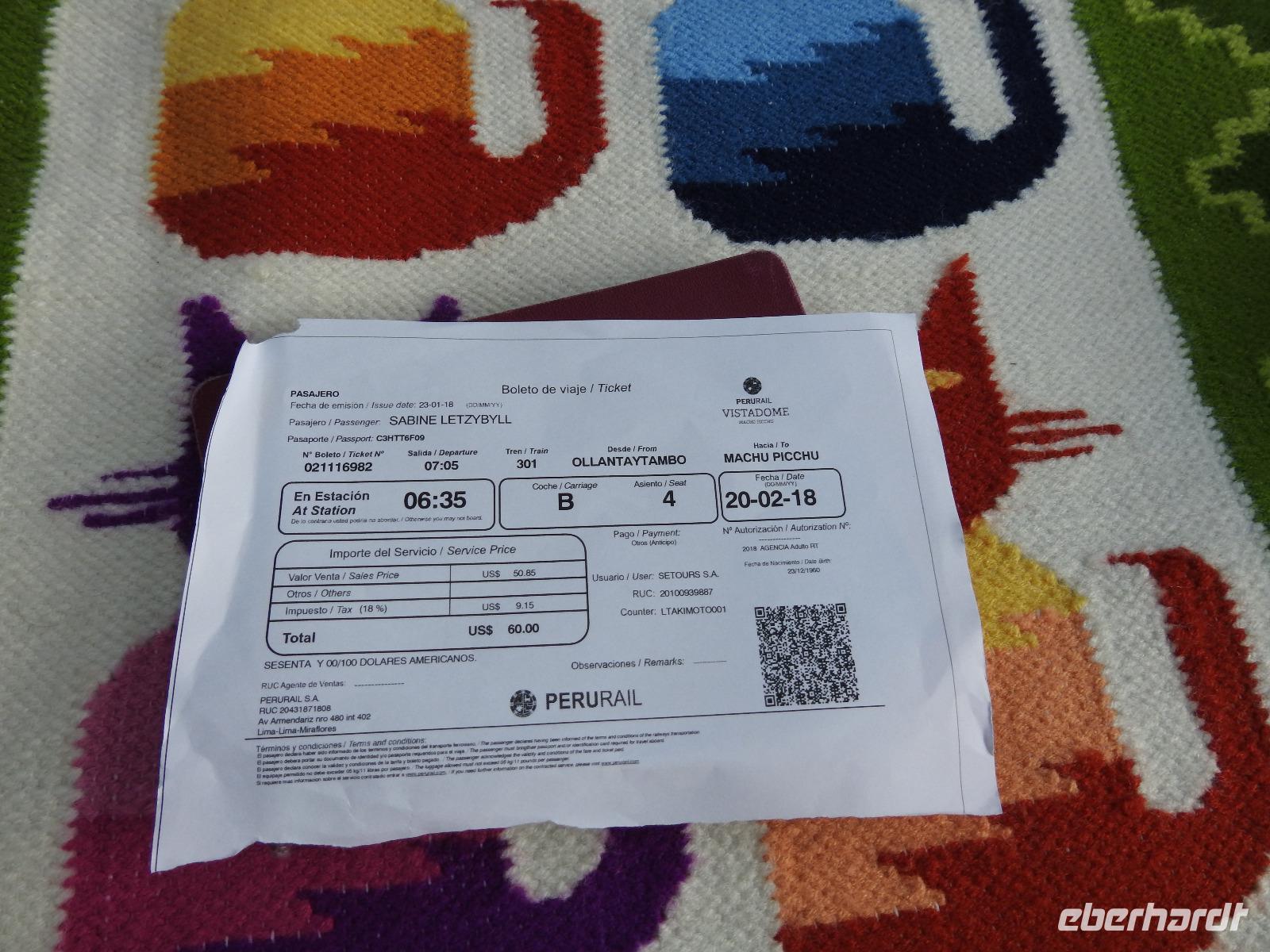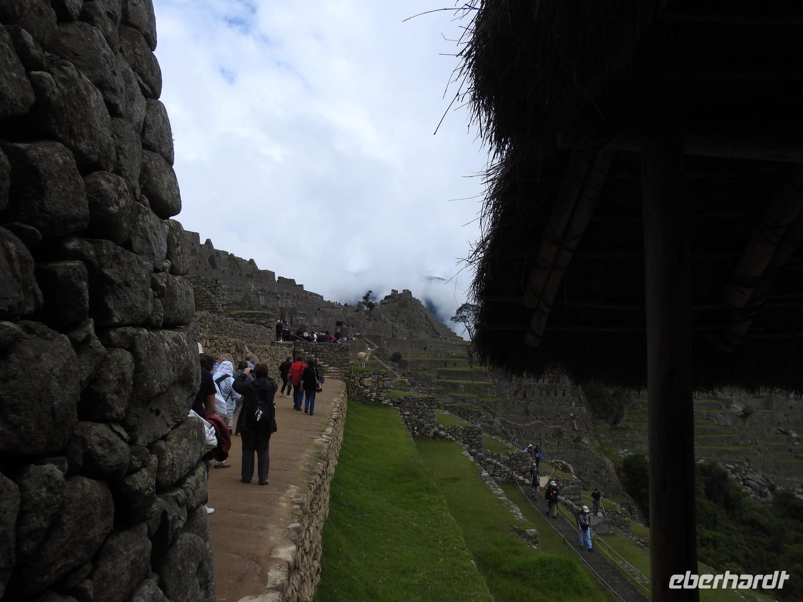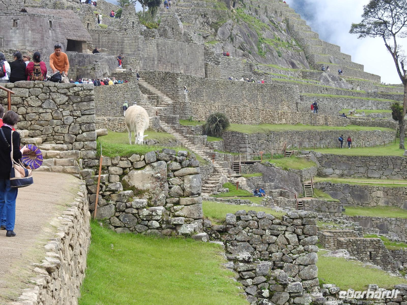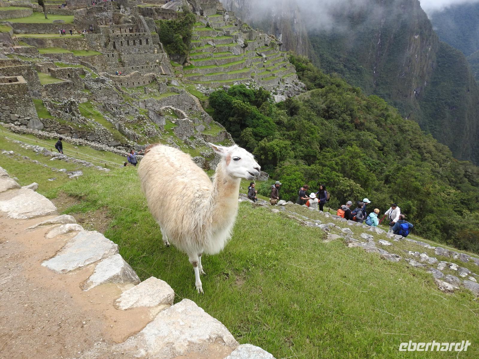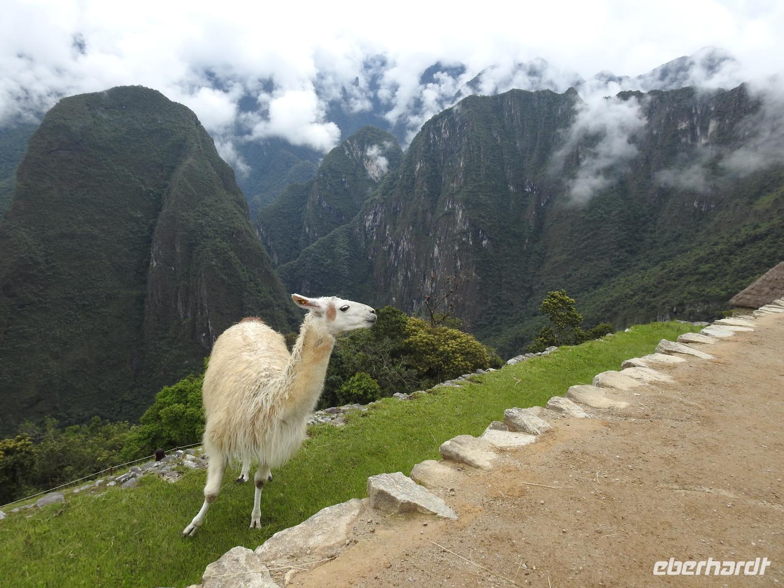 Wieder geht es zeitig los. Bereits ab 4.30 Uhr heißt es - frühstücken. Unser Gepäck wird von fleißigen Helfern des Hotels von den Zimmern abgeholt und in die Lobby gebracht. Anschließend wird es in einem Gepäckraum des Hotels verstaut. Wir fahren mit mehr oder weniger leichtem Gepäck zum Bahnhof. Immerhin müssen Sonnencreme, Insektenschutz, Regenschutz, Wasser und Fotoausrüstung mindestens dabei sein. Und den Pass dürfen wir heute nicht vergessen, egal, was wir tun, es wird immer der Pass kontrolliert. Mit dem Bus fahren wir nach Ollantaytambo, wo wir in den Zug der Peru Rail umsteigen. Der Weg zum Bahnhof führt an bunten Marktständen vorbei, aber uns bleibt keine Zeit zum Schlendern. Allein der Händler mit den Wanderstöcken kommt mit uns ins Geschäft. Im Zug beziehen wir unser Abteil 1. Klasse, das mit großen Fenstern und mit Panoramafenstern ausgestattet ist. Unterwegs gibt es einen Imbiss, bestehend aus Kaffee oder Mangosaft und einem Stück Kuchen. Der Zug fährt durch das heilige Urubamba Tal mit seiner spektakulären Landschaft. Gegen halb neun kommen wir in Aguas Calientes (Dorf Machu Picchu) an. Wieder müssen wir uns durch endlos erscheinende Markstände schlängeln, bis wir zum Busbahnhof kommen. Von hier aus geht es vierhundert Meter weiter in die Höhe auf einer Serpentinenstraße entlang. Wir sind nicht allein. Außer uns wollen noch weitere gefühlte tausend Touristen nach Machu Pichu. Yovanna berichtet uns, dass täglich nur 4000 Besucher zugelassen werden. 2000 morgens und 2000 nachmittags. Trotzdem entspannt sich die Lage in Machu Picchu deutlich. Die Anlage ist so groß, dass genug Platz für alle ist.
