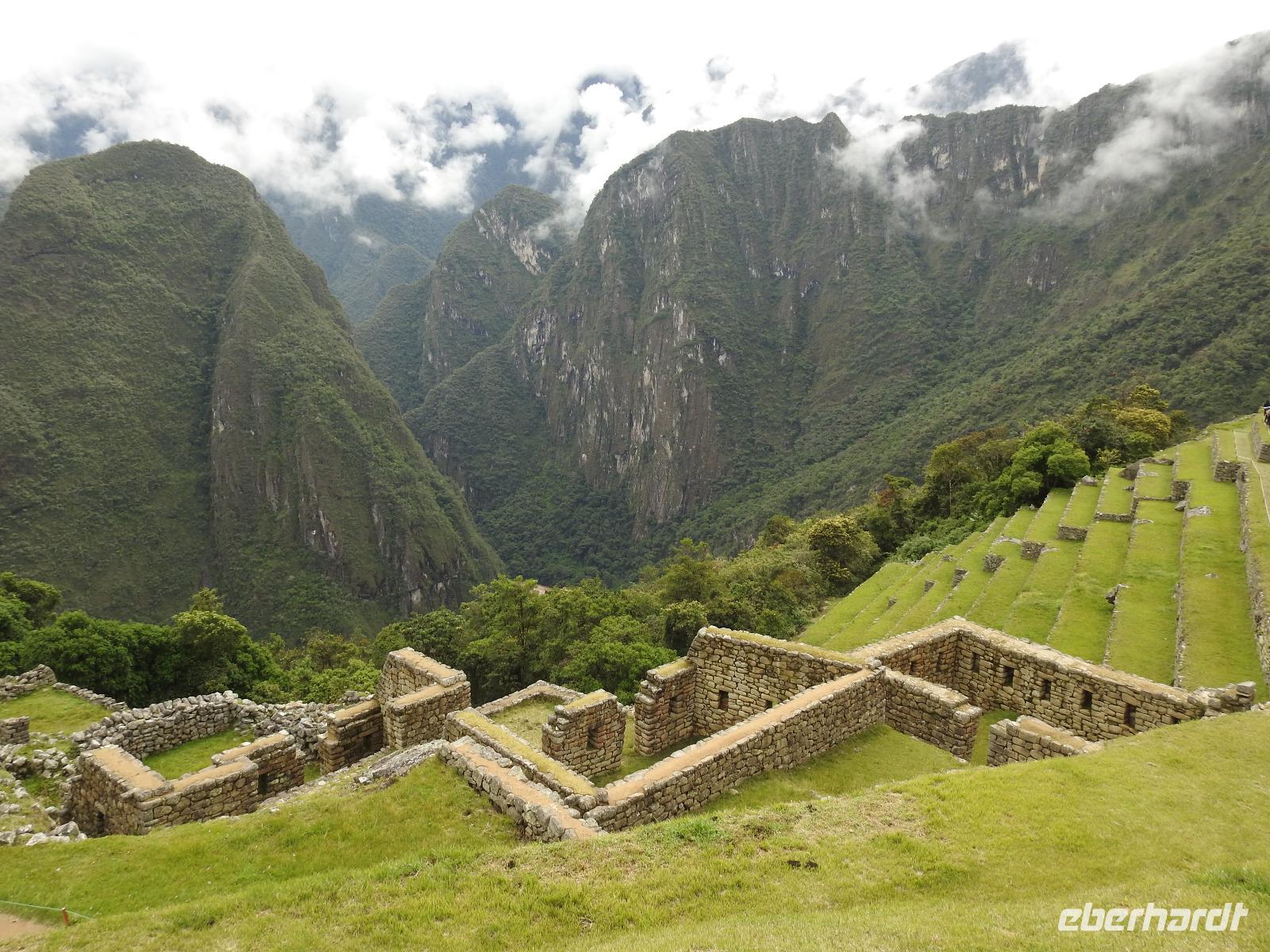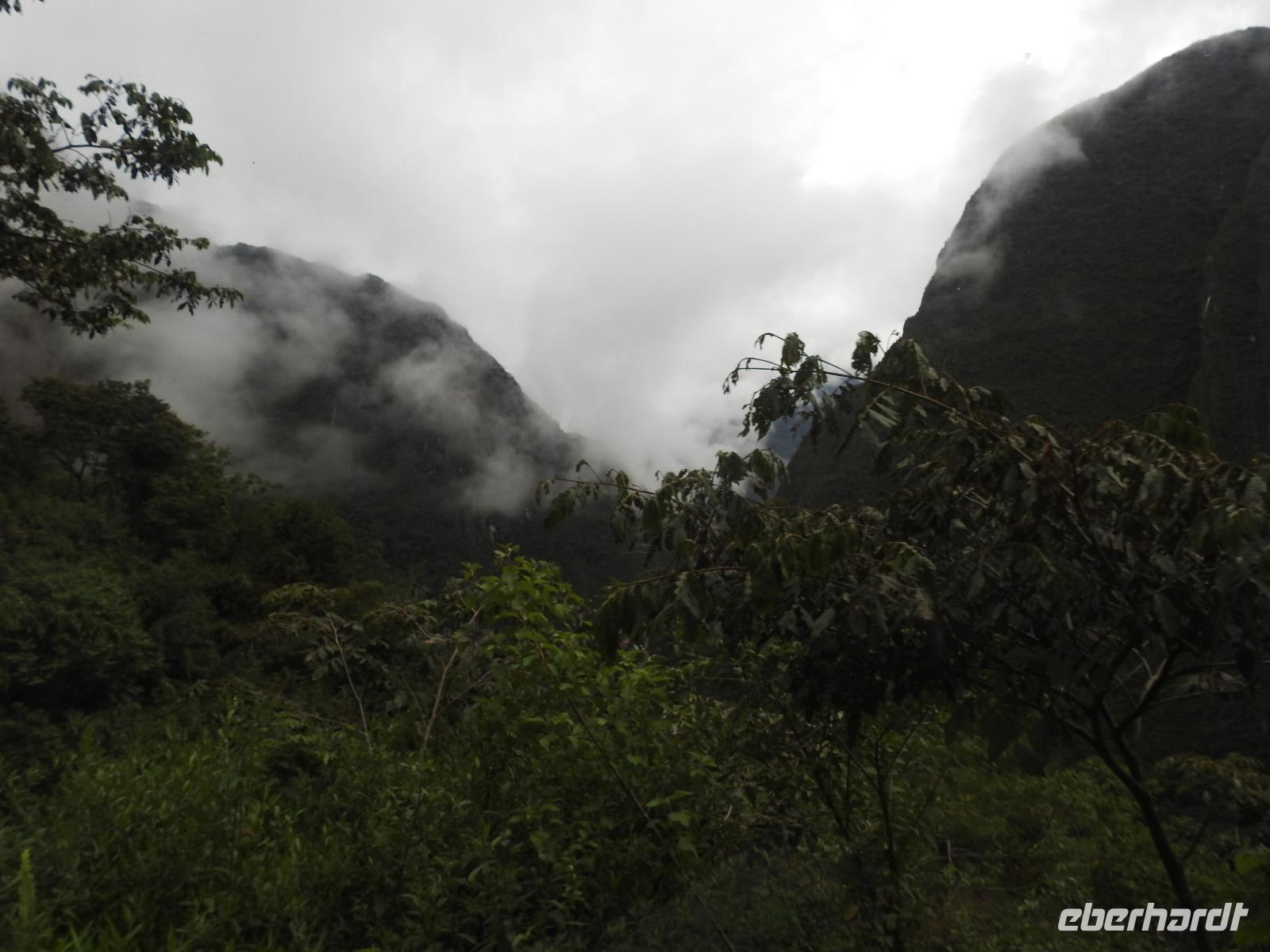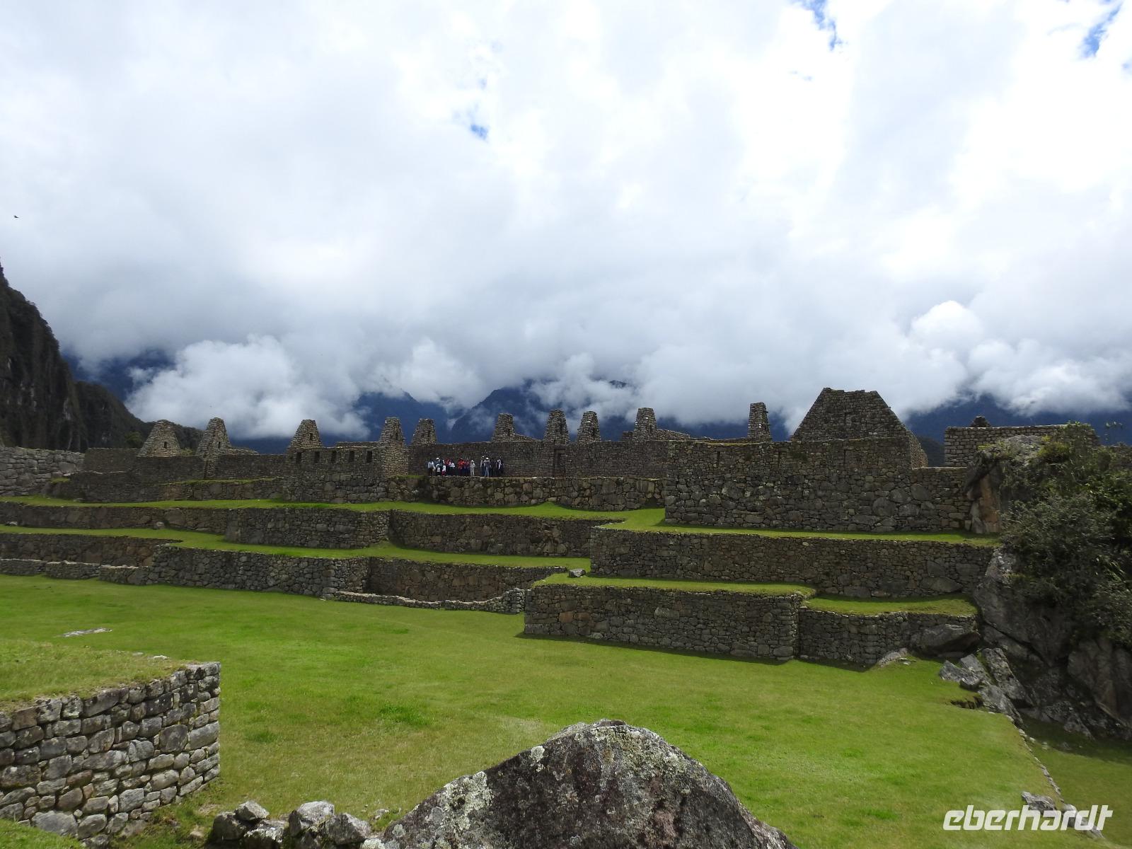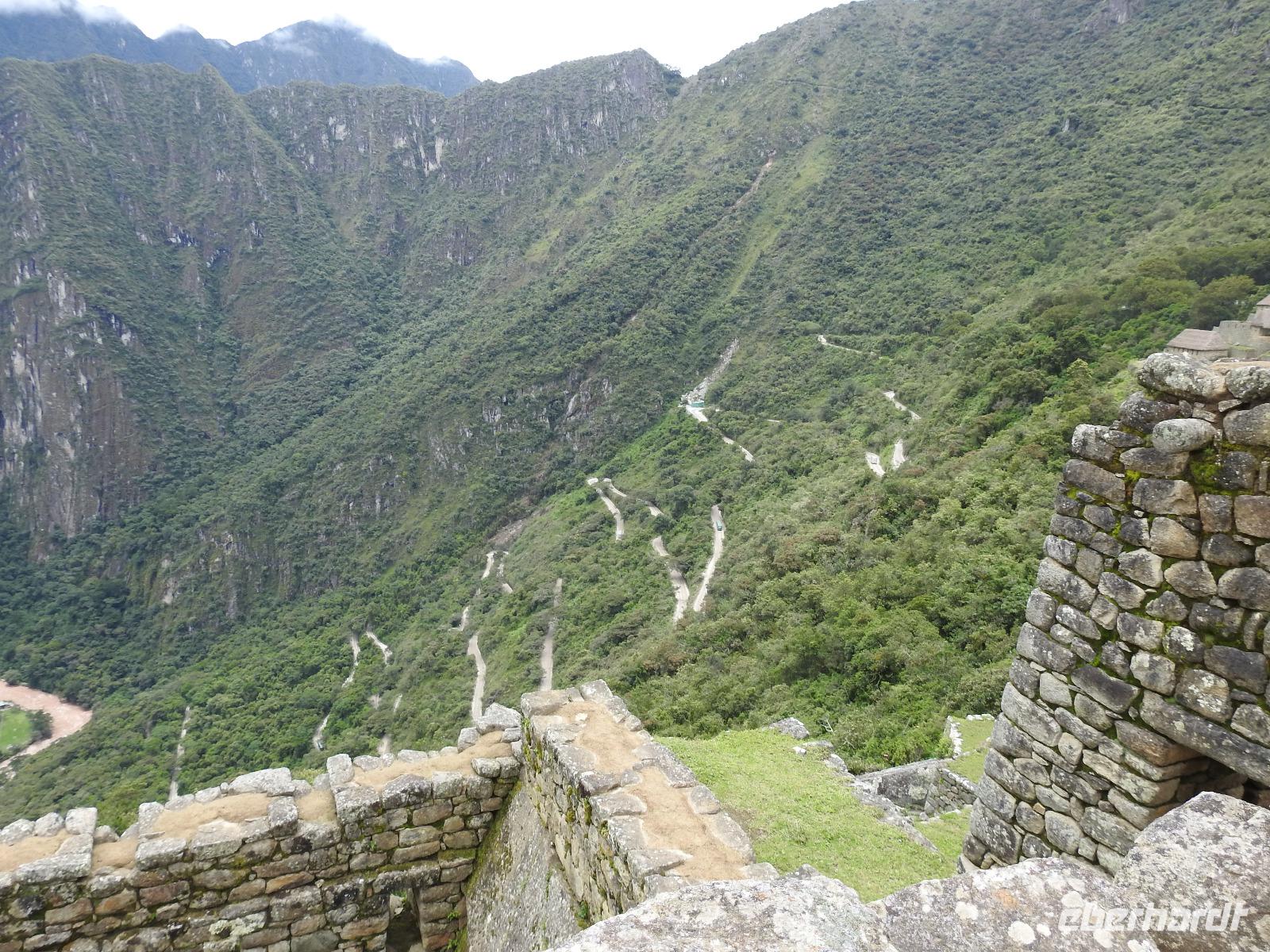 Wieder geht es zeitig los. Bereits ab 4.30 Uhr heißt es - frühstücken. Unser Gepäck wird von fleißigen Helfern des Hotels von den Zimmern abgeholt und in die Lobby gebracht. Anschließend wird es in einem Gepäckraum des Hotels verstaut. Wir fahren mit mehr oder weniger leichtem Gepäck zum Bahnhof. Immerhin müssen Sonnencreme, Insektenschutz, Regenschutz, Wasser und Fotoausrüstung mindestens dabei sein. Und den Pass dürfen wir heute nicht vergessen, egal, was wir tun, es wird immer der Pass kontrolliert. Mit dem Bus fahren wir nach Ollantaytambo, wo wir in den Zug der Peru Rail umsteigen. Der Weg zum Bahnhof führt an bunten Marktständen vorbei, aber uns bleibt keine Zeit zum Schlendern. Allein der Händler mit den Wanderstöcken kommt mit uns ins Geschäft. Im Zug beziehen wir unser Abteil 1. Klasse, das mit großen Fenstern und mit Panoramafenstern ausgestattet ist. Unterwegs gibt es einen Imbiss, bestehend aus Kaffee oder Mangosaft und einem Stück Kuchen. Der Zug fährt durch das heilige Urubamba Tal mit seiner spektakulären Landschaft. Gegen halb neun kommen wir in Aguas Calientes (Dorf Machu Picchu) an. Wieder müssen wir uns durch endlos erscheinende Markstände schlängeln, bis wir zum Busbahnhof kommen. Von hier aus geht es vierhundert Meter weiter in die Höhe auf einer Serpentinenstraße entlang. Wir sind nicht allein. Außer uns wollen noch weitere gefühlte tausend Touristen nach Machu Pichu. Yovanna berichtet uns, dass täglich nur 4000 Besucher zugelassen werden. 2000 morgens und 2000 nachmittags. Trotzdem entspannt sich die Lage in Machu Picchu deutlich. Die Anlage ist so groß, dass genug Platz für alle ist.