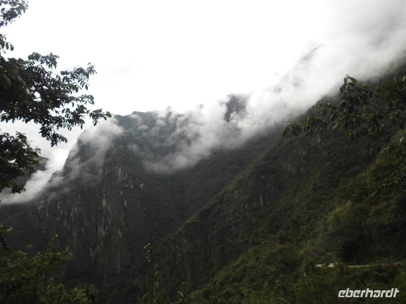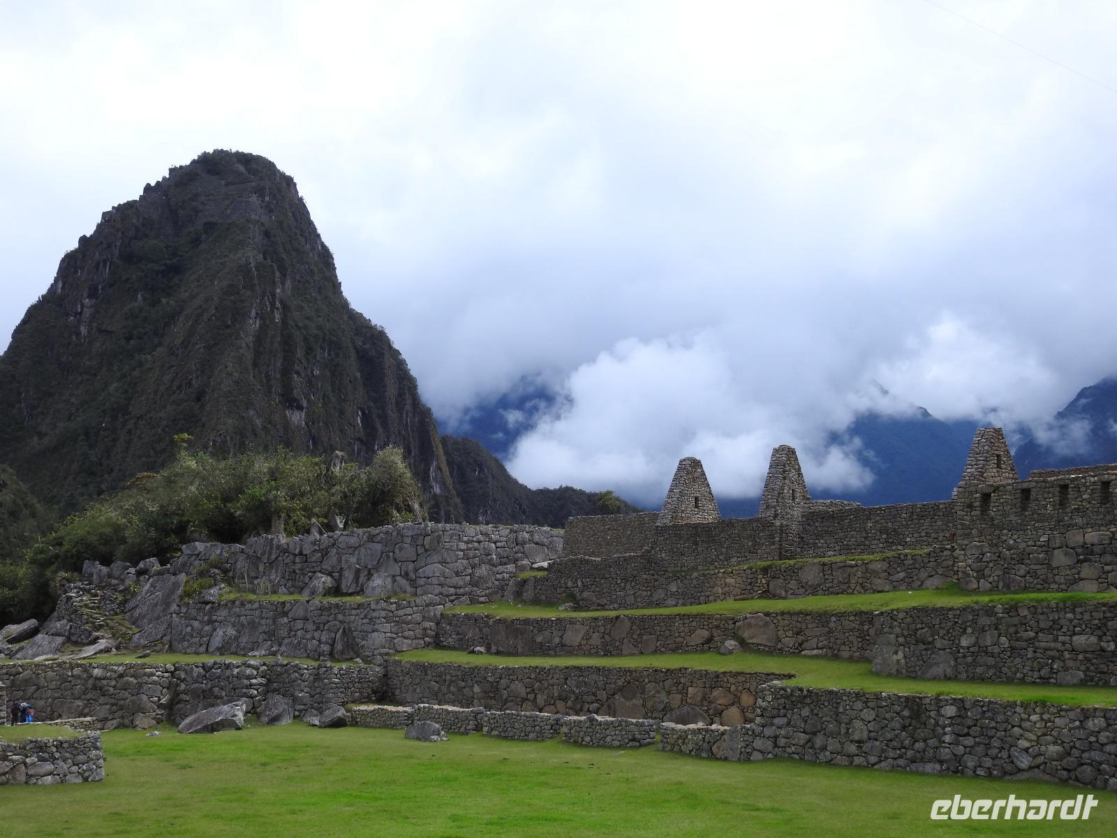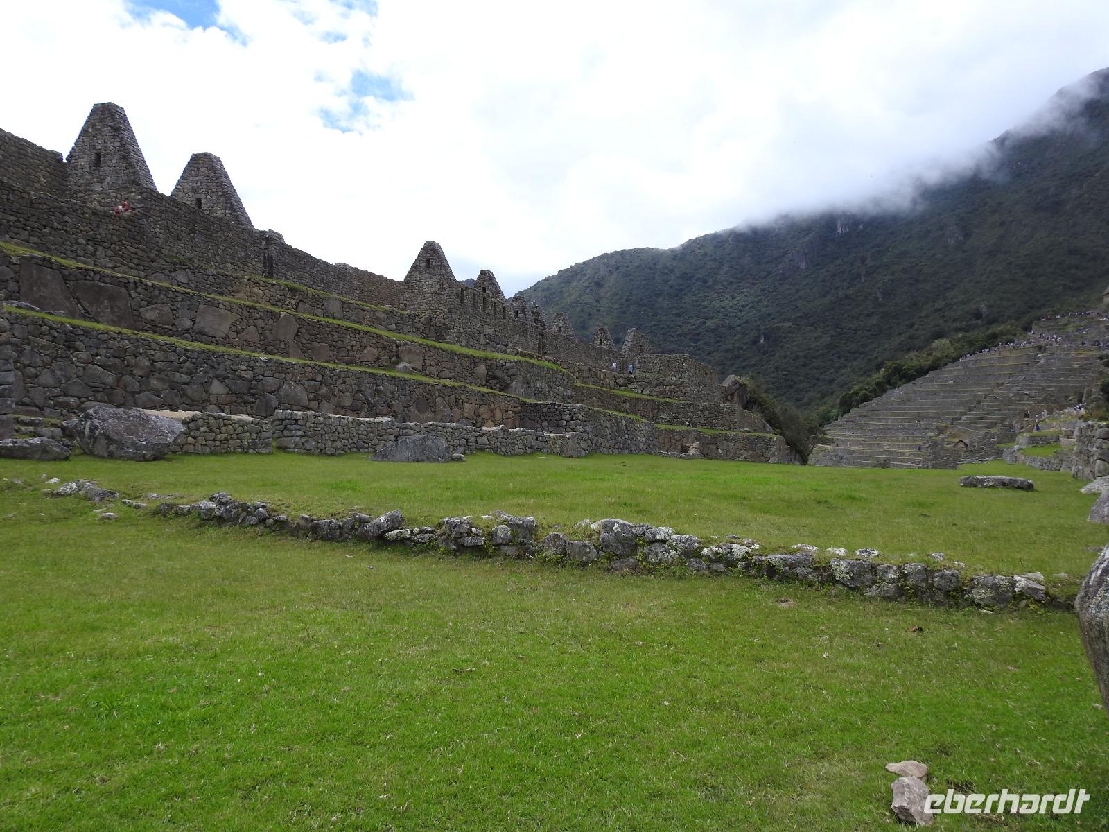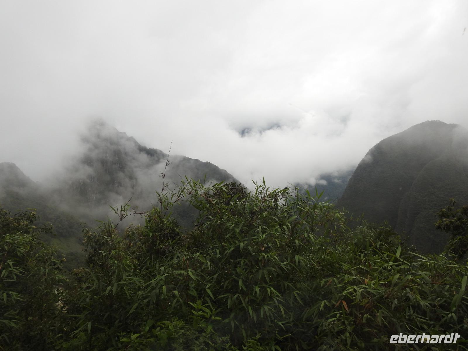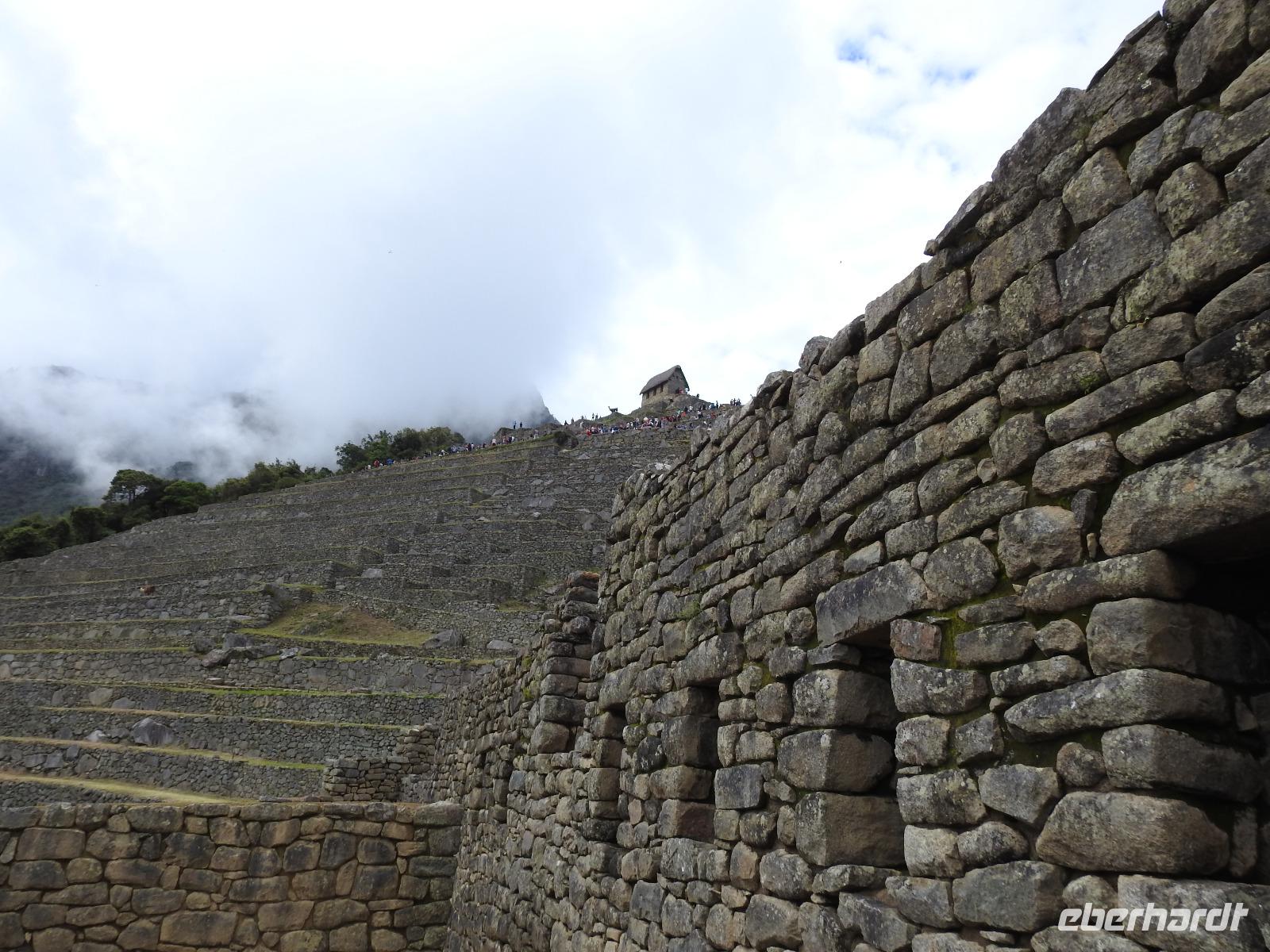 Wieder geht es zeitig los. Bereits ab 4.30 Uhr heißt es - frühstücken. Unser Gepäck wird von fleißigen Helfern des Hotels von den Zimmern abgeholt und in die Lobby gebracht. Anschließend wird es in einem Gepäckraum des Hotels verstaut. Wir fahren mit mehr oder weniger leichtem Gepäck zum Bahnhof. Immerhin müssen Sonnencreme, Insektenschutz, Regenschutz, Wasser und Fotoausrüstung mindestens dabei sein. Und den Pass dürfen wir heute nicht vergessen, egal, was wir tun, es wird immer der Pass kontrolliert. Mit dem Bus fahren wir nach Ollantaytambo, wo wir in den Zug der Peru Rail umsteigen. Der Weg zum Bahnhof führt an bunten Marktständen vorbei, aber uns bleibt keine Zeit zum Schlendern. Allein der Händler mit den Wanderstöcken kommt mit uns ins Geschäft. Im Zug beziehen wir unser Abteil 1. Klasse, das mit großen Fenstern und mit Panoramafenstern ausgestattet ist. Unterwegs gibt es einen Imbiss, bestehend aus Kaffee oder Mangosaft und einem Stück Kuchen. Der Zug fährt durch das heilige Urubamba Tal mit seiner spektakulären Landschaft. Gegen halb neun kommen wir in Aguas Calientes (Dorf Machu Picchu) an. Wieder müssen wir uns durch endlos erscheinende Markstände schlängeln, bis wir zum Busbahnhof kommen. Von hier aus geht es vierhundert Meter weiter in die Höhe auf einer Serpentinenstraße entlang. Wir sind nicht allein. Außer uns wollen noch weitere gefühlte tausend Touristen nach Machu Pichu. Yovanna berichtet uns, dass täglich nur 4000 Besucher zugelassen werden. 2000 morgens und 2000 nachmittags. Trotzdem entspannt sich die Lage in Machu Picchu deutlich. Die Anlage ist so groß, dass genug Platz für alle ist.