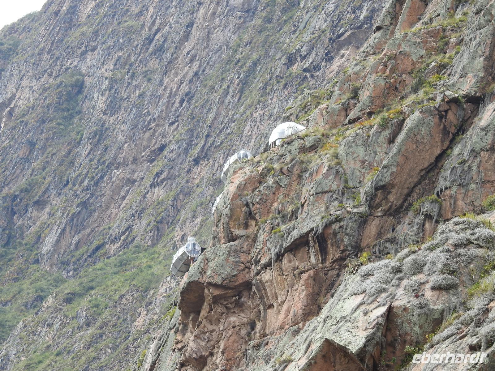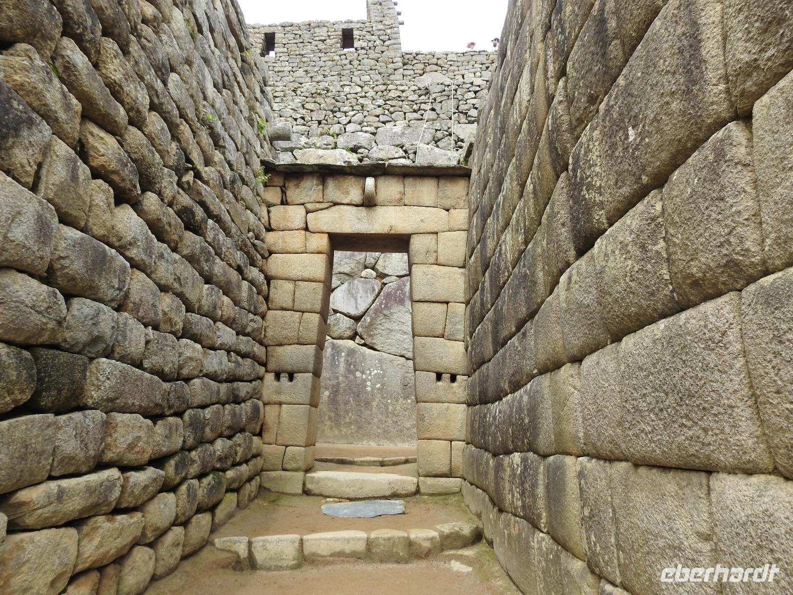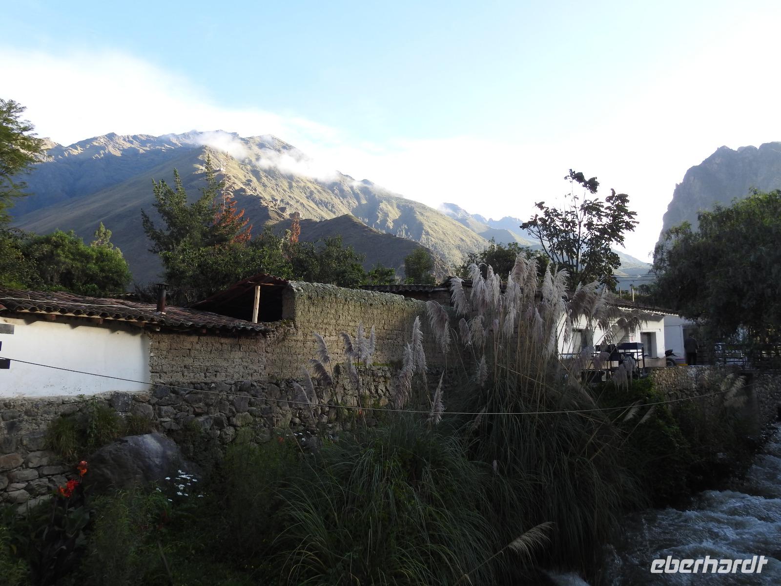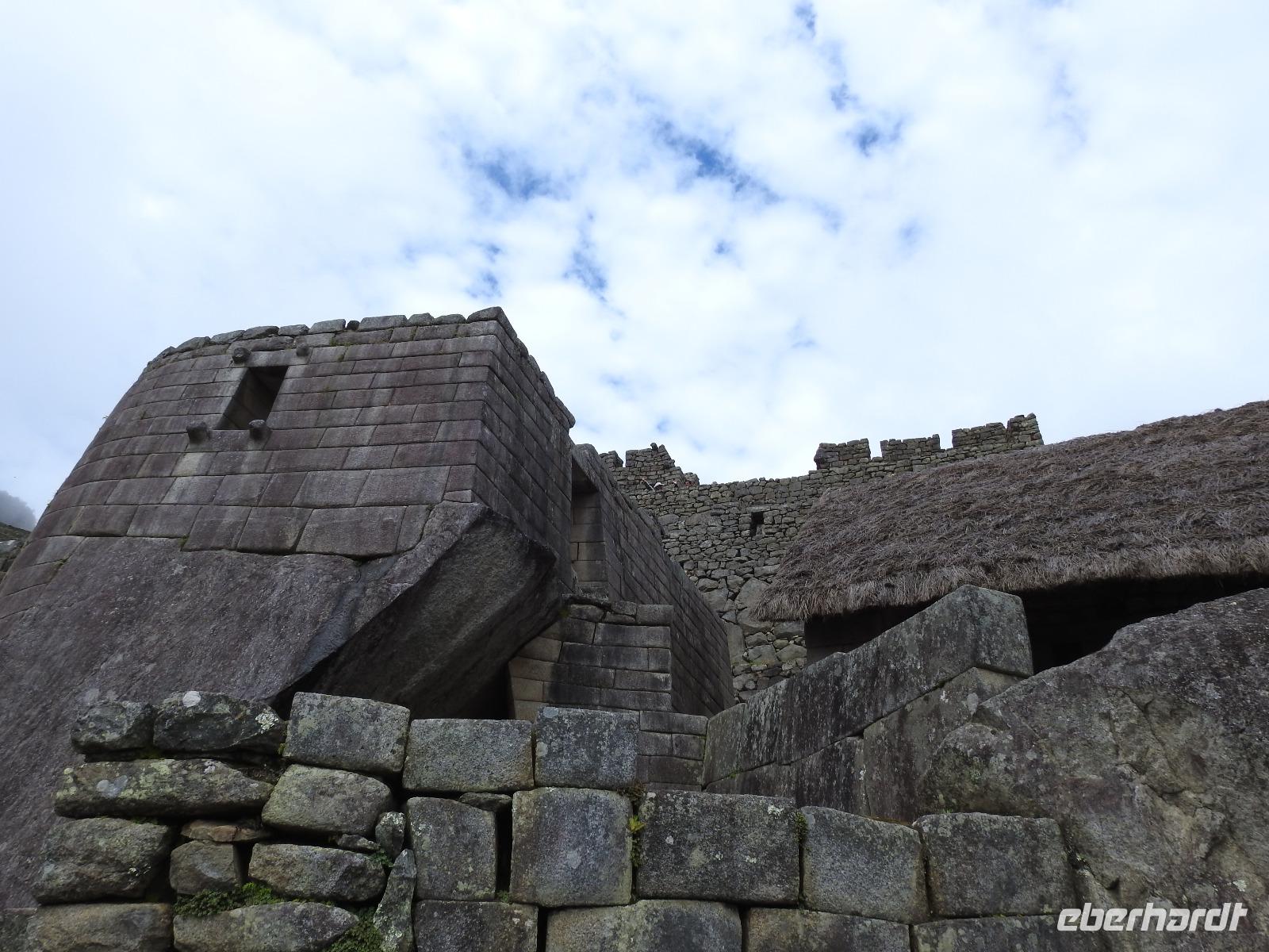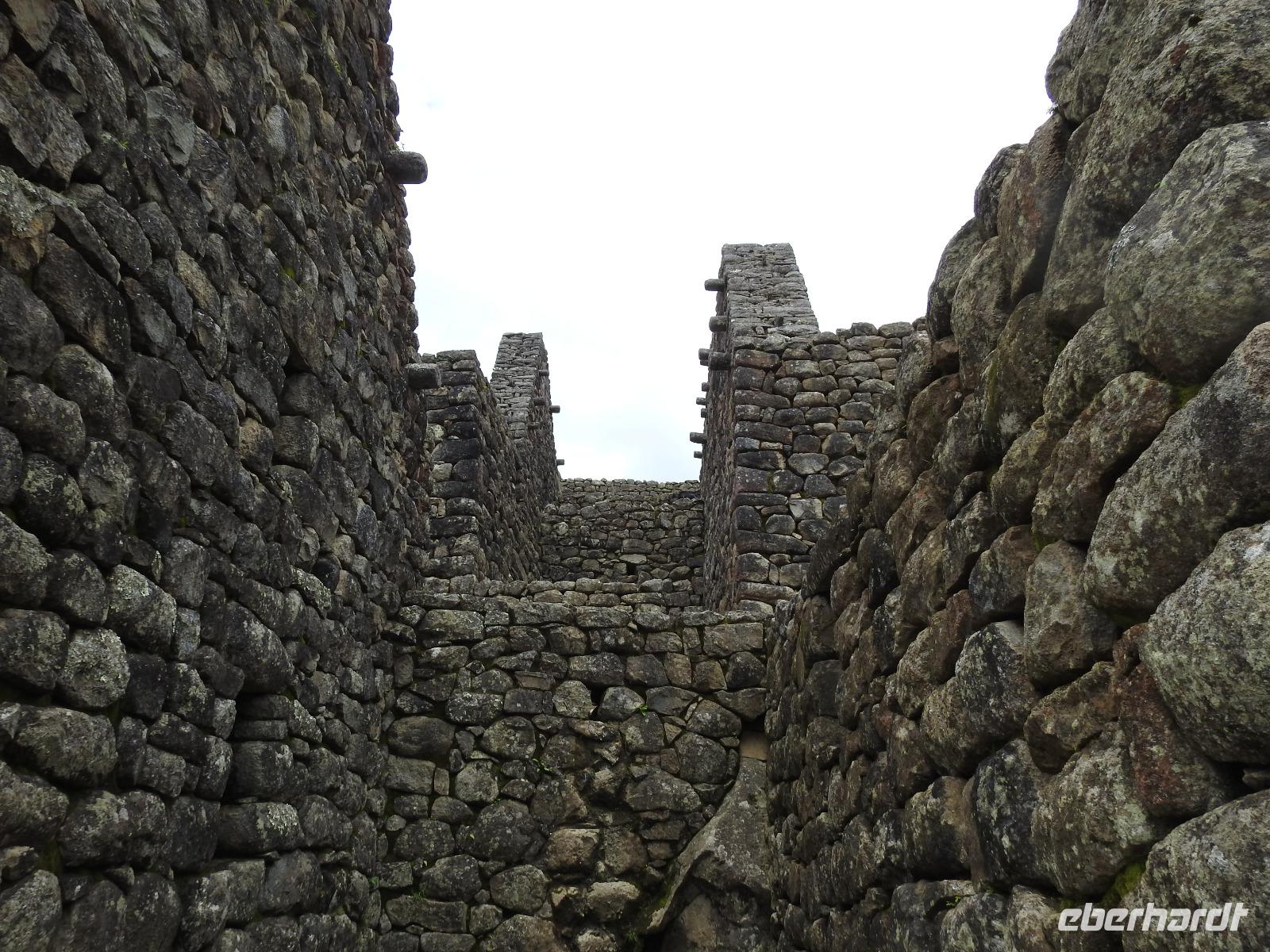 Wieder geht es zeitig los. Bereits ab 4.30 Uhr heißt es - frühstücken. Unser Gepäck wird von fleißigen Helfern des Hotels von den Zimmern abgeholt und in die Lobby gebracht. Anschließend wird es in einem Gepäckraum des Hotels verstaut. Wir fahren mit mehr oder weniger leichtem Gepäck zum Bahnhof. Immerhin müssen Sonnencreme, Insektenschutz, Regenschutz, Wasser und Fotoausrüstung mindestens dabei sein. Und den Pass dürfen wir heute nicht vergessen, egal, was wir tun, es wird immer der Pass kontrolliert. Mit dem Bus fahren wir nach Ollantaytambo, wo wir in den Zug der Peru Rail umsteigen. Der Weg zum Bahnhof führt an bunten Marktständen vorbei, aber uns bleibt keine Zeit zum Schlendern. Allein der Händler mit den Wanderstöcken kommt mit uns ins Geschäft. Im Zug beziehen wir unser Abteil 1. Klasse, das mit großen Fenstern und mit Panoramafenstern ausgestattet ist. Unterwegs gibt es einen Imbiss, bestehend aus Kaffee oder Mangosaft und einem Stück Kuchen. Der Zug fährt durch das heilige Urubamba Tal mit seiner spektakulären Landschaft. Gegen halb neun kommen wir in Aguas Calientes (Dorf Machu Picchu) an. Wieder müssen wir uns durch endlos erscheinende Markstände schlängeln, bis wir zum Busbahnhof kommen. Von hier aus geht es vierhundert Meter weiter in die Höhe auf einer Serpentinenstraße entlang. Wir sind nicht allein. Außer uns wollen noch weitere gefühlte tausend Touristen nach Machu Pichu. Yovanna berichtet uns, dass täglich nur 4000 Besucher zugelassen werden. 2000 morgens und 2000 nachmittags. Trotzdem entspannt sich die Lage in Machu Picchu deutlich. Die Anlage ist so groß, dass genug Platz für alle ist.