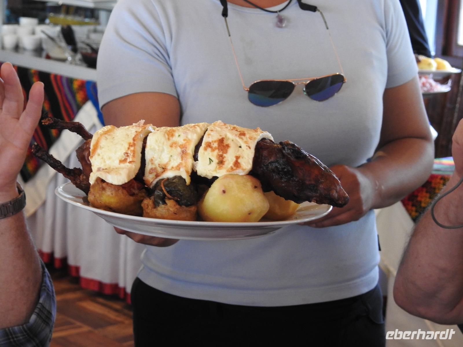 Endlich einmal nicht so früh aufstehen, erst um halb neun beginnt unsere Stadtbesichtigung. In aller Ruhe lassen wir uns das leckere Frühstück schmecken. Unser erstes Ausflugsziel ist heute Saqsayhuaman (es gibt viele verschiedene Schreibweisen für diese Anlage). Saqsayhuaman ist die Ruine einer Inka-Festung und eine der bedeutendsten Sehenswürdigkeiten aus dieser Zeit. Sie liegt etwa drei Kilometer außerhalb des Stadtzentrums auf einer Anhöhe. Saqsayhuaman diente als Repräsentationsort und als Verteidigungsanlage. Beeindruckend sind die Zickzackmauern, die aus riesengroßen Steinen zusammengesetzt sind. Der größte Stein soll neun Meter hoch, fünf Meter breit und vier Meter dick sein und über zweihundert Tonnen wiegen. Unser Auge erfreut dazu eine Gruppe von Alpacas, die es sich hier gemütlich gemacht haben, sogar ein Mutter mit Kind ist dabei. Mit einer traumhaften Sicht auf Cusco fahren wir zurück ins Stadtzentrum. Von hier aus setzen wir unsere Besichtigung zu Fuß fort. Wir befinden uns in der Hauptstadt der gleichnamigen Region Cusco auf ca. 3400 Metern Höhe. Diese Lage macht uns doch ordentlich zu schaffen. Schon gestern, als wir aus dem Flugzeug stiegen, machten sich Kurzatmigkeit, Schwindel und zittrige Hände bemerkbar. Ein bisschen haben wir uns daran gewöhnt, aber so ganz wohl ist Vielen dann doch nicht. Lassen wir uns ablenken von den Schönheiten dieser wundervollen Stadt. Wir besuchen die Iglesia La Compania de Jesus, eine Kirche, die 1571 von den Jesuiten erbaut wurde. 1650 wurde die Kirche vom Erdbeben zerstört, jedoch 18 Jahre später wiederaufgebaut. Zu dieser Zeit bemerkte der Bischof von Cusco, dass die Jesuitenkirche größer und schöner als seine eigene Kathedrale werden würde. Und so sandte er dem damaligen Papst Paul III. eine Nachricht und verlangte einen Baustopp für die Kirche. Als dieser jedoch eintraf, war die Kirche längst fertig gebaut und so, wie vom Bischof befürchtet, die prächtigste Kirche der Stadt. Im Innern befinden sich vergoldete Altäre, eine goldene Kanzel und viele wundervoll geschnitzte Figuren, die der Hauch jener Zeit umgibt. Die Kirche hat zwei Glockentürme, von denen einer bestiegen werden kann und von dem man einen schönen Blick auf den Hauptplatz von Cusco hat. Nun besuchen wir das Museum der Präkolumbianischen Kunst, wo es viele Artefakte aus der Zeit vor den Inkas zu sehen gibt. Gegen Mittag fahren wir zum Flughafen. Wir verlassen Cusco und fliegen zurück nach Lima. Überraschenderweise erwartet uns dort nicht Ursula, sondern Carlos, der uns zum Hafen bringt. Unser Gepäck wird separat transportiert und gelangt auf geheimnisvolle Weise in unsere Kabinen. Wir checken ein und schon ist es Zeit für das Abendessen. Die Tischreservierung hat auch geklappt, wir haben zwei Achtertische im Restaurant Möwe zu unserer Verfügung. Zum ersten Mal gibt es auch einen Mitternachts-Snack. Jalapeno Mozarella Sticks.
