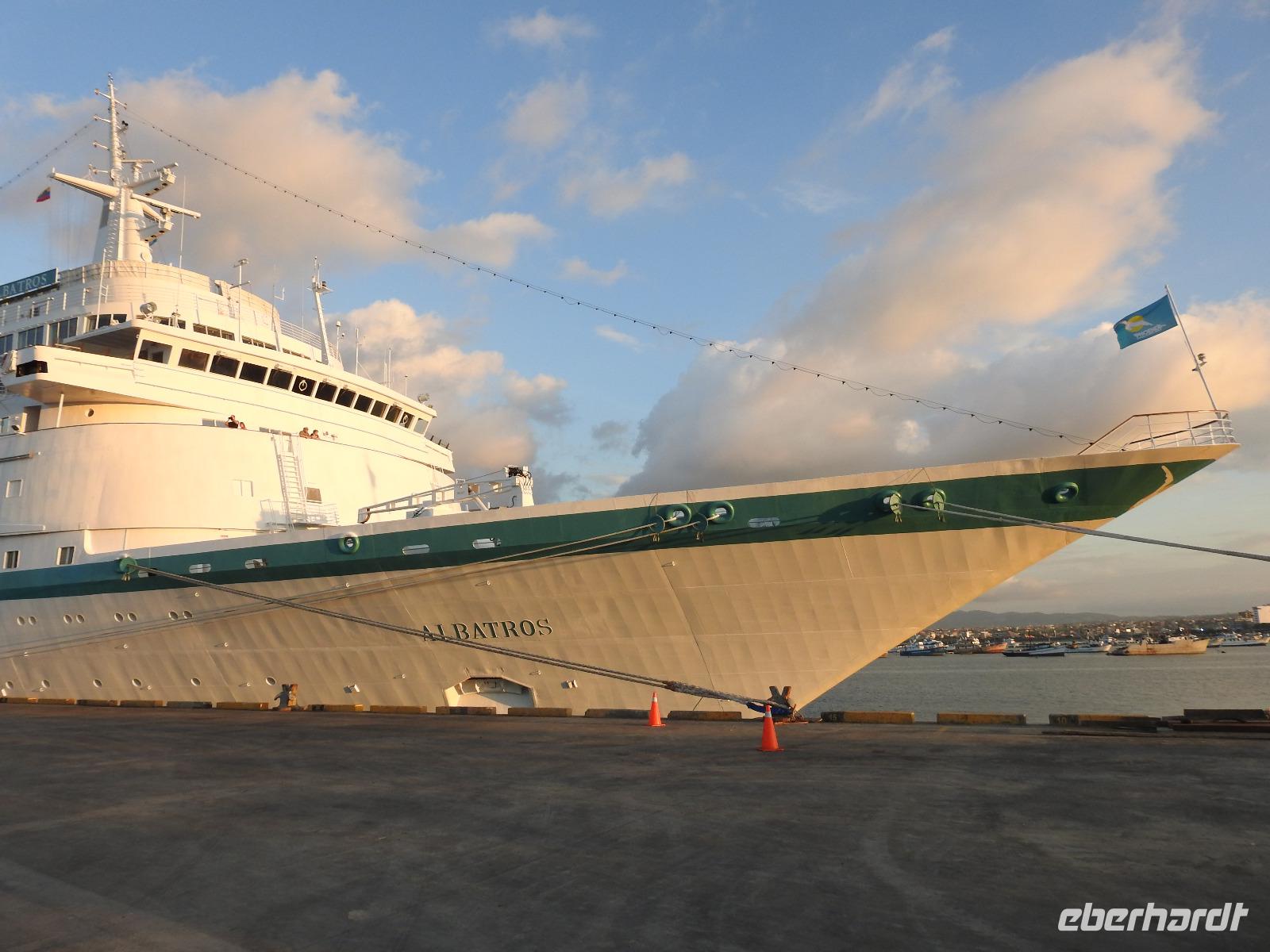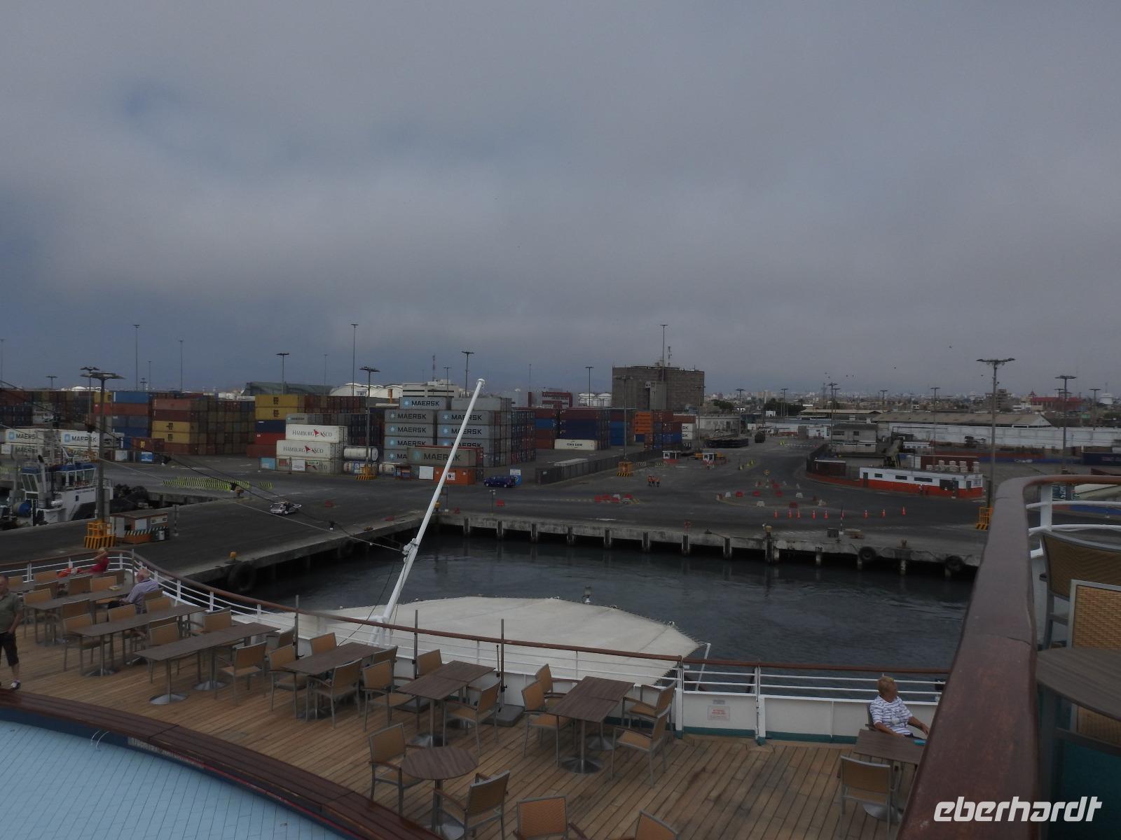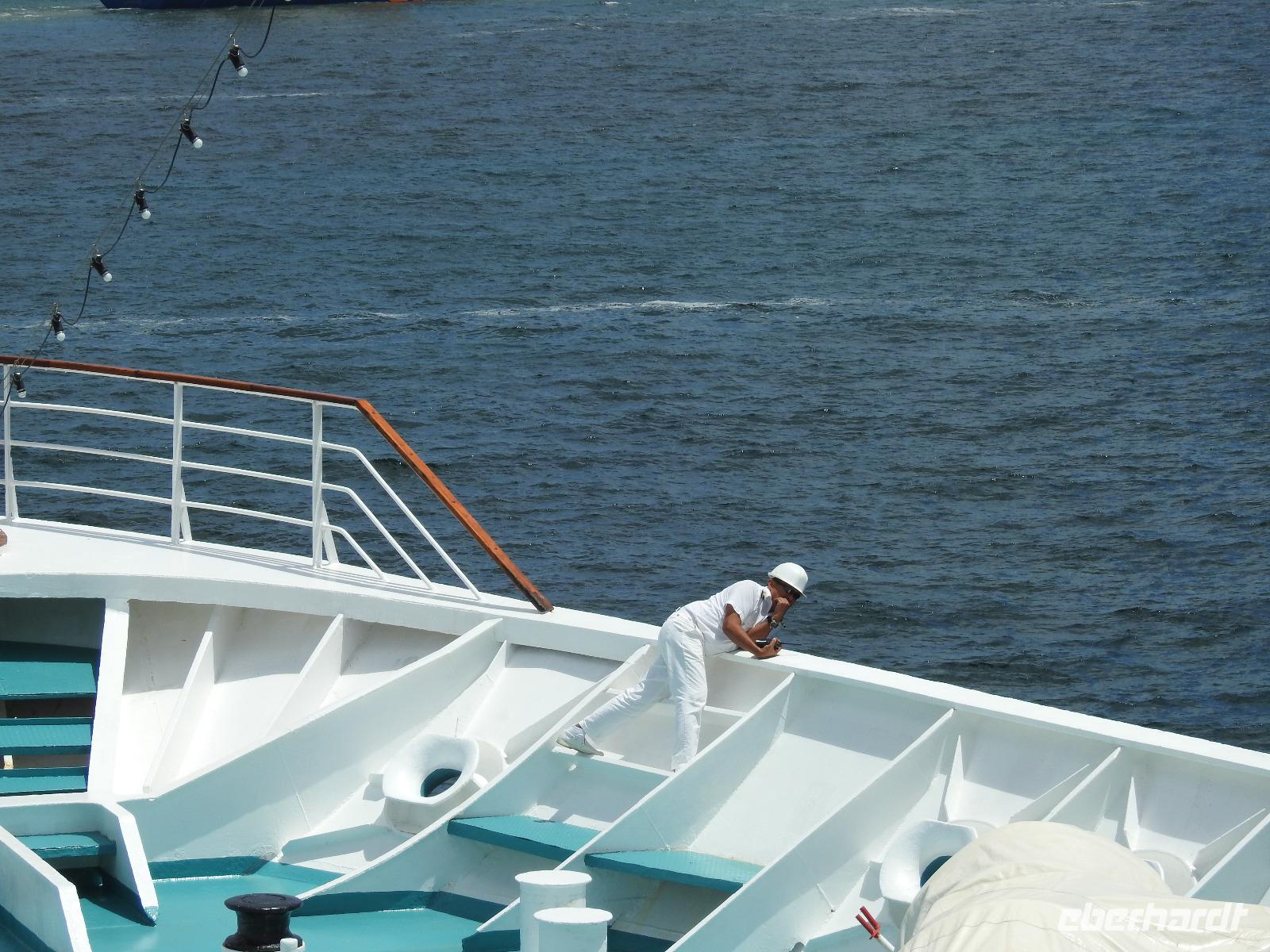 Heute können wir uns etwas ausruhen und die Erlebnisse der letzten Tage sacken lassen. Den Morgen genießen wir am reichhaltigen Frühstücksbuffet, anschließend kann jeder auf eigene Faust und nach Gutdünken das Schiff erkunden. Mittags wird an Deck die PERUANISCHE REISPFANNE serviert und um 14 Uhr werden alle zur Rettungsübung gebeten. Siebenmal kurz und einmal lang, dieser Ton fordert uns auf, mitsamt der Schwimmweste an unseren Musterstationen zu erscheinen. Dort erfolgen eine Anwesenheitskontrolle und die Sicherheitsbelehrung. Wir legen unsere Schwimmwesten an und gehen im Gänsemarsch, die rechte Hand auf der Schulter des Vordermannes, zu unserem Rettungsboot. Hier gibt es weitere Belehrungen bevor wir wieder in unsere Kabinen entlassen werden. Schnell die Schwimmweste verstauen und zurück an Deck, denn der Motor ist schon an und wir verlassen den Hafen Callao und damit Peru. Am Abend begrüßt Kapitän Elmar Mühlebach alle Passagiere, die es wünschen, mit einem Handschlag. Das dauert eine Weile, denn über einhundert Gäste wollen diesen Augenblick nicht versäumen. Mit Sekt und Häppchen verwöhnt, vergeht die Wartezeit aber schnell. Nun stellen der Kapitän seine Mannschaft und der Kreuzfahrtdirektor seine Mitarbeiter vor. Nach dem Gala-Abendessen findet in der Atlantik-Lounge die erste Show statt. Unter dem Motto SEI HIER GAST stellen sich die Künstler vor, die an den nächsten Abenden auftreten werden. So klingt unser erster Tag an Bord der MS Albatros aus. Oder wir gehen noch zum Mitternachtsbuffet. Es gibt pikante Bohnensuppe.