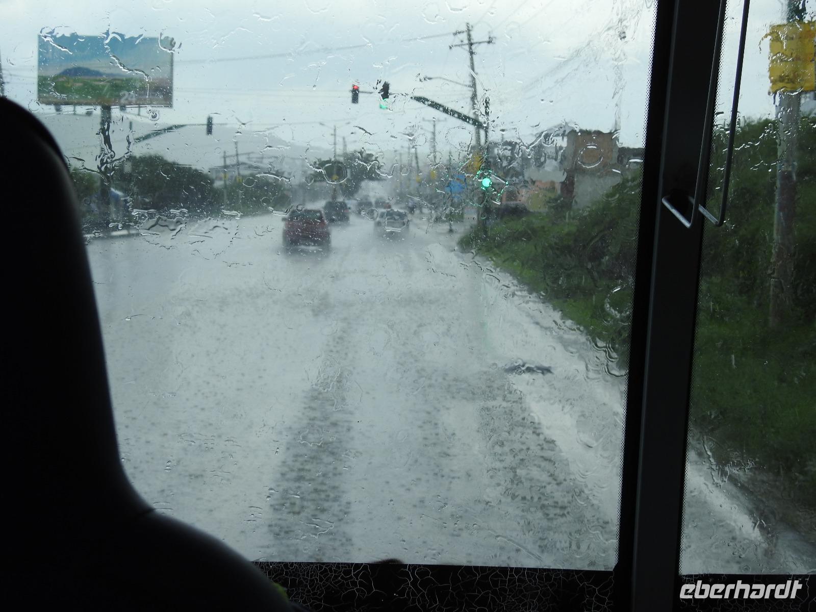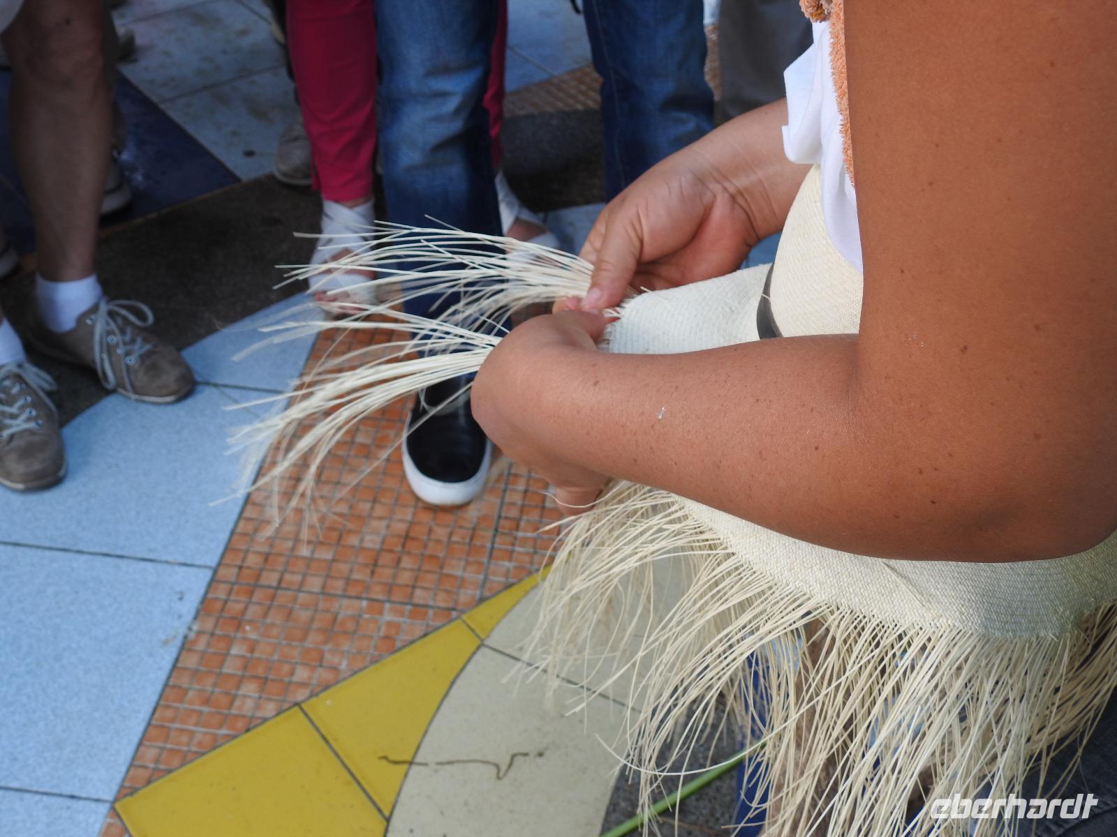 Wir kommen nach 223 Seemeilen mittags in der zweitgrößten Hafenstadt von Ecuador, in Manta, an. In der Atlantik Lounge, auf Deck 6, treffen sich die Ausflügler und werden vom freundlichen Phoenix-Team auf die Busse aufgeteilt. Fünf Busse fahren zum Ausflug Pacoche Lodge mit Wanderung und acht Busse zum Ausflug Manta und Montecristi. Insbesondere der Erwerb von Panamahüten steht heute bei vielen an erster Stelle. Zunächst fahren wir jedoch zum Geschichtsmuseum in Manta, wo wir einiges über die Indiokultur der Region erfahren. Unterwegs kommen wir an Thunfischmonumenten vorbei, denn in Manta wird frisch gefangener Thunfisch verarbeitet und exportiert. Vorbei am großen Einkaufszentrum Mall de Pacifico und an gut besuchten Stränden fahren wir in Richtung Montecristi. Unterwegs meldet sich die Regenzeit, es fängt an zu gießen wie aus Kannen. Auch als wir am Marktplatz Parque Central ankommen, regnet es wie verrückt. Das hat zur Folge, dass sich an dem Stand, an dem uns die Produktion von Panamahüten erklärt werden soll, noch die vorausfahrende Gruppe befindet, denn alle anderen Marktstände sind dem Regen ausgesetzt. Trotzdem bemühen sich unser örtlicher Reiseleiter und die Reiseleiterin von Phoenix, uns zu zeigen wie die Fasern für die Panamahüte verarbeitet werden und wie anschließend daraus ein Hut geflochten wird. Die Einheimischen, die für die Präsentation zur Verfügung stehen, schauen nur mit großer Verwunderung auf die sie überfallenden Massen. Es gelingt ihnen jedoch, ihre Hüte zu Fantasiepreisen zu verkaufen. Das Glück liegt auf beiden Seiten - die Einen haben einen originalen Panamahut erworben, die anderen ein gutes Geschäft gemacht. Es ist noch Zeit, um die Basilica Nuestra Senora de Monserrate zu besuchen, eine Kirche, die sich unweit des Marktes befindet. Eine weitausladende Treppe mit unter Wasser stehenden Stufen muss dafür allerdings überwunden werden. Das viele Wasser sorgt bei mir für ein ganz profanes Problem. Ich erkundige mich bei einer Reiseleiterin, wo denn ein WC zu finden wäre. Sie zeigt mir ein Gebäude auf der anderen Straßenseite, wo ich fündig werden sollte. Ich schlurfe durch den unter Wasser stehenden Markt, muss mir alle Händler freundlich lächelnd vom Halse halten und dann feststellen, dass die Tür des Gebäudes mit einem Vorhängeschloss gesichert ist. Verdammt, hier ist niemand. Die Straße noch weiter zu gehen, traue ich mich nicht, zu sehr sehe ich mit meiner riesigen Kamera nach Touristenopfer aus, außerdem drängt die Zeit. Auf der gegenüberliegenden Seite ist ein Geschäft, was wie ein Café oder eine Bäckerei aussieht. Zwar ist es mir peinlich, aber ich gehe dennoch hinein und finde Erlösung. Die freundlichen Angestellten verstehen sofort mein Problem und erlauben mir, ihre Toilette zu benutzen. Danke!!!