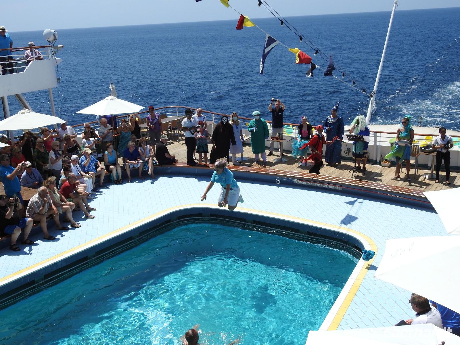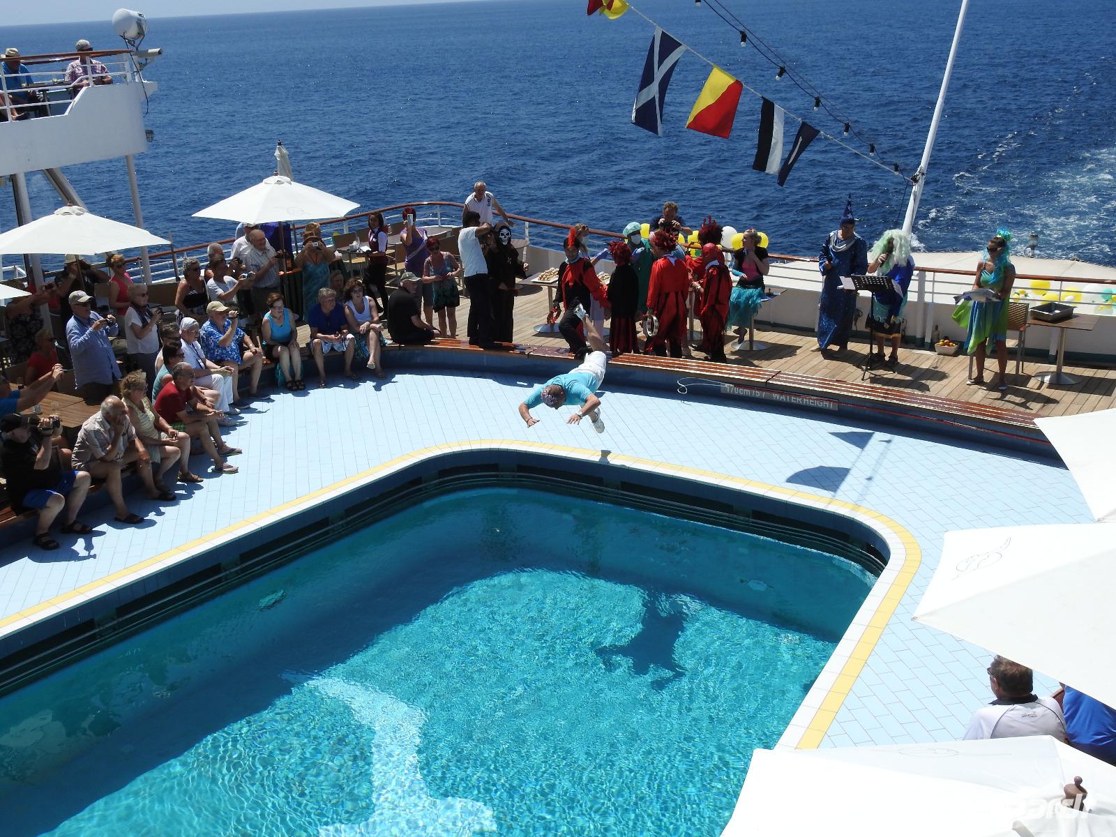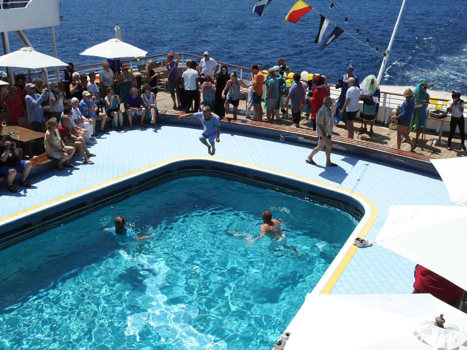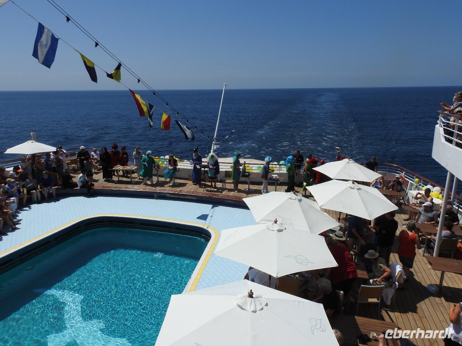 Gegen Null Uhr haben wir den Äquator überquert. Keine Frage, dass daraus die heutige Äquatortaufe resultiert. Neptun ist mit seinem Gefolge an Bord gekommen und beschwert sich darüber, dass die von irdischem Staub beschmutzten Kreuzfahrer sein Reich betreten haben. Nach uraltem Seemannsbrauch werden die Gäste begrüßt, der Kapitän muss das Schiff mit einer Flasche Wodka auslösen und anschließend werden Freiwillige getauft. Ihr Schopf bekommt eine Joghurt-Frisur, sie müssen einen Fisch küssen und anschließend in den Pool springen. Das Seemannsvolk hat seinen Spaß dabei.