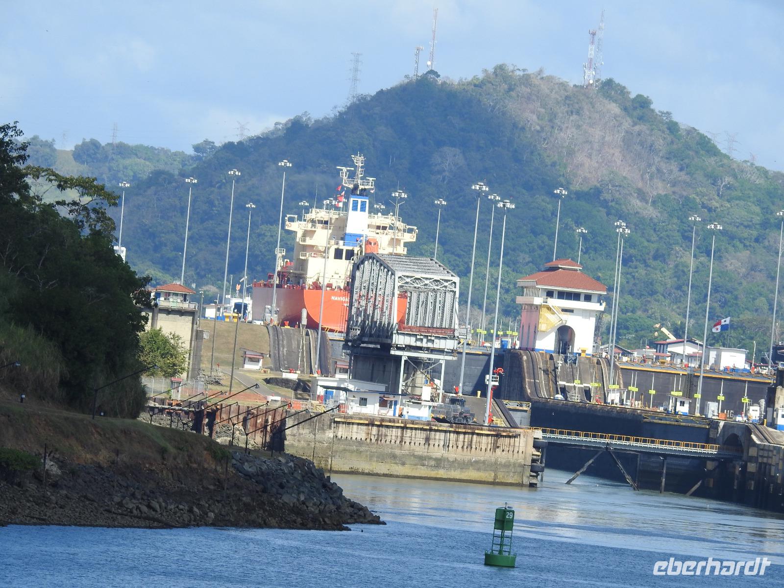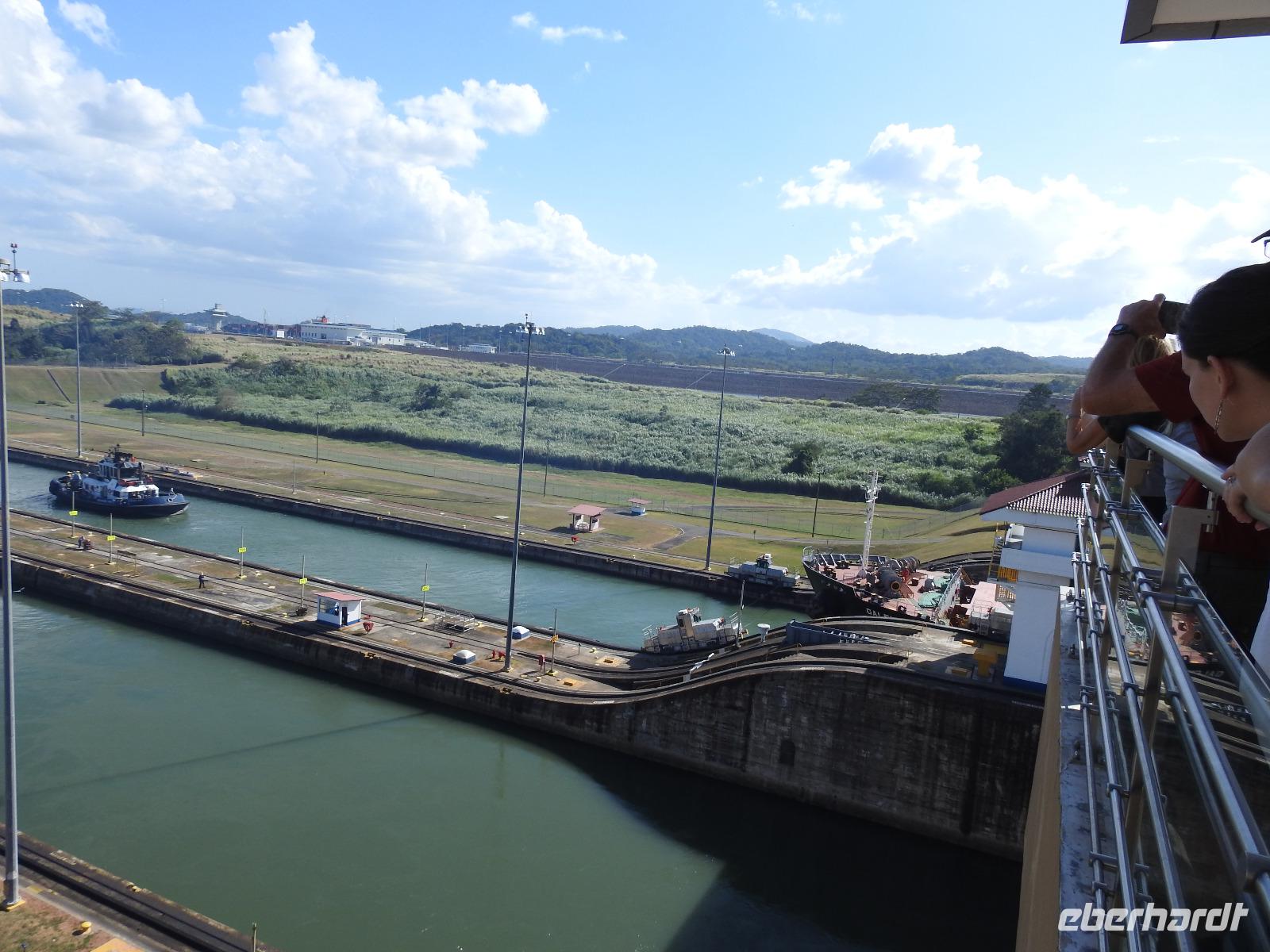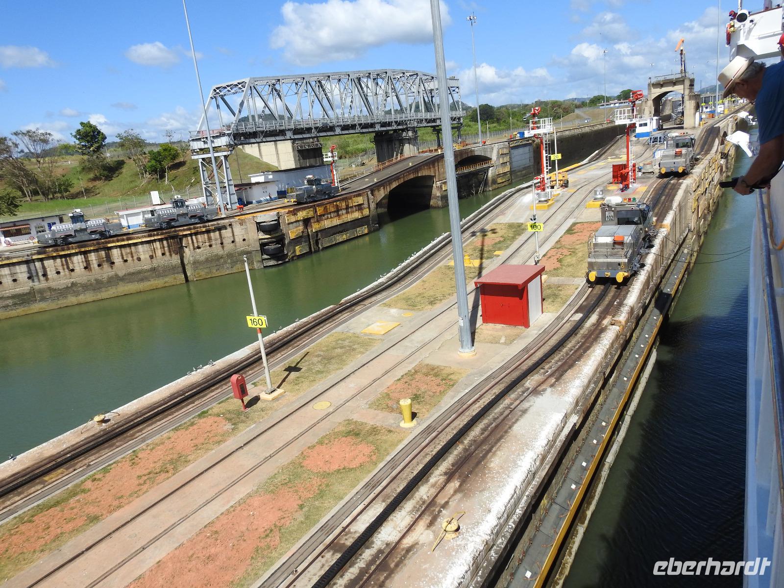 Während des Frühstücks dümpelt unser Schiff vor der Kulisse von Panama-City so vor sich hin. Erst gegen Neun treffen die Lotsen ein und wir können uns auf den Weg zum Panama-Kanal machen. Die Decks sind voll. Jeder möchte den besten Platz zum Fotografieren haben. Nach etwa einer Stunde erreichen wir die Miraflores-Schleuse. Durch die Außenbordlautsprecher versorgt uns der Kreuzfahrtdirektor mit Informationen zu den jeweiligen Abschnitten. Nun folgt die Durchquerung der Pedro Miguel Schleuse. Das Wetter ist toll, die Sonne scheint vom strahlend blauen Himmel. Nach einem leckeren Mittagessen bleibt genügend Zeit für ein Schläfchen bevor wir am Nachmittag durch die Gatun Schleuse fahren und damit den Panama-Kanal verlassen.