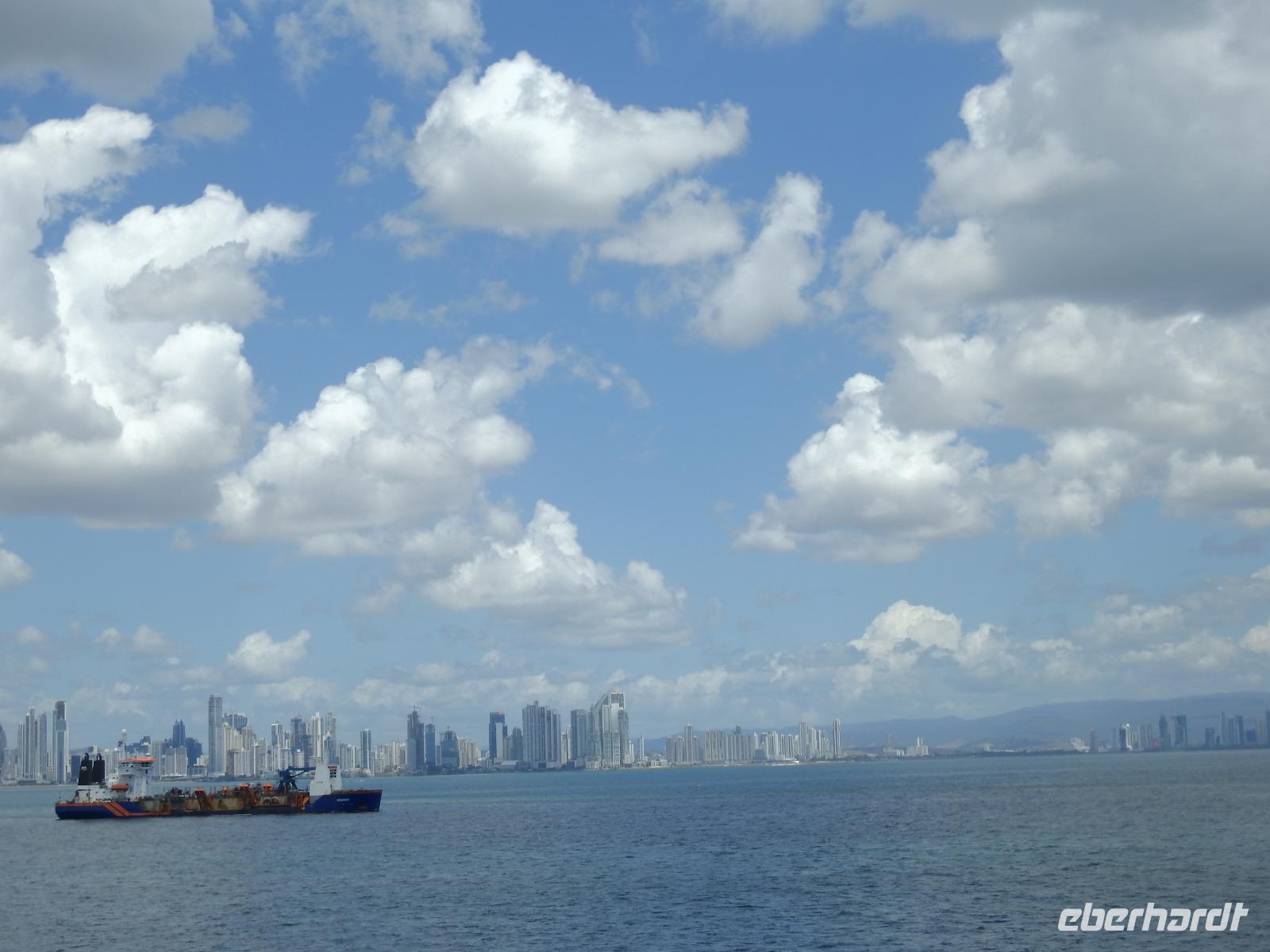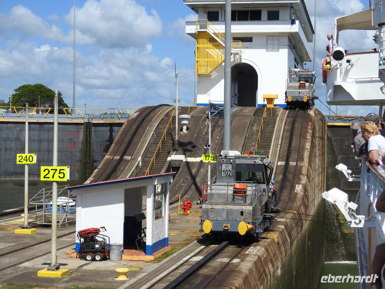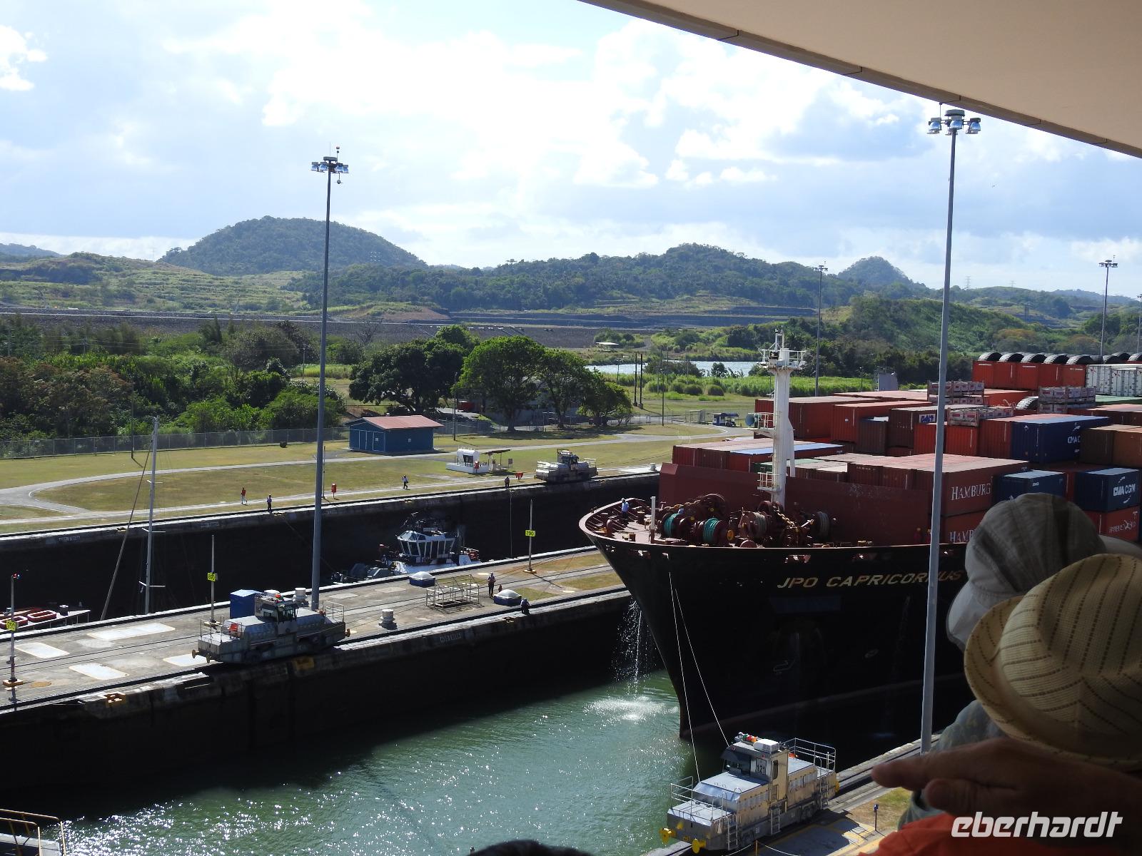 Während des Frühstücks dümpelt unser Schiff vor der Kulisse von Panama-City so vor sich hin. Erst gegen Neun treffen die Lotsen ein und wir können uns auf den Weg zum Panama-Kanal machen. Die Decks sind voll. Jeder möchte den besten Platz zum Fotografieren haben. Nach etwa einer Stunde erreichen wir die Miraflores-Schleuse. Durch die Außenbordlautsprecher versorgt uns der Kreuzfahrtdirektor mit Informationen zu den jeweiligen Abschnitten. Nun folgt die Durchquerung der Pedro Miguel Schleuse. Das Wetter ist toll, die Sonne scheint vom strahlend blauen Himmel. Nach einem leckeren Mittagessen bleibt genügend Zeit für ein Schläfchen bevor wir am Nachmittag durch die Gatun Schleuse fahren und damit den Panama-Kanal verlassen.