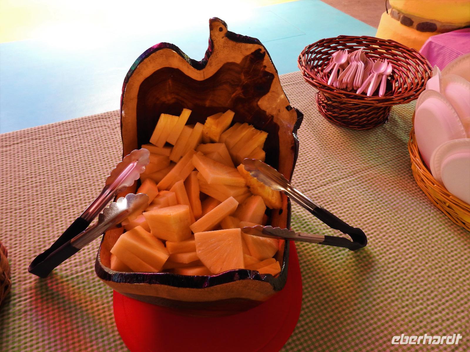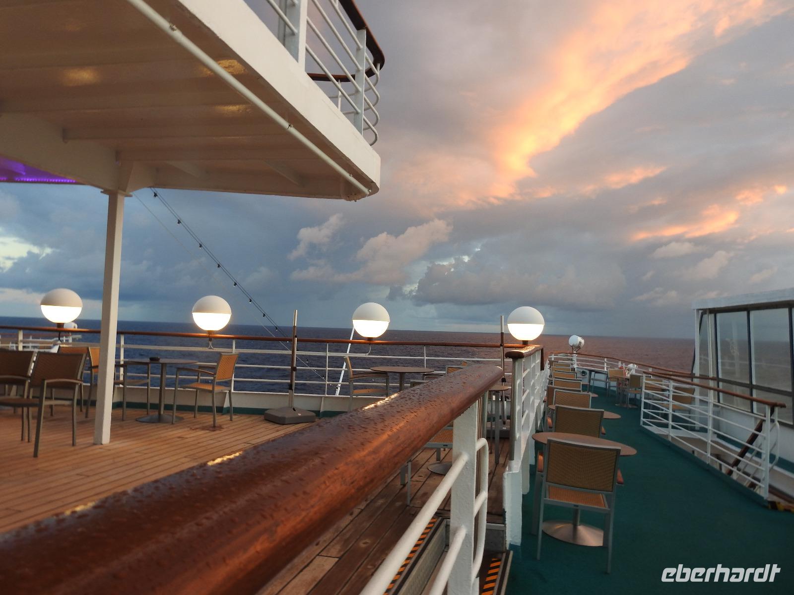 Parallel dazu kann man die Schiffsanimation nutzen und sich beim Frühsport körperlich ertüchtigen, beim Quiz mit Serdal knifflige Aufgaben lösen, zur Massage oder zum Frisör gehen. Und den ganzen Tag werden wir kulinarisch verwöhnt. An Deck werden tropische Früchte gereicht, zum Mittag gibt es kreolischen Schaschlik-Spieß oder traditionell das Essen im Restaurant und am Nachmittag öffnet das Eisbuffet.