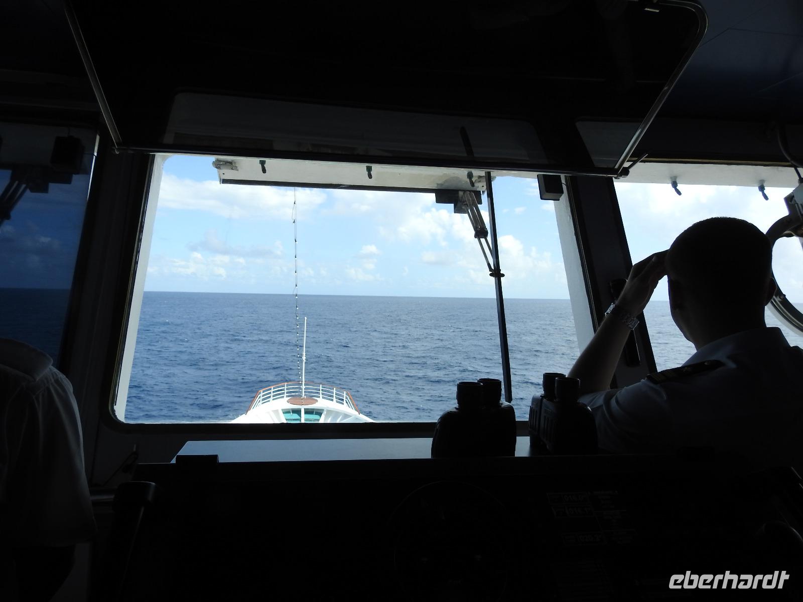 In der Pazifik-Lounge treffen wir uns und stoßen mit einem Glas Sekt auf eine gute Reise an. Plötzlich erscheint der Überraschungsgast - Kapitän Elmar Mühlebach. Ganz entspannt plaudert er mit uns, beantwortet geduldig alle Fragen und lässt sich mit uns für ein Gruppenfoto ablichten. Eine ganz besondere Erinnerung entsteht.