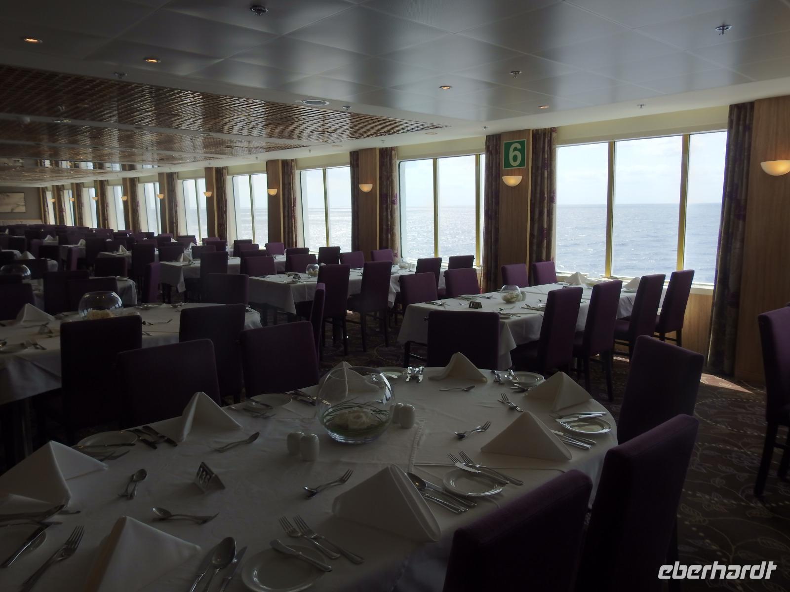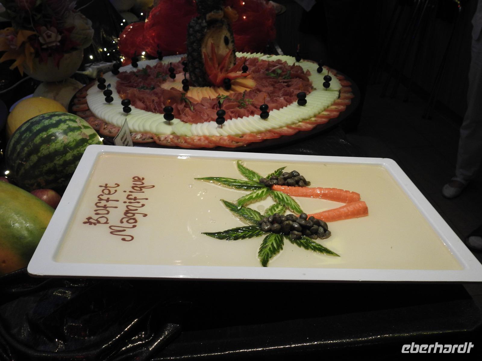 Höhepunkte des heutigen Tages sind vormittags der Frühshoppen und am Abend das Buffet Magnific. Ab 8 Uhr kann man mit Daniela Frühsport machen, um neun dem Bordpfarrer Traugott lauschen (was für ein lustiger Name für einen Pfarrer), alternativ 9.15 Uhr ein paar Runden ums Deck drehen und angefutterte Pfunde abtrainieren, ab zehn Uhr hat man die Wahl zwischen einem Vortrag über die Karibik und Costa Rica, einem Quiz mit Serdal, Yoga mit Daniela und nochmal Dart mit Serdal. Ab 11 Uhr schallt Jazzmusik übers Lido-Deck, es gibt Bauchmuskeltraining, ein Aperitifspiel und ab 12 Uhr köstliche Rinderkeule. Ähnlich geht es am Nachmittag weiter, entweder man nimmt am Programm teil oder liegt lesend oder schlafend auf einer der Liegen auf den Außendecks. Einmalig gibt es bei dieser Reise ein wundervoll gestaltetes Buffet mit Hummer und Scampis, Salaten, warmen und kalten Speisen und süßem Nachtisch. Damit jedermann in den Genuss kommt, alles Fotografieren zu können, gibt es dafür speziell Termine. Von Herrn Sanftenschneider gibt es Lieder und Melodien und anschließend am Mitternachts-Buffet: Würstchen mit Kartoffelsalat.
