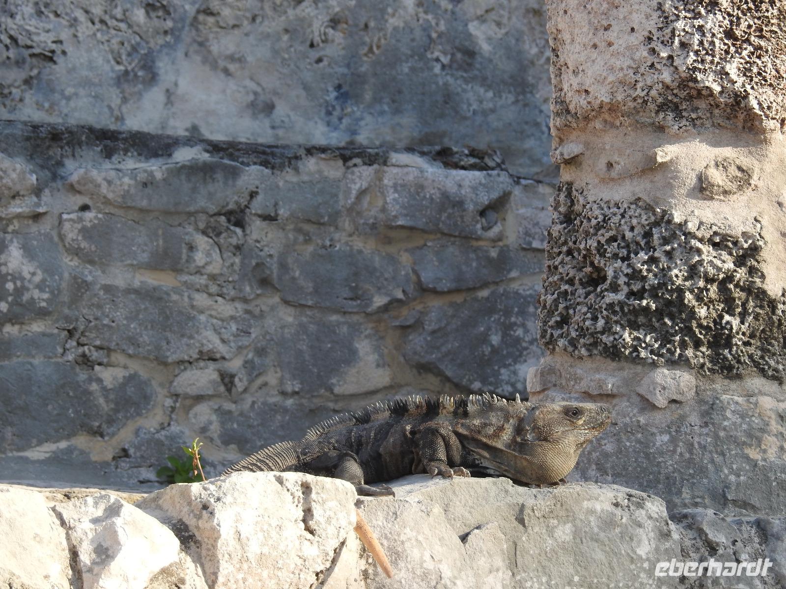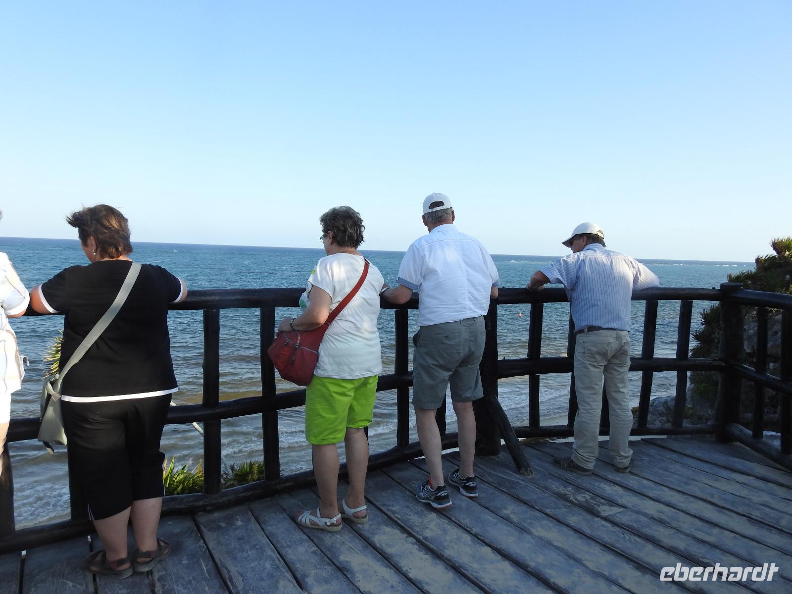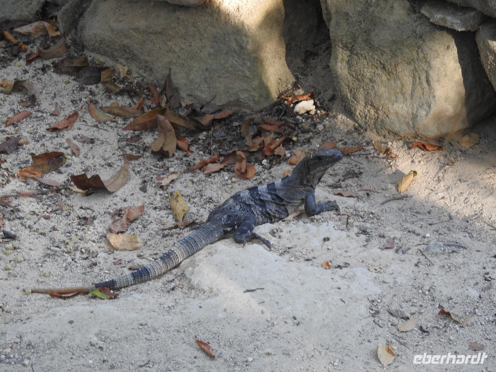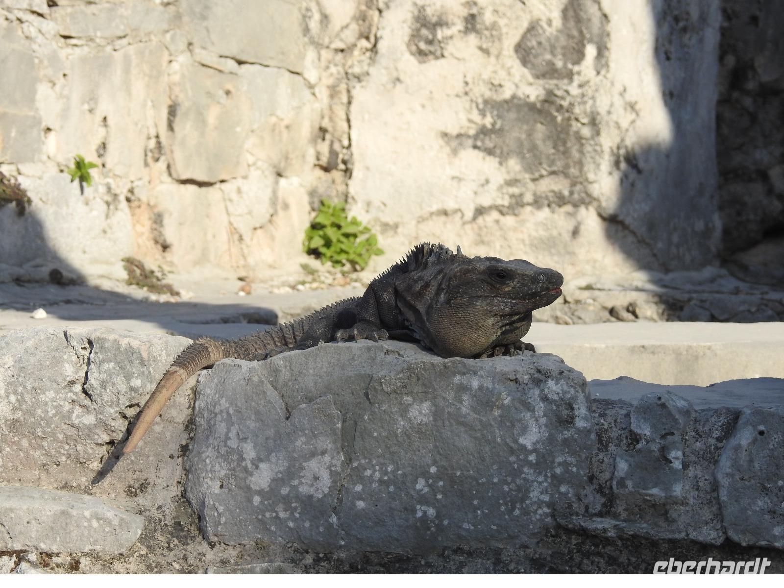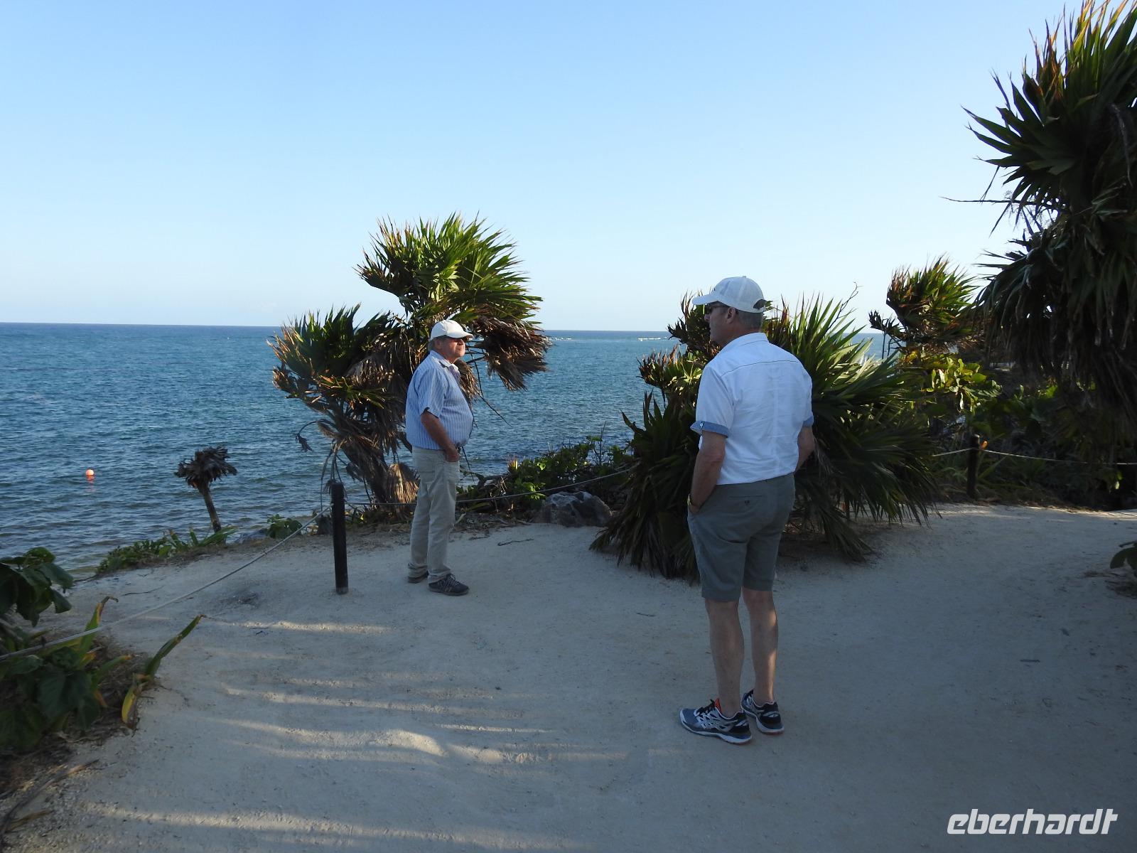 Die Koffer haben wir nachts vor die Tür gestellt und nun sind sie, wie von Geisterhand, verschwunden. Uns erwartet zum Abschied ein Sektfrühstück. Um 9 Uhr verlassen wir die MS Albatros. Doch das ist nicht so einfach. Zunächst müssen wir, wie schon so oft geübt, die Atlantik Lounge aufsuchen. Dort pilgern wir in langer Schlange an den mexikanischen Behörden vorbei. Stempel hier, Stempel da. Papier abgeben, Papier bekommen. Kein Mensch sieht mehr durch. Da hilft nur: alles aufheben, nichts wegwerfen und den Behörden vertrauen. Auf Deck 3 befindet sich der Ausgang und die Gangway. Ca. 200 Meter weiter stehen Mitarbeiter vom Schiff und weisen uns den Weg zu den Koffern. Es ist brütend heiß. Und immer noch ein Stück bis zum Bus. Dieser ist verdunkelt und innen ist es angenehm kühl. Diego, unser Reiseleiter gibt uns ein paar Informationen zu Mexiko, dann lehnen wir uns zurück, schließen die Augen und erreichen nach zwei Stunden Chichen Itza. Inzwischen ist es Mittag und der Planet brennt. Die Sonne ist unbarmherzig. Dafür ist der Himmel strahlend blau. Vorbei an vielen bunten Ständen mit verkaufswütigen Händlern spazieren wir entlang des Säulenwaldes Richtung große Pyramide. Die Säulen sind so symmetrisch angeordnet, dass man, wenn man vor einer Säule steht, die anderen dahinter nicht sehen kann. Die Pyramide des Kukulkan ist immer noch der Hauptanziehungspunkt dieser archäologischen Stätte. Seit etwa dreizehn Jahren ist es aber verboten, hinauf zu klettern. Nun, bei dieser Hitze wäre das sowieso nicht ratsam. Wir kommen zur Schädelwand, die daran erinnert, dass es zu Mayazeiten üblich war, die Schädel von besiegten Feinden oder von Menschenopfern in großen Reihen zu stapeln. Am Ballspielplatz fragen wir uns, wie es wohl möglich war, nur mit Schulter, Brust und Hüfte einen schweren Kautschukball durch die in der Höhe angebrachten Steinringe zu schießen. Nun, nicht jeder scheint das Spiel überlebt zu haben, wie an einem Relief zu erkennen ist. Hier hält ein erfolgreicher Krieger den Kopf seines Gegners in der Hand, während aus dessen nunmehr kopflosen Körper das Blut sprudelt. Man kann nicht sagen, dass die Mayas zart miteinander umgegangen sind. Wir müssen uns jetzt beeilen, das Mittagessen wartet. Nach einem eher hektischen Imbiss mit Selbstbedienung, fahren wir weiter nach Tulum. Auch für diese Strecke benötigen wir noch einmal zwei Stunden. Als wir ankommen, muss die Uhr eine Stunde vorgestellt werden und wir sind zu spät, die Anlage ist geschlossen. Doch gegen Aufpreis kommen wir doch noch hinein. Diego schafft es sogar, die Toilettenfrau zu überreden, uns noch die ebenfalls bereits geschlossenen WCs benutzen zu lassen. Wir spazieren im Licht der langsam untergehenden Sonne durch Tulum. Der Vorteil des späten Besuchs ist, dass wir fast allein hier sind. Wir treffen einen Nasenbär und viele Echsen die es sich auf den warmen Steinen gemütlich gemacht haben und aussehen, als wären sie die Wächter von Tulum. Tulum ist die einzige Mayastätte, die am Meer gefunden wurde und soll die Funktion eines Hafens gehabt haben. Die Aussicht auf das Meer und den weißen Sandstrand sind fantastisch. Am Tempel des herabstürzenden Gottes kann man sich darüber Gedanken machen, ob hier nun der Bienengott dargestellt ist oder aber ein Außerirdischer, wie es Eric van Dänicken einmal behauptet hat. Wir fahren jetzt in unser Strandhotel, in dem wir die letzte Nacht dieser Reise verbringen.