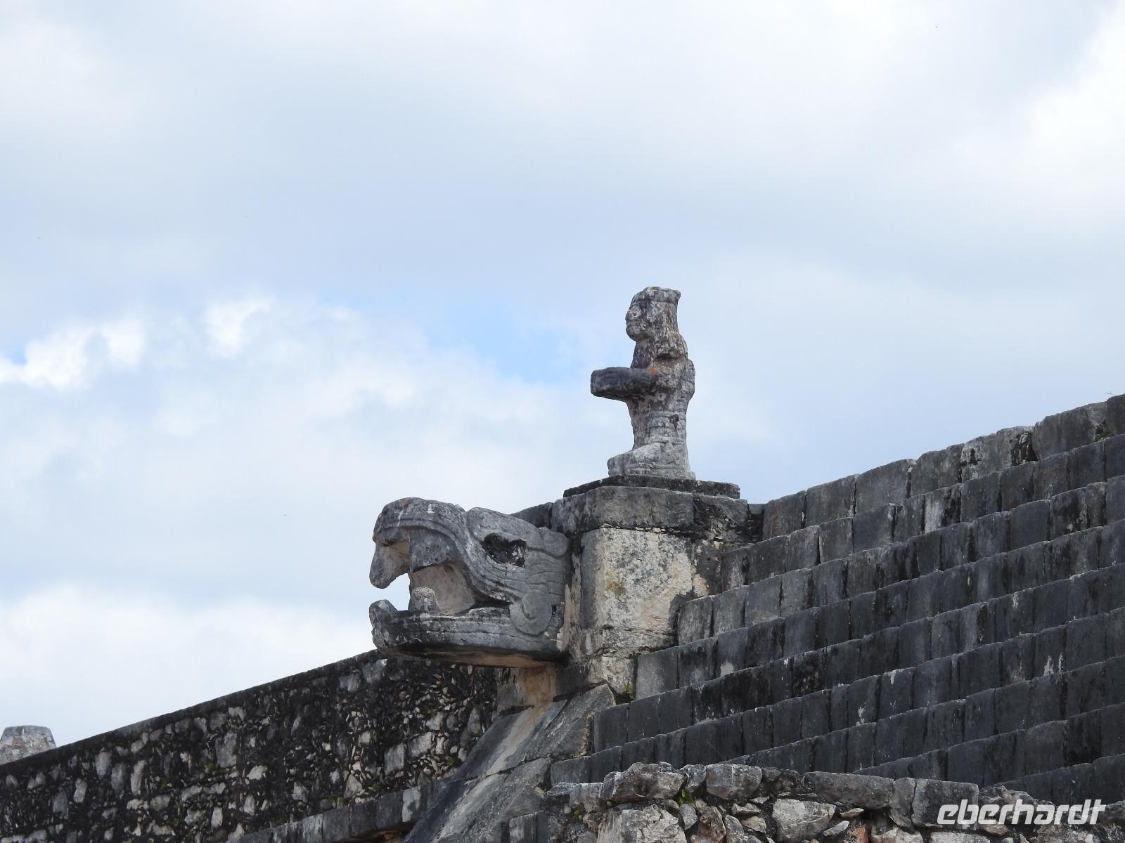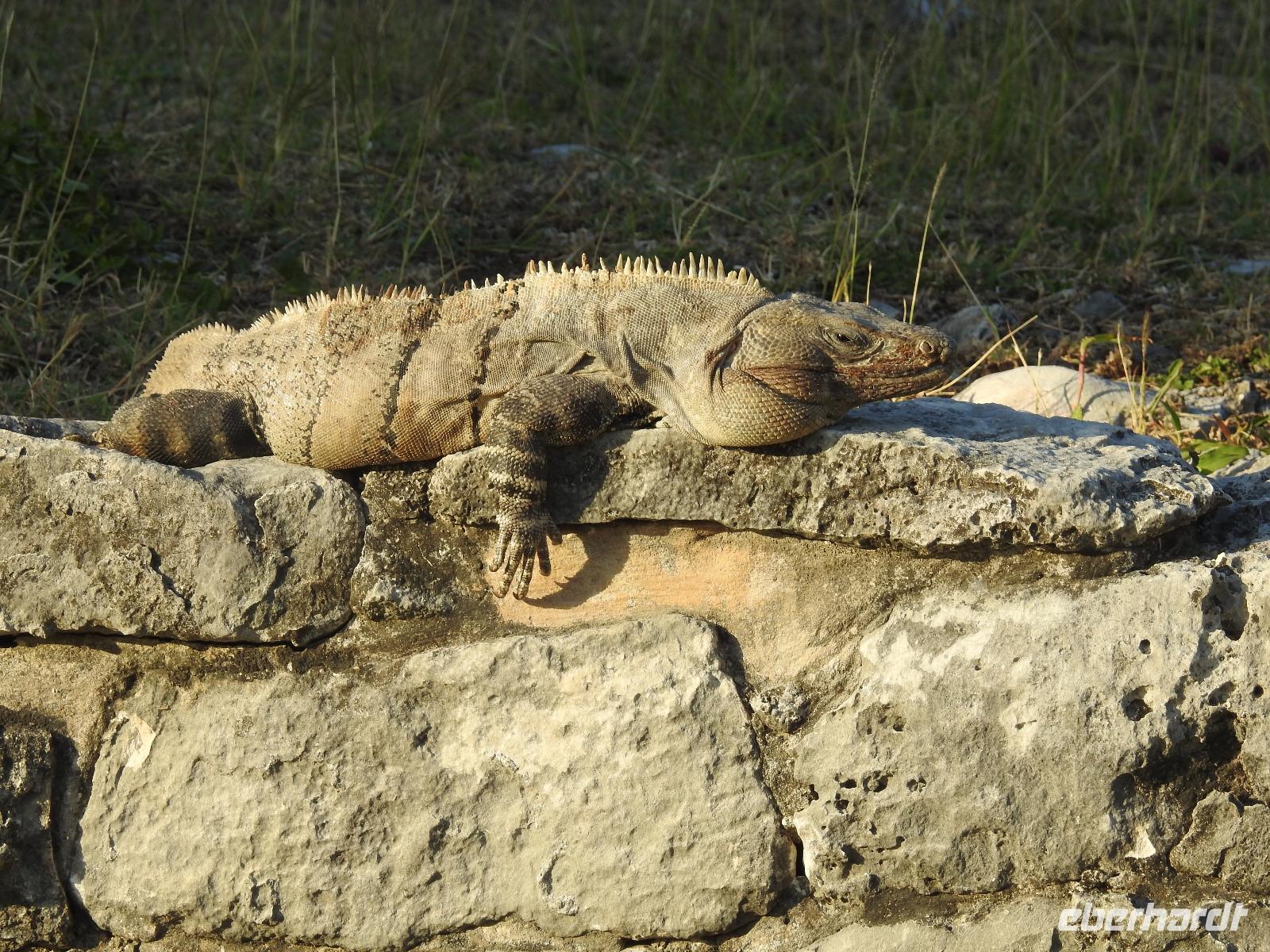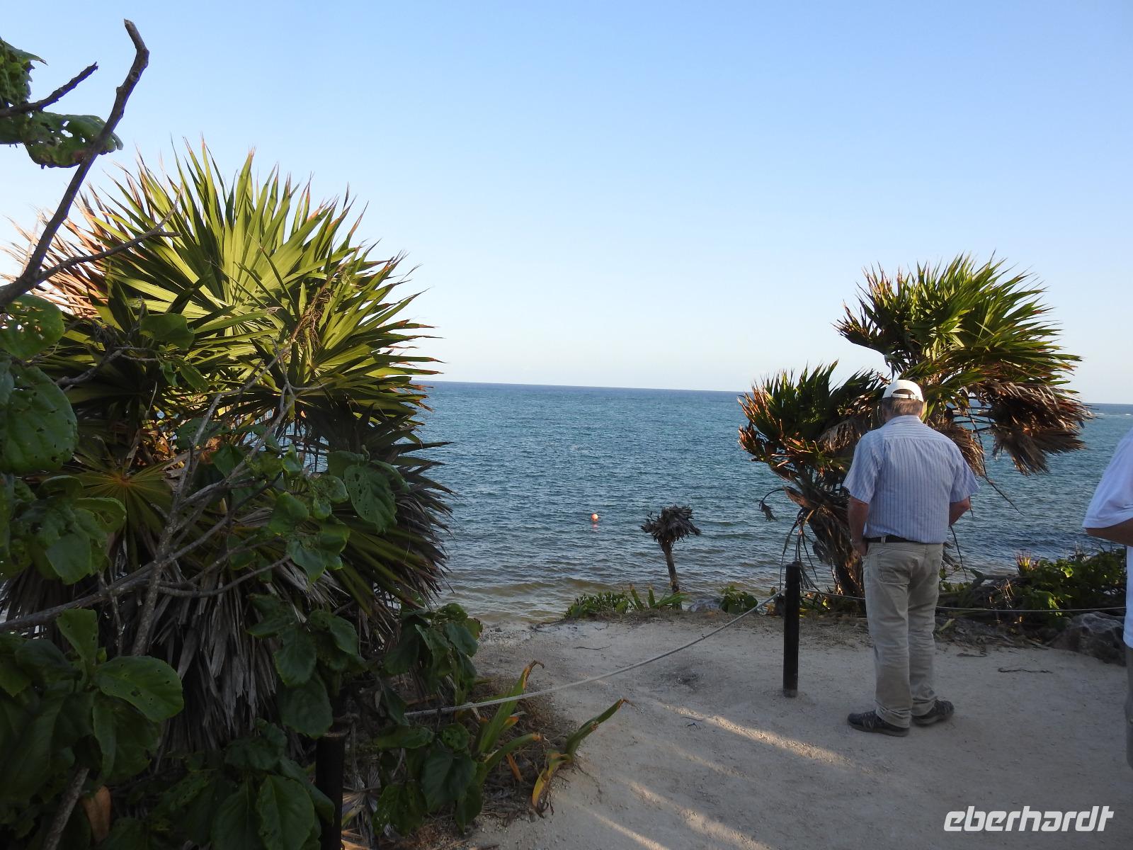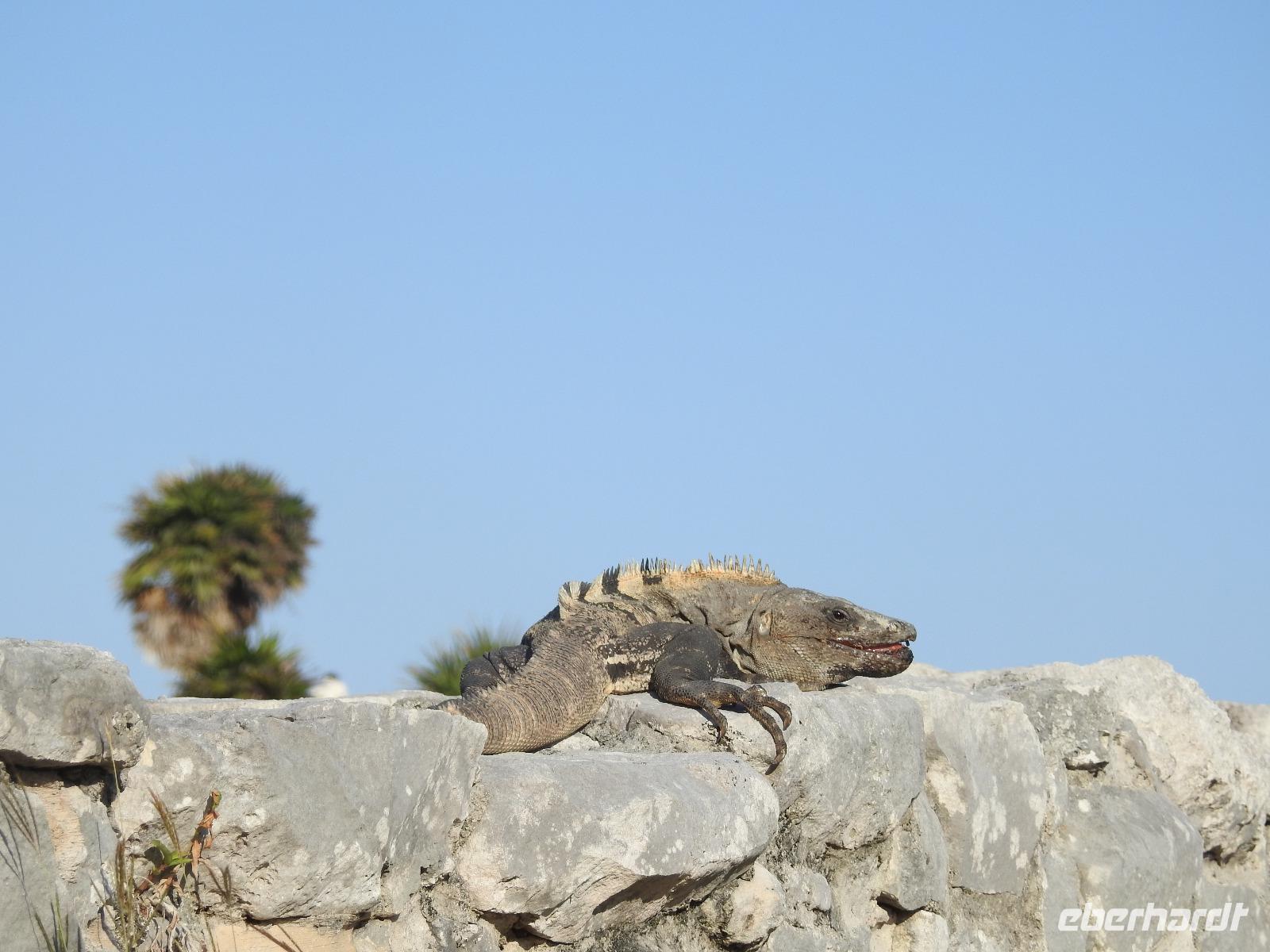 Die Koffer haben wir nachts vor die Tür gestellt und nun sind sie, wie von Geisterhand, verschwunden. Uns erwartet zum Abschied ein Sektfrühstück. Um 9 Uhr verlassen wir die MS Albatros. Doch das ist nicht so einfach. Zunächst müssen wir, wie schon so oft geübt, die Atlantik Lounge aufsuchen. Dort pilgern wir in langer Schlange an den mexikanischen Behörden vorbei. Stempel hier, Stempel da. Papier abgeben, Papier bekommen. Kein Mensch sieht mehr durch. Da hilft nur: alles aufheben, nichts wegwerfen und den Behörden vertrauen. Auf Deck 3 befindet sich der Ausgang und die Gangway. Ca. 200 Meter weiter stehen Mitarbeiter vom Schiff und weisen uns den Weg zu den Koffern. Es ist brütend heiß. Und immer noch ein Stück bis zum Bus. Dieser ist verdunkelt und innen ist es angenehm kühl. Diego, unser Reiseleiter gibt uns ein paar Informationen zu Mexiko, dann lehnen wir uns zurück, schließen die Augen und erreichen nach zwei Stunden Chichen Itza. Inzwischen ist es Mittag und der Planet brennt. Die Sonne ist unbarmherzig. Dafür ist der Himmel strahlend blau. Vorbei an vielen bunten Ständen mit verkaufswütigen Händlern spazieren wir entlang des Säulenwaldes Richtung große Pyramide. Die Säulen sind so symmetrisch angeordnet, dass man, wenn man vor einer Säule steht, die anderen dahinter nicht sehen kann. Die Pyramide des Kukulkan ist immer noch der Hauptanziehungspunkt dieser archäologischen Stätte. Seit etwa dreizehn Jahren ist es aber verboten, hinauf zu klettern. Nun, bei dieser Hitze wäre das sowieso nicht ratsam. Wir kommen zur Schädelwand, die daran erinnert, dass es zu Mayazeiten üblich war, die Schädel von besiegten Feinden oder von Menschenopfern in großen Reihen zu stapeln. Am Ballspielplatz fragen wir uns, wie es wohl möglich war, nur mit Schulter, Brust und Hüfte einen schweren Kautschukball durch die in der Höhe angebrachten Steinringe zu schießen. Nun, nicht jeder scheint das Spiel überlebt zu haben, wie an einem Relief zu erkennen ist. Hier hält ein erfolgreicher Krieger den Kopf seines Gegners in der Hand, während aus dessen nunmehr kopflosen Körper das Blut sprudelt. Man kann nicht sagen, dass die Mayas zart miteinander umgegangen sind. Wir müssen uns jetzt beeilen, das Mittagessen wartet. Nach einem eher hektischen Imbiss mit Selbstbedienung, fahren wir weiter nach Tulum. Auch für diese Strecke benötigen wir noch einmal zwei Stunden. Als wir ankommen, muss die Uhr eine Stunde vorgestellt werden und wir sind zu spät, die Anlage ist geschlossen. Doch gegen Aufpreis kommen wir doch noch hinein. Diego schafft es sogar, die Toilettenfrau zu überreden, uns noch die ebenfalls bereits geschlossenen WCs benutzen zu lassen. Wir spazieren im Licht der langsam untergehenden Sonne durch Tulum. Der Vorteil des späten Besuchs ist, dass wir fast allein hier sind. Wir treffen einen Nasenbär und viele Echsen die es sich auf den warmen Steinen gemütlich gemacht haben und aussehen, als wären sie die Wächter von Tulum. Tulum ist die einzige Mayastätte, die am Meer gefunden wurde und soll die Funktion eines Hafens gehabt haben. Die Aussicht auf das Meer und den weißen Sandstrand sind fantastisch. Am Tempel des herabstürzenden Gottes kann man sich darüber Gedanken machen, ob hier nun der Bienengott dargestellt ist oder aber ein Außerirdischer, wie es Eric van Dänicken einmal behauptet hat. Wir fahren jetzt in unser Strandhotel, in dem wir die letzte Nacht dieser Reise verbringen.