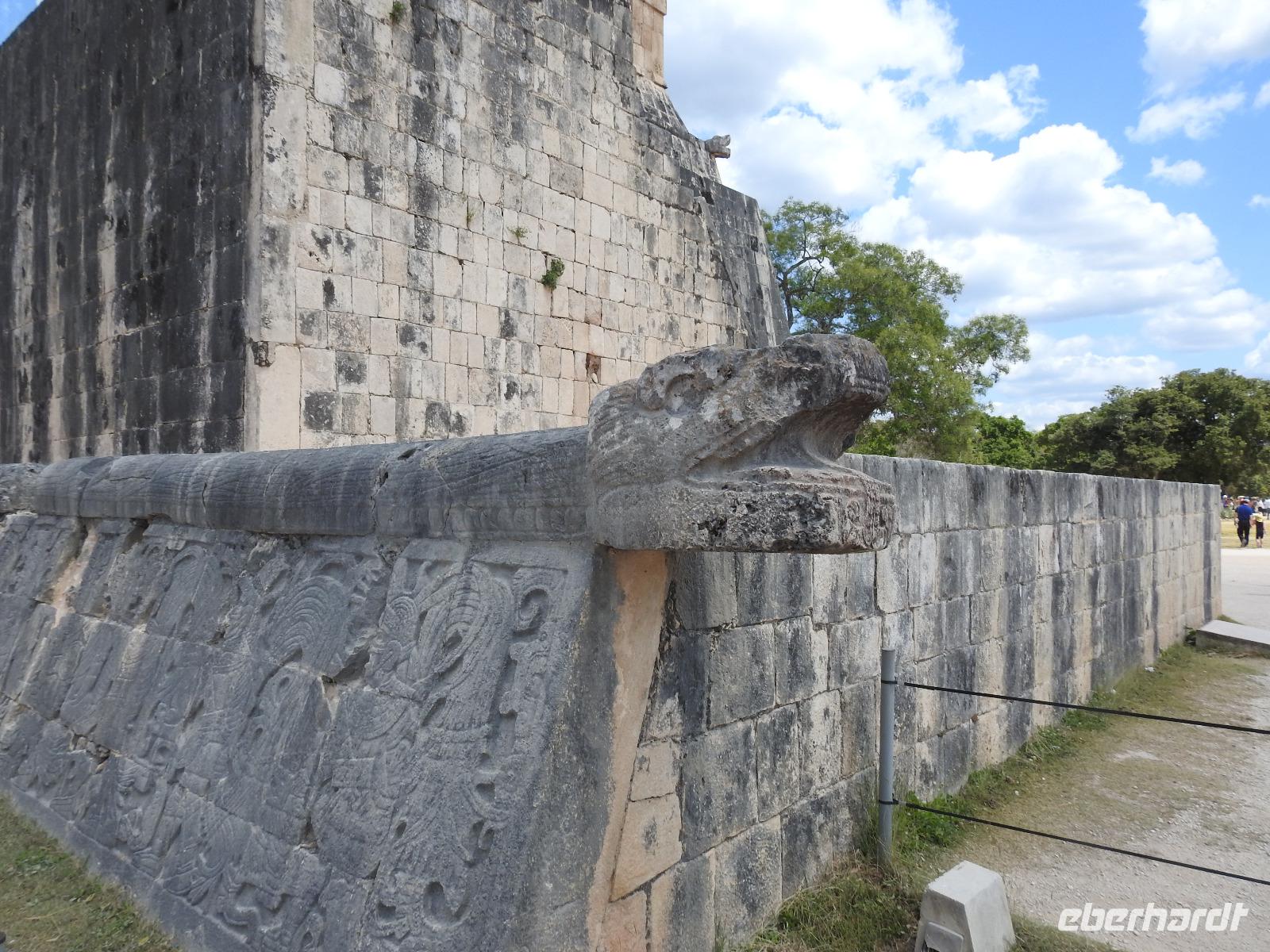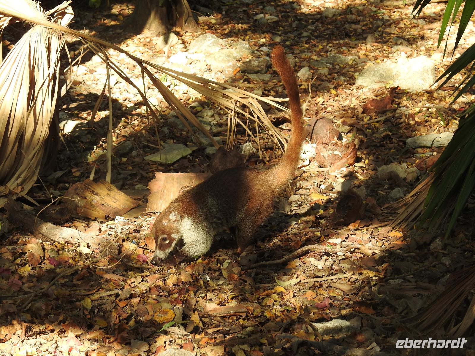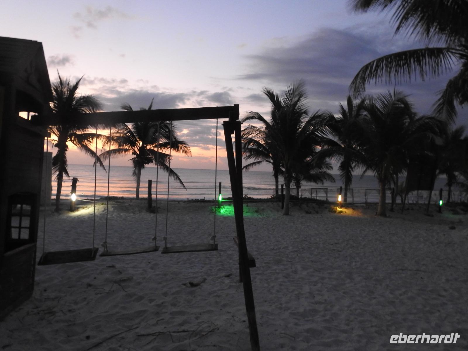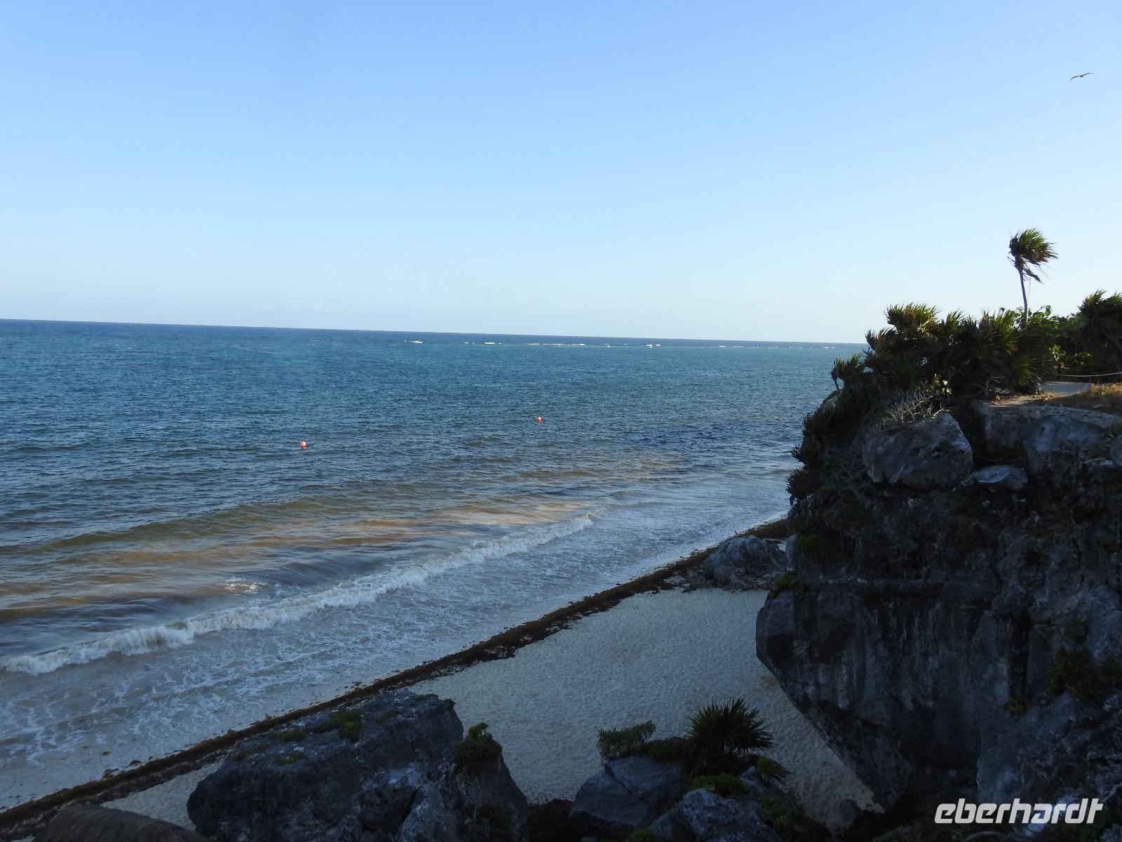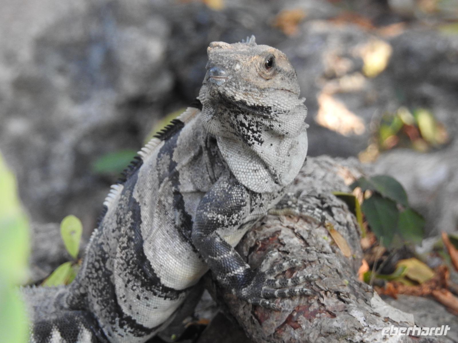 Die Koffer haben wir nachts vor die Tür gestellt und nun sind sie, wie von Geisterhand, verschwunden. Uns erwartet zum Abschied ein Sektfrühstück. Um 9 Uhr verlassen wir die MS Albatros. Doch das ist nicht so einfach. Zunächst müssen wir, wie schon so oft geübt, die Atlantik Lounge aufsuchen. Dort pilgern wir in langer Schlange an den mexikanischen Behörden vorbei. Stempel hier, Stempel da. Papier abgeben, Papier bekommen. Kein Mensch sieht mehr durch. Da hilft nur: alles aufheben, nichts wegwerfen und den Behörden vertrauen. Auf Deck 3 befindet sich der Ausgang und die Gangway. Ca. 200 Meter weiter stehen Mitarbeiter vom Schiff und weisen uns den Weg zu den Koffern. Es ist brütend heiß. Und immer noch ein Stück bis zum Bus. Dieser ist verdunkelt und innen ist es angenehm kühl. Diego, unser Reiseleiter gibt uns ein paar Informationen zu Mexiko, dann lehnen wir uns zurück, schließen die Augen und erreichen nach zwei Stunden Chichen Itza. Inzwischen ist es Mittag und der Planet brennt. Die Sonne ist unbarmherzig. Dafür ist der Himmel strahlend blau. Vorbei an vielen bunten Ständen mit verkaufswütigen Händlern spazieren wir entlang des Säulenwaldes Richtung große Pyramide. Die Säulen sind so symmetrisch angeordnet, dass man, wenn man vor einer Säule steht, die anderen dahinter nicht sehen kann. Die Pyramide des Kukulkan ist immer noch der Hauptanziehungspunkt dieser archäologischen Stätte. Seit etwa dreizehn Jahren ist es aber verboten, hinauf zu klettern. Nun, bei dieser Hitze wäre das sowieso nicht ratsam. Wir kommen zur Schädelwand, die daran erinnert, dass es zu Mayazeiten üblich war, die Schädel von besiegten Feinden oder von Menschenopfern in großen Reihen zu stapeln. Am Ballspielplatz fragen wir uns, wie es wohl möglich war, nur mit Schulter, Brust und Hüfte einen schweren Kautschukball durch die in der Höhe angebrachten Steinringe zu schießen. Nun, nicht jeder scheint das Spiel überlebt zu haben, wie an einem Relief zu erkennen ist. Hier hält ein erfolgreicher Krieger den Kopf seines Gegners in der Hand, während aus dessen nunmehr kopflosen Körper das Blut sprudelt. Man kann nicht sagen, dass die Mayas zart miteinander umgegangen sind. Wir müssen uns jetzt beeilen, das Mittagessen wartet. Nach einem eher hektischen Imbiss mit Selbstbedienung, fahren wir weiter nach Tulum. Auch für diese Strecke benötigen wir noch einmal zwei Stunden. Als wir ankommen, muss die Uhr eine Stunde vorgestellt werden und wir sind zu spät, die Anlage ist geschlossen. Doch gegen Aufpreis kommen wir doch noch hinein. Diego schafft es sogar, die Toilettenfrau zu überreden, uns noch die ebenfalls bereits geschlossenen WCs benutzen zu lassen. Wir spazieren im Licht der langsam untergehenden Sonne durch Tulum. Der Vorteil des späten Besuchs ist, dass wir fast allein hier sind. Wir treffen einen Nasenbär und viele Echsen die es sich auf den warmen Steinen gemütlich gemacht haben und aussehen, als wären sie die Wächter von Tulum. Tulum ist die einzige Mayastätte, die am Meer gefunden wurde und soll die Funktion eines Hafens gehabt haben. Die Aussicht auf das Meer und den weißen Sandstrand sind fantastisch. Am Tempel des herabstürzenden Gottes kann man sich darüber Gedanken machen, ob hier nun der Bienengott dargestellt ist oder aber ein Außerirdischer, wie es Eric van Dänicken einmal behauptet hat. Wir fahren jetzt in unser Strandhotel, in dem wir die letzte Nacht dieser Reise verbringen.