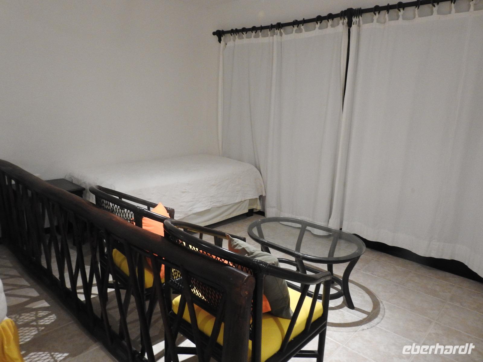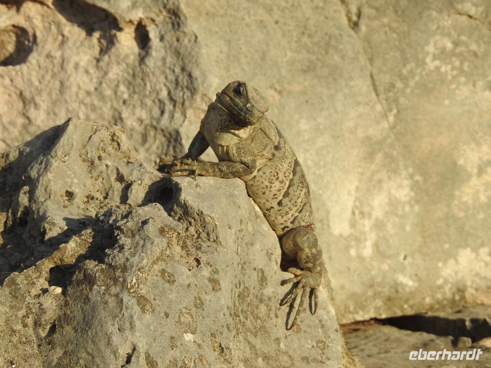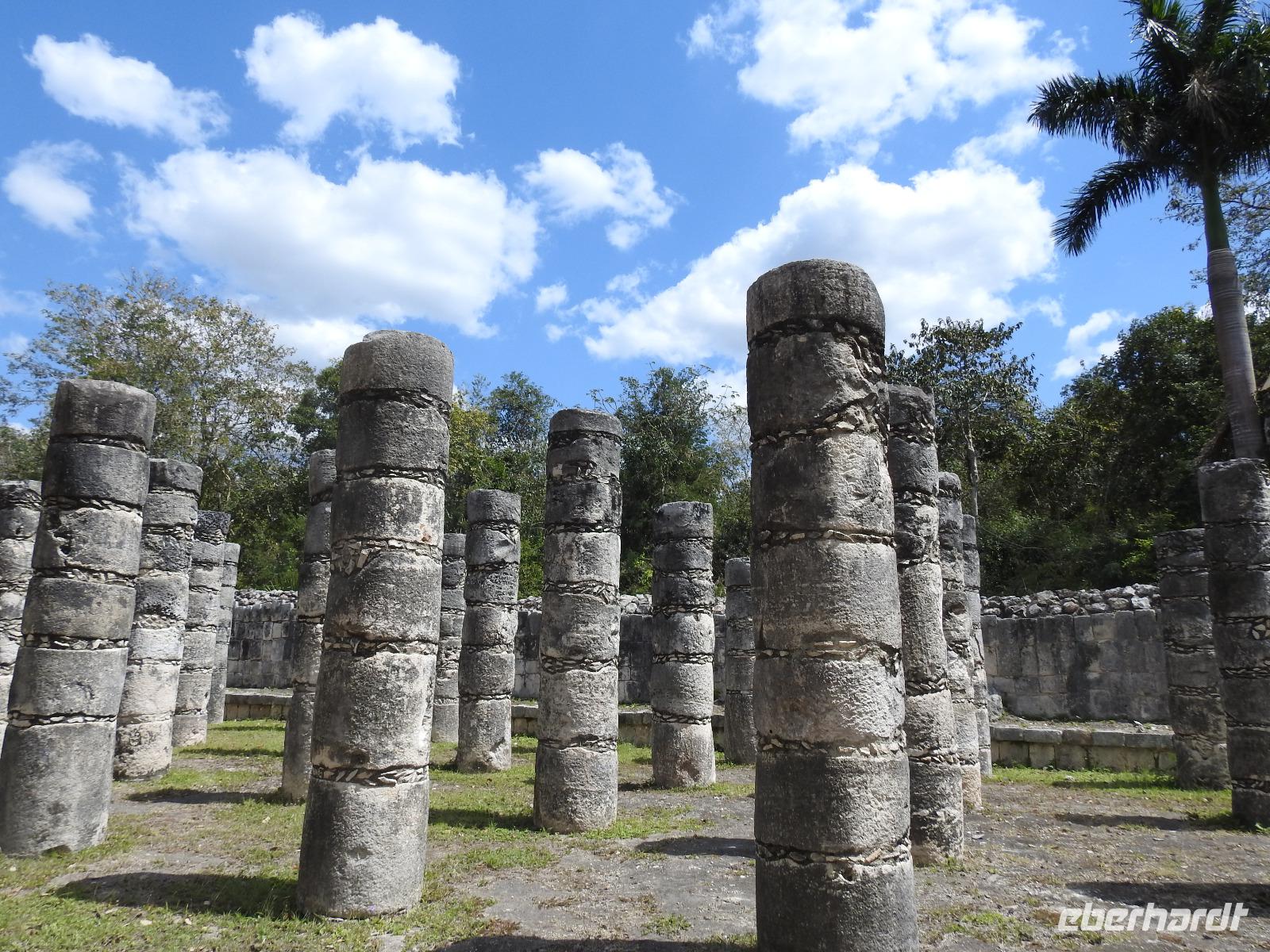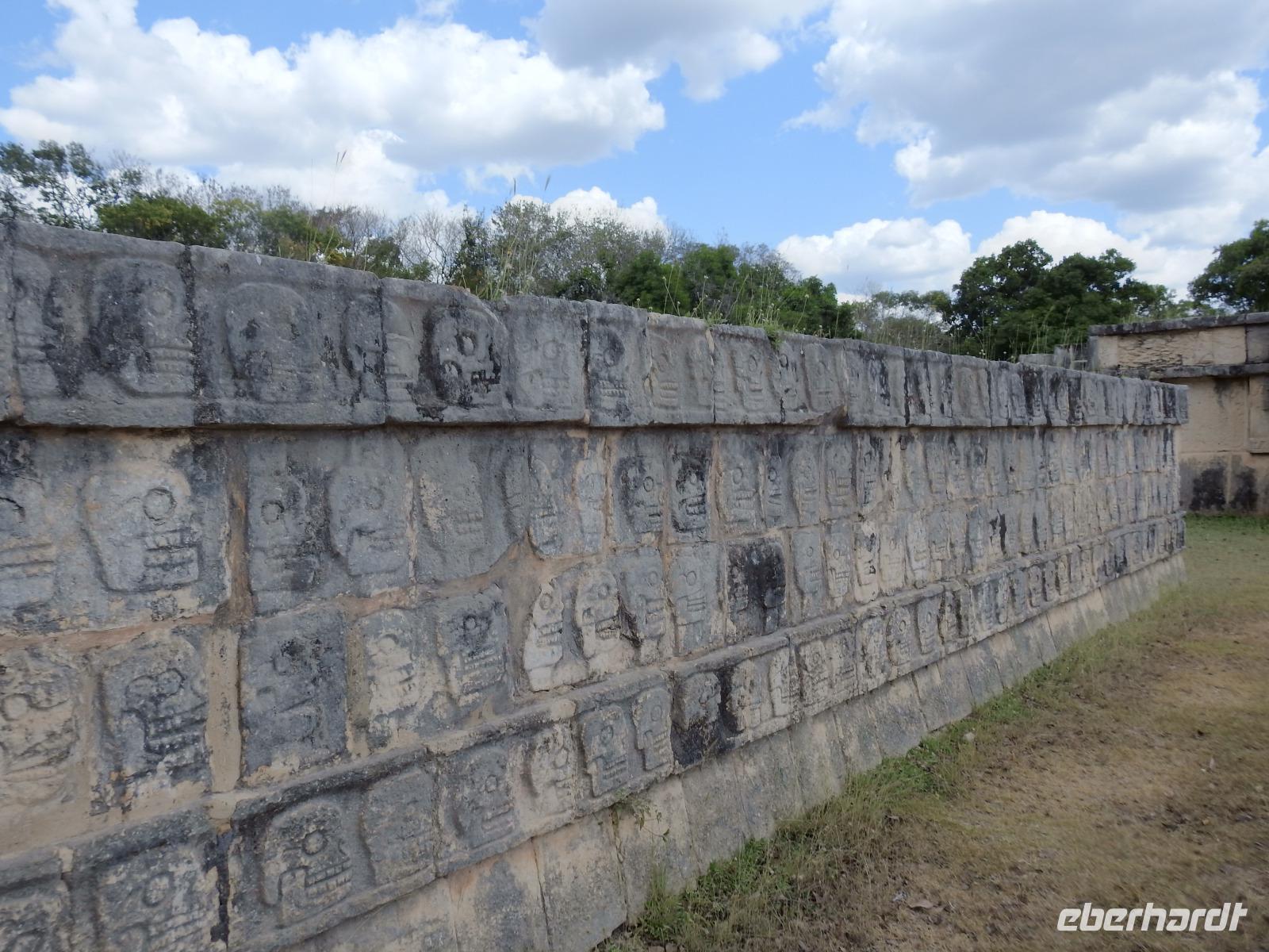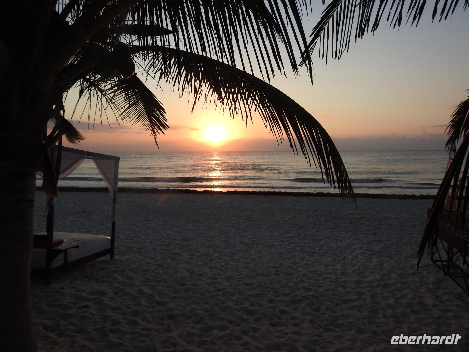 Die Koffer haben wir nachts vor die Tür gestellt und nun sind sie, wie von Geisterhand, verschwunden. Uns erwartet zum Abschied ein Sektfrühstück. Um 9 Uhr verlassen wir die MS Albatros. Doch das ist nicht so einfach. Zunächst müssen wir, wie schon so oft geübt, die Atlantik Lounge aufsuchen. Dort pilgern wir in langer Schlange an den mexikanischen Behörden vorbei. Stempel hier, Stempel da. Papier abgeben, Papier bekommen. Kein Mensch sieht mehr durch. Da hilft nur: alles aufheben, nichts wegwerfen und den Behörden vertrauen. Auf Deck 3 befindet sich der Ausgang und die Gangway. Ca. 200 Meter weiter stehen Mitarbeiter vom Schiff und weisen uns den Weg zu den Koffern. Es ist brütend heiß. Und immer noch ein Stück bis zum Bus. Dieser ist verdunkelt und innen ist es angenehm kühl. Diego, unser Reiseleiter gibt uns ein paar Informationen zu Mexiko, dann lehnen wir uns zurück, schließen die Augen und erreichen nach zwei Stunden Chichen Itza. Inzwischen ist es Mittag und der Planet brennt. Die Sonne ist unbarmherzig. Dafür ist der Himmel strahlend blau. Vorbei an vielen bunten Ständen mit verkaufswütigen Händlern spazieren wir entlang des Säulenwaldes Richtung große Pyramide. Die Säulen sind so symmetrisch angeordnet, dass man, wenn man vor einer Säule steht, die anderen dahinter nicht sehen kann. Die Pyramide des Kukulkan ist immer noch der Hauptanziehungspunkt dieser archäologischen Stätte. Seit etwa dreizehn Jahren ist es aber verboten, hinauf zu klettern. Nun, bei dieser Hitze wäre das sowieso nicht ratsam. Wir kommen zur Schädelwand, die daran erinnert, dass es zu Mayazeiten üblich war, die Schädel von besiegten Feinden oder von Menschenopfern in großen Reihen zu stapeln. Am Ballspielplatz fragen wir uns, wie es wohl möglich war, nur mit Schulter, Brust und Hüfte einen schweren Kautschukball durch die in der Höhe angebrachten Steinringe zu schießen. Nun, nicht jeder scheint das Spiel überlebt zu haben, wie an einem Relief zu erkennen ist. Hier hält ein erfolgreicher Krieger den Kopf seines Gegners in der Hand, während aus dessen nunmehr kopflosen Körper das Blut sprudelt. Man kann nicht sagen, dass die Mayas zart miteinander umgegangen sind. Wir müssen uns jetzt beeilen, das Mittagessen wartet. Nach einem eher hektischen Imbiss mit Selbstbedienung, fahren wir weiter nach Tulum. Auch für diese Strecke benötigen wir noch einmal zwei Stunden. Als wir ankommen, muss die Uhr eine Stunde vorgestellt werden und wir sind zu spät, die Anlage ist geschlossen. Doch gegen Aufpreis kommen wir doch noch hinein. Diego schafft es sogar, die Toilettenfrau zu überreden, uns noch die ebenfalls bereits geschlossenen WCs benutzen zu lassen. Wir spazieren im Licht der langsam untergehenden Sonne durch Tulum. Der Vorteil des späten Besuchs ist, dass wir fast allein hier sind. Wir treffen einen Nasenbär und viele Echsen die es sich auf den warmen Steinen gemütlich gemacht haben und aussehen, als wären sie die Wächter von Tulum. Tulum ist die einzige Mayastätte, die am Meer gefunden wurde und soll die Funktion eines Hafens gehabt haben. Die Aussicht auf das Meer und den weißen Sandstrand sind fantastisch. Am Tempel des herabstürzenden Gottes kann man sich darüber Gedanken machen, ob hier nun der Bienengott dargestellt ist oder aber ein Außerirdischer, wie es Eric van Dänicken einmal behauptet hat. Wir fahren jetzt in unser Strandhotel, in dem wir die letzte Nacht dieser Reise verbringen.
