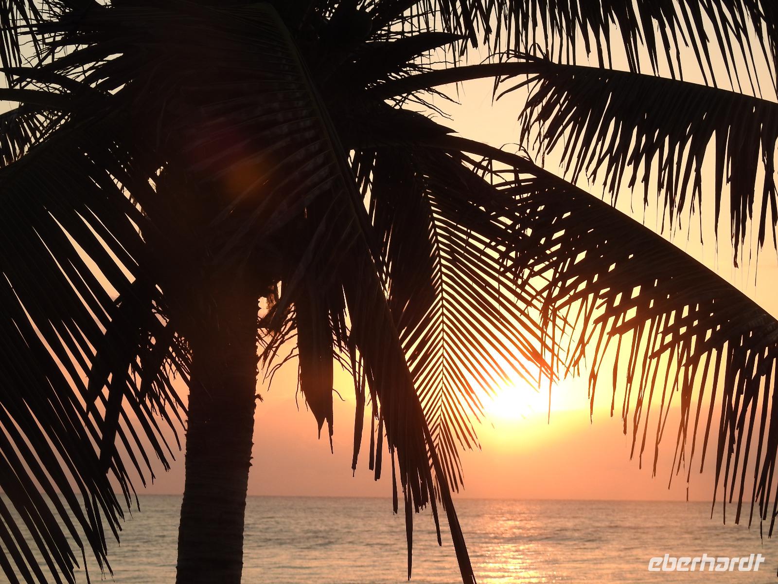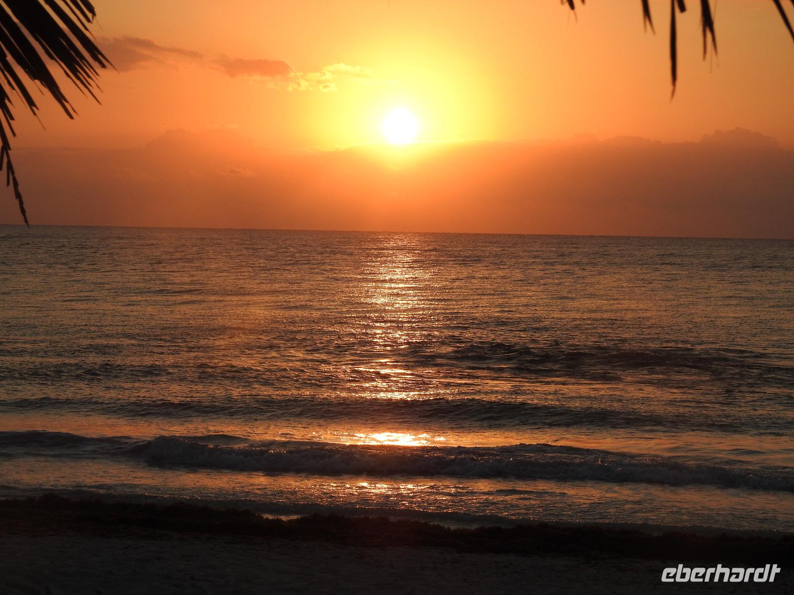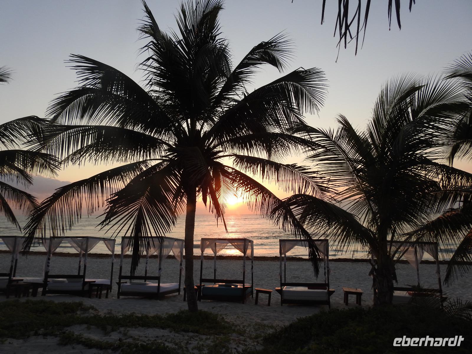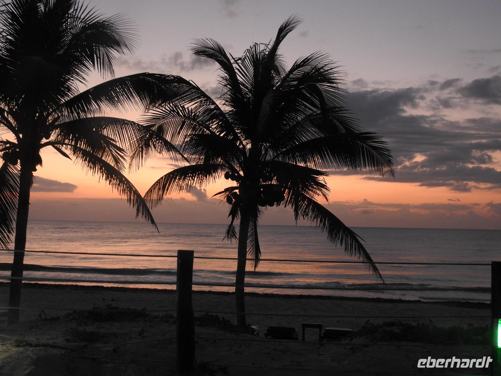 Am Morgen frühstücken im Licht der aufgehenden Sonne. Und nun erwarten uns ein paar anstrengende Stunden. Wir fahren zum Flughafen von Cancun. Hier wollen die Behörden von uns 26 $ pro Person Ausreisegebühr haben. Zum Glück findet sich einer der zahlreichen Zettel von gestern, der belegt, dass die Gebühr bezahlt ist. Ein paar übereifrige Beamte verschwinden mit ausgewählten Tickets und Unterlagen und stellen unsere Geduld auf eine harte Probe. Irgendwann ist aber geklärt, dass wir ohne Zuzahlung ausreisen dürfen und auch kein Visum für Kuba benötigen. In Kuba dann der gleiche Nervenkrieg. Wir holen unsere Koffer und entfernen alle Aufkleber, damit keine Verwechslung auftreten kann, wenn wir jetzt von Kuba nach Hause fliegen. Die Überraschung wartet in Gestalt einer Bilderbuchbeamtin am Ausgang. Während sie die Gäste vor uns noch wortlos hin und her schubst, bekommt sie fast einen Herzinfarkt, als sie mitkriegt, dass an unseren Koffern keine Aufkleber mehr sind. Wie soll sie nun feststellen, dass uns die Koffer tatsächlich gehören. Aber nicht, dass sie uns das freundlich erklären würde. Im Gegenteil. Wir werden barsch angewiesen zurückzugehen und unsere Aufkleber wieder zu besorgen. Nun also nehme ich die Beine in die Hand und flitze mit einigen von Euch nach hinten, krame im stinkenden Mülleimer und gemeinsam kleben wir die zerknitterten Müllaufkleber wieder an unsere Koffer und dürfen passieren. Aber nicht, ohne dass uns nochmal ein böser Blick geschenkt wird. Ähnlich ist es in den zwei spärlich ausgestatteten Cafés auf dem Flughafen. Die Servicekräfte haben von Service noch nie etwas gehört und verrichten ihre Arbeit eher ohne Enthusiasmus. Bezahlen kann man die braune Brühe, die hier als Kaffee verkauft wird, nur mit Dollar oder CUCs. Kreditkarten sind unbekannt. Egal, irgendwann ist auch diese Wartezeit vorbei, wir checken ein und fliegen über Nacht nach Amsterdam und von dort nach Frankfurt und Berlin.