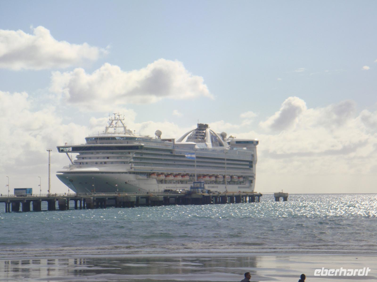 In den frühen Morgenstunden ankern wir am Tor zum schönsten Tierschutzpark Südamerikas- Puerto Madryn. Einige Gäste begeben sich auf eine Ausflugstour zur Halbinsel Valdes und Punta Tombo im Süden, wo es Pinguine zu beobachten gibt. Der kleine Ort ist schnell per Fuß erkundet. Es ist zwar sehr windig aber wunderbar sonnig und trocken. Somit steckten wir die Nasen bei einem schönen Strandspaziergang in den Wind. Zum Abendessen treffen wir uns alle und tauschen unsere Erlebnisse aus. Später genießen wir die Show im Theater oder sitzen gemütlich an der Bar.