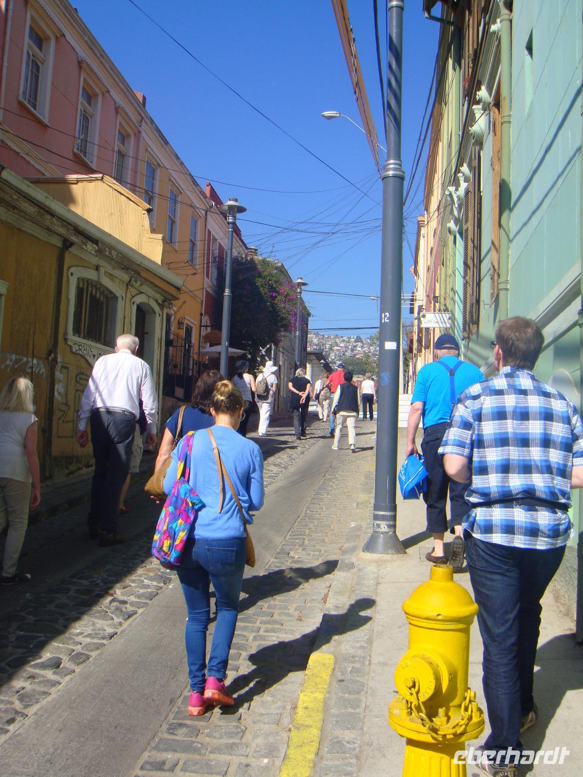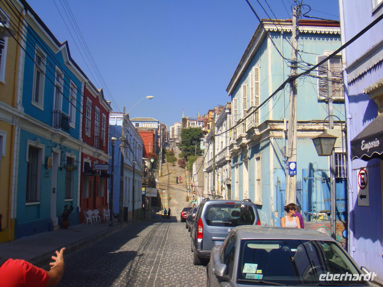 Valparaiso empfängt uns mit seinem prächtigen Lichtermeer. Nach dem letzten Frühstück verlassen wir unser schwimmendes Hotel und werden von Juliane in Empfang genommen. Während eines kleinen Spaziergangs bekommen wir einen guten Eindruck über Valparaiso. Die Fahrt mit einer der ältesten Zahnradbahn, der Nationalkongress, die Kathedrale und der beeindruckende Hafenkomplex gehören zu unserem Programm. Nach der Mittagspause treten wir unseren Weg nach Santiago de Chile an. Am späten Nachmittag erreichen wir unsere Unterkunft für die letzte Nacht. Wir checken im Hotel „Bonaparte" ein und gehen mit Juliane vor dem Abendessen noch zum Supermarkt und auf ein Getränk.