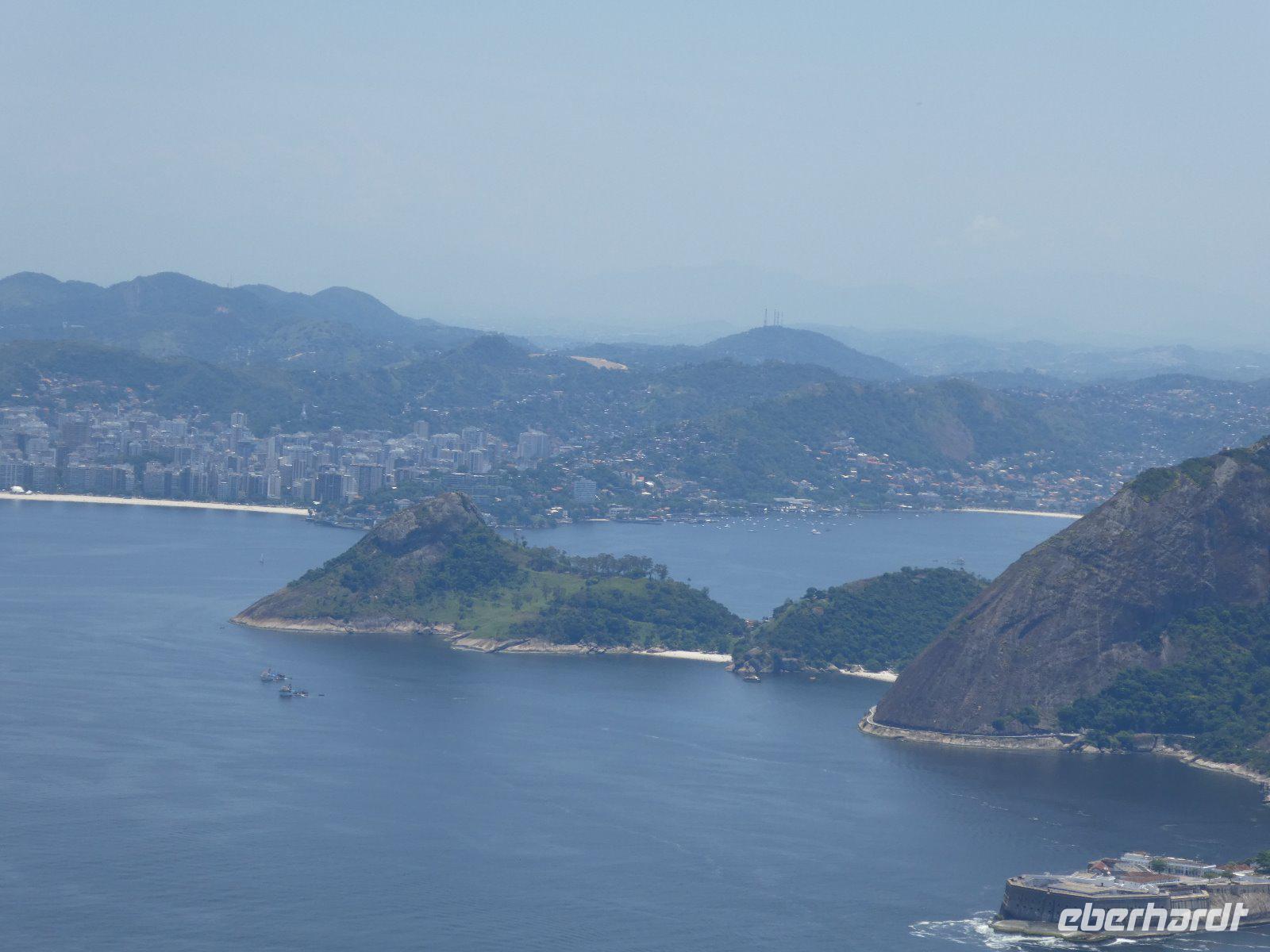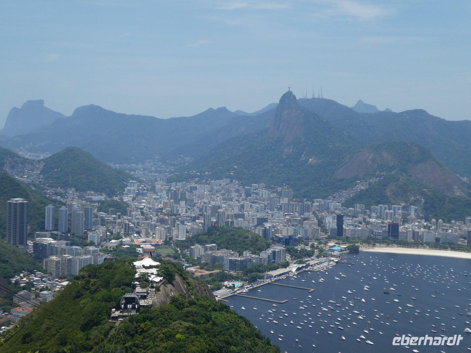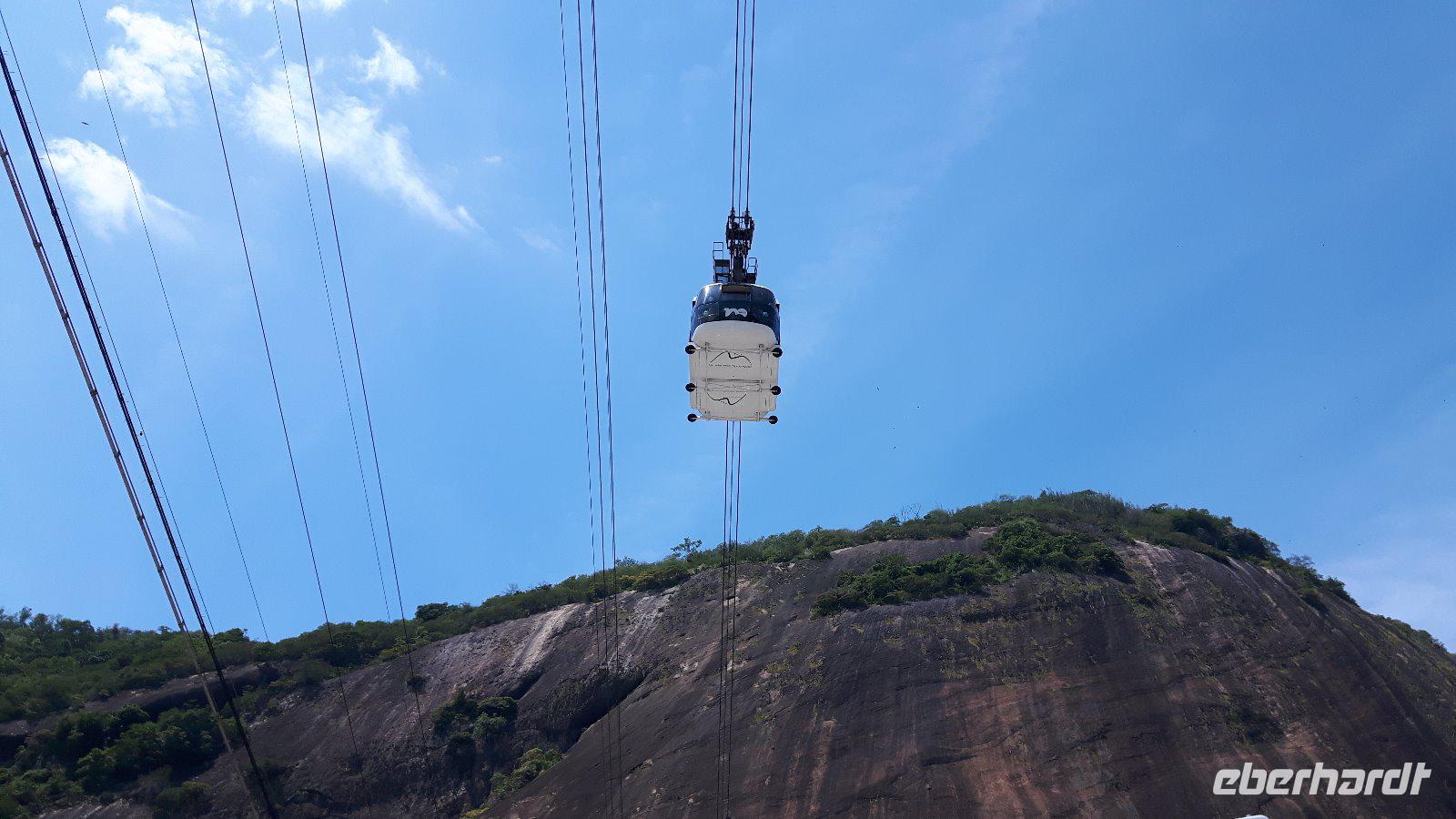 Rundum zufrieden starten wir so zum zweiten Teil unseres Tagesprogramms in der brasilianischen Metropole. Auf den Zuckerhut (Pão de Açúcar) gelangt man von der Morro da Urco -Talstation mit einer Kombination aus zwei Seilbahnen auf den Gipfel. Der Ausblick über die gigantische Stadt, eingerahmt von zahlreichen Bergen, dem Meer und Lagunen ist einfach phantastisch. Jolandas umfangreiche Erklärungen zu den sich uns bietenden Bildern machen die Sache perfekt.