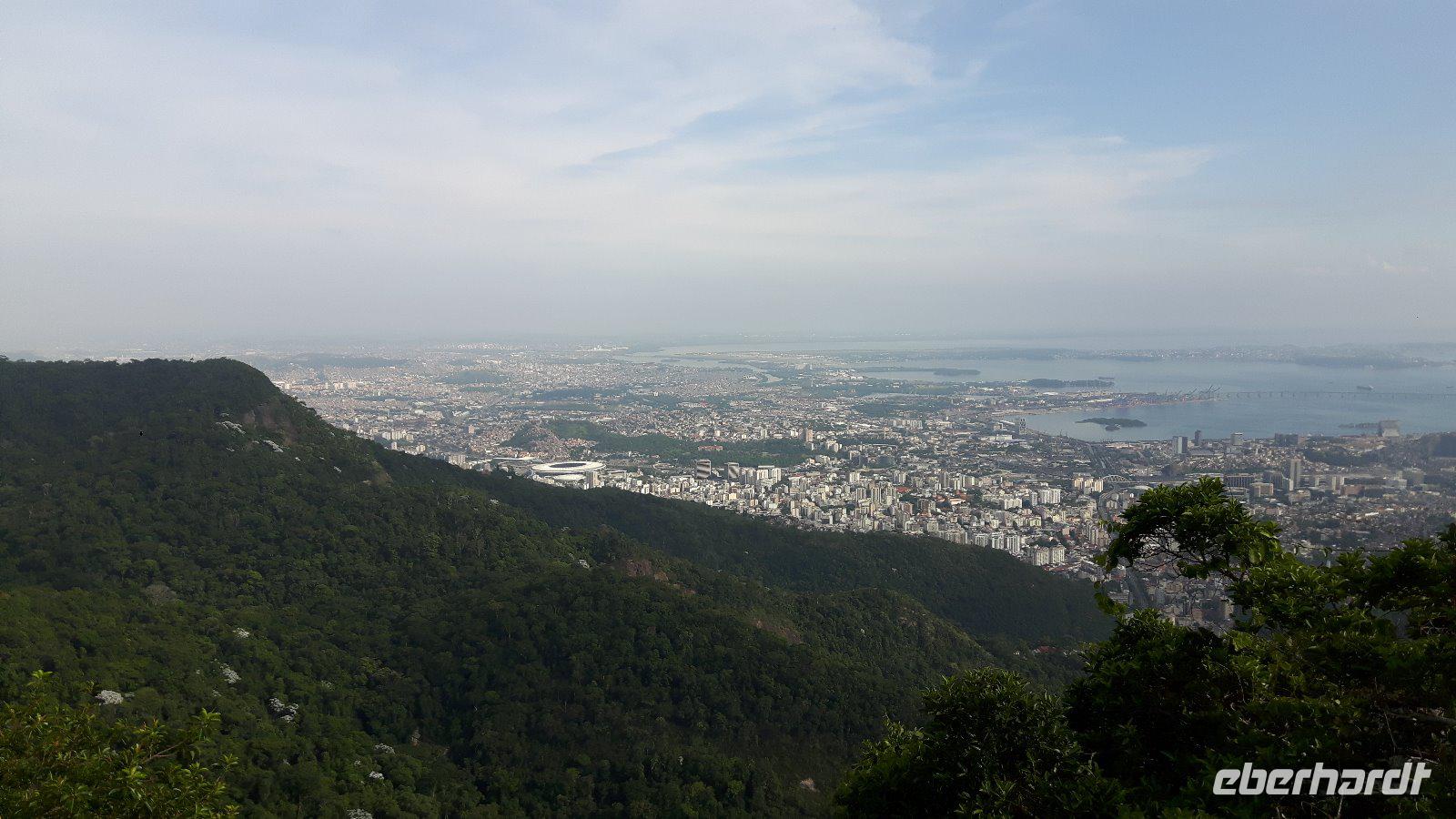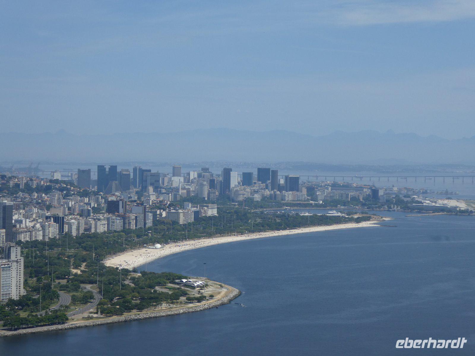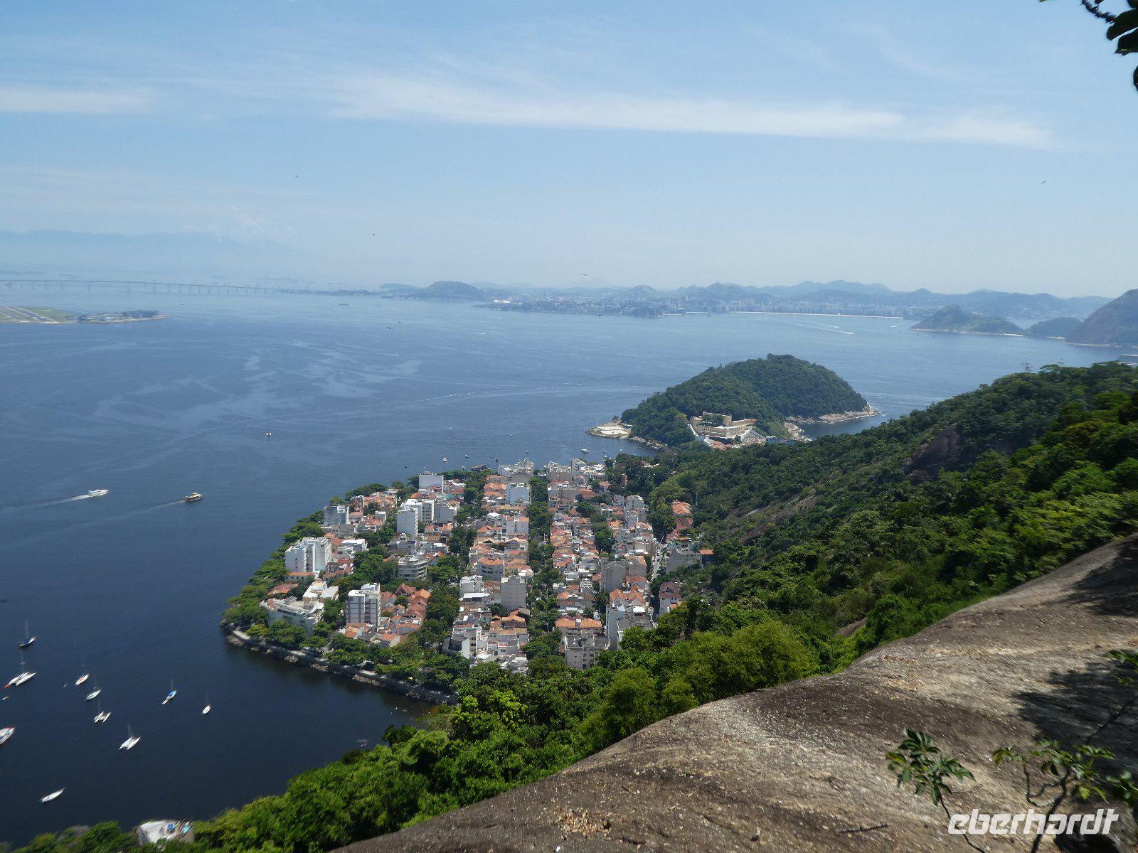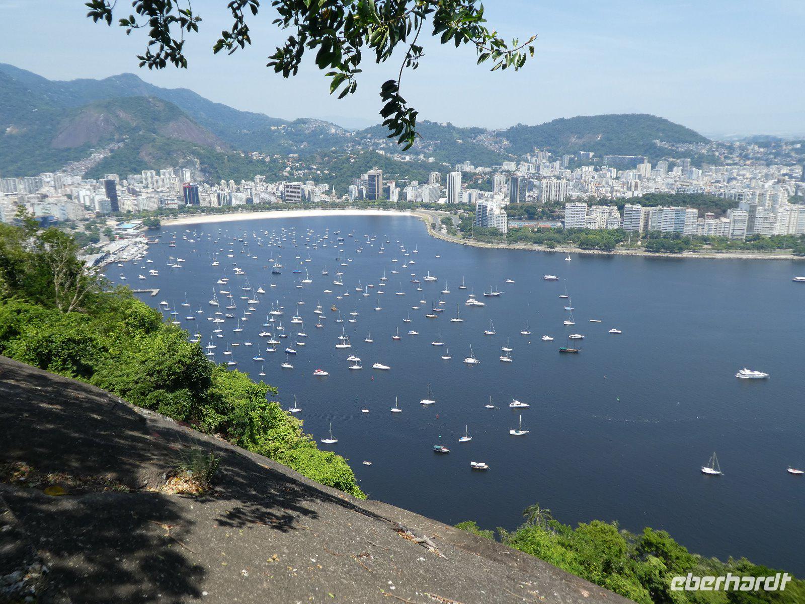 Rundum zufrieden starten wir so zum zweiten Teil unseres Tagesprogramms in der brasilianischen Metropole. Auf den Zuckerhut (Pão de Açúcar) gelangt man von der Morro da Urco -Talstation mit einer Kombination aus zwei Seilbahnen auf den Gipfel. Der Ausblick über die gigantische Stadt, eingerahmt von zahlreichen Bergen, dem Meer und Lagunen ist einfach phantastisch. Jolandas umfangreiche Erklärungen zu den sich uns bietenden Bildern machen die Sache perfekt.