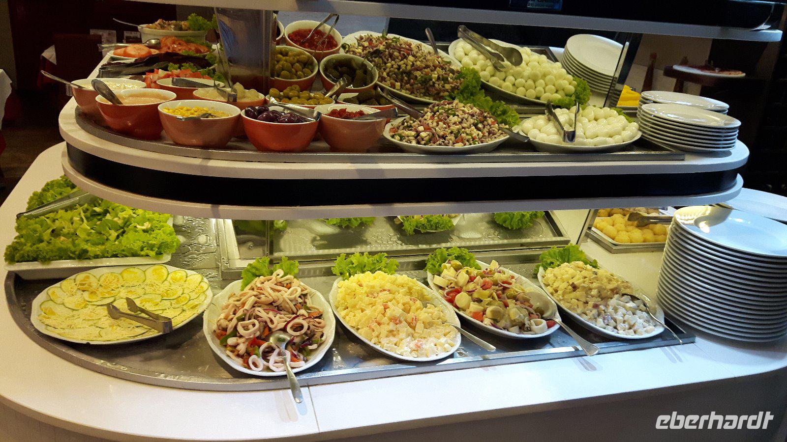 Dort erleben wir eine typisch brasilianische Form der Gastronomie; in nicht endend wollender Folge tragen emsige Kellner einen Fleischspieß nach dem anderen, jeweils prall gefüllt mit Gegrilltem von Lamm, Rind, Schwein, Huhn oder Fisch durch die Runde. Ein jeder wählt wonach ihm der Sinn steht. Ein absolutes kulinarisches Highlight, welches wir auch entsprechend zelebrieren.