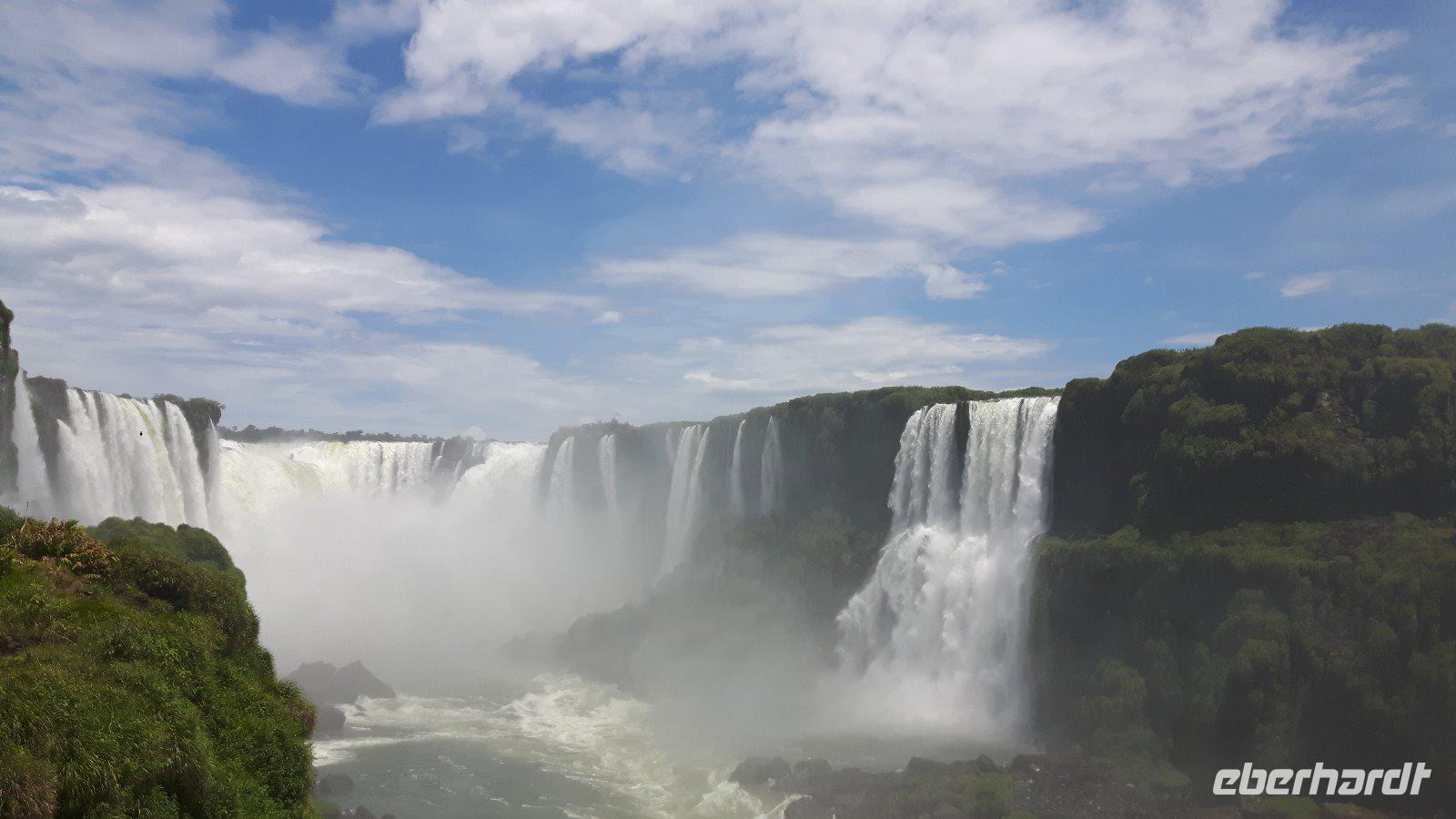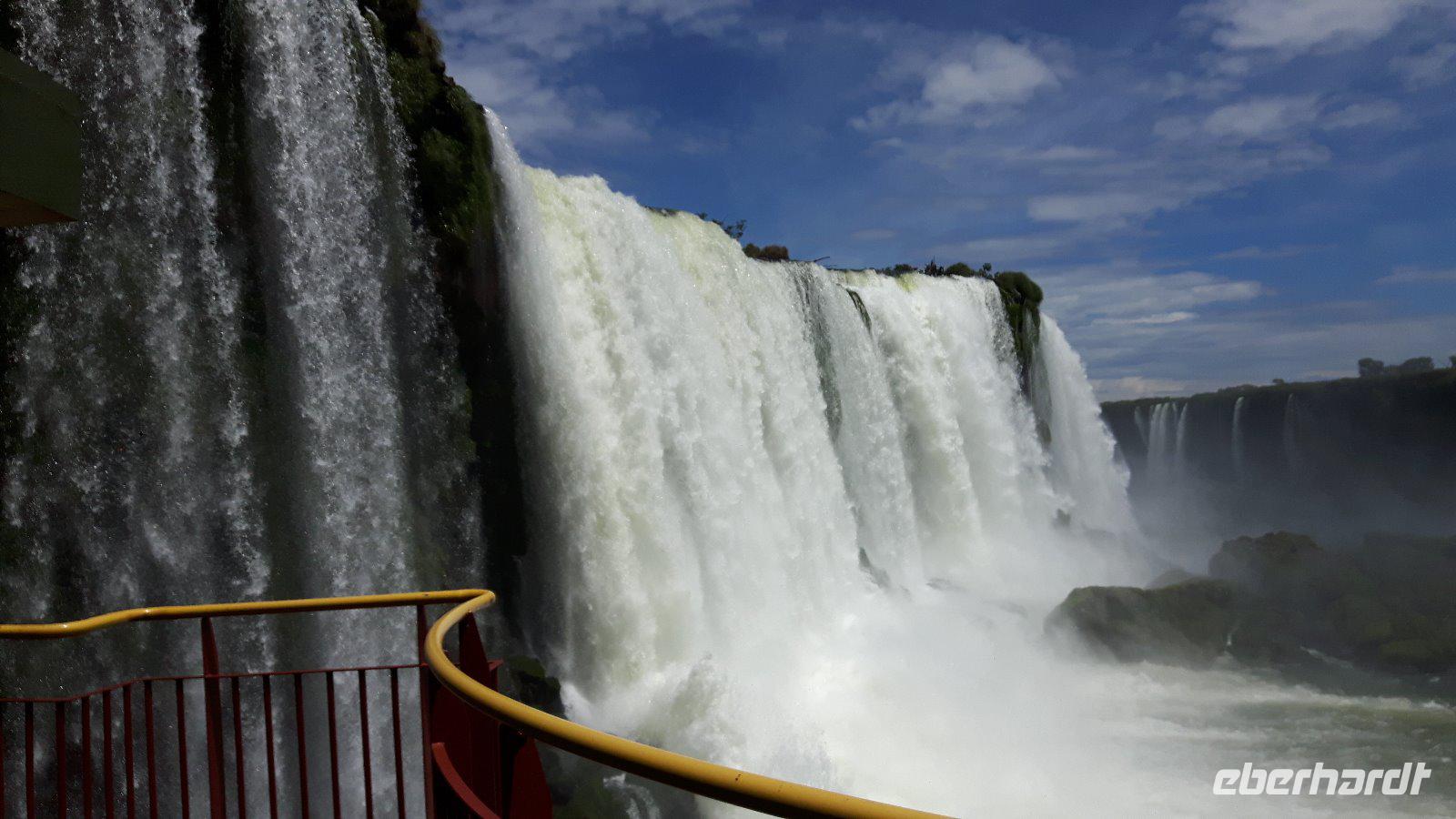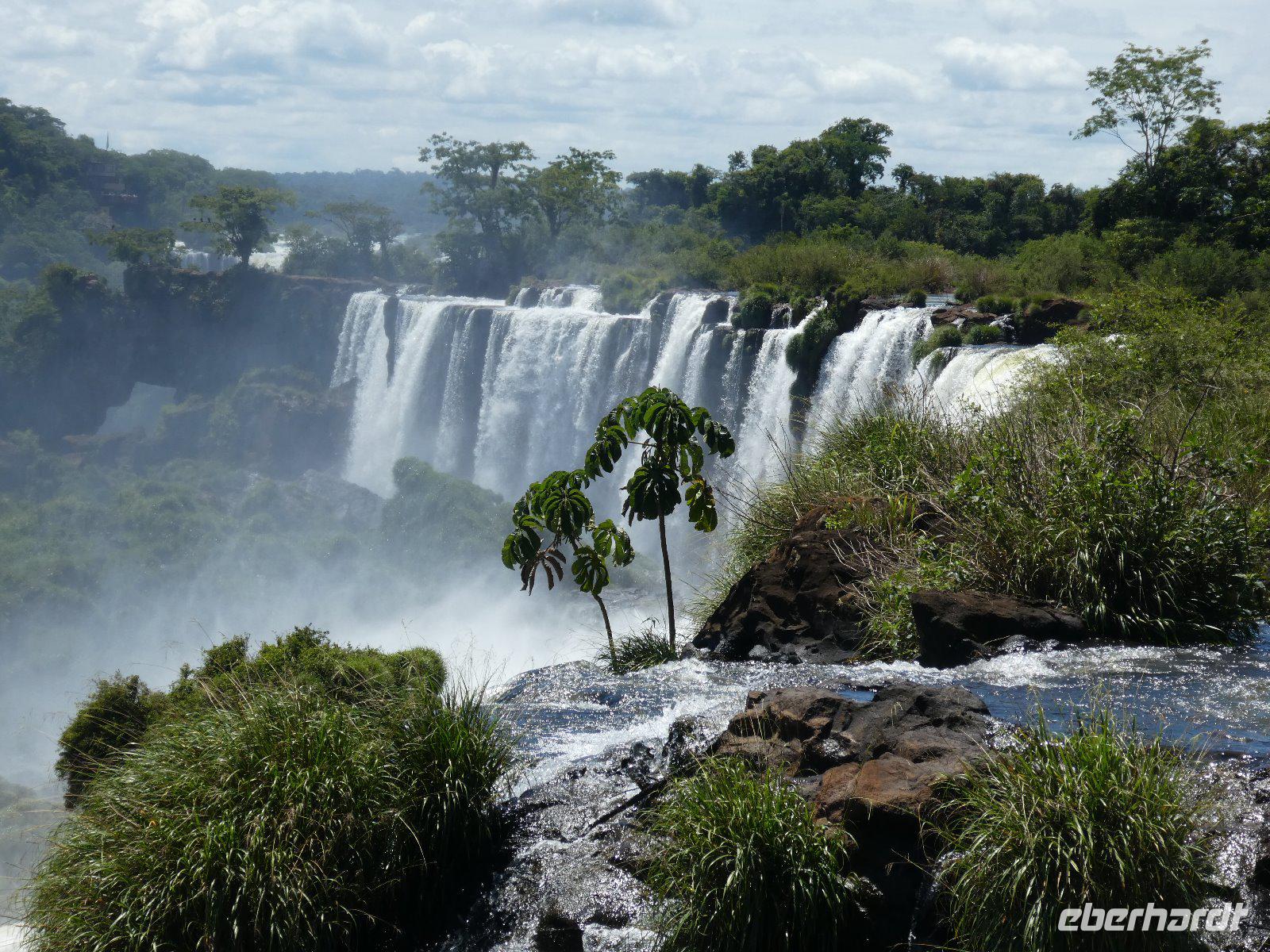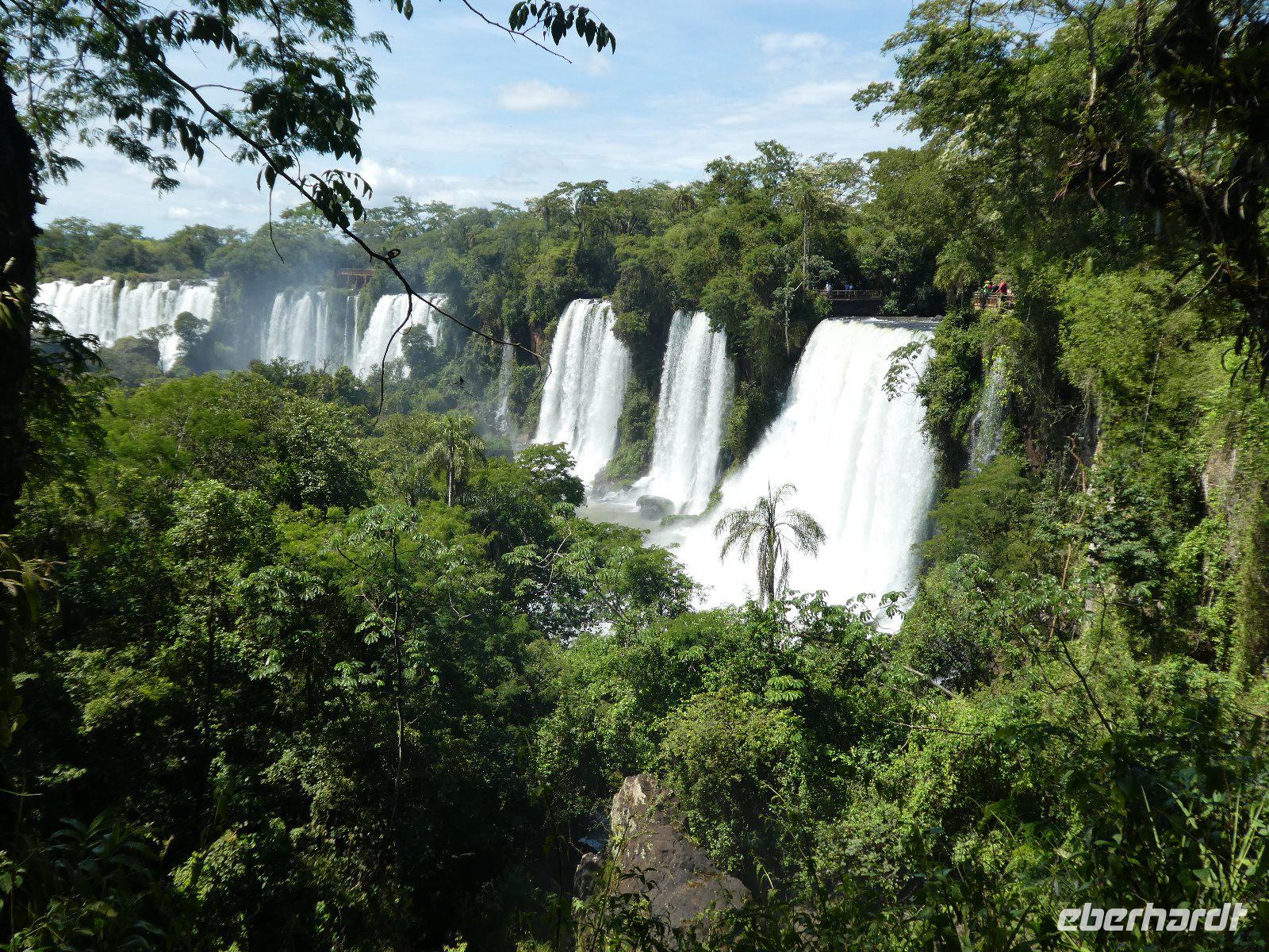 Hier erwartet uns, durch das große Eberhardt Travel Schild leicht zu erkennen Eduardo, unser Fremdenführer für die Wasserfälle von Iguazú. Wir begeben uns vom Flughafen direkt zum Iguazú National Park. An einer großen Aussichtsplattform, von welcher man schon einen ersten Überblick über die imposanten Wasserfälle bekommt, führt uns ein schön angelegter Spazierweg zum knapp zwei Kilometer entfernten Naipi Spot, der wiederum mit Aussichtsplattformen und einem markanten Turm versehen ist.