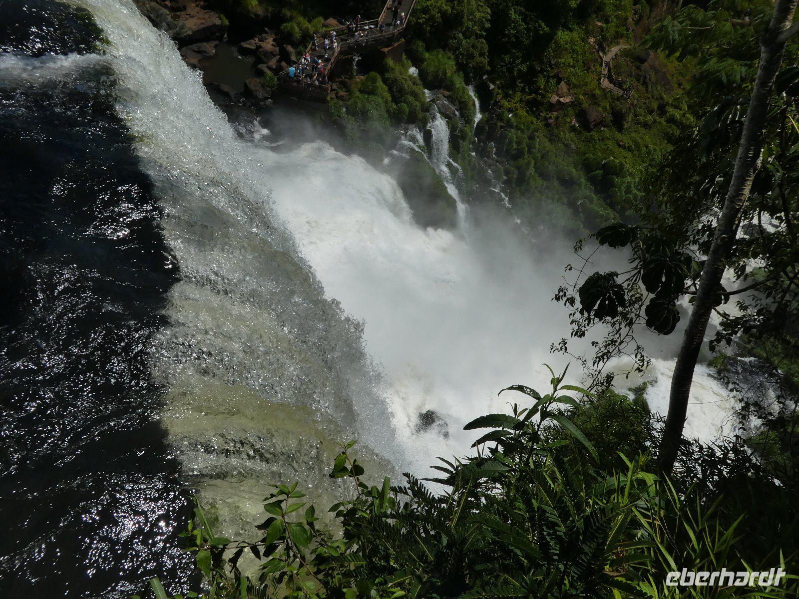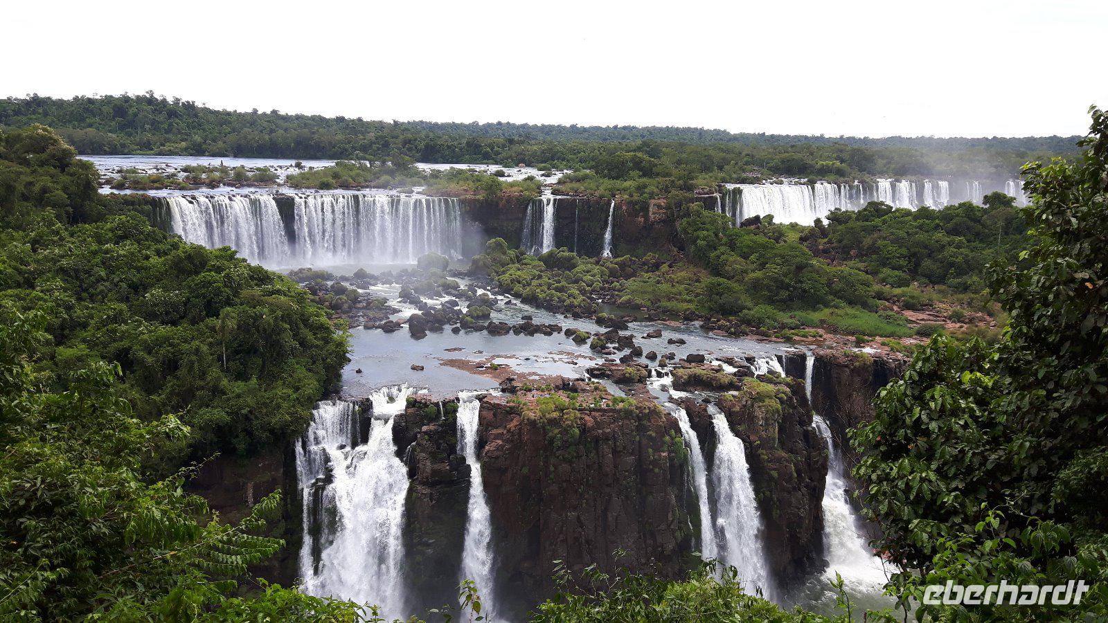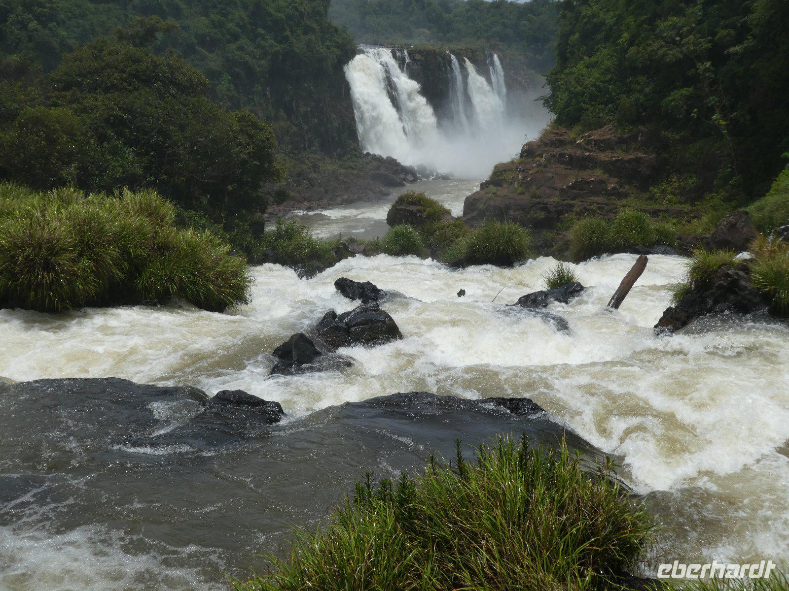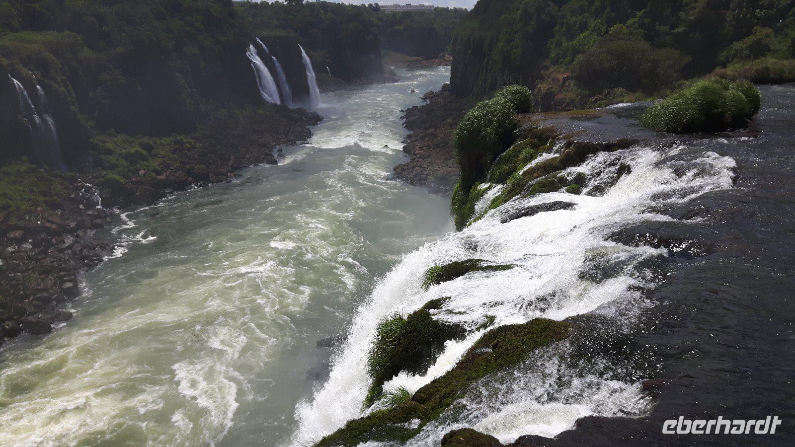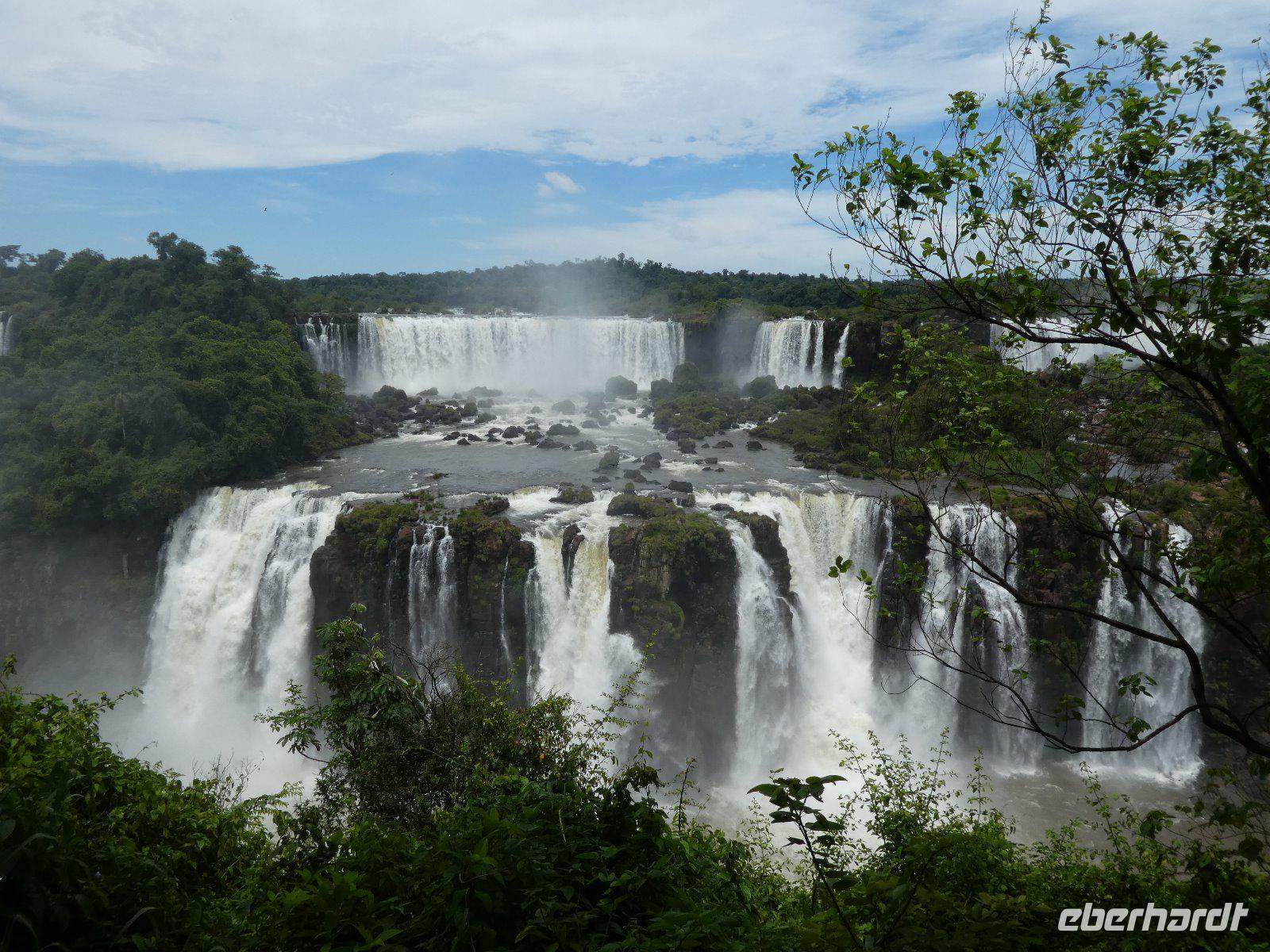 Hier erwartet uns, durch das große Eberhardt Travel Schild leicht zu erkennen Eduardo, unser Fremdenführer für die Wasserfälle von Iguazú. Wir begeben uns vom Flughafen direkt zum Iguazú National Park. An einer großen Aussichtsplattform, von welcher man schon einen ersten Überblick über die imposanten Wasserfälle bekommt, führt uns ein schön angelegter Spazierweg zum knapp zwei Kilometer entfernten Naipi Spot, der wiederum mit Aussichtsplattformen und einem markanten Turm versehen ist.