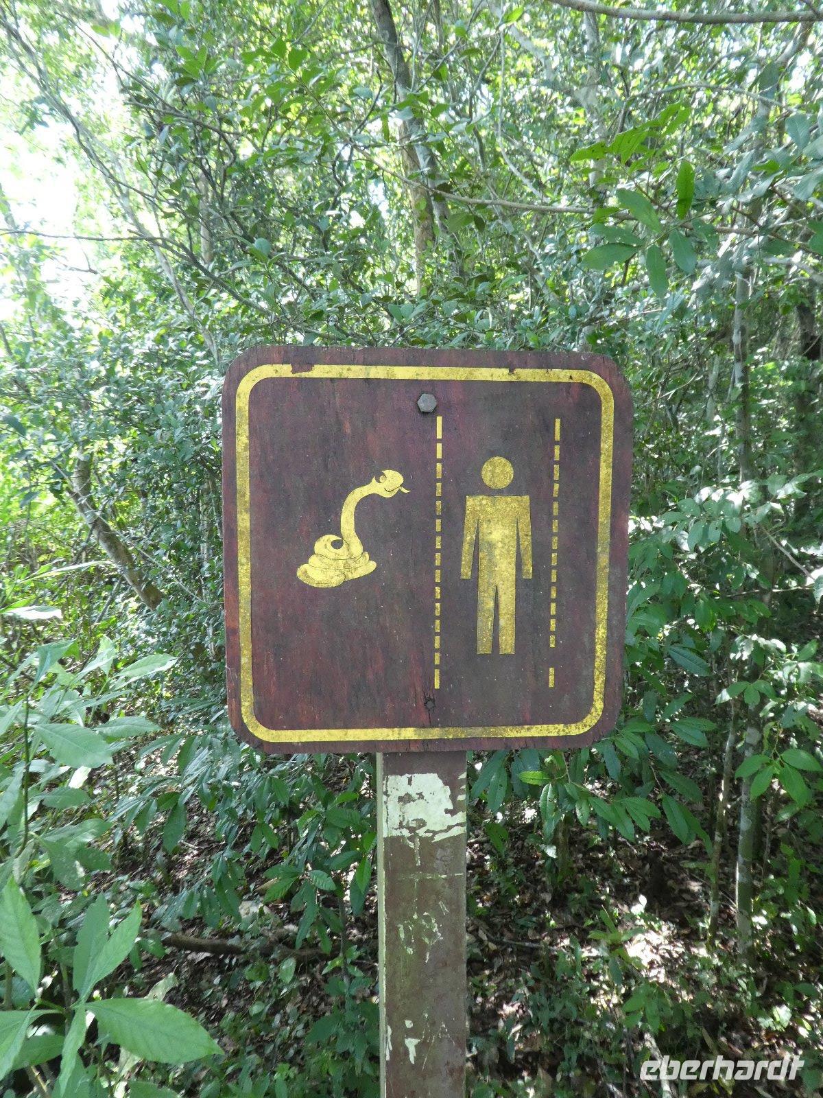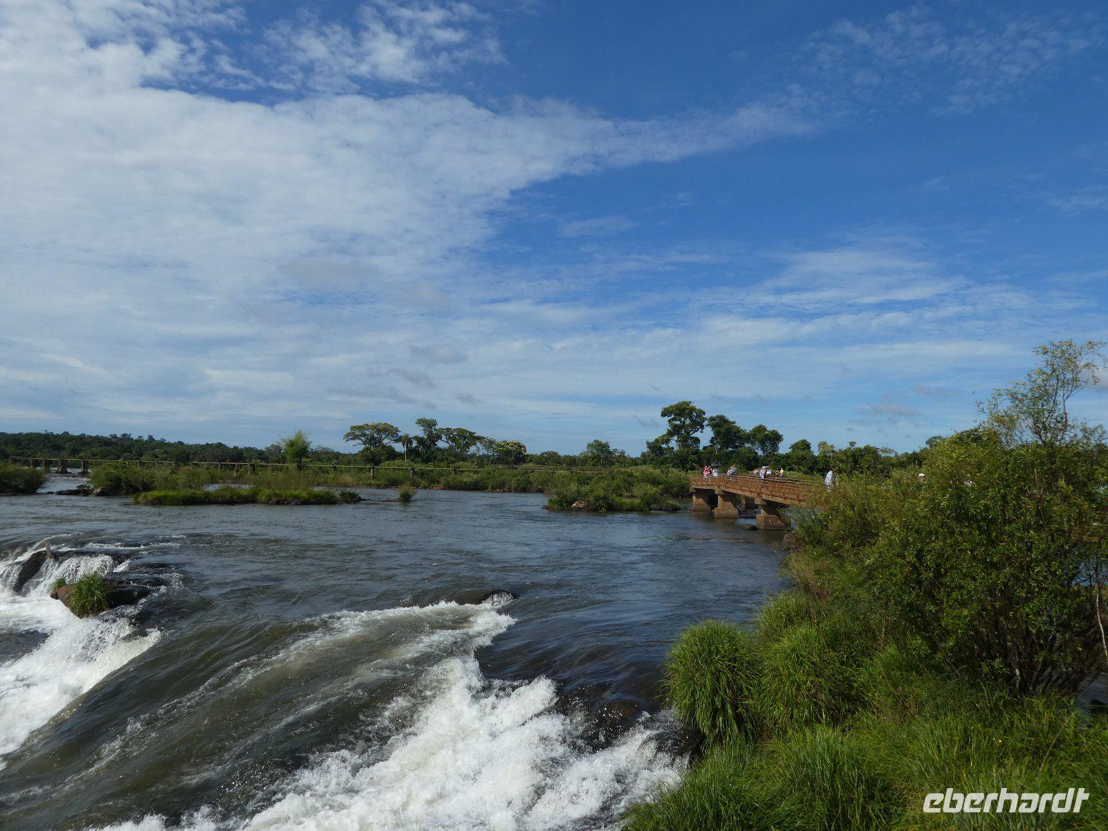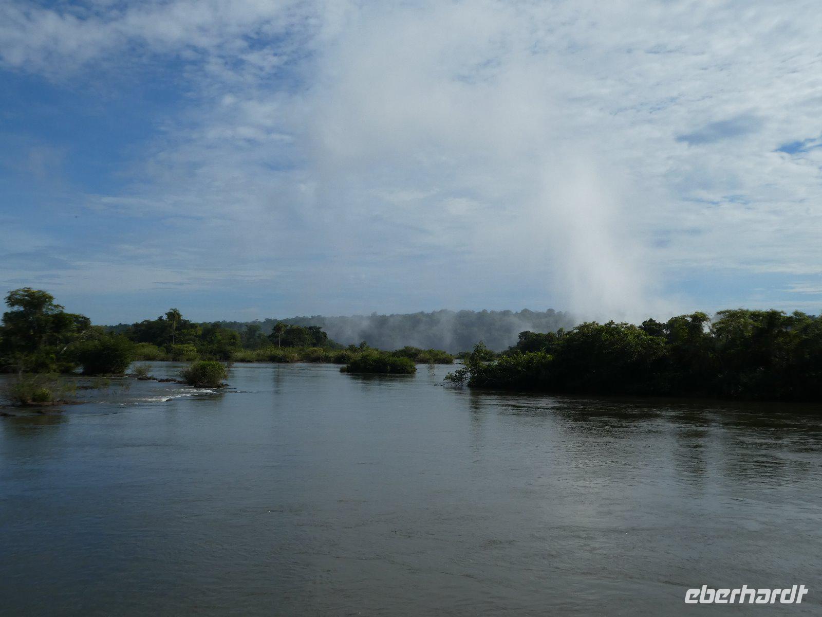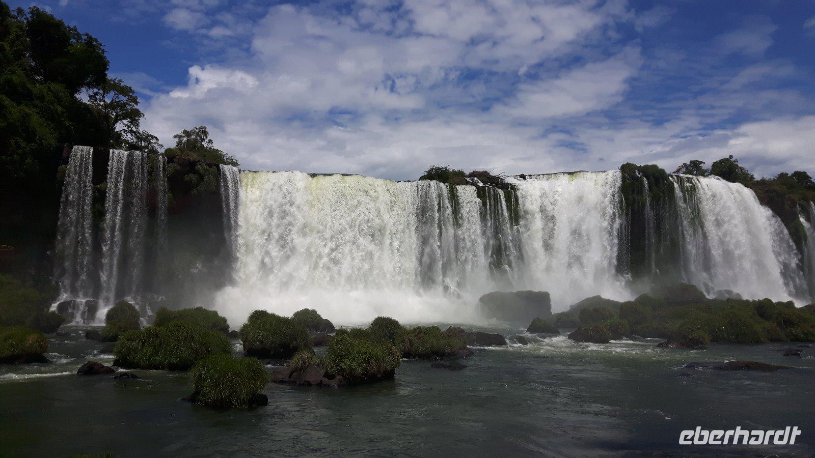 Hier erwartet uns, durch das große Eberhardt Travel Schild leicht zu erkennen Eduardo, unser Fremdenführer für die Wasserfälle von Iguazú. Wir begeben uns vom Flughafen direkt zum Iguazú National Park. An einer großen Aussichtsplattform, von welcher man schon einen ersten Überblick über die imposanten Wasserfälle bekommt, führt uns ein schön angelegter Spazierweg zum knapp zwei Kilometer entfernten Naipi Spot, der wiederum mit Aussichtsplattformen und einem markanten Turm versehen ist.