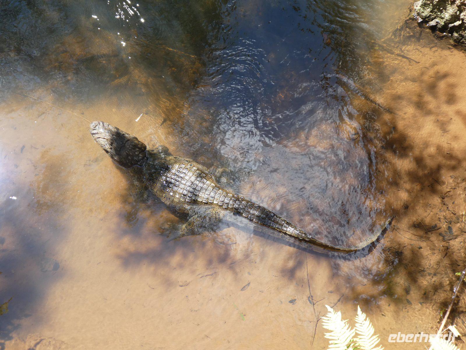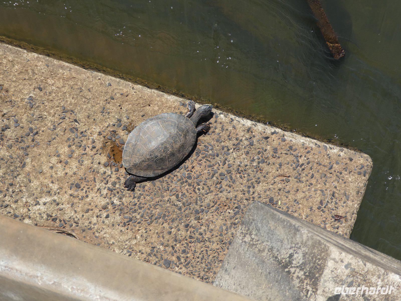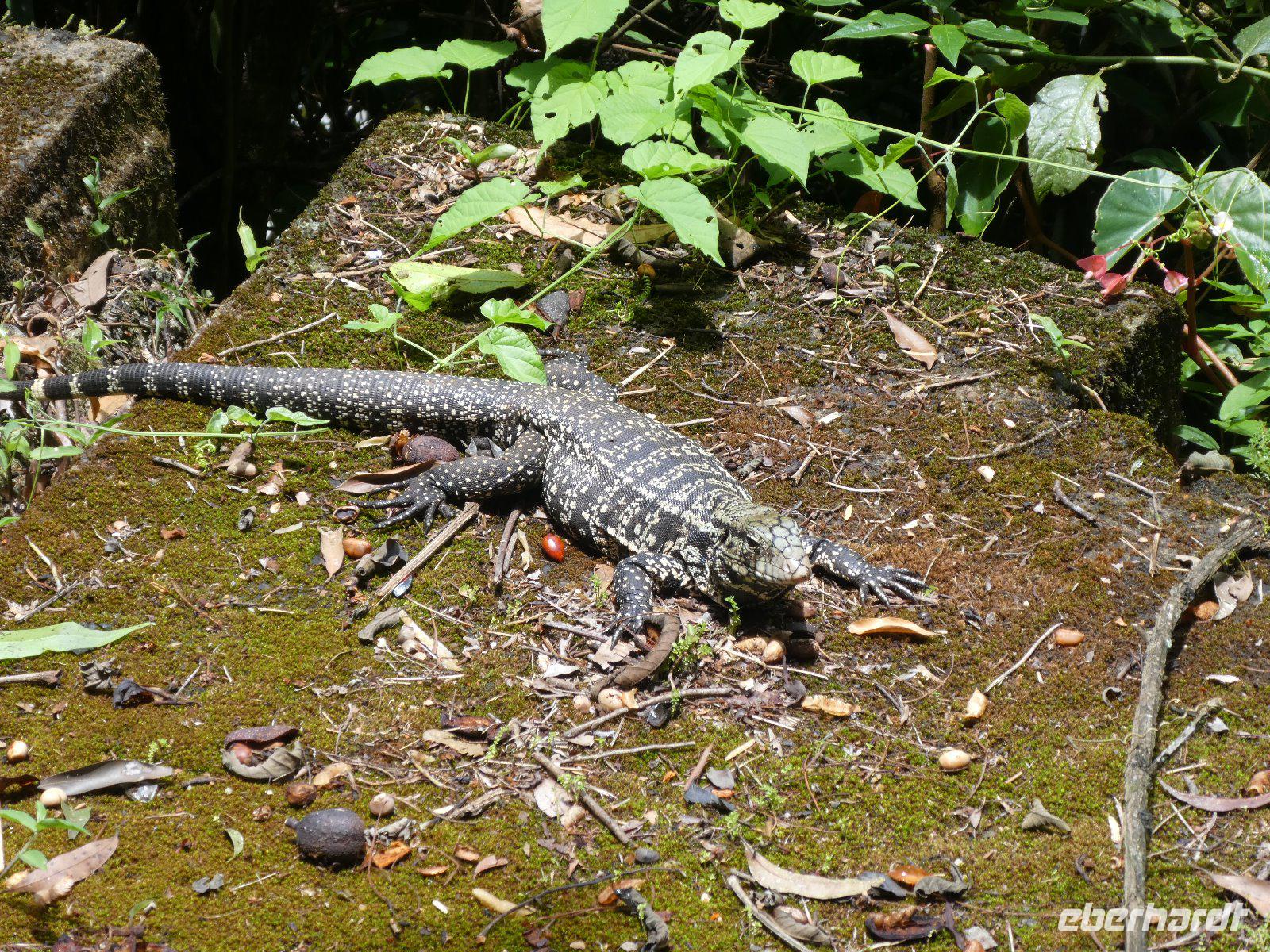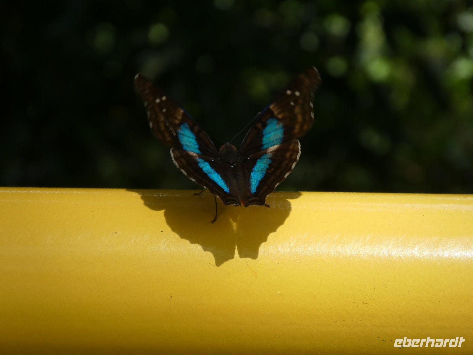 Eine Bahnstation retour zur Cataratas Station, von wo aus wir noch einen weiteren Rundgang unternehmen; neben den heftig strömenden Wassermassen sehen wir auch Leguane, einen Kaiman, Geier, jede Menge bunte Singvögel und große farbenprächtige Schmetterlinge.