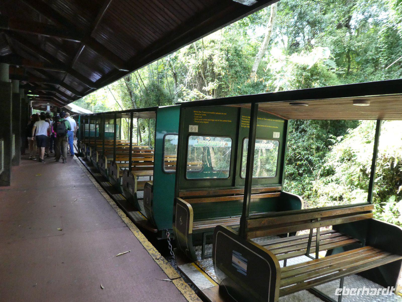 Von der Bahnstation (Central Station) nehmen wir den kleinen, offenen Zug und fahren bis zur Garganta del Diablo Station. Hier zahlt sich das zeitigere Aufstehen aus; von den Strömen von Besuchern die sich im Laufe des Tages einstellen werden ist noch nichts zu spüren. So können wir unseren Spaziergang zu den Teufelsfällen und retour ganz entspannt genießen und stehen staunend vor dem größten Wasserfall der berühmten Wasserfallkette Iguazús.